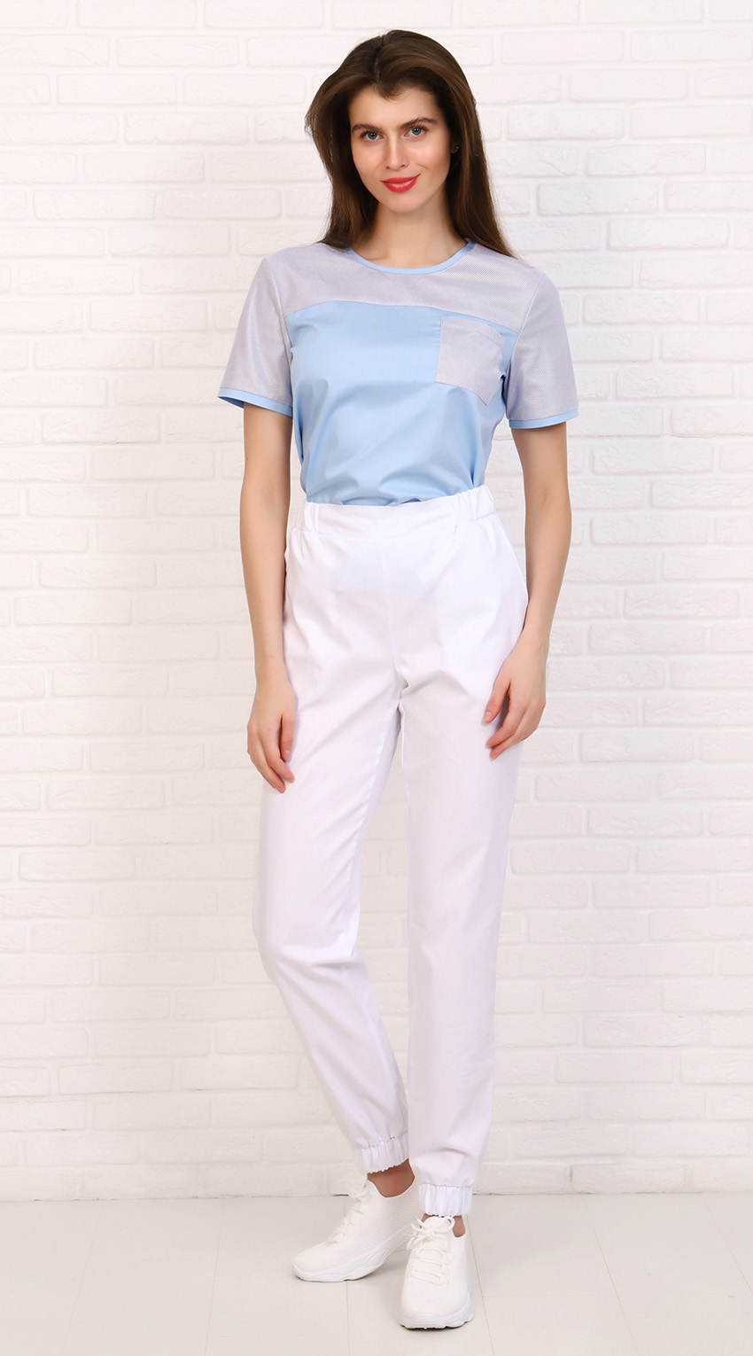 Брюки женские прямого силуэта с притачным поясом.Пояс состоит из двух частей. Центральная часть пояса передних половинок без эластичной ленты, вторая часть (задние половинки и бочка передних) стянута эластичной тесьмой.