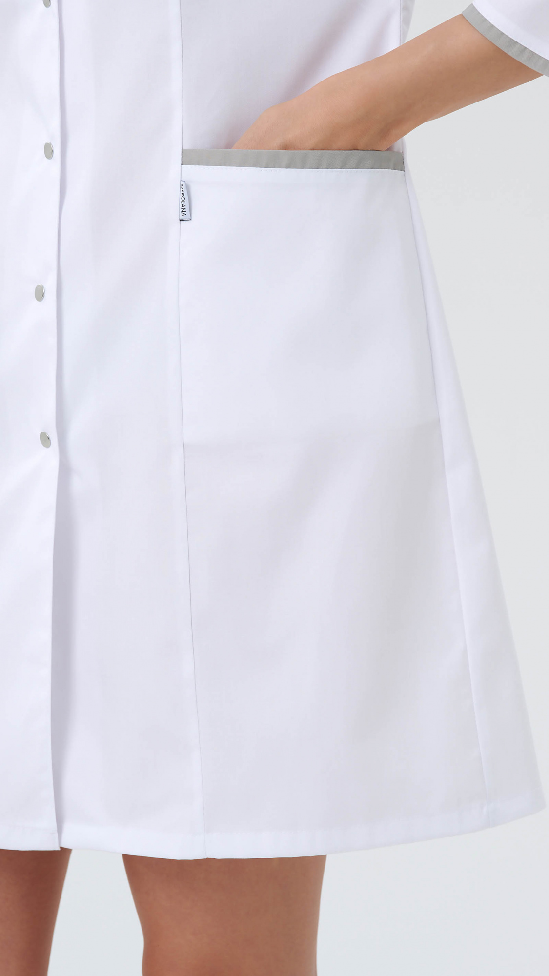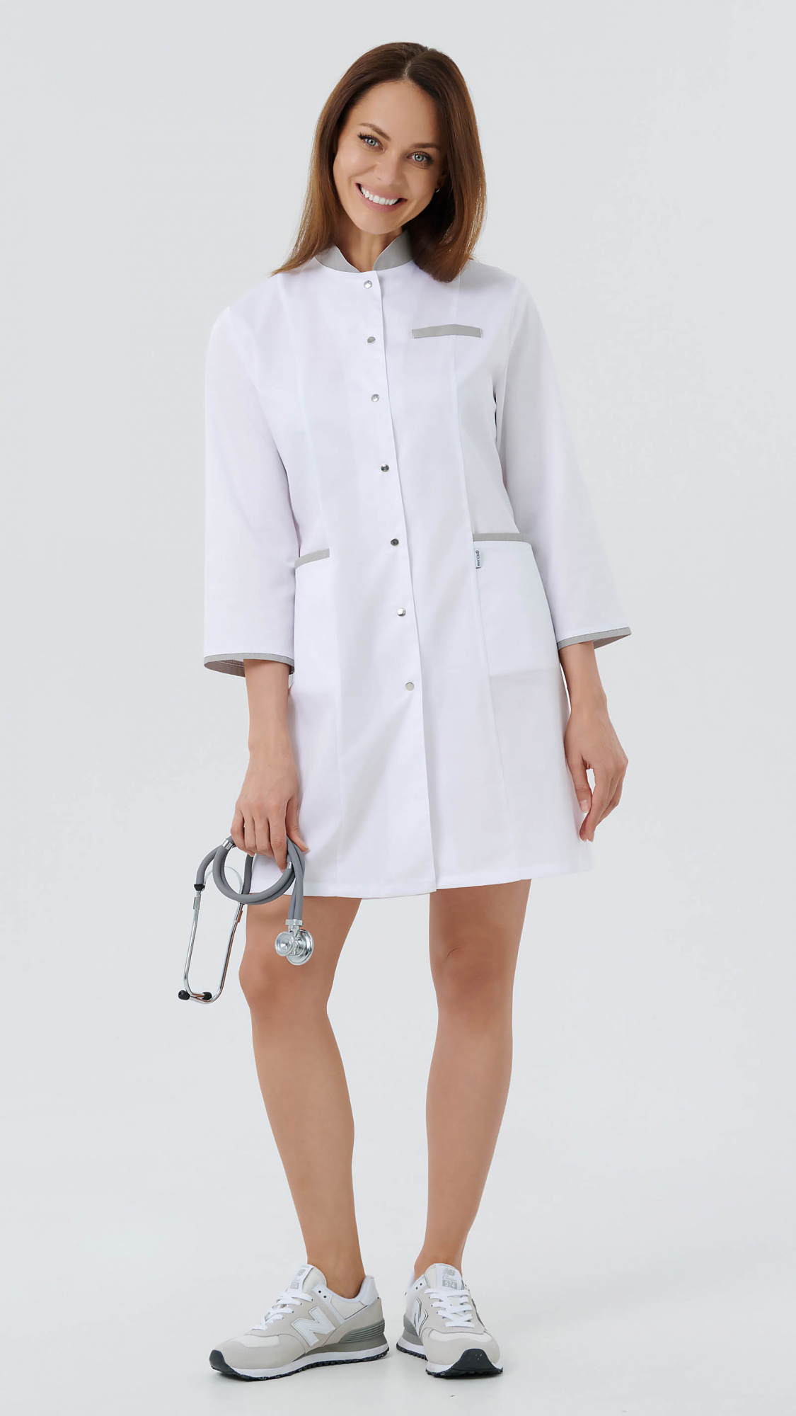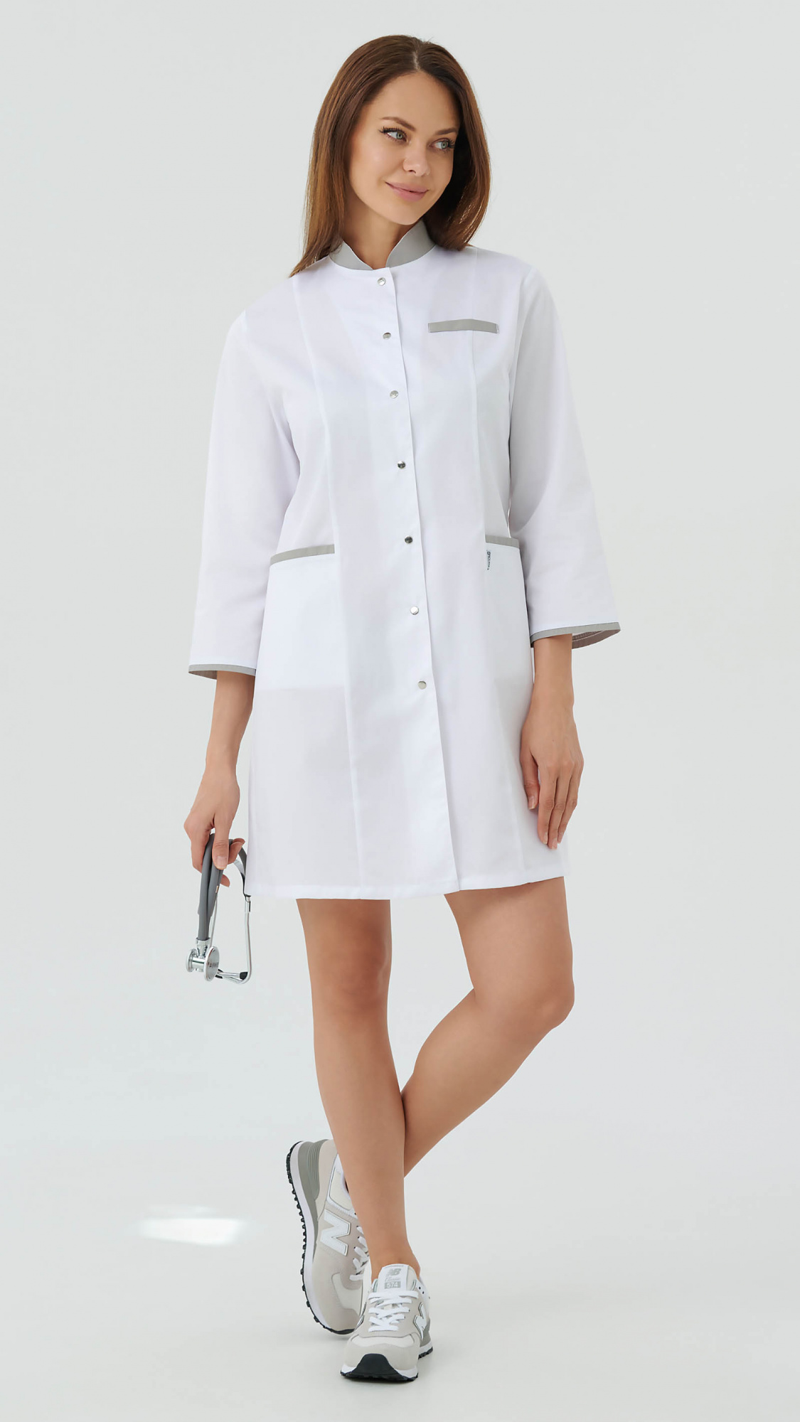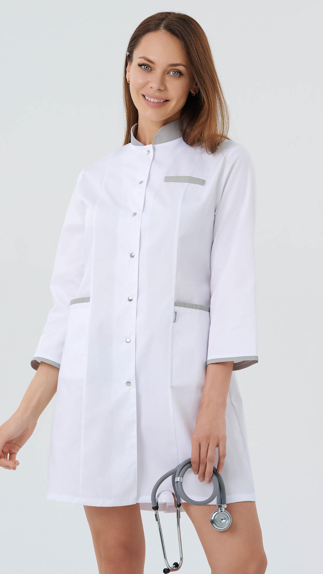 Халат медицинский женский прилегающего силуэта с центральной бортовой застежкой на 8 кнопок.Полочки с рельефами, выходящими из плечевых швов. На боковых частях полочек внутренние нижние карманы. Вход в карман обработан притачнми планками. На левой полочке декоративная листочка на уровне груди.