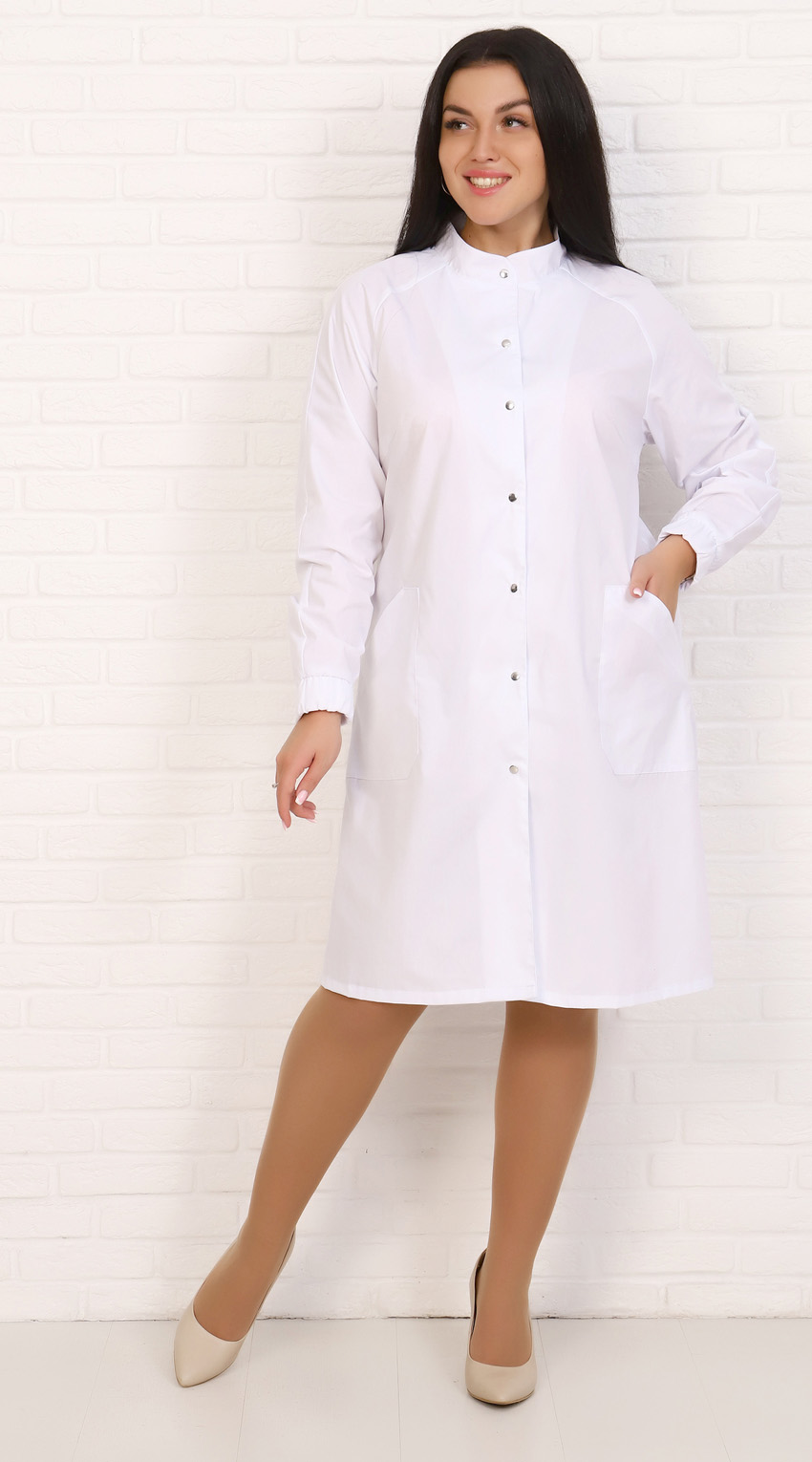Халат медицинский женский полуприлегающего силуэта с центральной бортовой застежкой на 7 кнопок.Полочки халата с нагрудными выточками, с накладными нижними боковыми карманами с наклонным входом.