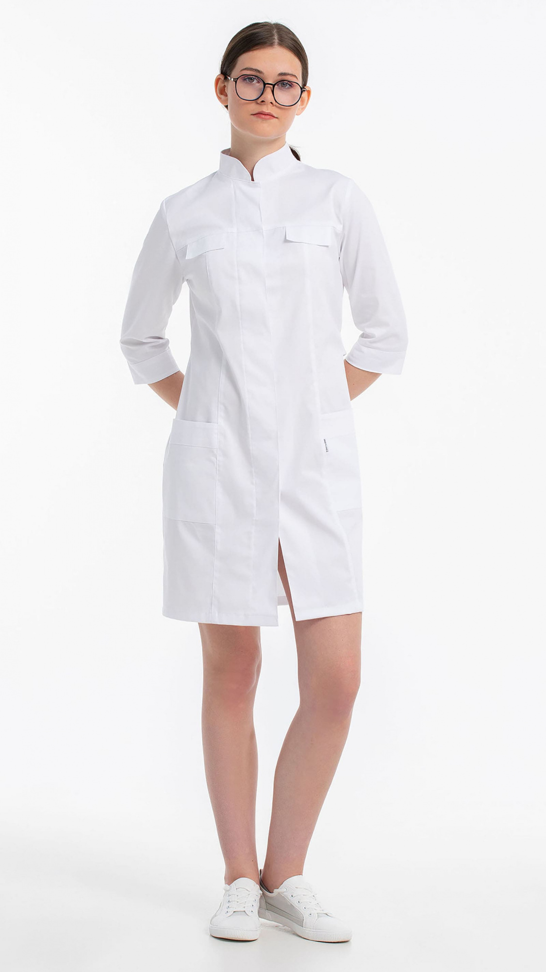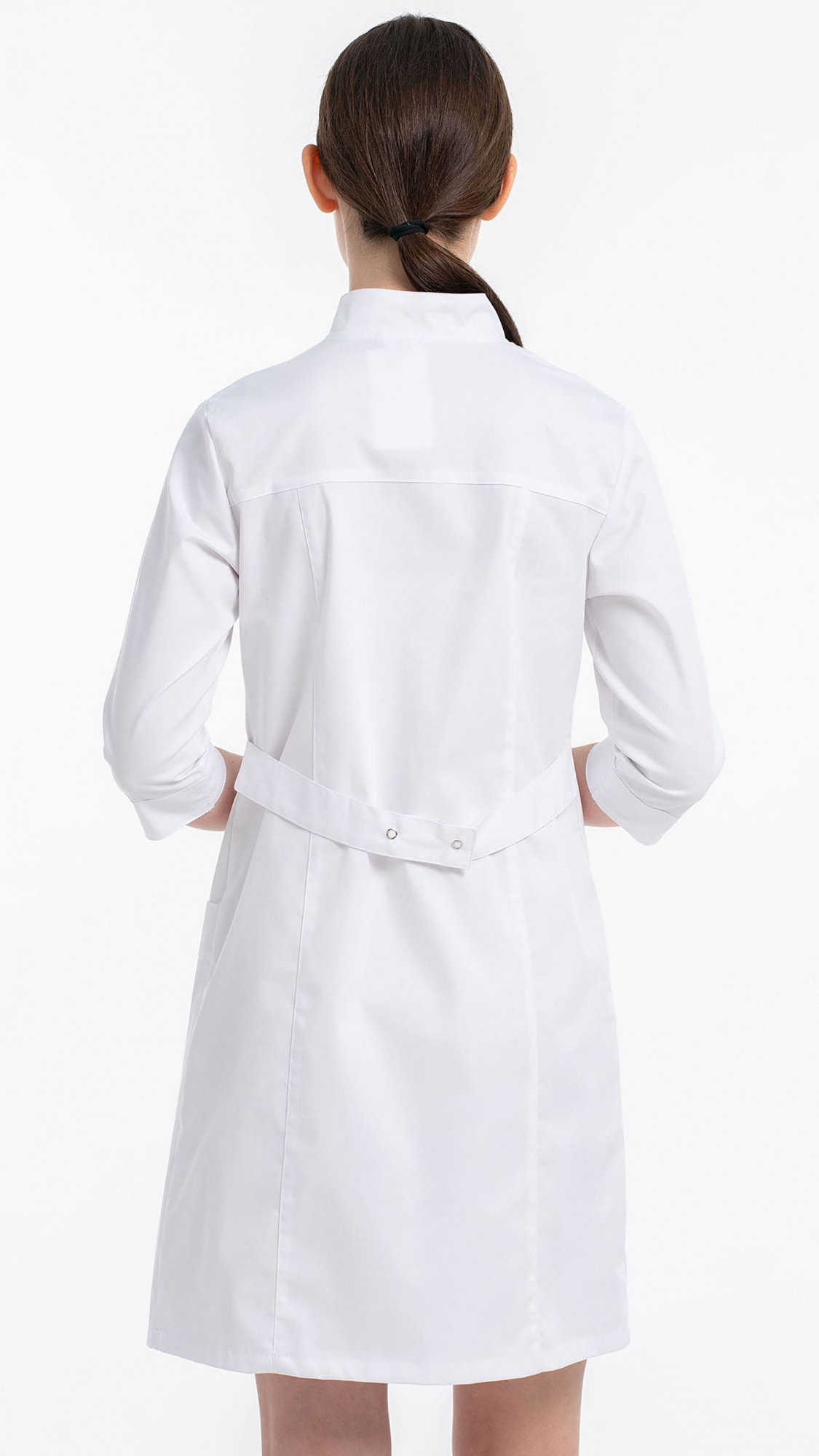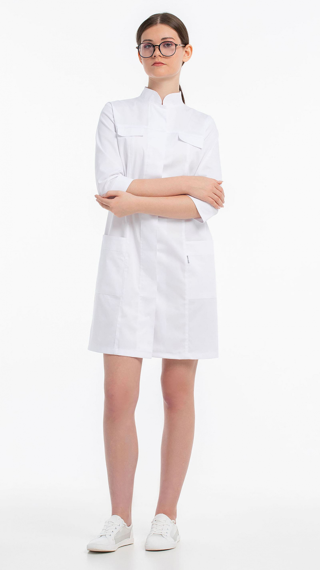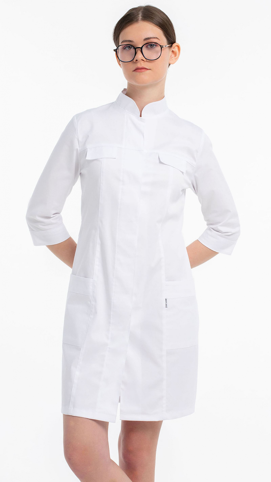 Халат женский полуприлегающего силуэта с центральной бортовой супатной застежкой на 7 кнопок.Полочки с кокетками, с рельефами и клапанами из-под кокеток. Два нижних накладных кармана входят в боковые и рельефные швы. Входы в карманы обработаны планками.