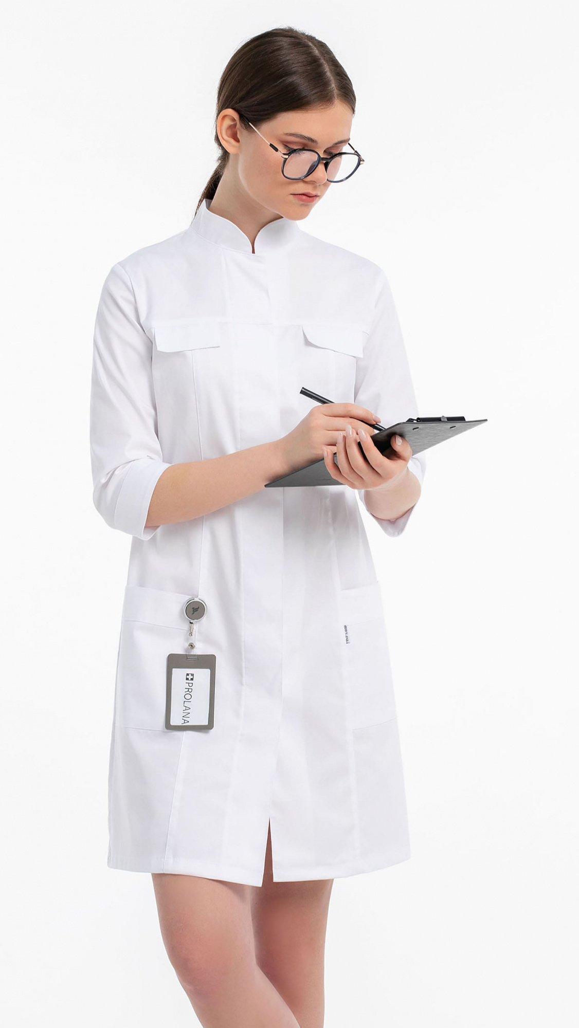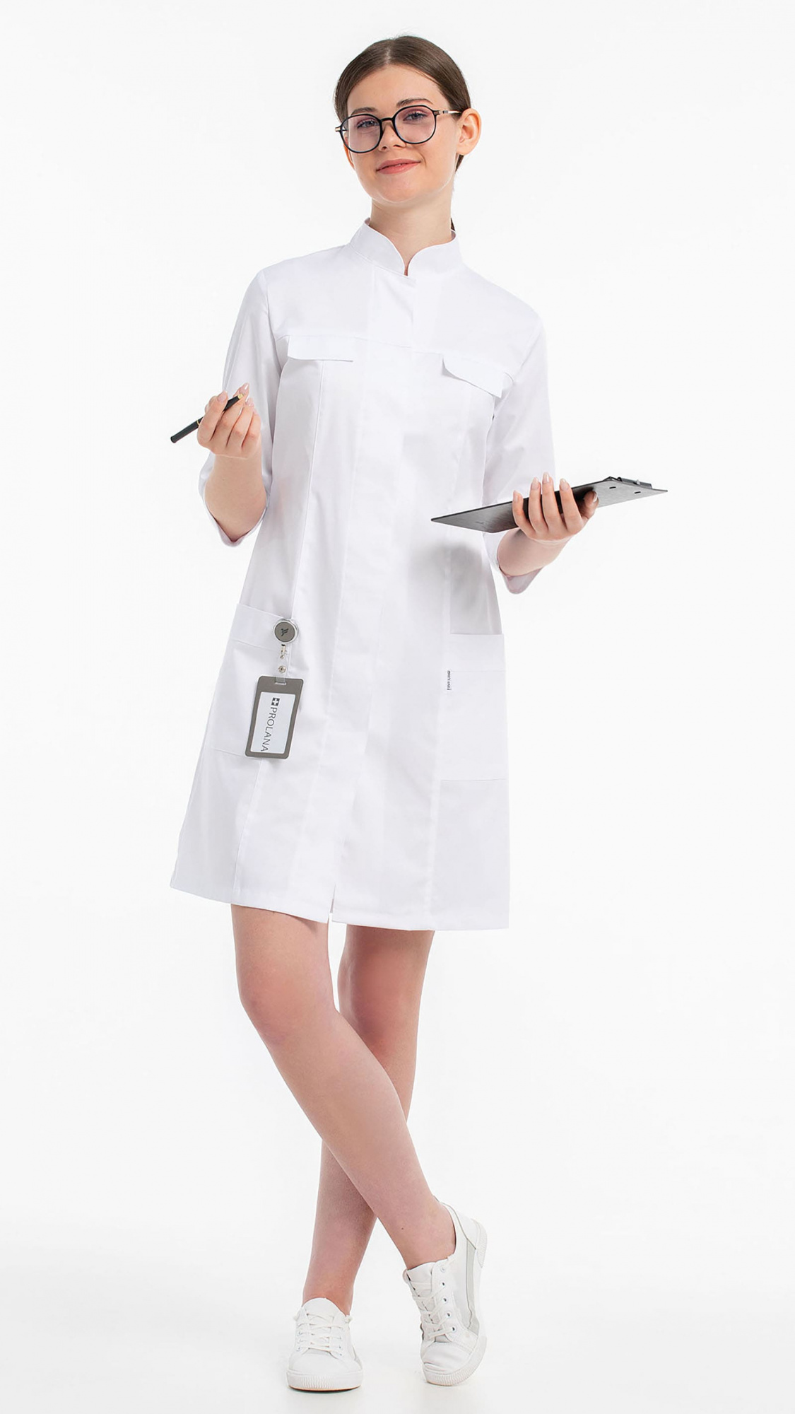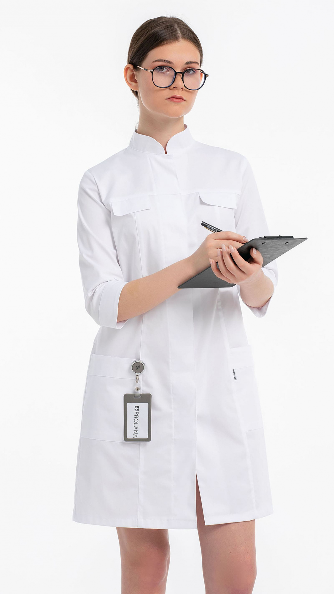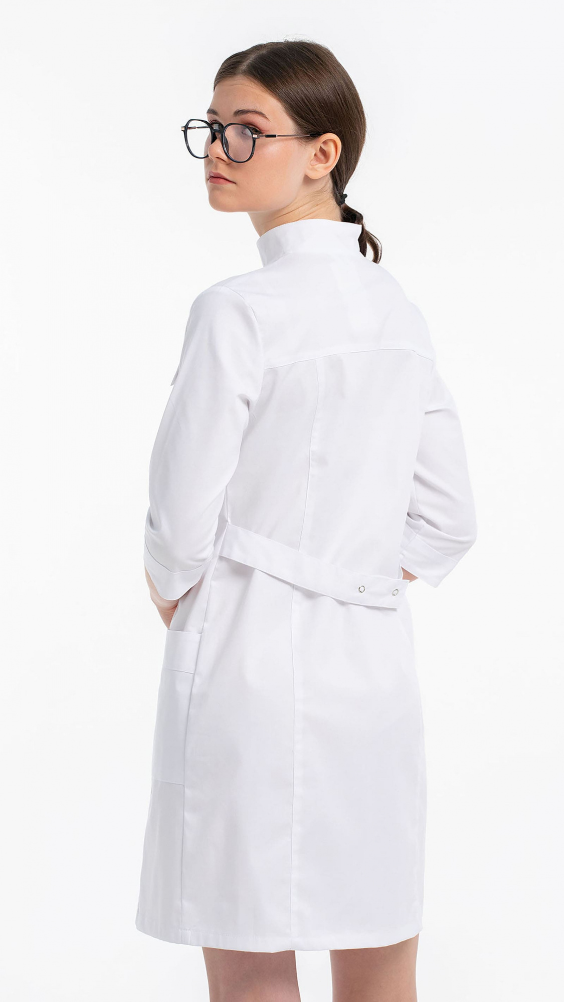 Халат женский полуприлегающего силуэта с центральной бортовой супатной застежкой на 7 кнопок.Полочки с кокетками, с рельефами и клапанами из-под кокеток. Два нижних накладных кармана входят в боковые и рельефные швы. Входы в карманы обработаны планками.