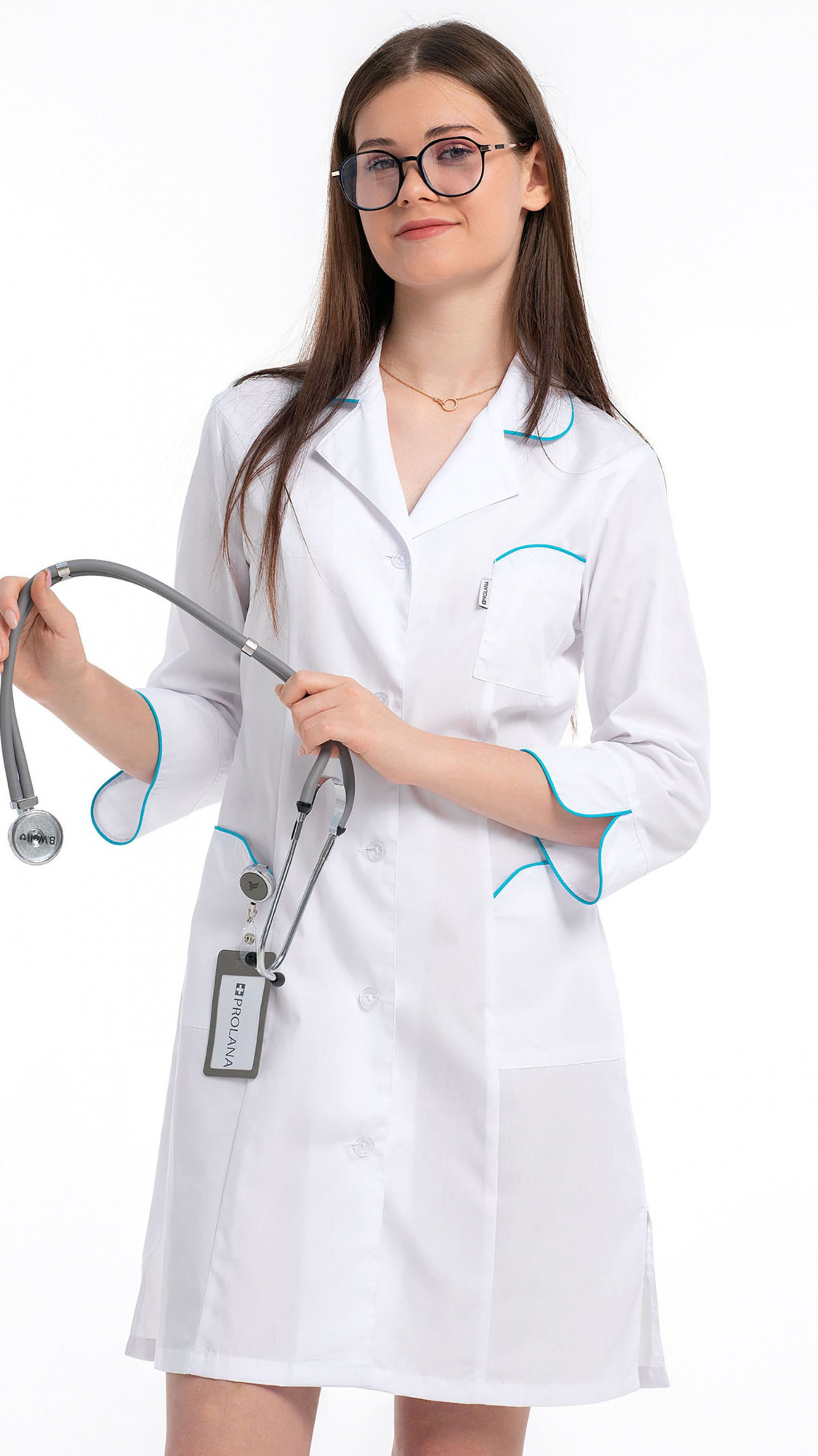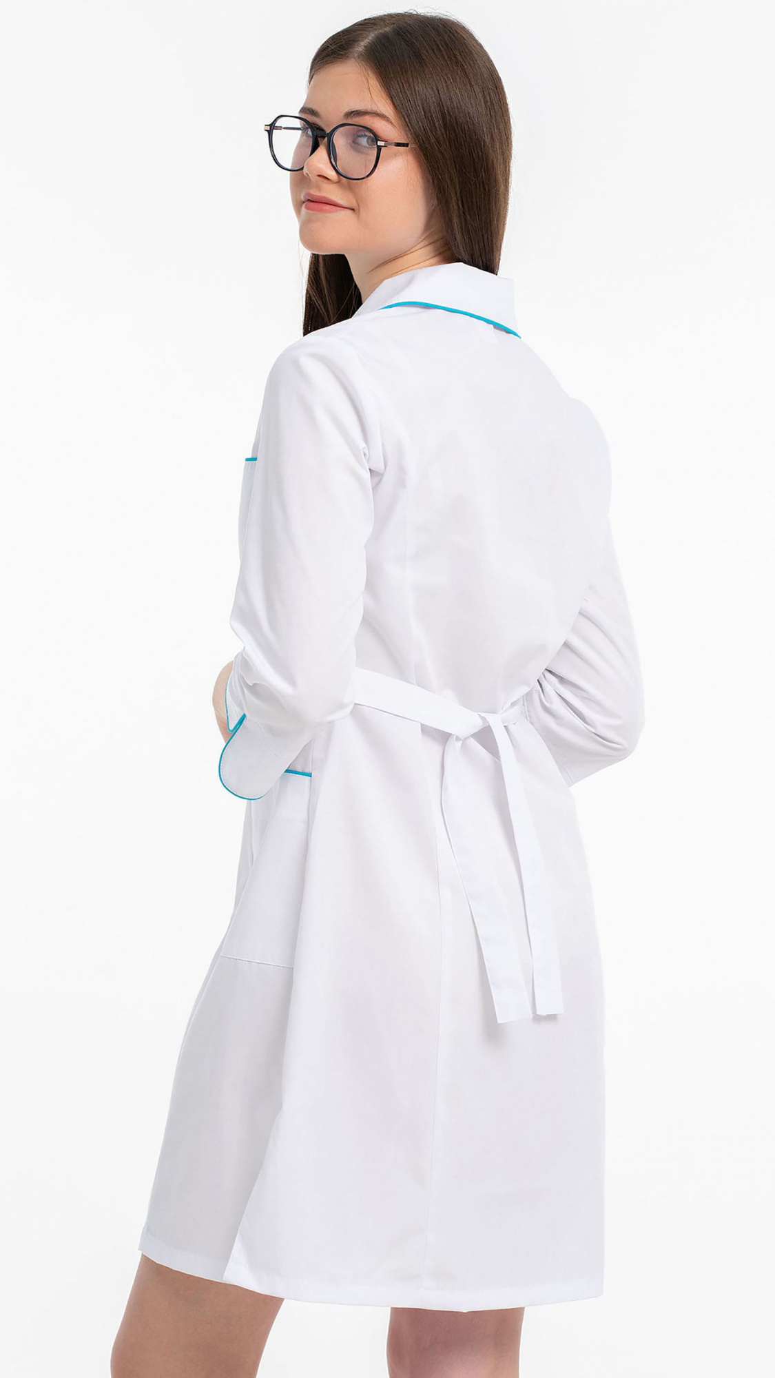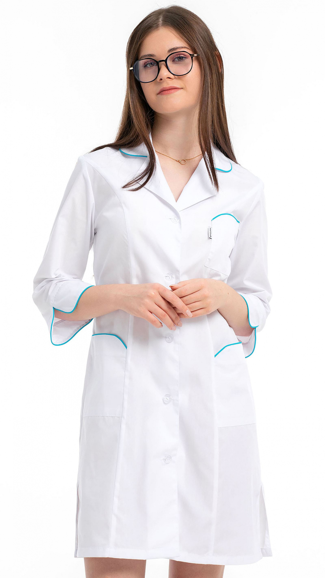 Халат медицинский женский, полуприлегающего силуэта с центральной бортовой застежкой на 5 петель и 5 пуговиц.Полочки халата с рельефами, выходящими из проймы. На боковых частях полочек нижние накладные карманы фигурной формы. На левой полочке накладной нагрудный карман фигурной формы.