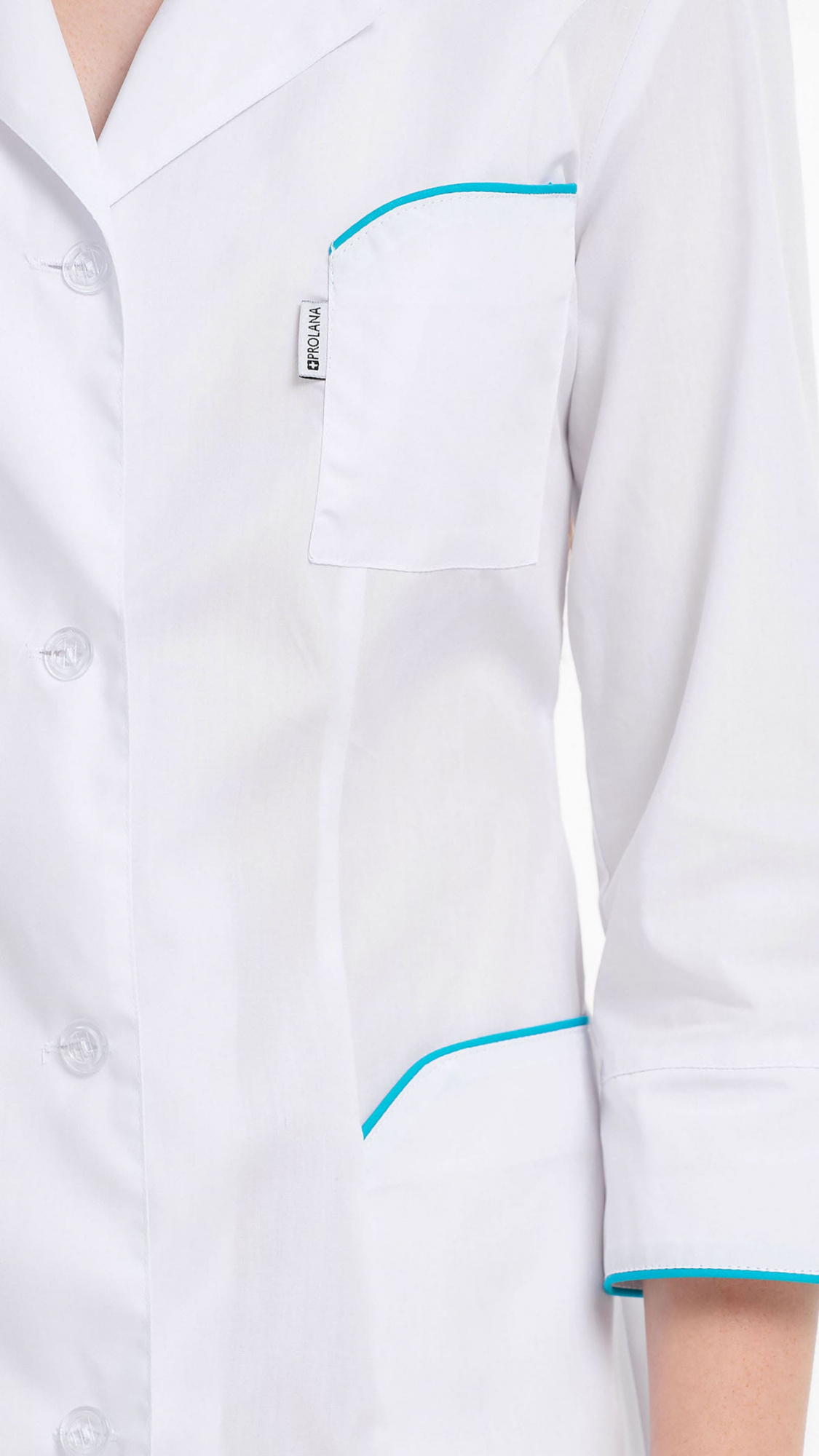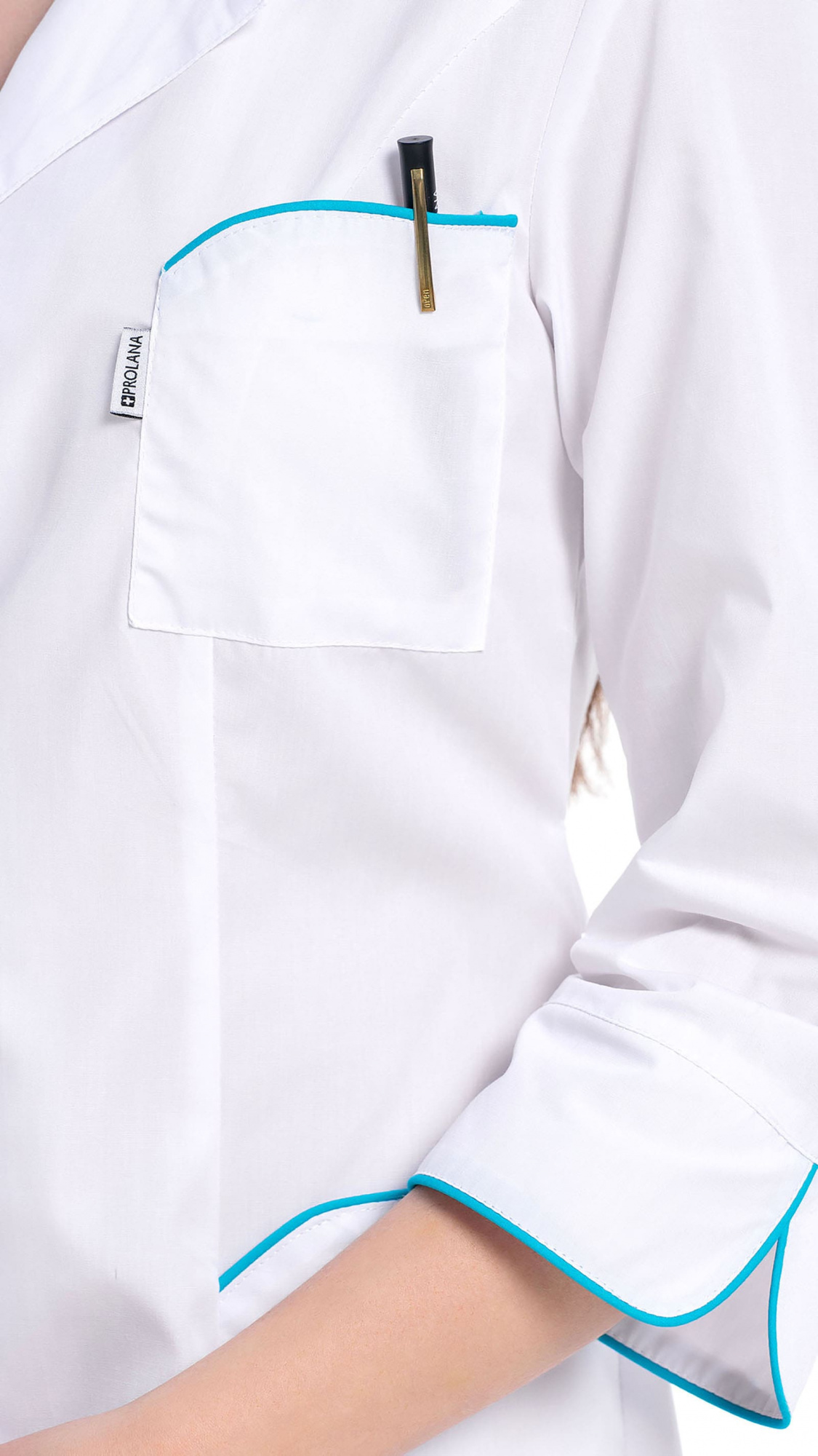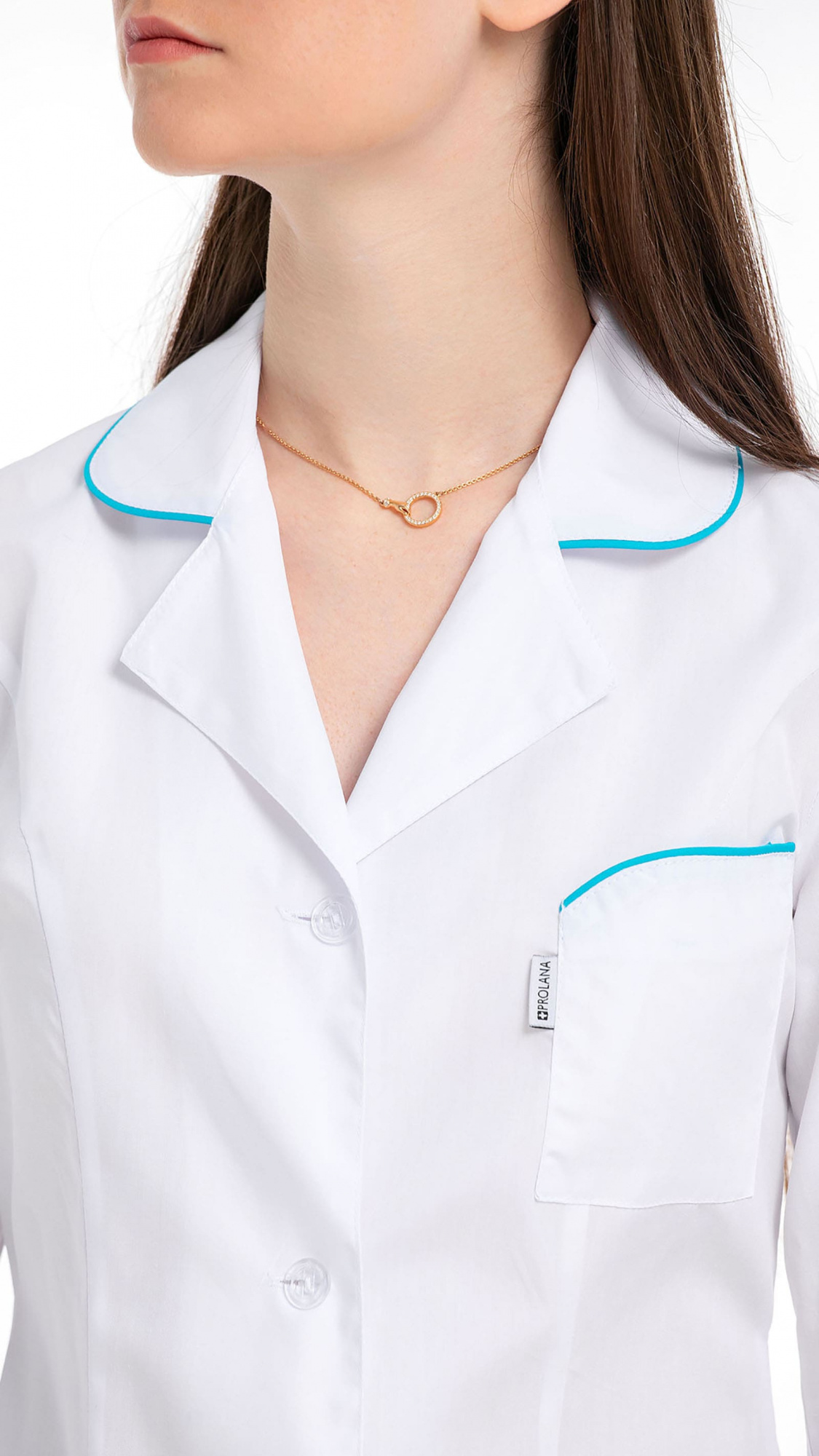 Халат медицинский женский, полуприлегающего силуэта с центральной бортовой застежкой на 5 петель и 5 пуговиц.Полочки халата с рельефами, выходящими из проймы. На боковых частях полочек нижние накладные карманы фигурной формы. На левой полочке накладной нагрудный карман фигурной формы.