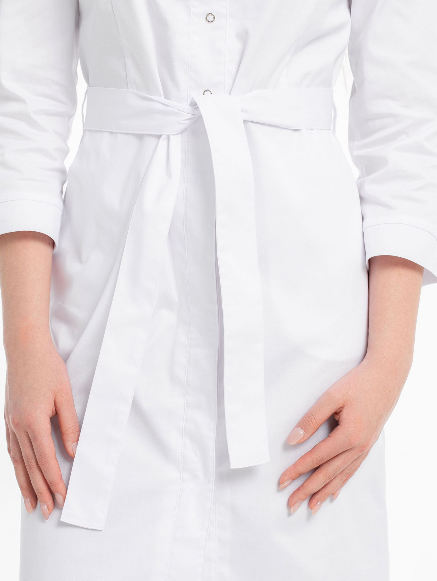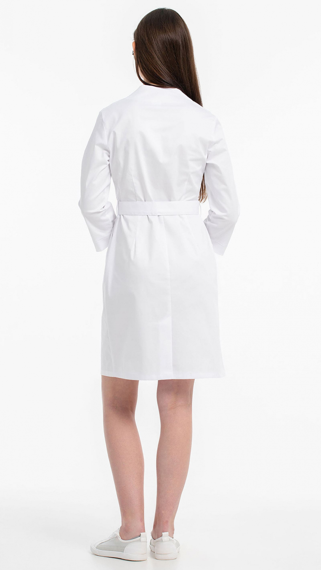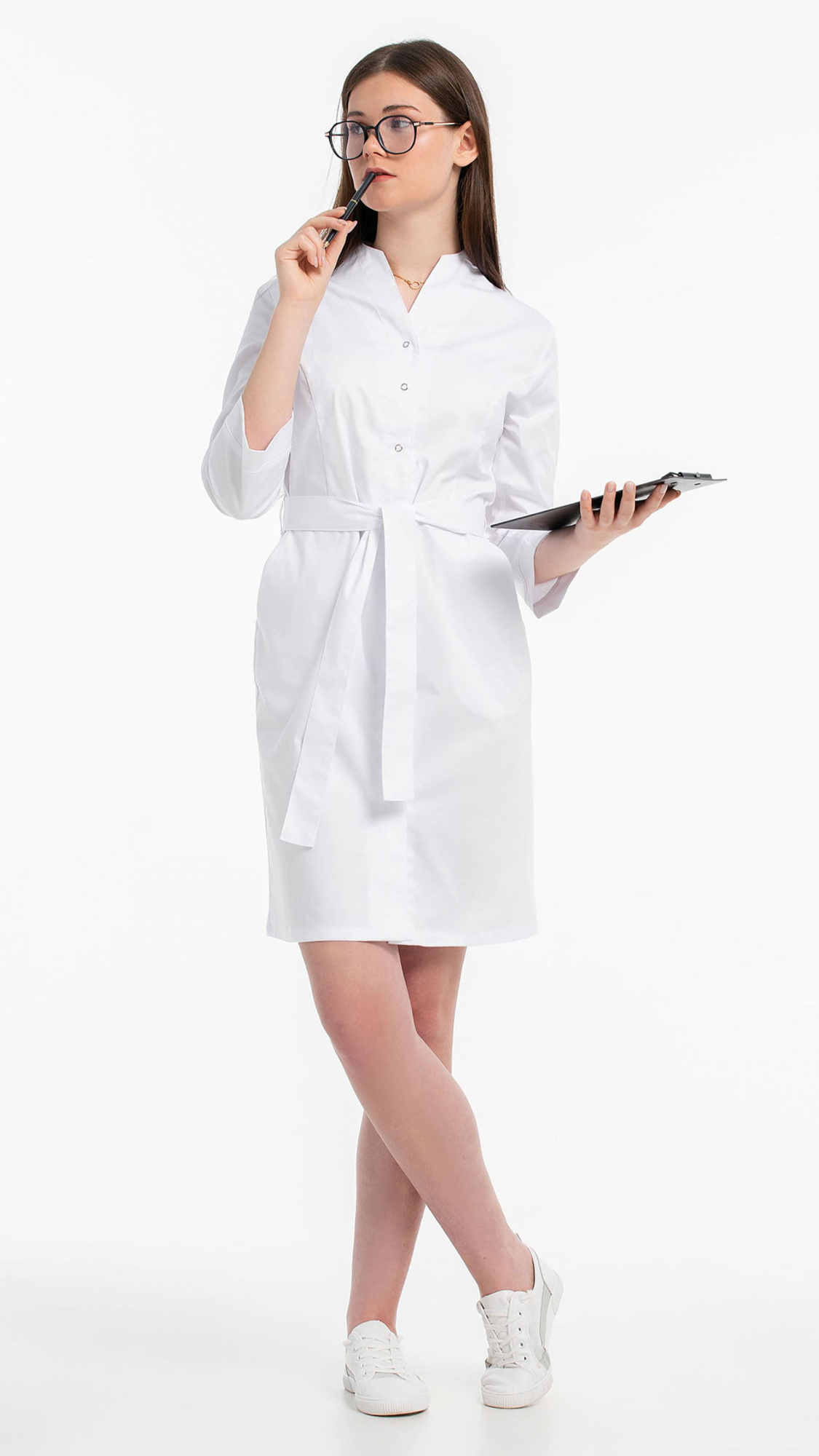 Халат медицинский женский полуприлегающего силуэта с центральной бортовой застёжкой на 9 кнопок с цельнокроеной стойкой, с V-образным вырезом горловины.Полочки отрезные по линии талии. Верхние части полочек с рельефами, выходящими из проймы. На нижних частях полочек внутренние боковые карманы с отрезными бочками. Края бортов обработаны притачными планками. Планка на нижней части полочки с супатом.