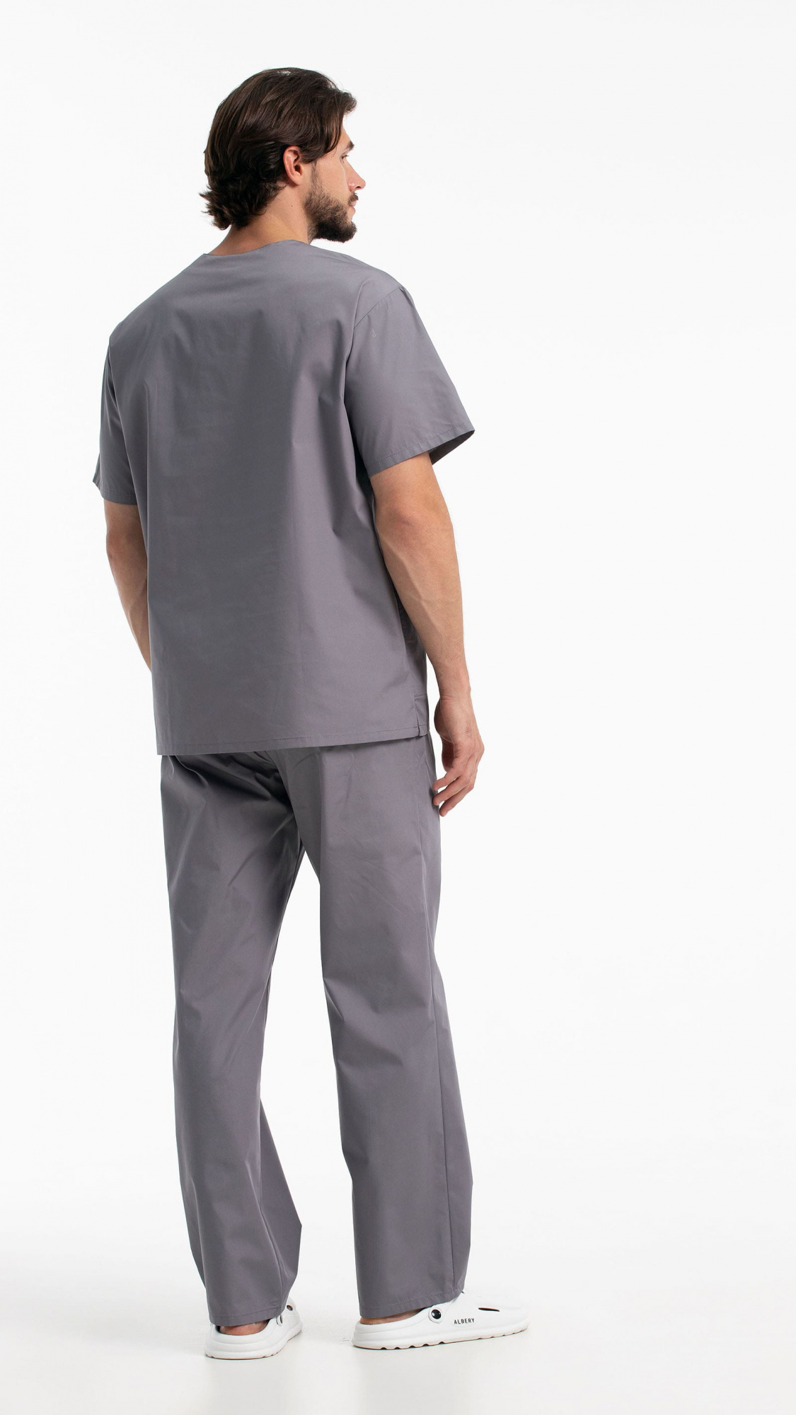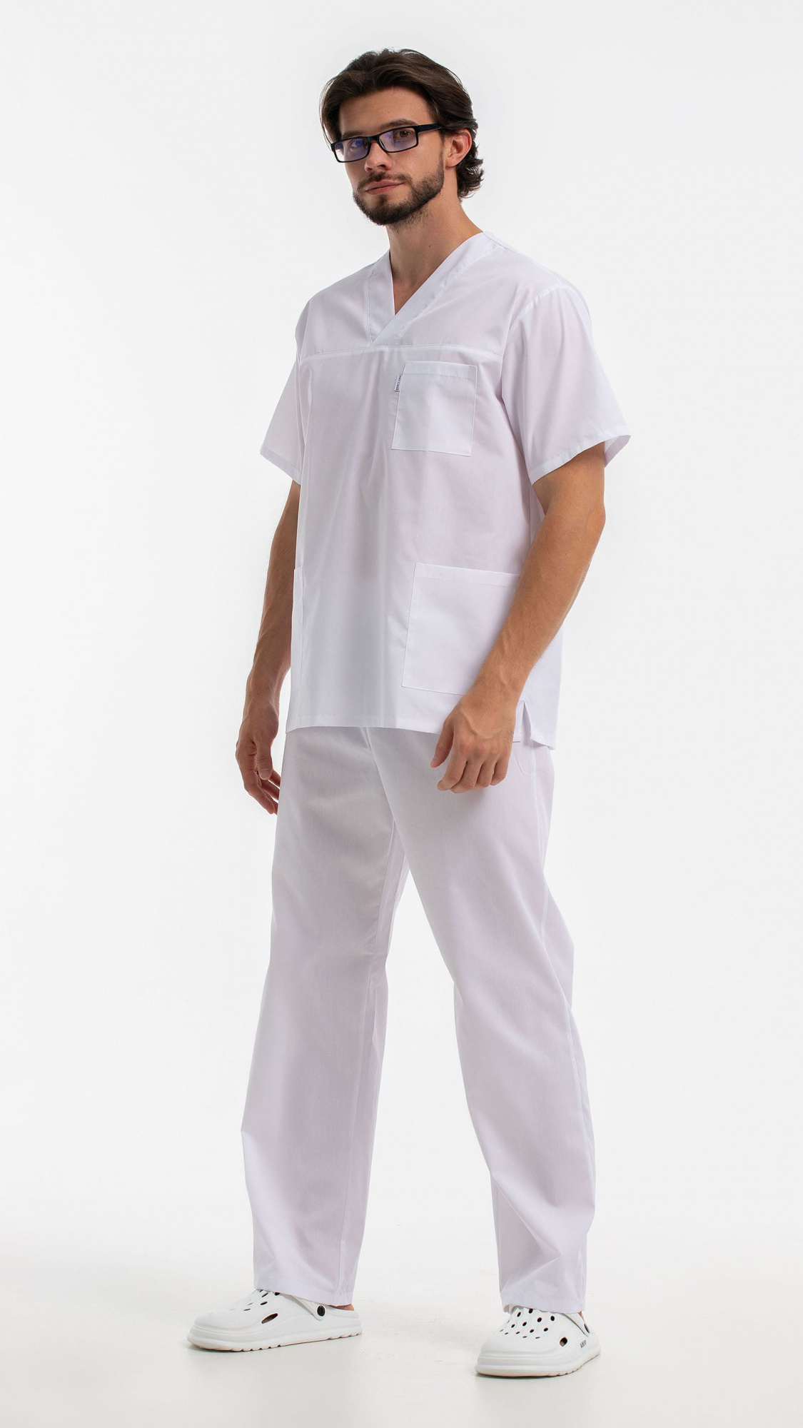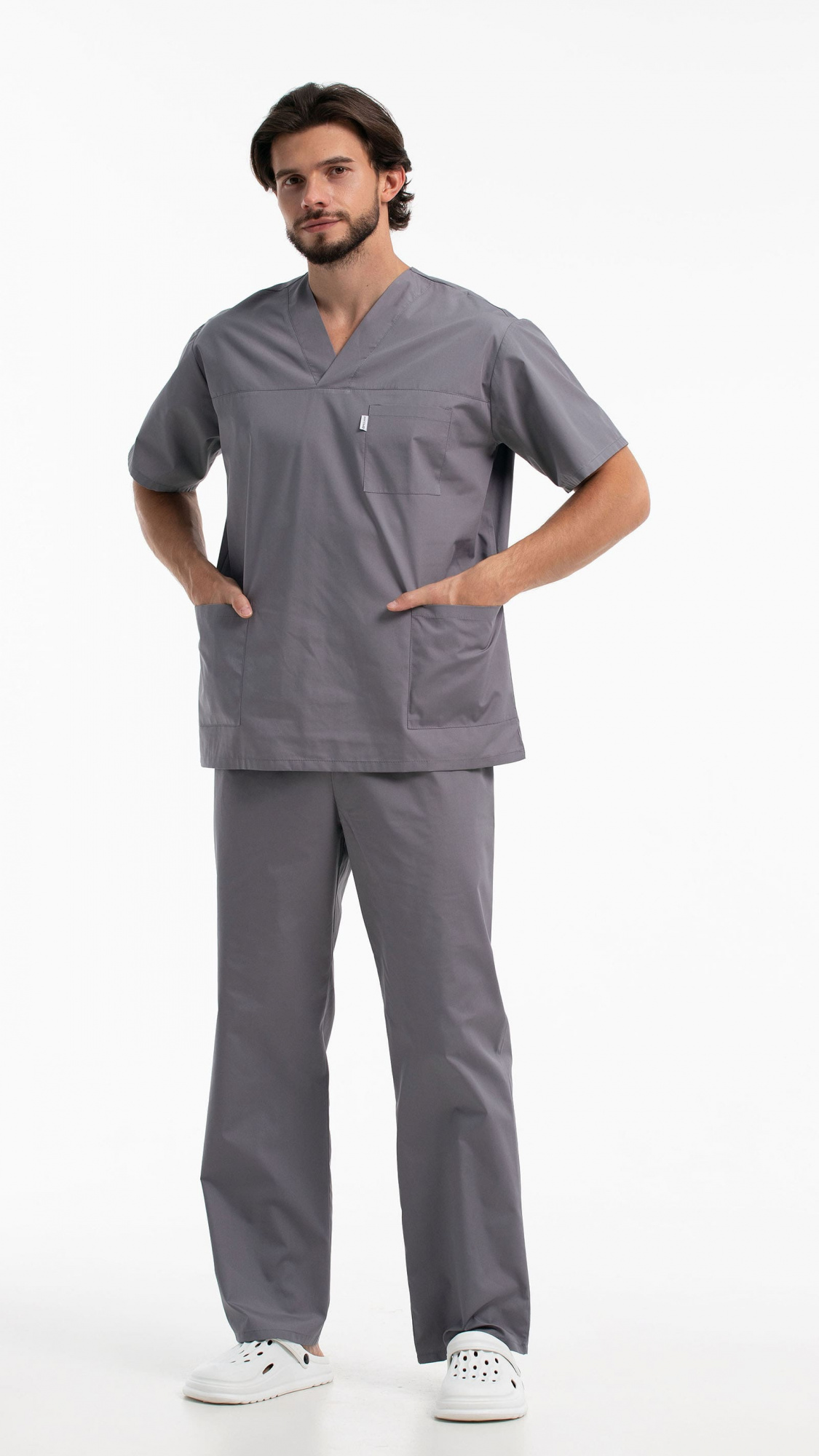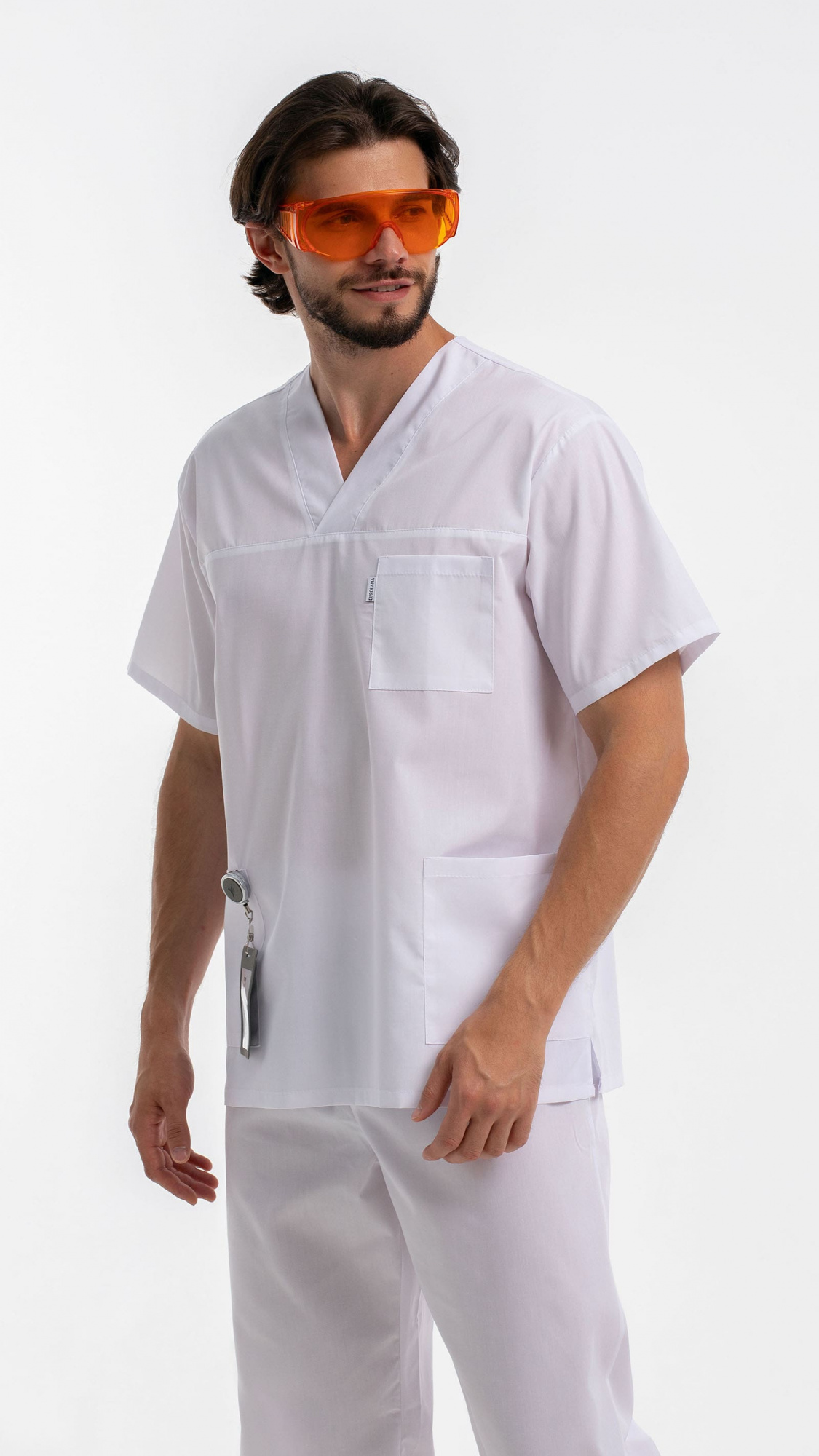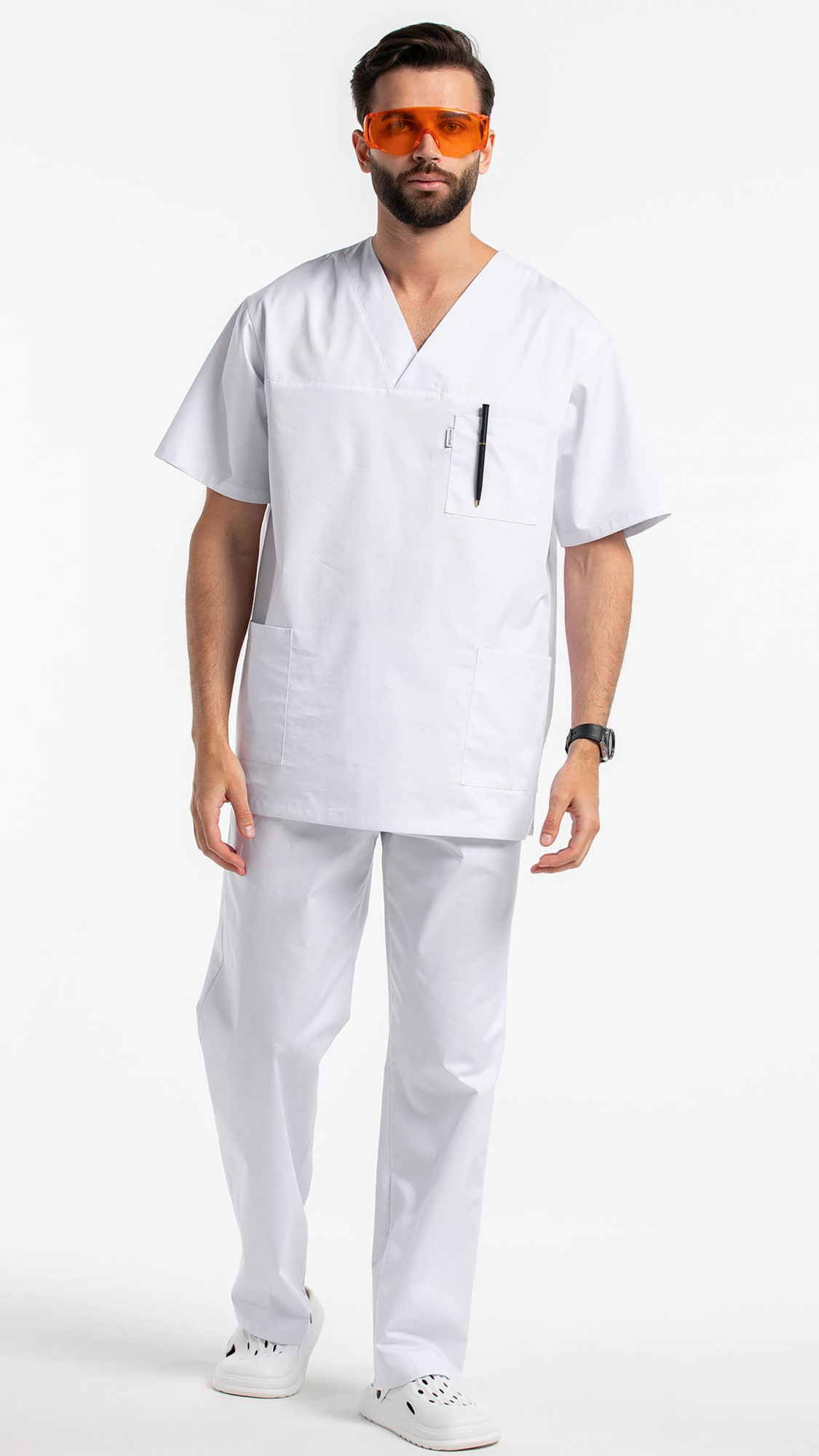 Костюм хирургический мужской состоит из блузы и брюк.Блюза прямого силуэта с V -образным вырезом горловины, с боковыми разрезами.