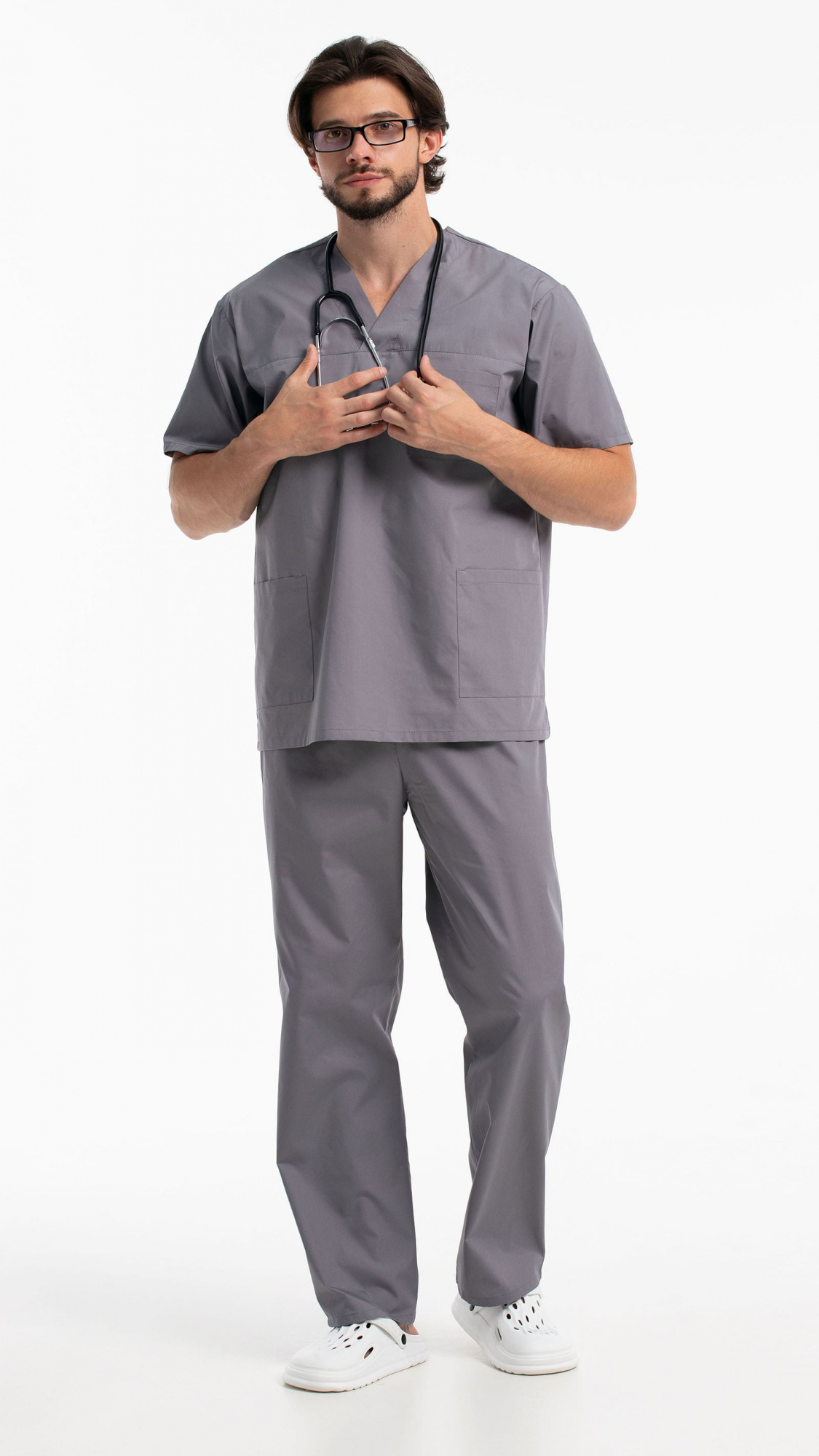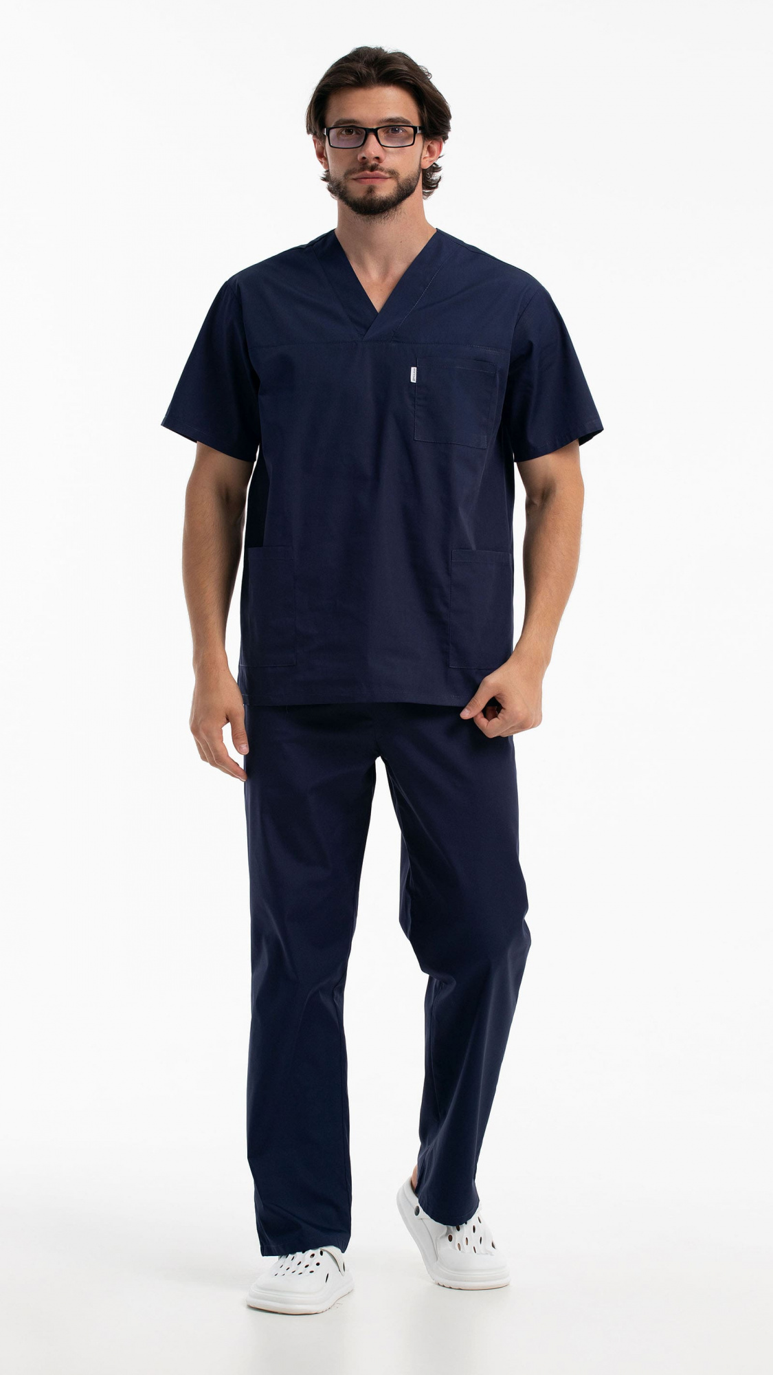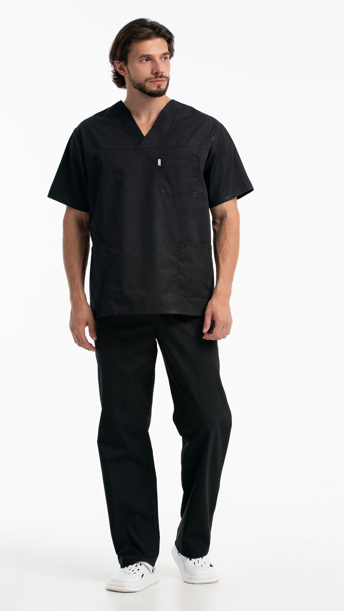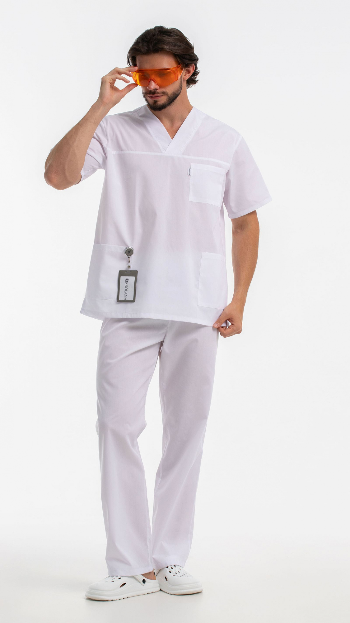Костюм хирургический мужской состоит из блузы и брюк.Блюза прямого силуэта с V -образным вырезом горловины, с боковыми разрезами.