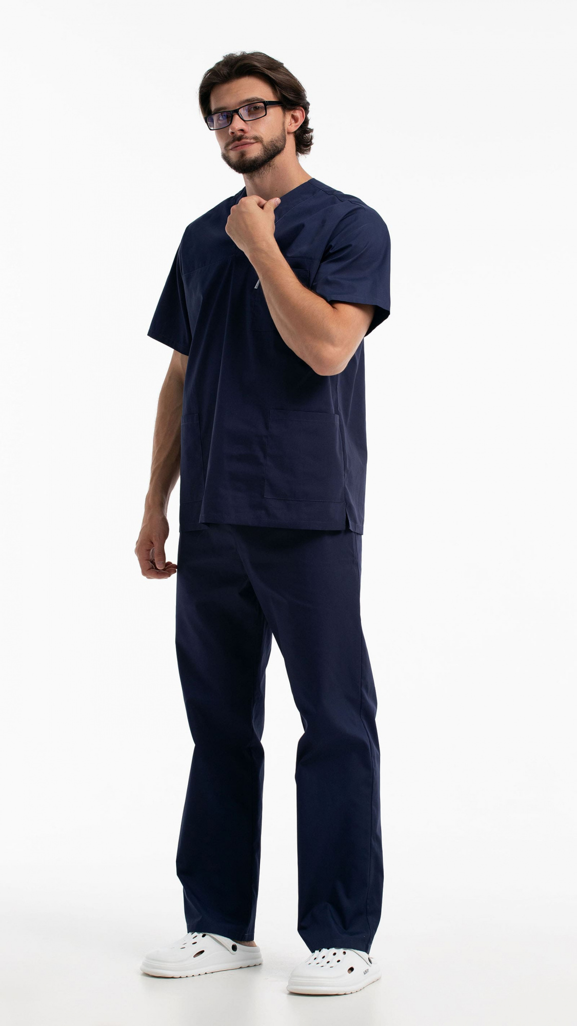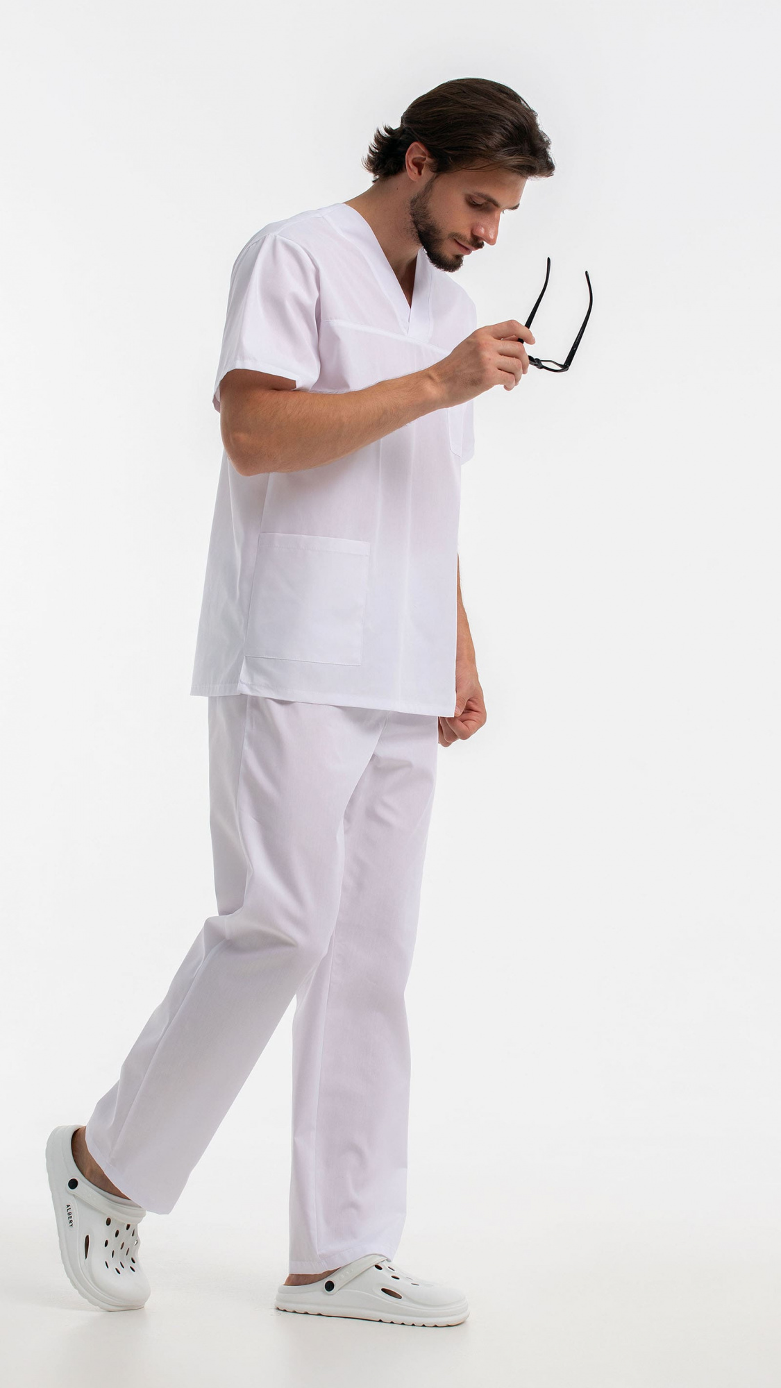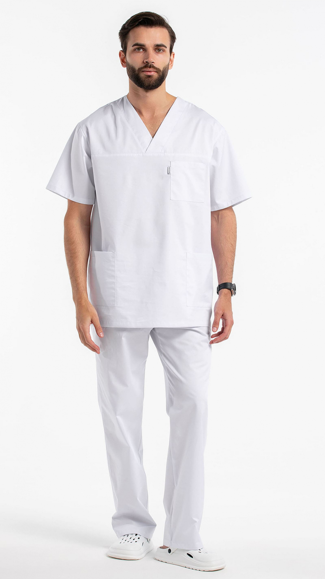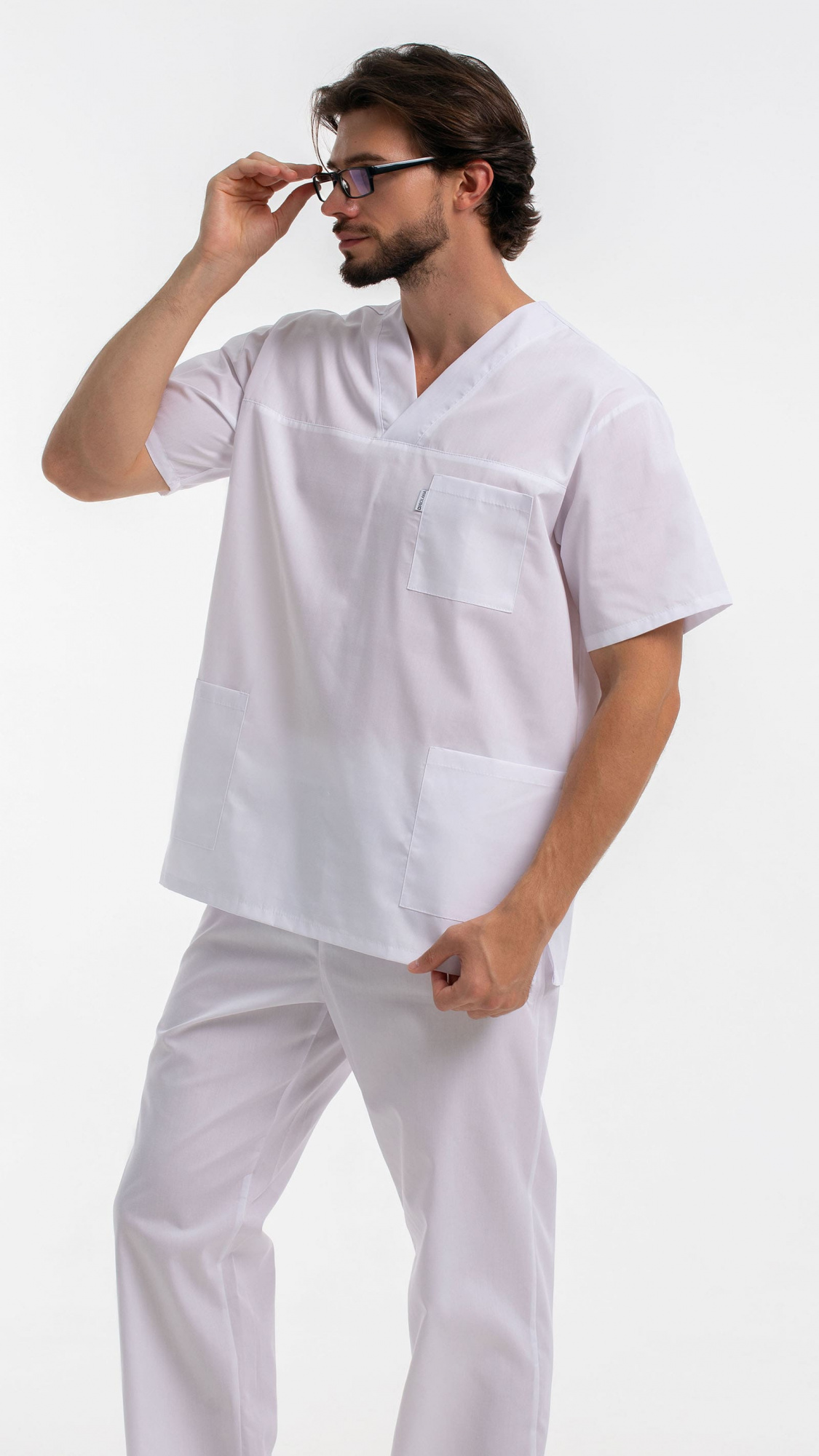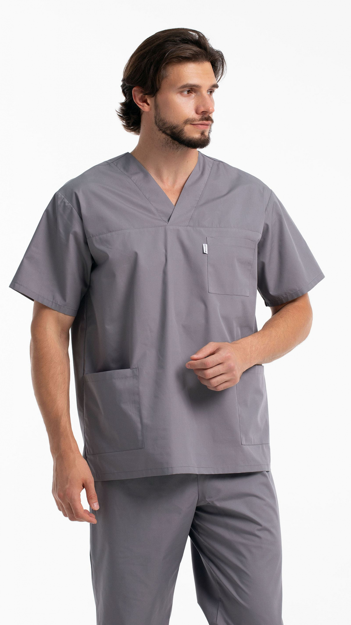 Костюм хирургический мужской состоит из блузы и брюк.Блюза прямого силуэта с V -образным вырезом горловины, с боковыми разрезами.