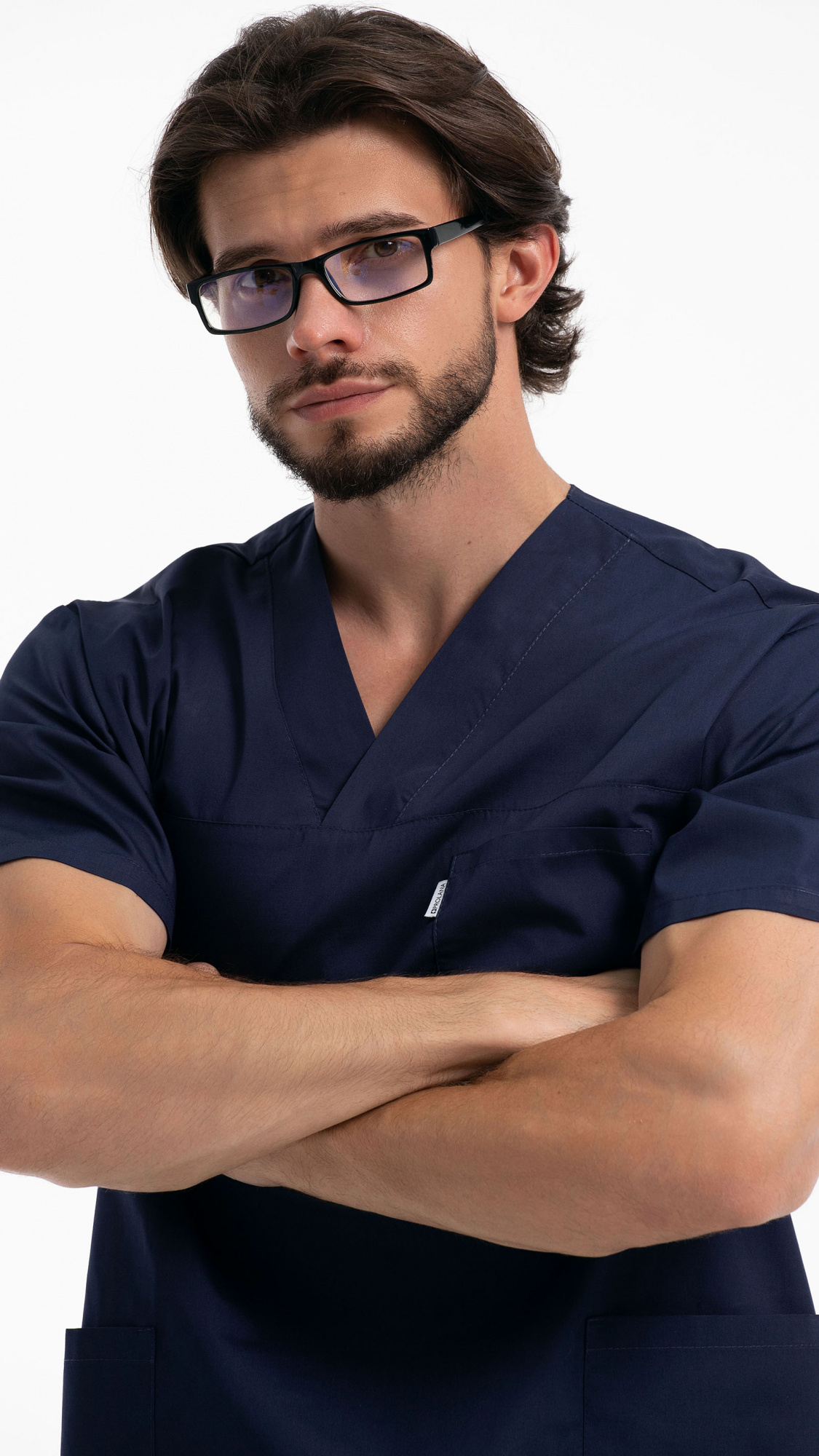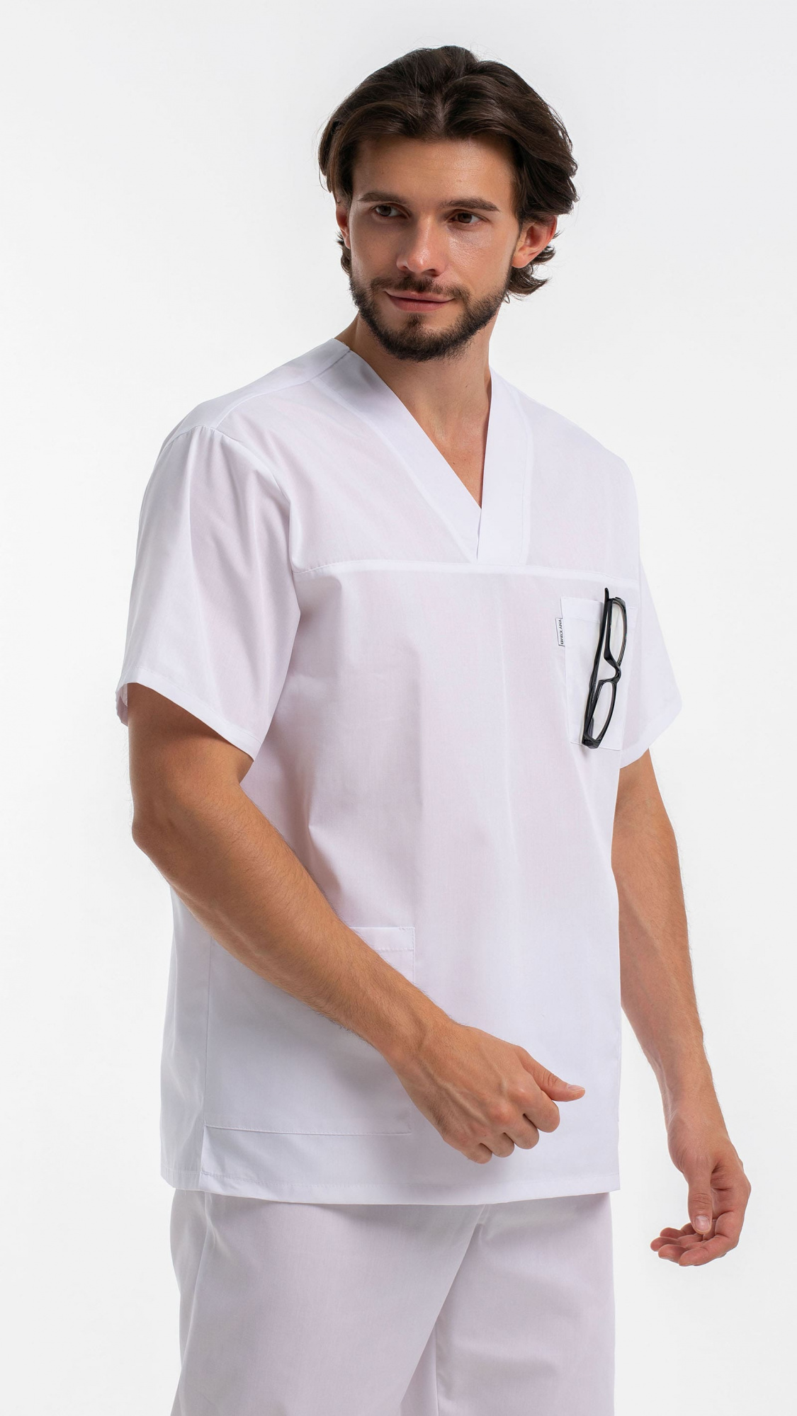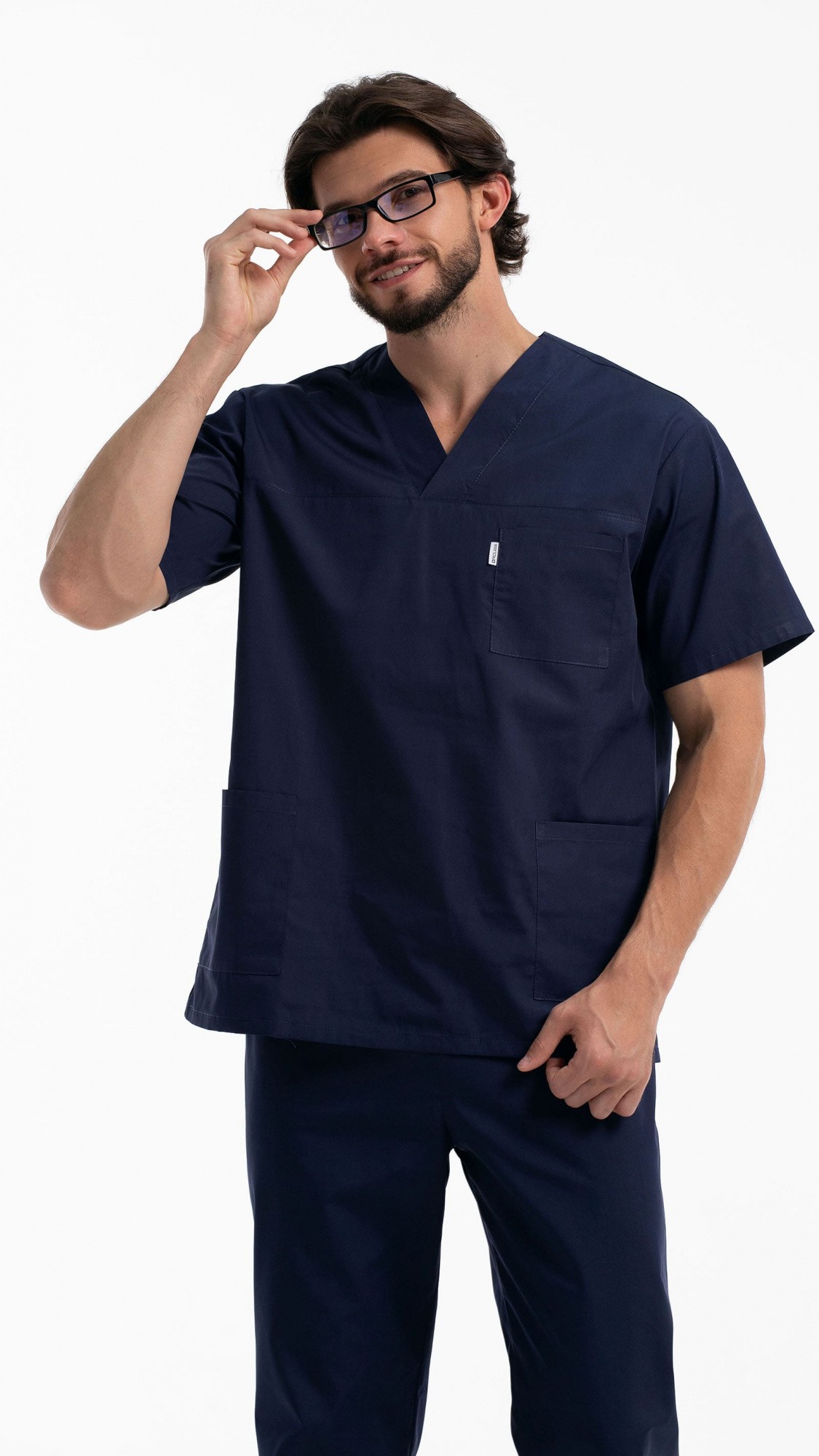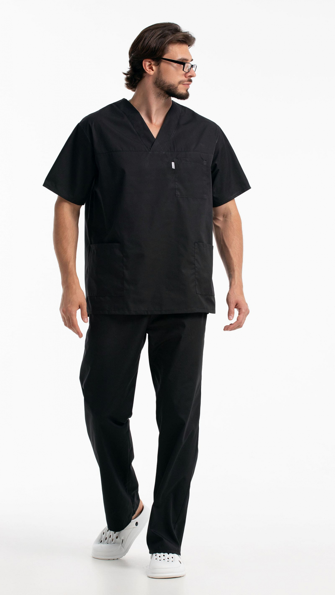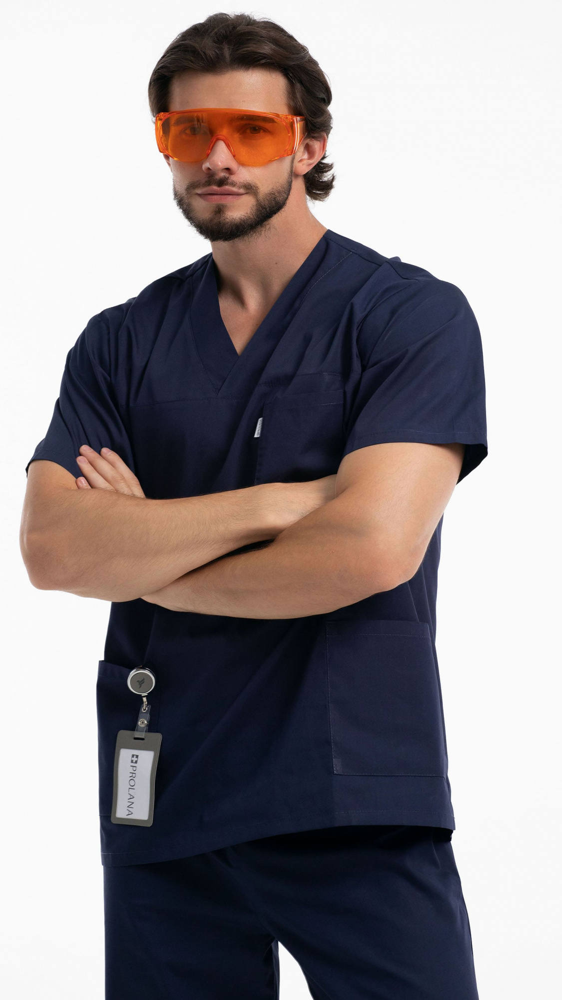 Костюм хирургический мужской состоит из блузы и брюк.Блюза прямого силуэта с V -образным вырезом горловины, с боковыми разрезами.
