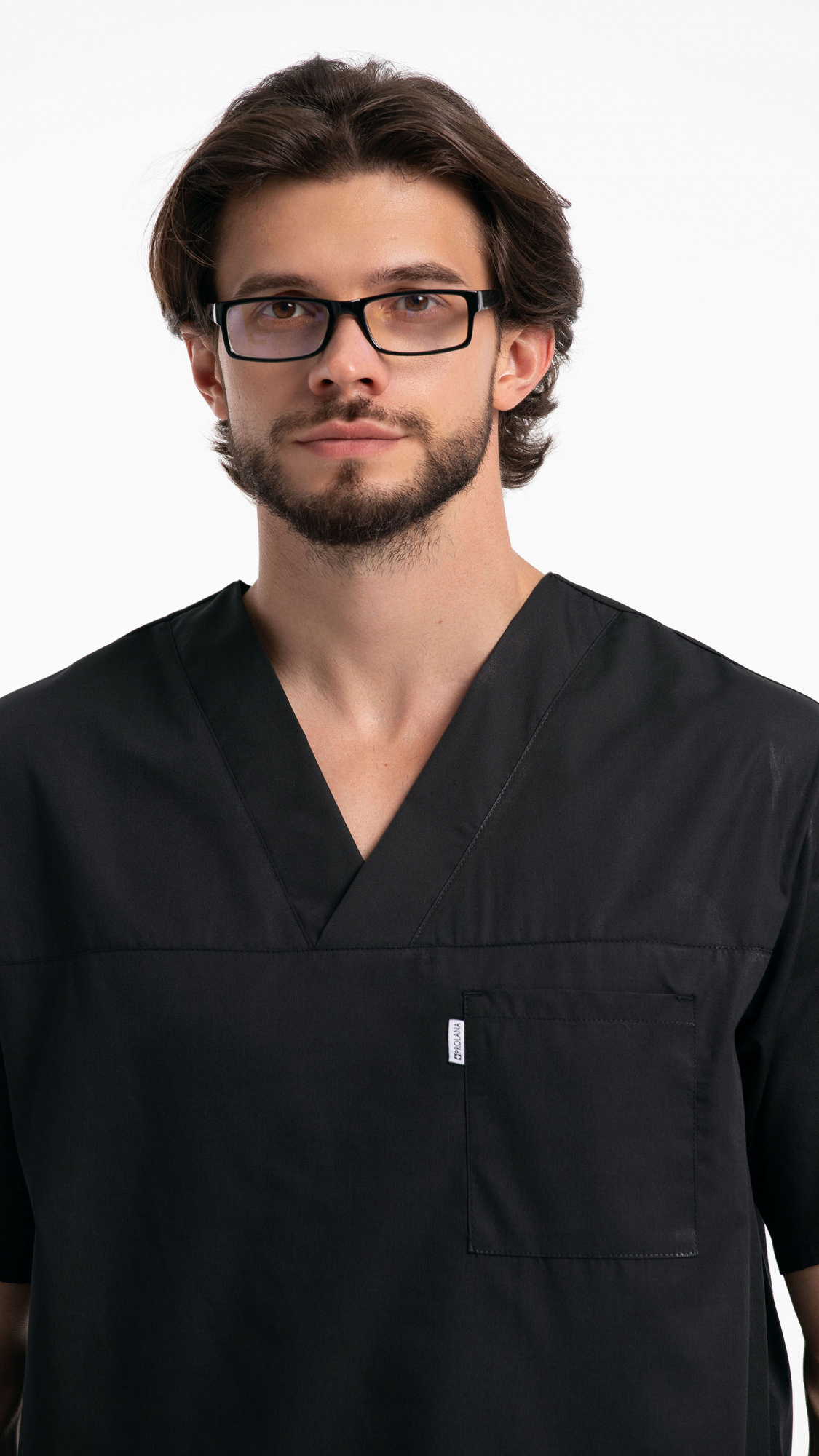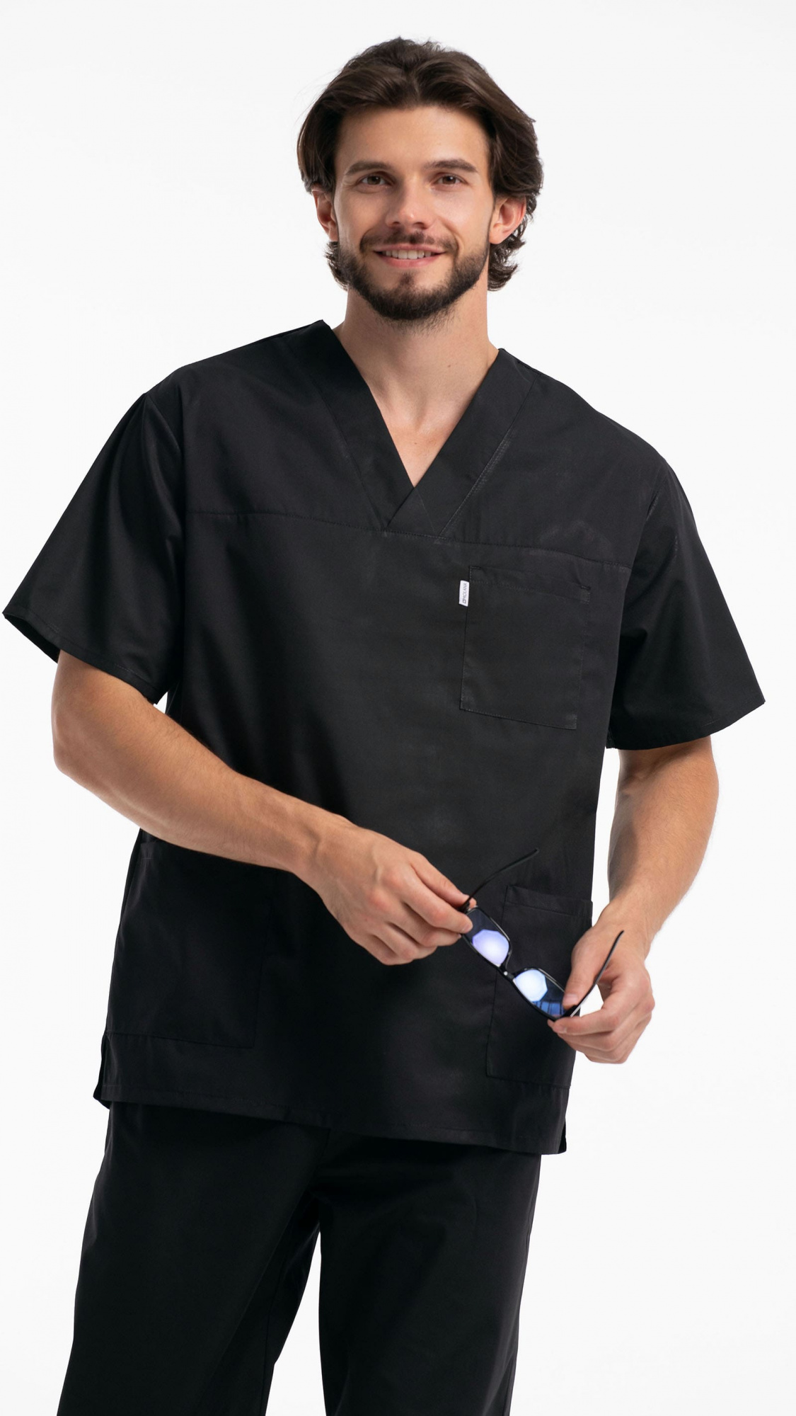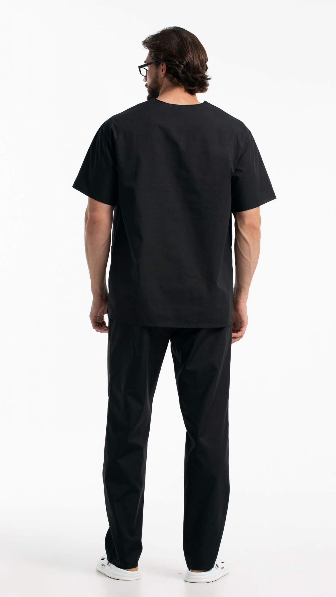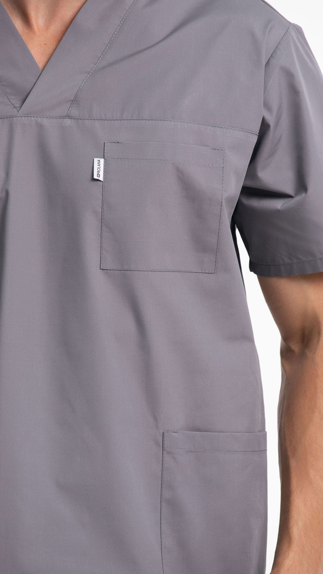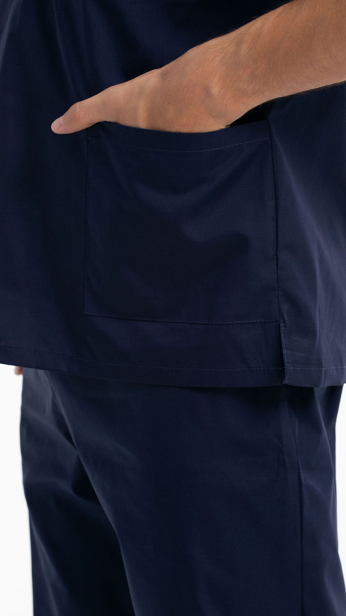 Костюм хирургический мужской состоит из блузы и брюк.Блюза прямого силуэта с V -образным вырезом горловины, с боковыми разрезами.