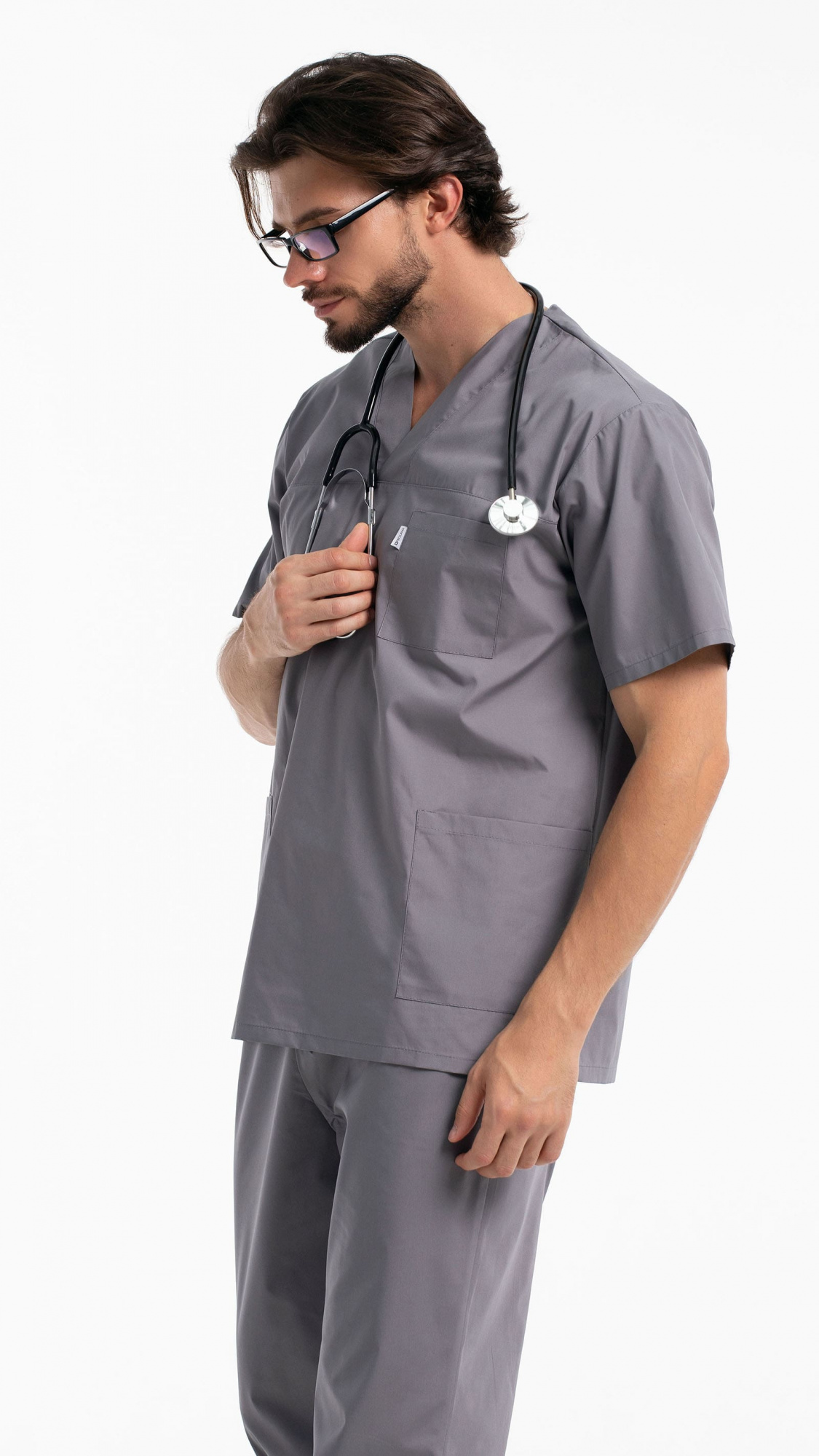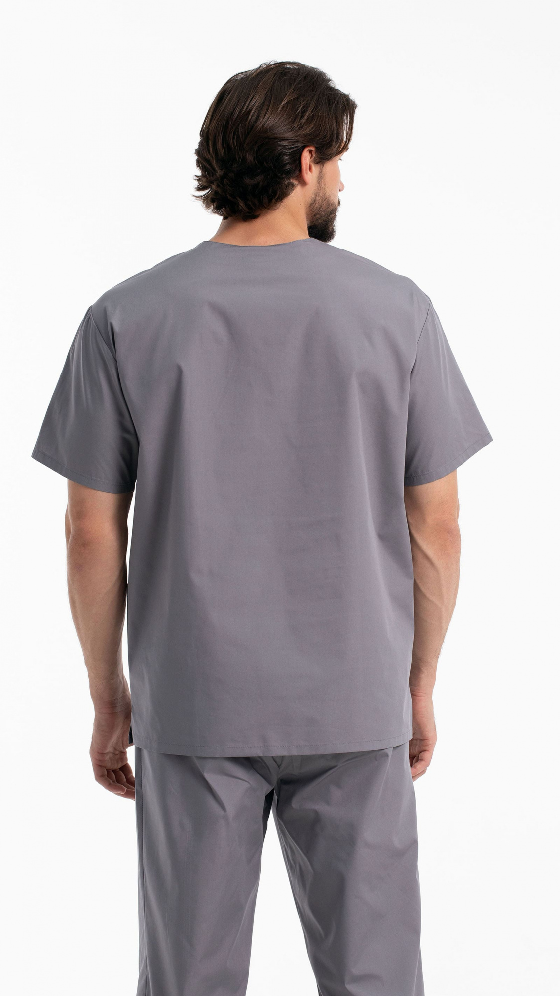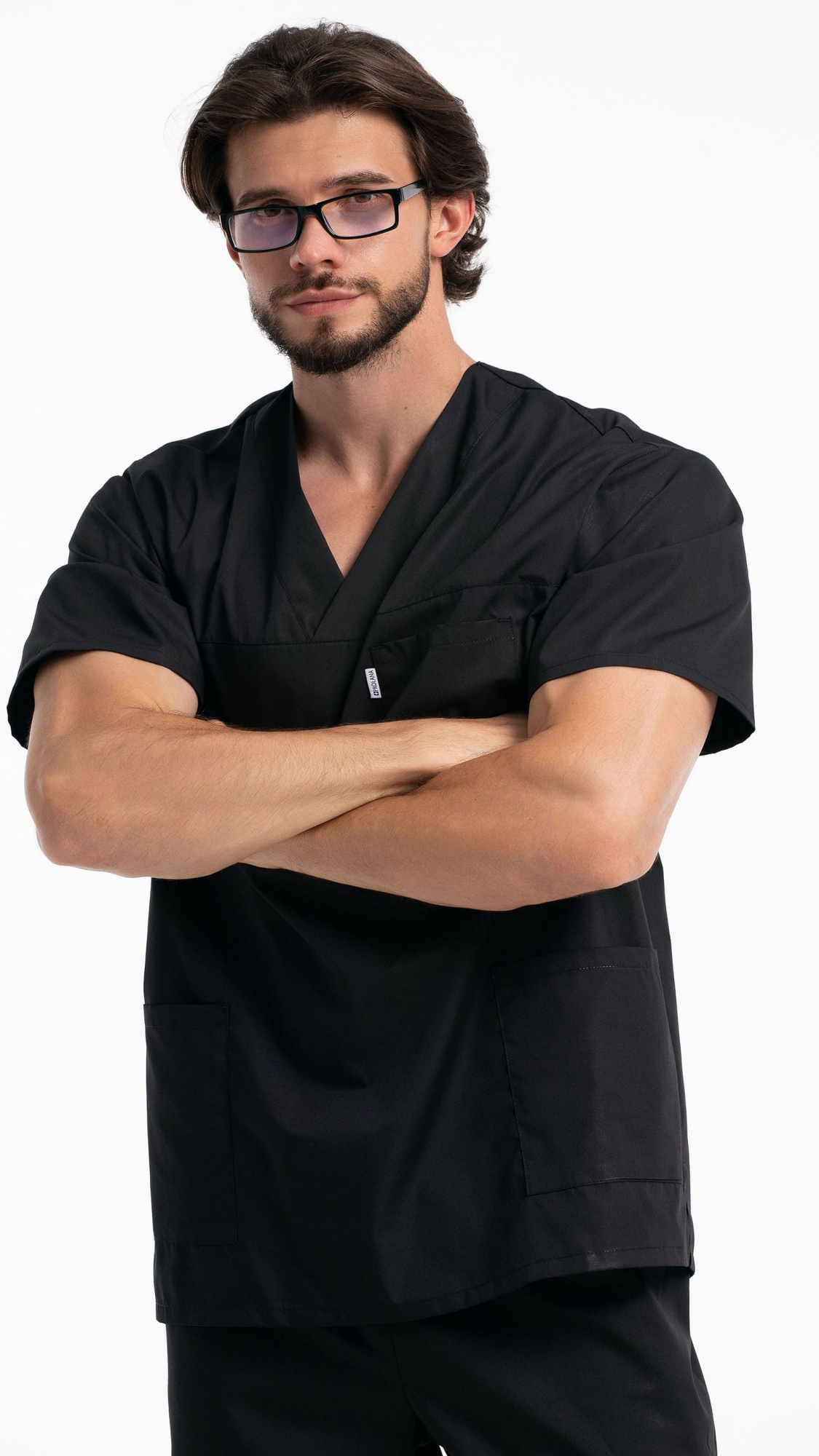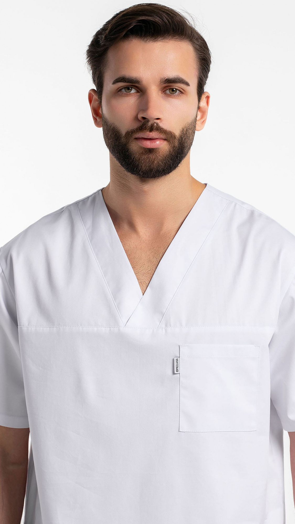Костюм хирургический мужской состоит из блузы и брюк.Блюза прямого силуэта с V -образным вырезом горловины, с боковыми разрезами.