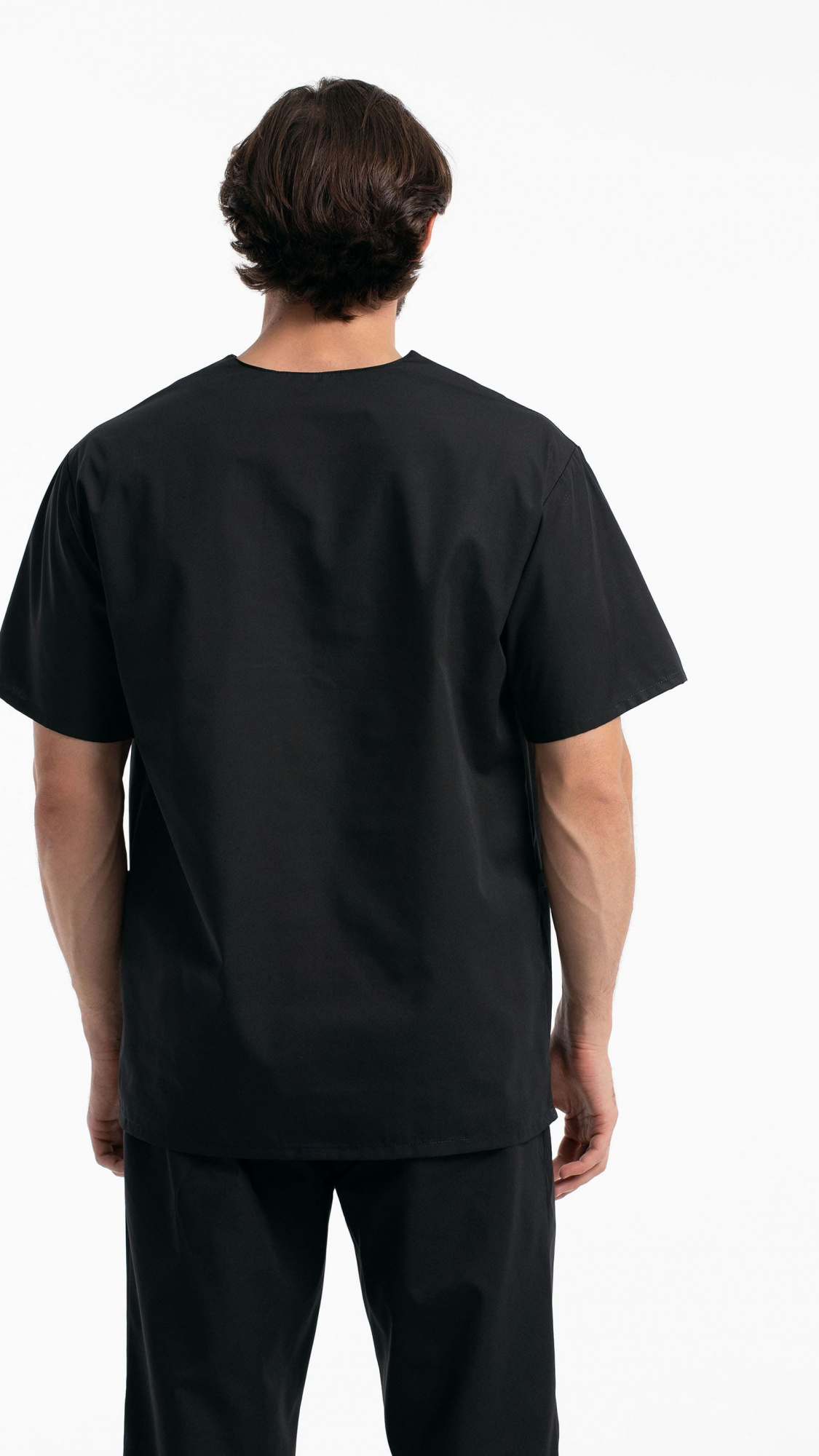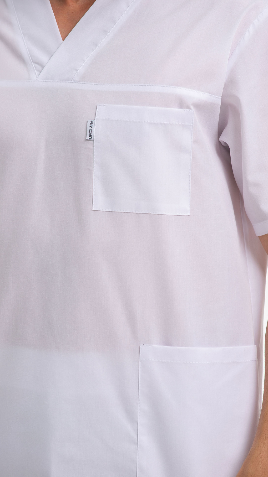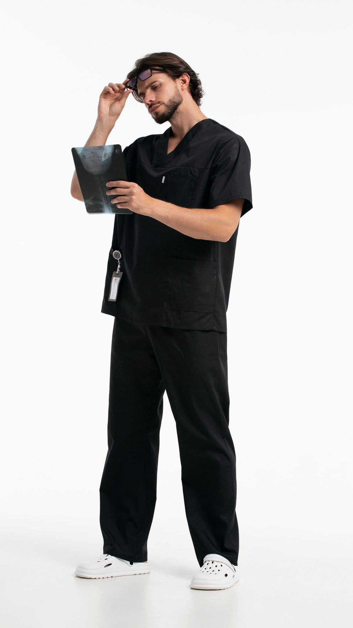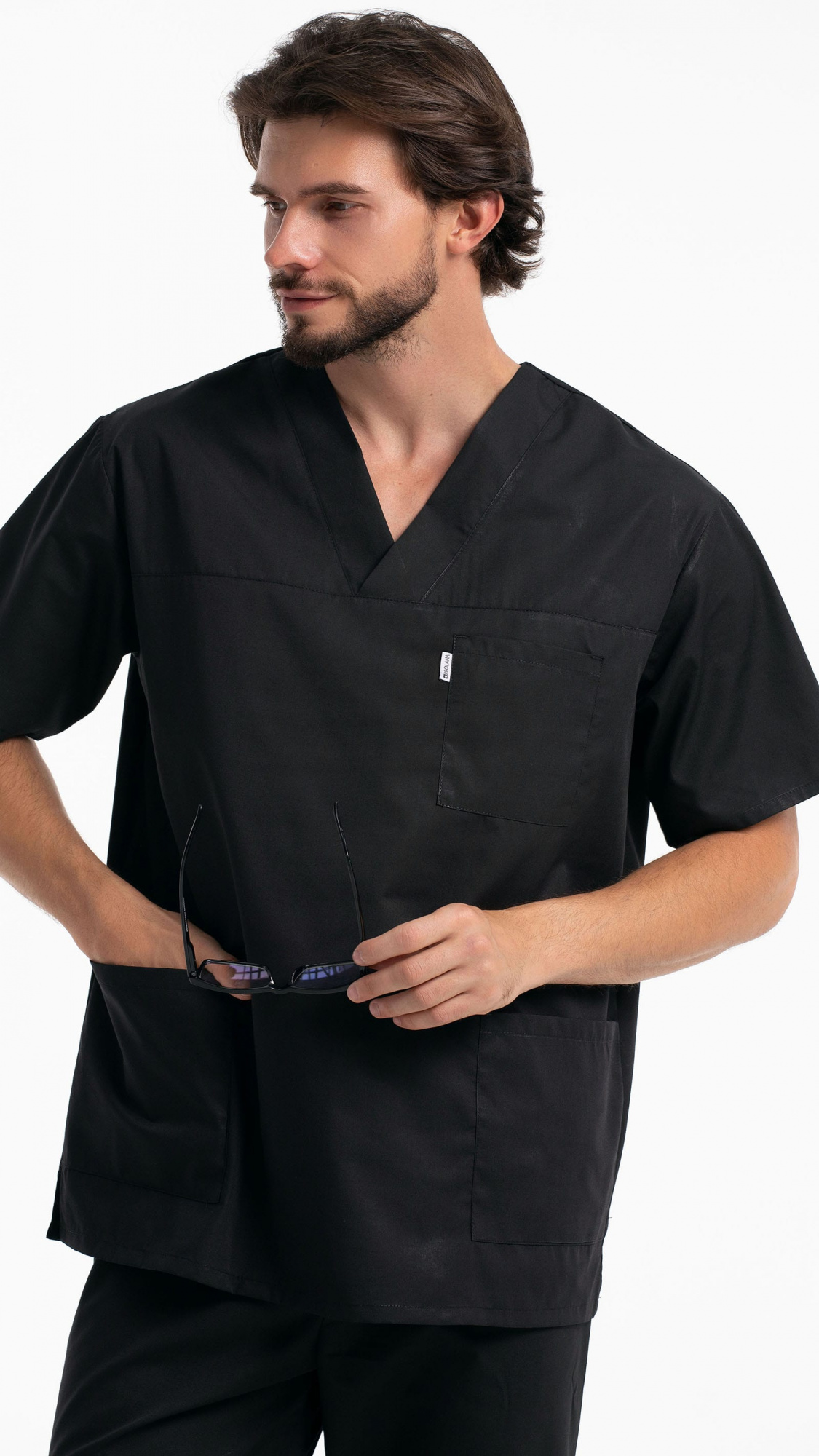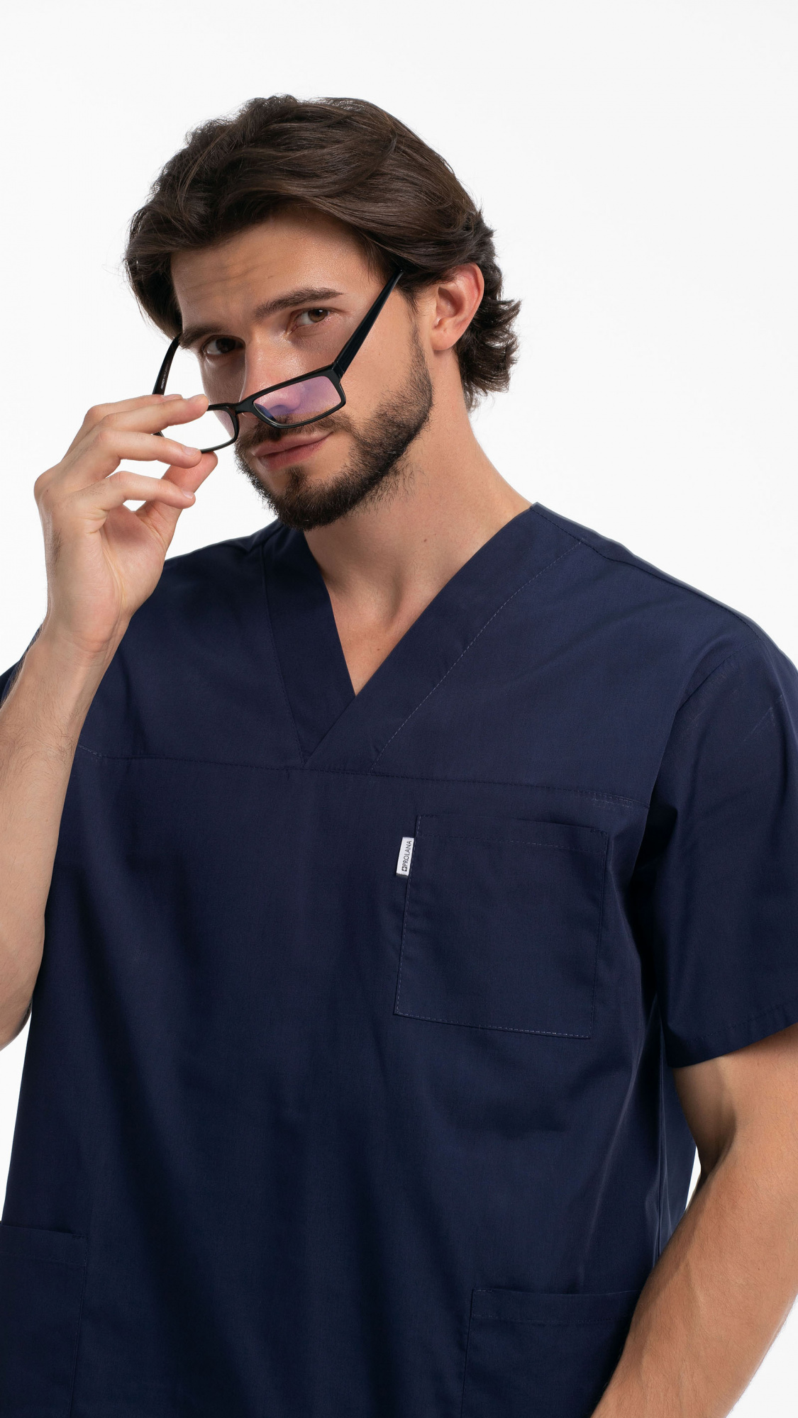 Костюм хирургический мужской состоит из блузы и брюк.Блюза прямого силуэта с V -образным вырезом горловины, с боковыми разрезами.