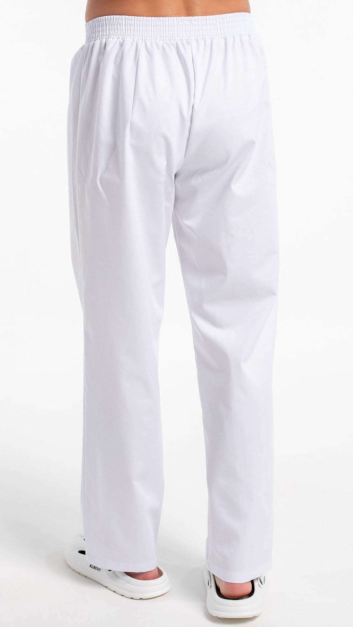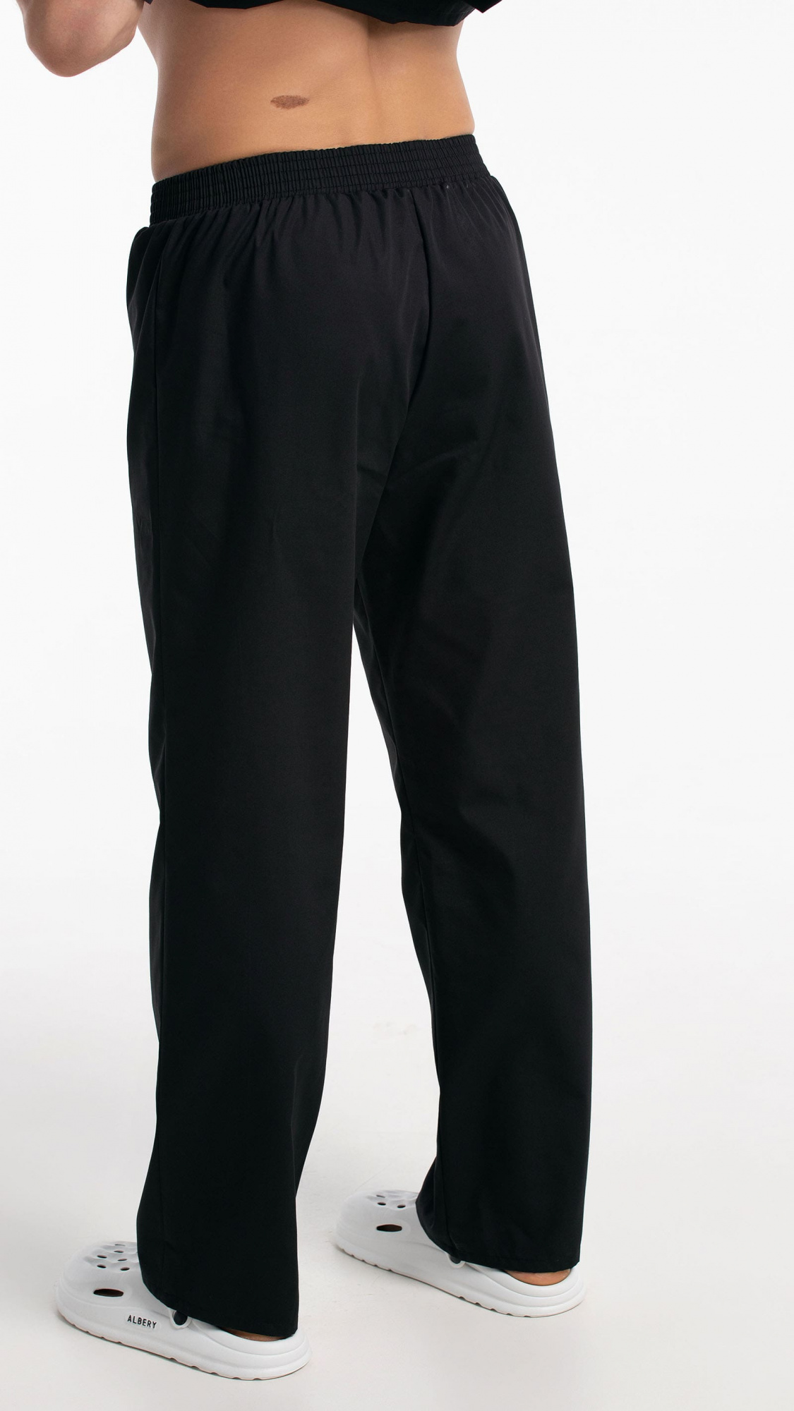 Брюки прямого силуэта, по линии талии стянуты эластичной тесьмой.