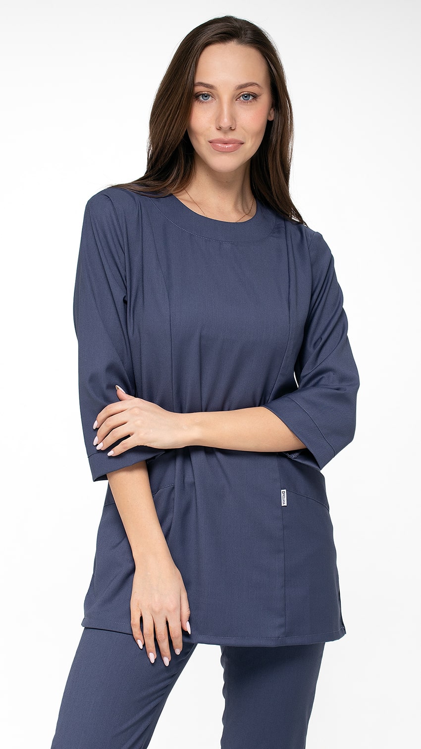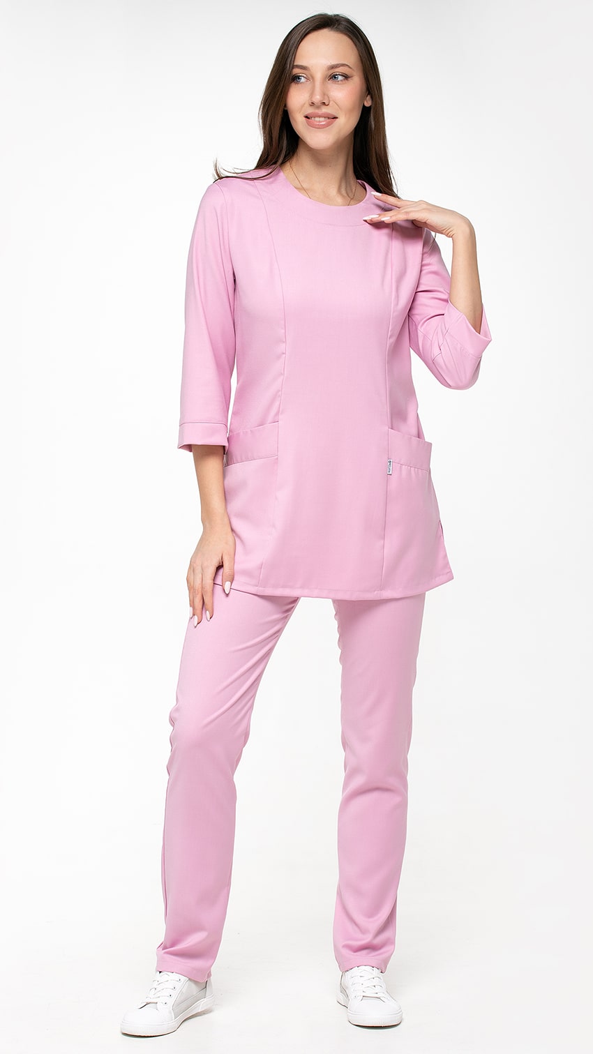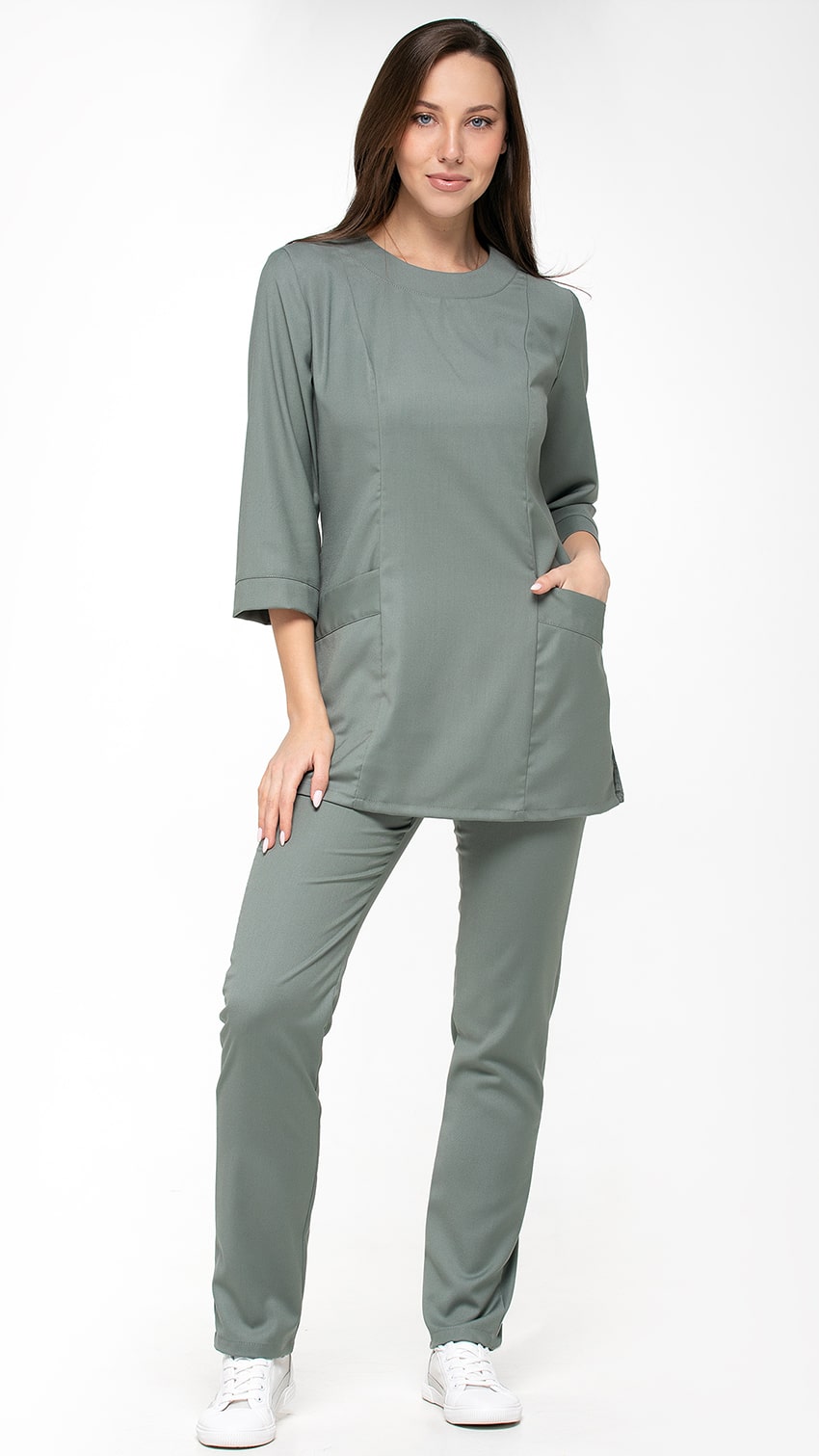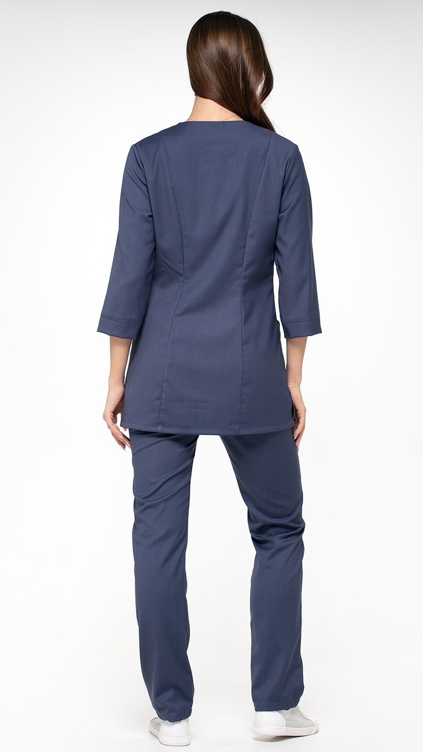 Костюм медицинский женский стрейч состоит из удлиненной блузы и медицинских брюк. Блуза полуприлегающего силуэта, с круглым вырезом горловины, с боковыми разрезами, с внутренними боковыми карманами, входящими в рельефные и боковые швы. Рукава длинной 3/4 ок 45 см. Брюки с притачным поясом, стянутым эластичной тесьмой и боковыми карманами с отрезными бочками с закругленным входом. Костюм медицинский изготовлен из смесовой ткани с составом 65% вискоза, 32% полиэфир, спандекс 3%. Данная ткань очень мягкая, струящаяся и комфортная в носке. За счёт большого содержания вискозы не электризуется и не вызывает раздражения кожи. Наша модель хирургического костюма подходит для следующих категорий использования: врачи, медсестры, ветеринары, студенты, лаборанты и другие профессии. В линейке представлены размеры с 42 по 52. Наши преимущества: высокое качество, собственное производство, оптимальные цены, современный крой.Характеристики