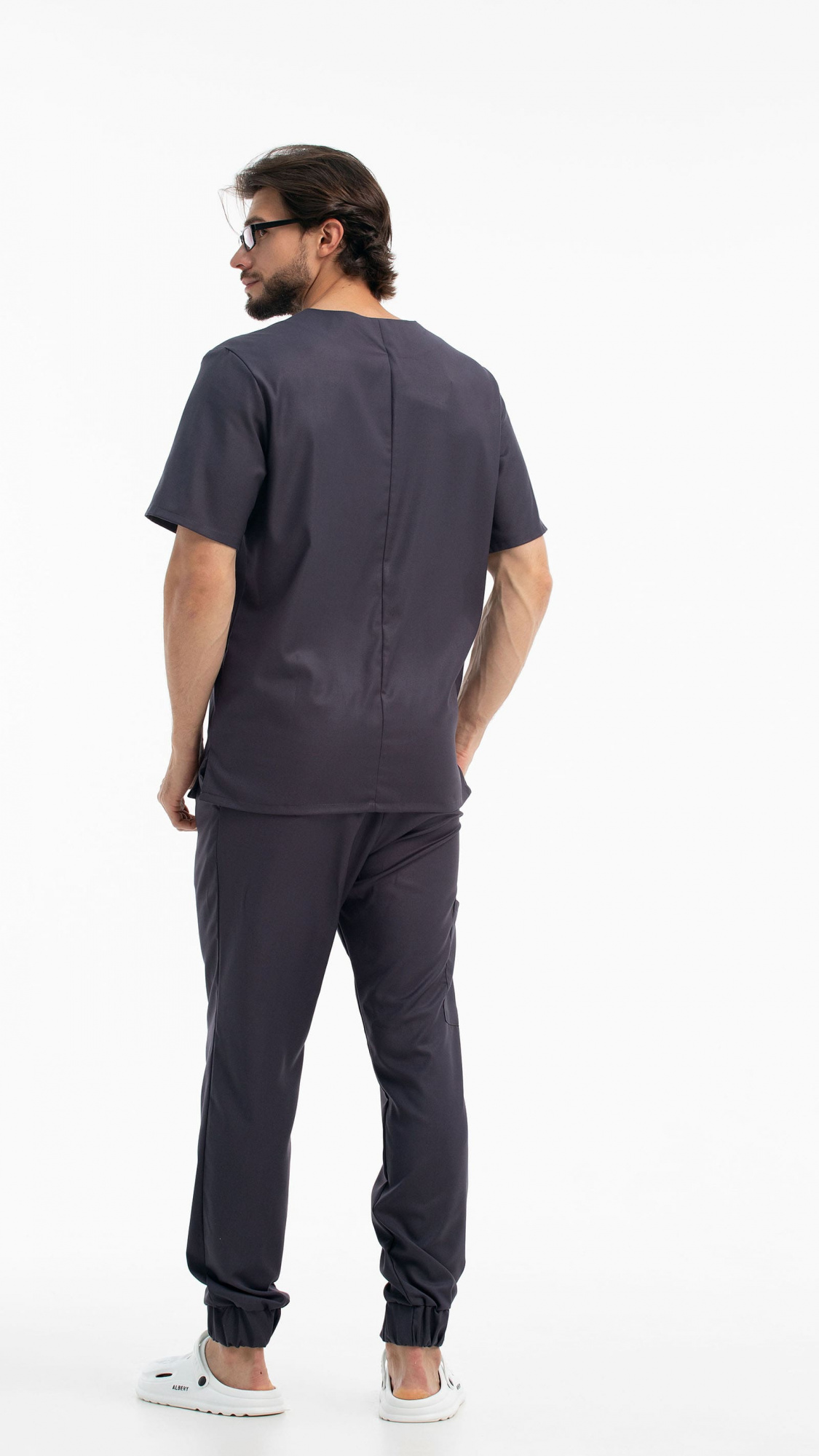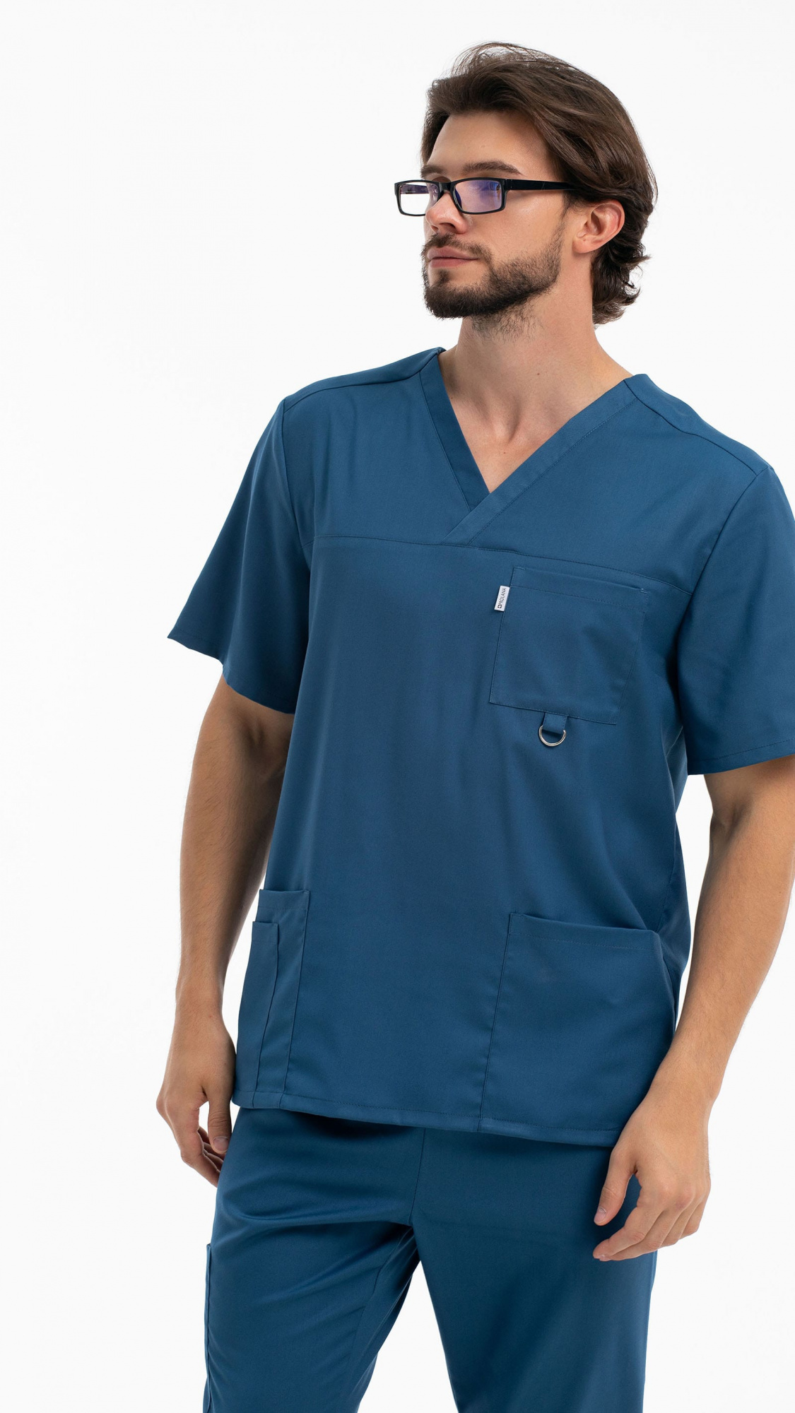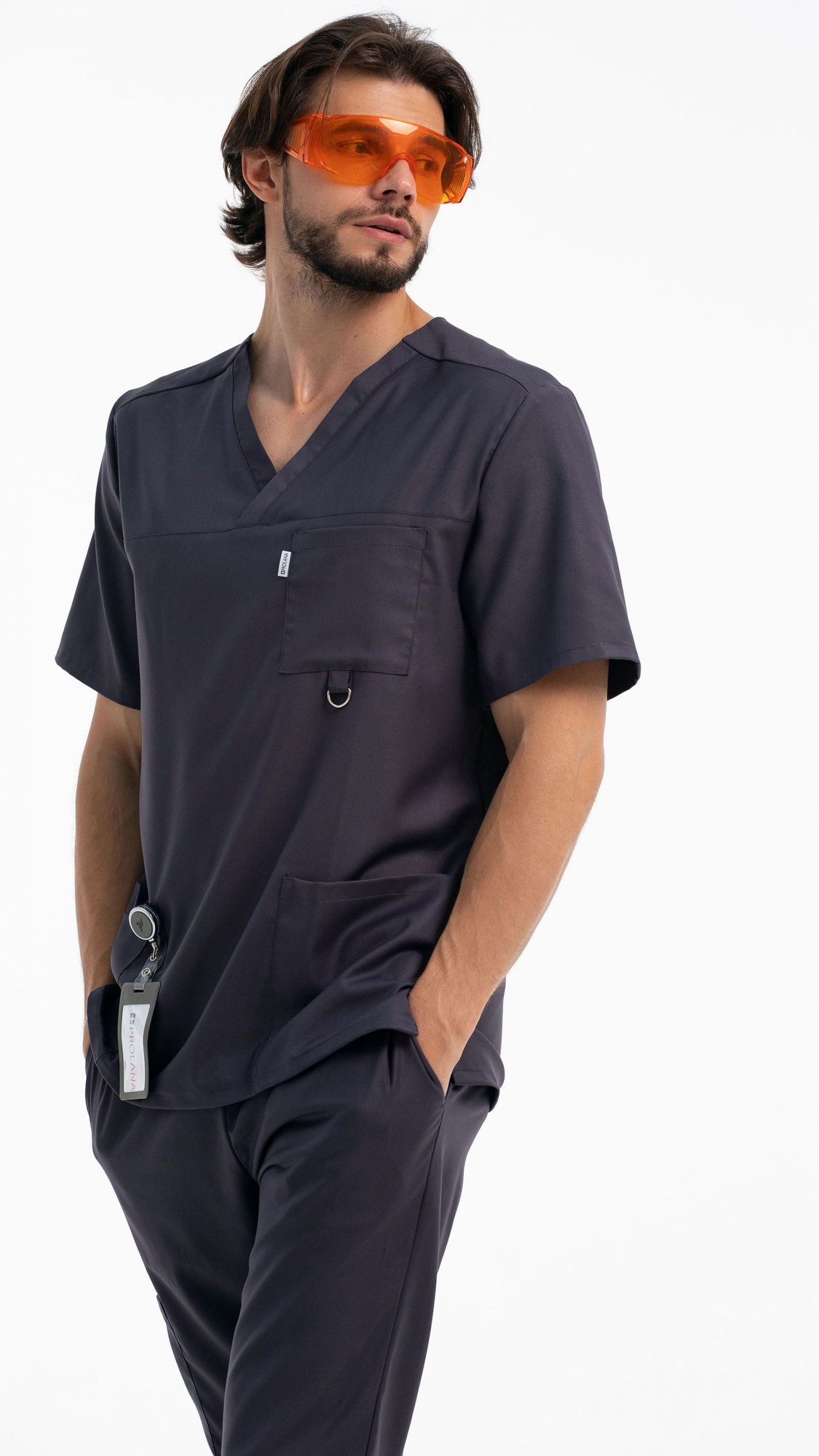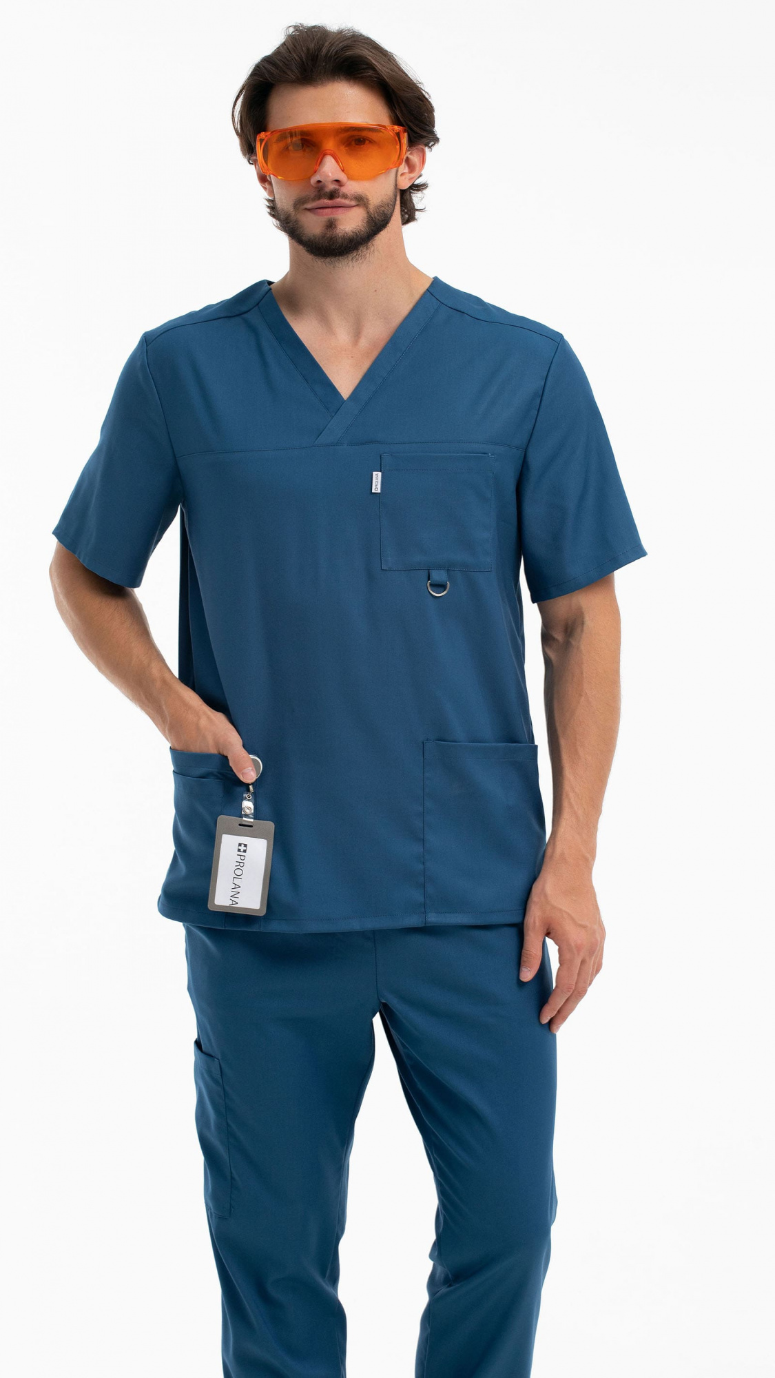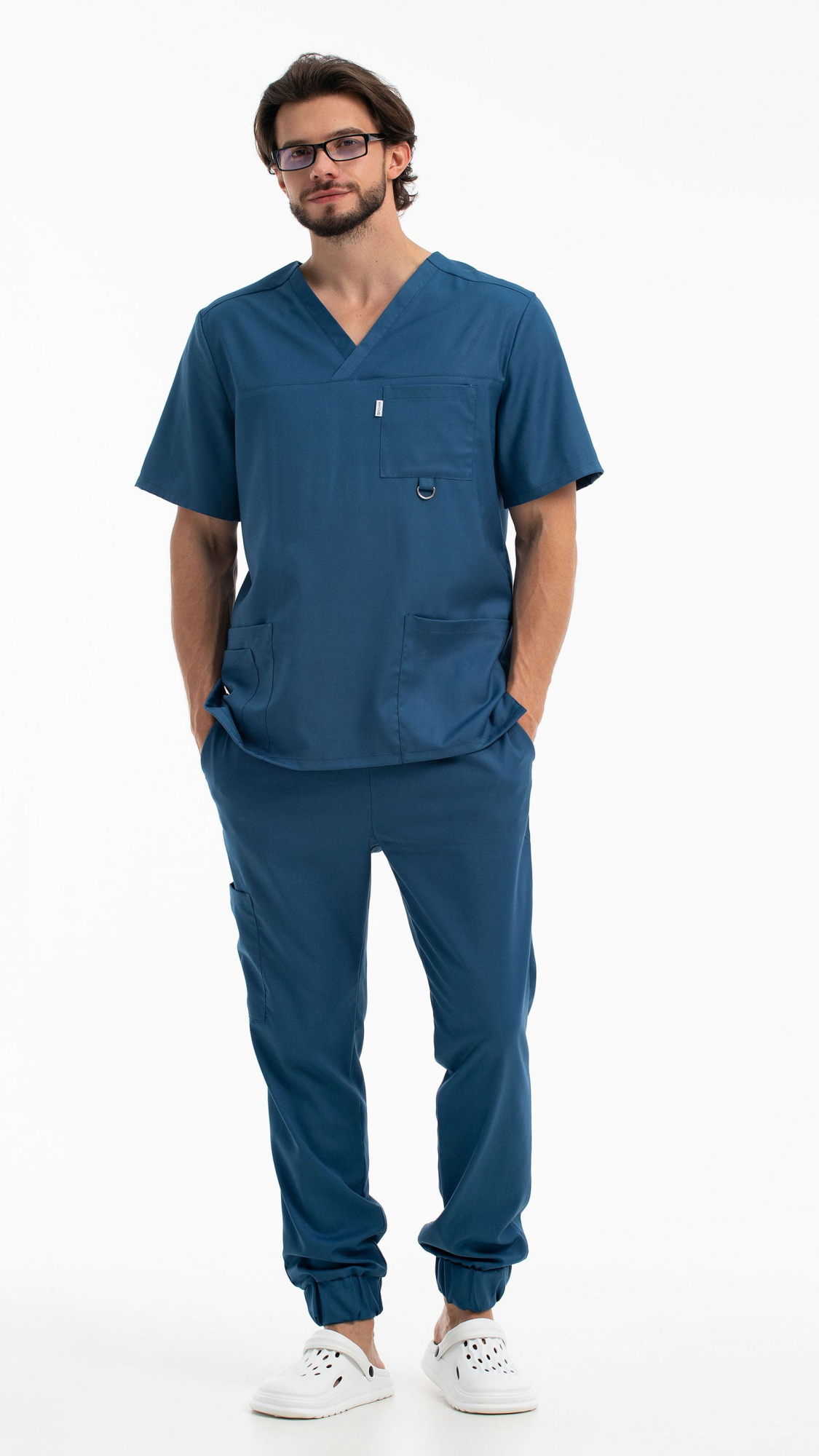 Костюм мужской хирургический состоит из куртки и брюк.Куртка прямого силуэта с V-образным вырезом горловины, с разрезами в боковых швах.