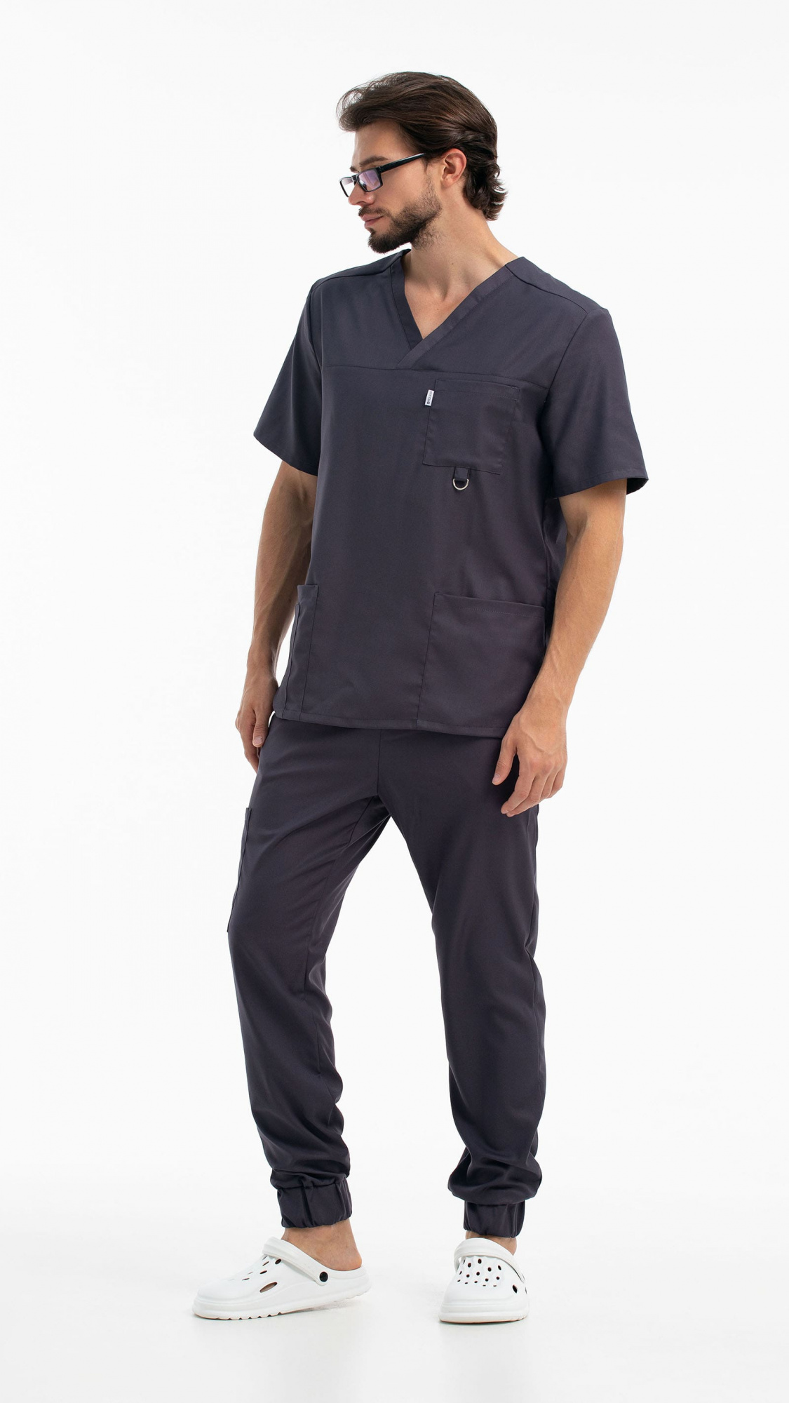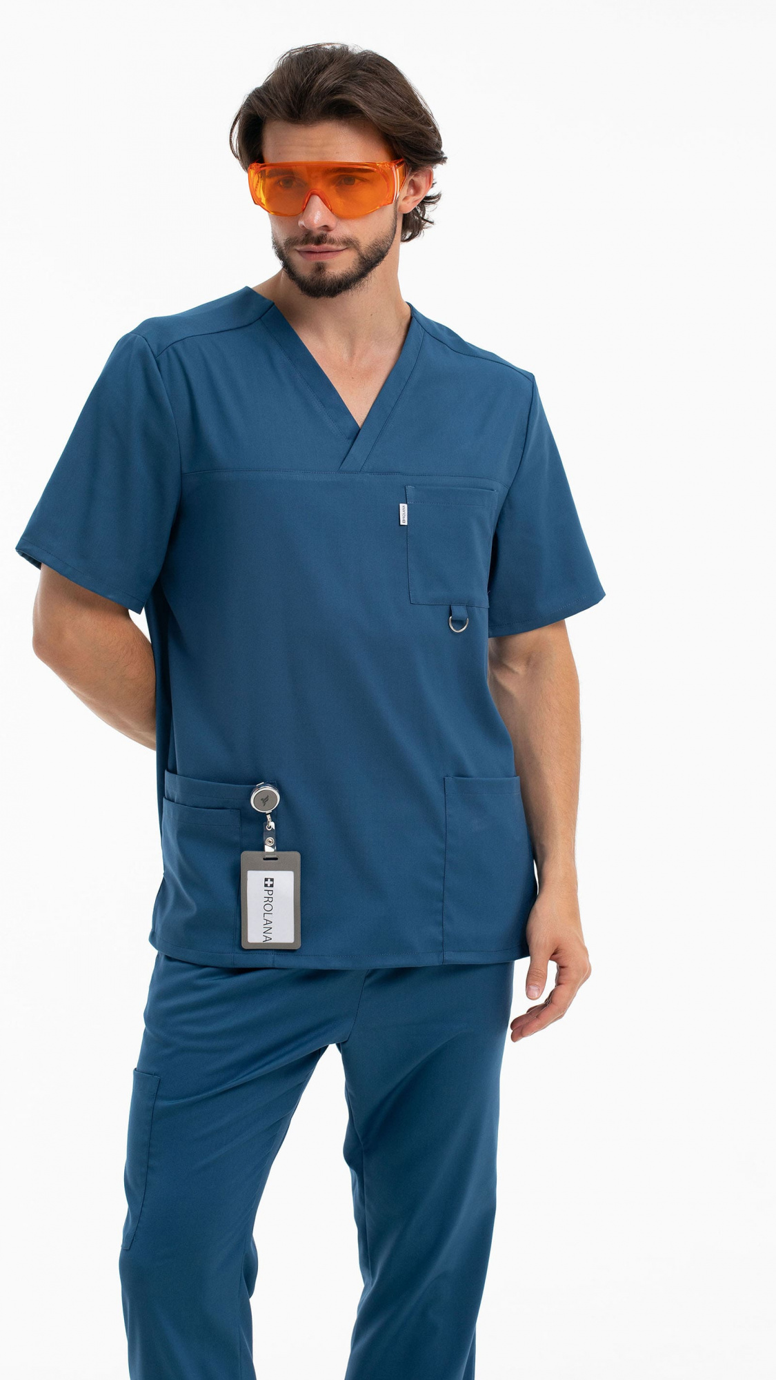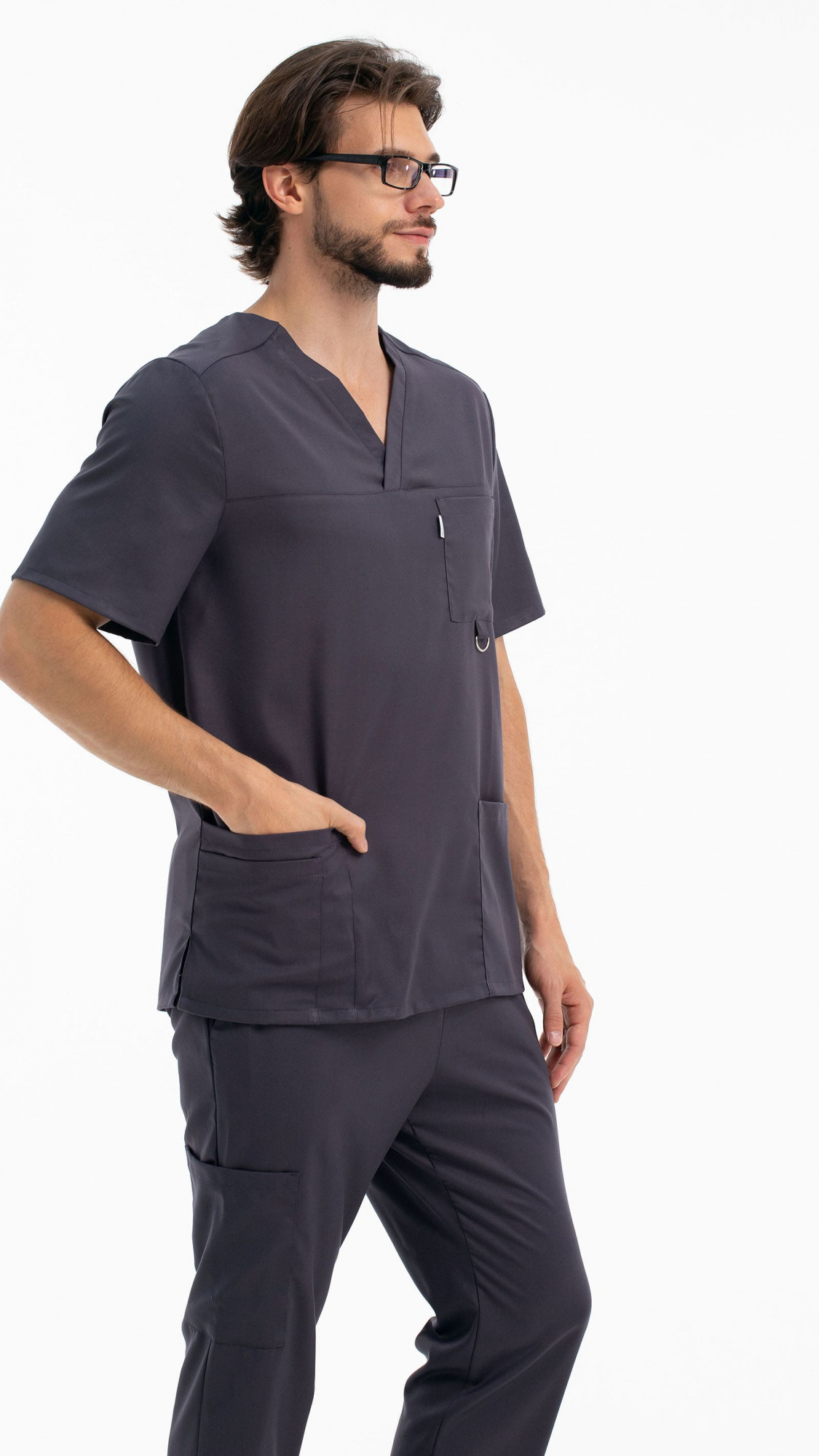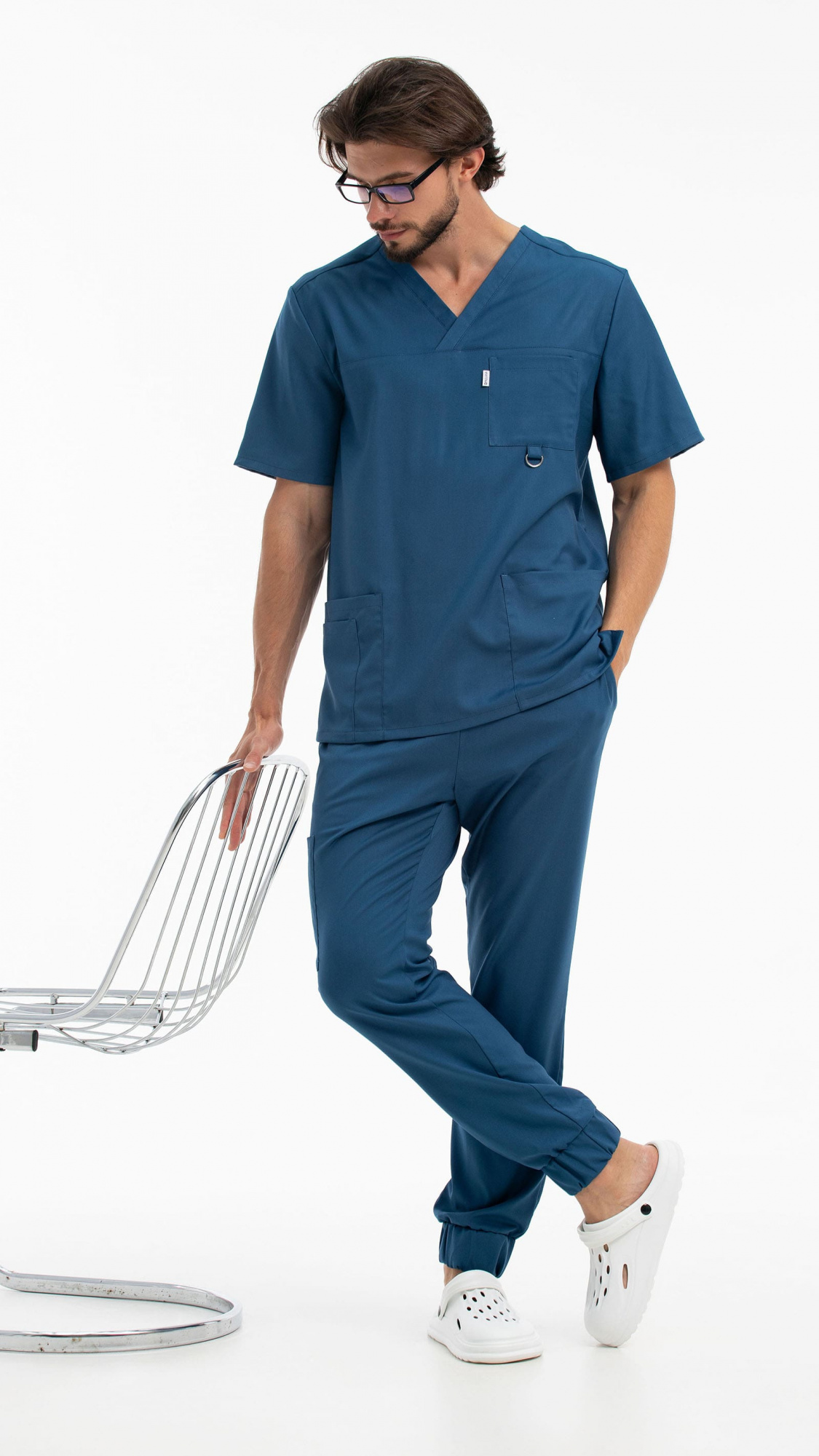 Костюм мужской хирургический состоит из куртки и брюк.Куртка прямого силуэта с V-образным вырезом горловины, с разрезами в боковых швах.