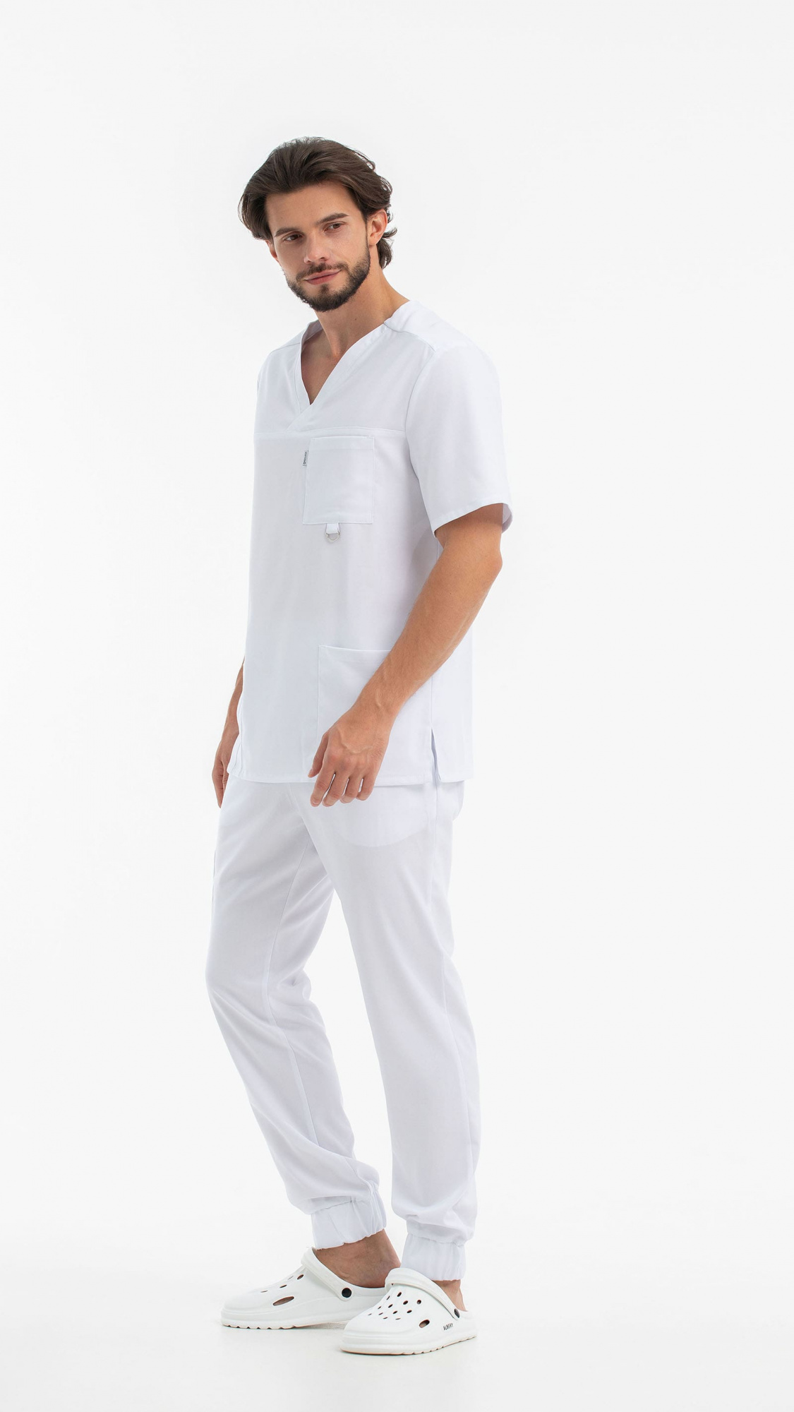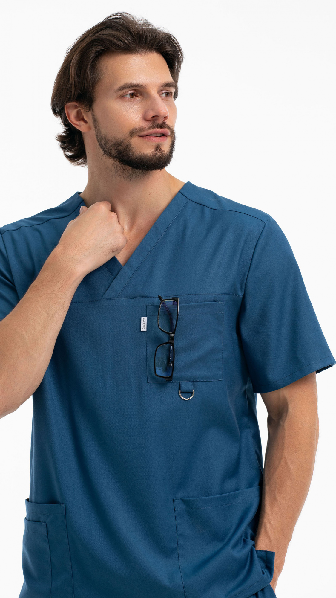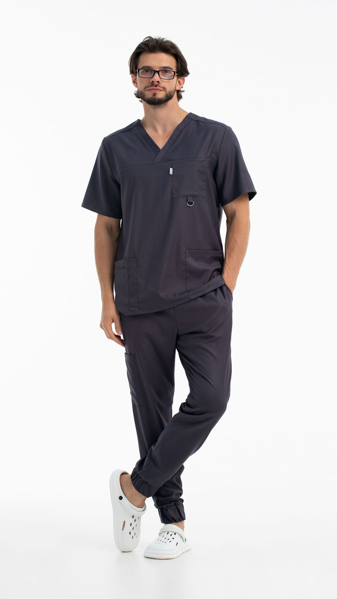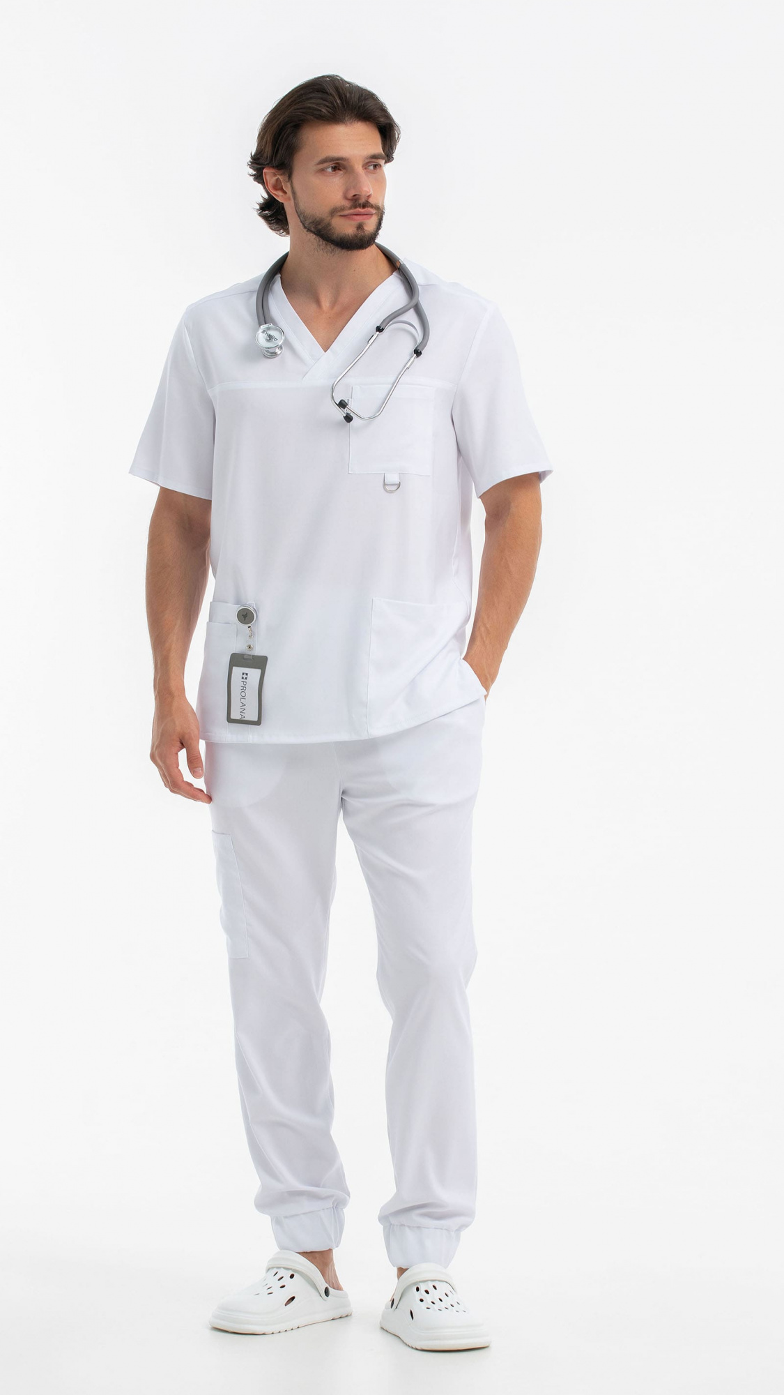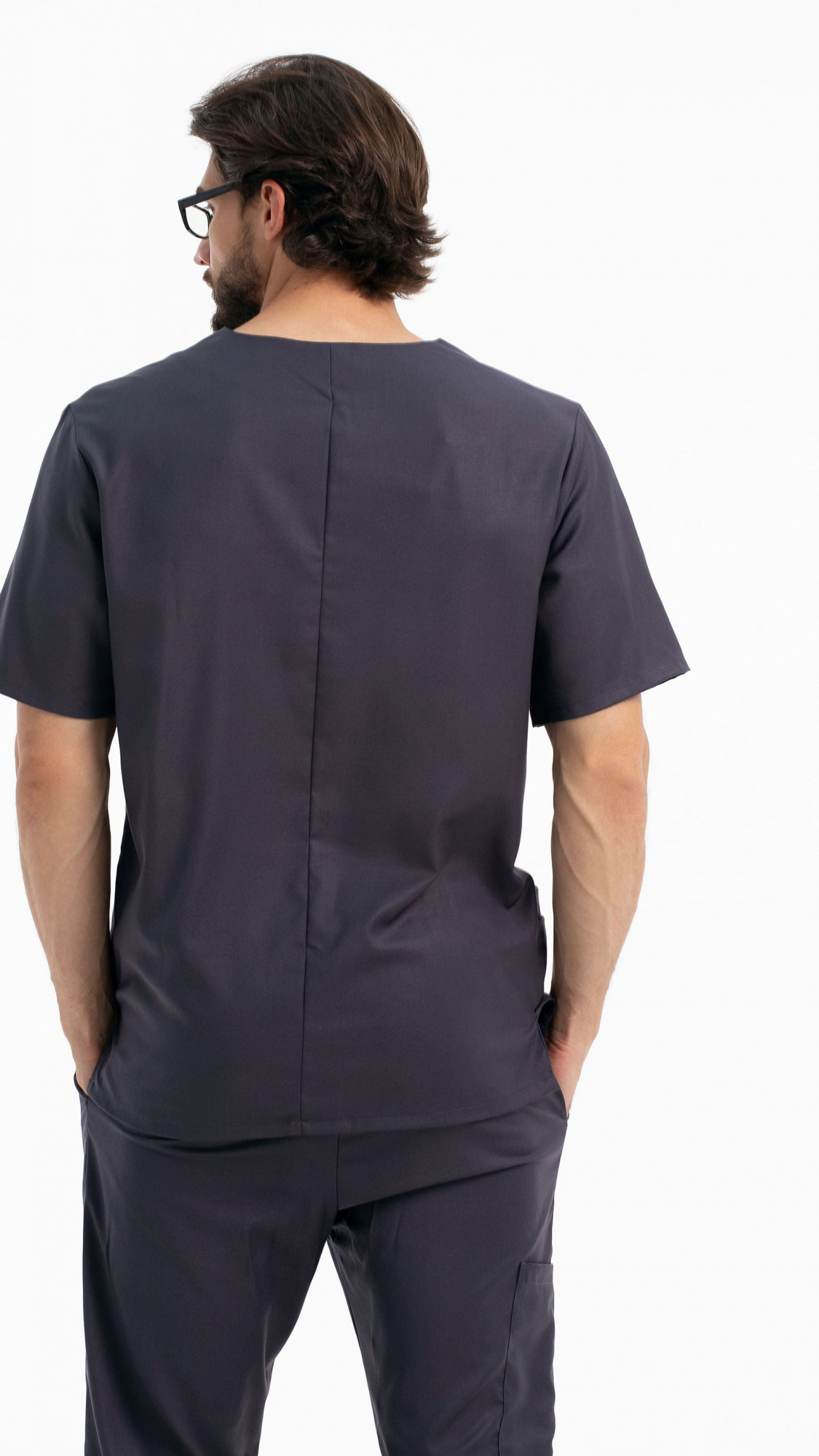 Костюм мужской хирургический состоит из куртки и брюк.Куртка прямого силуэта с V-образным вырезом горловины, с разрезами в боковых швах.