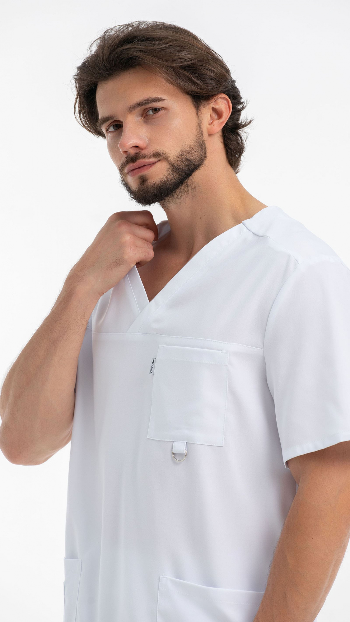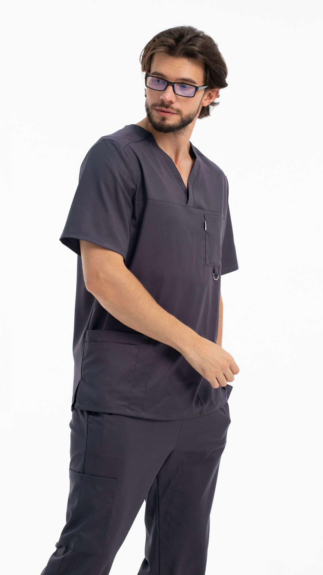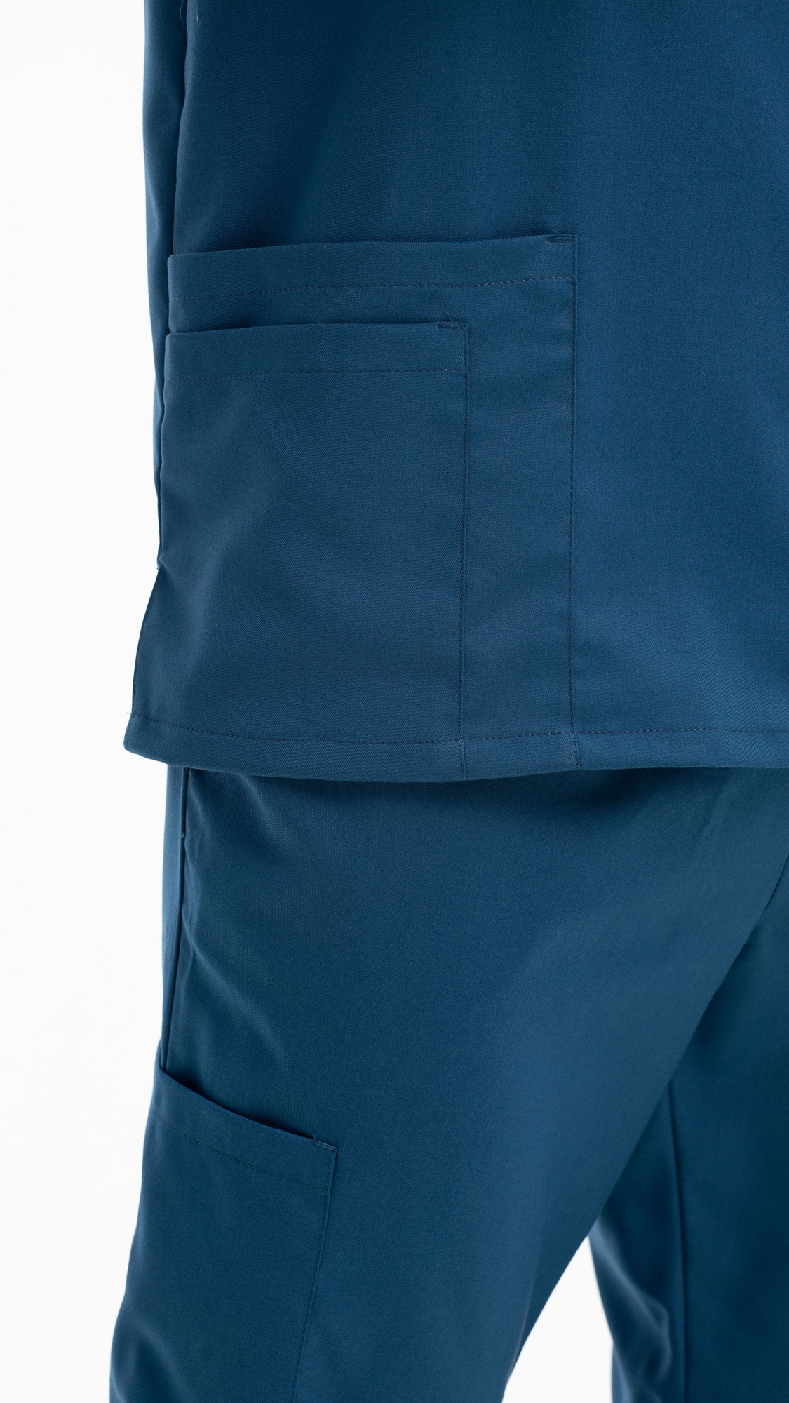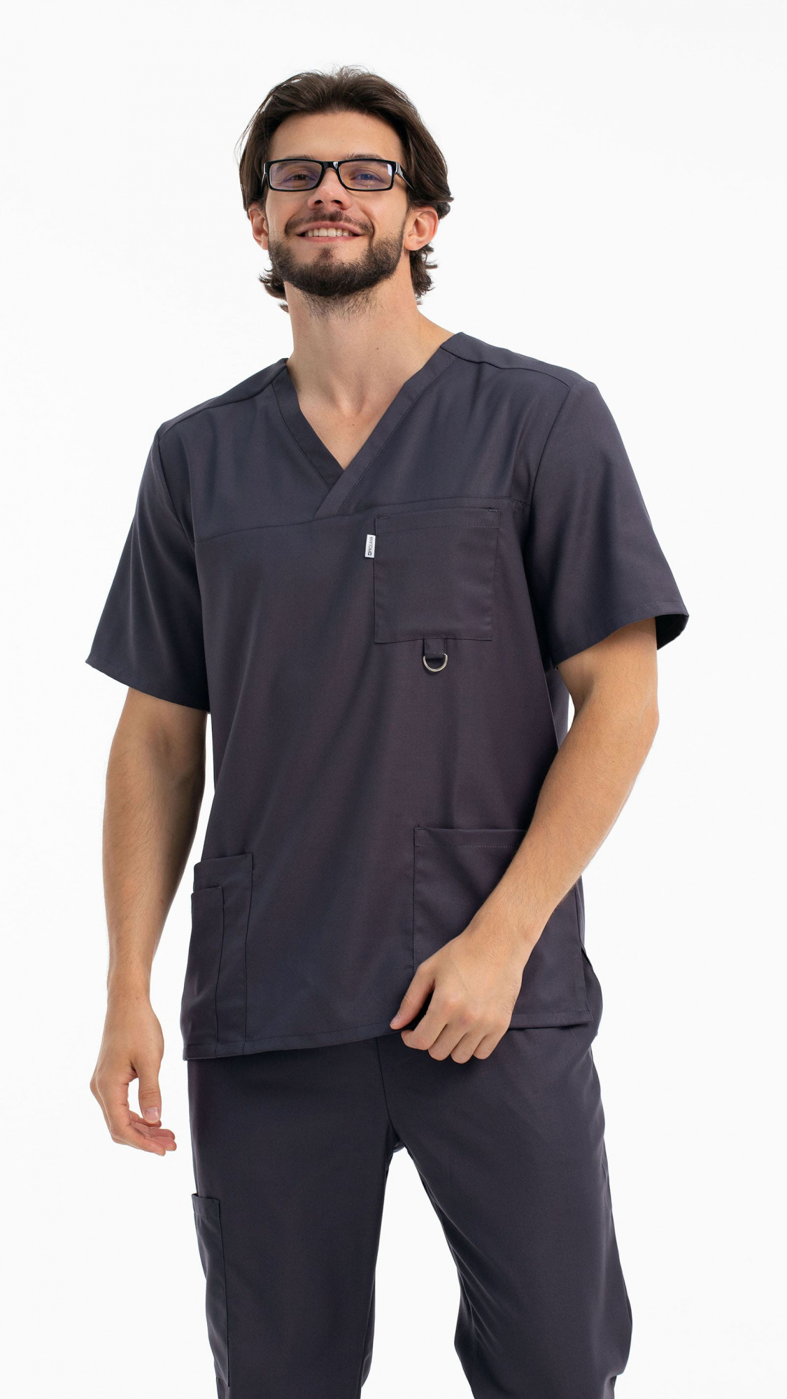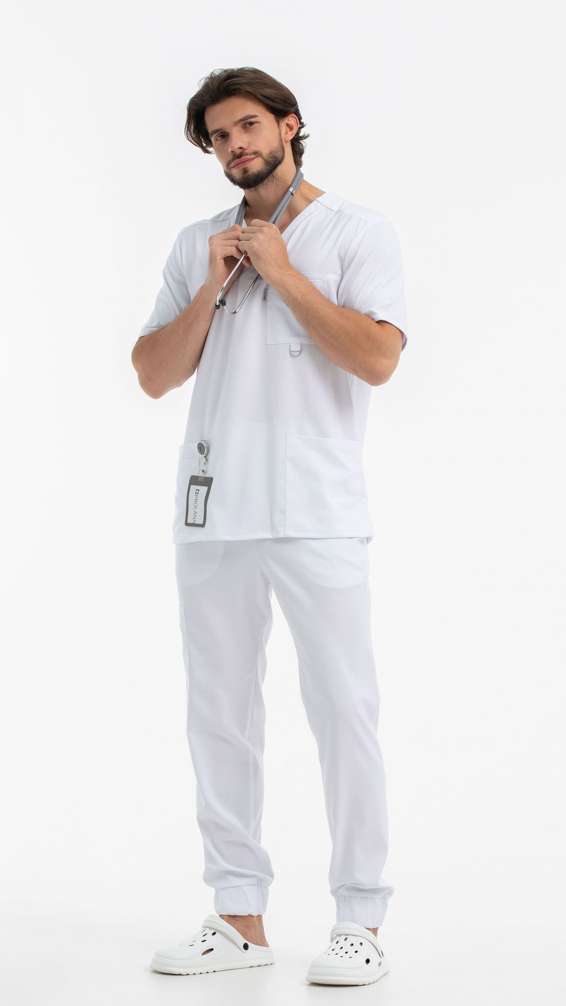 Костюм мужской хирургический состоит из куртки и брюк.Куртка прямого силуэта с V-образным вырезом горловины, с разрезами в боковых швах.