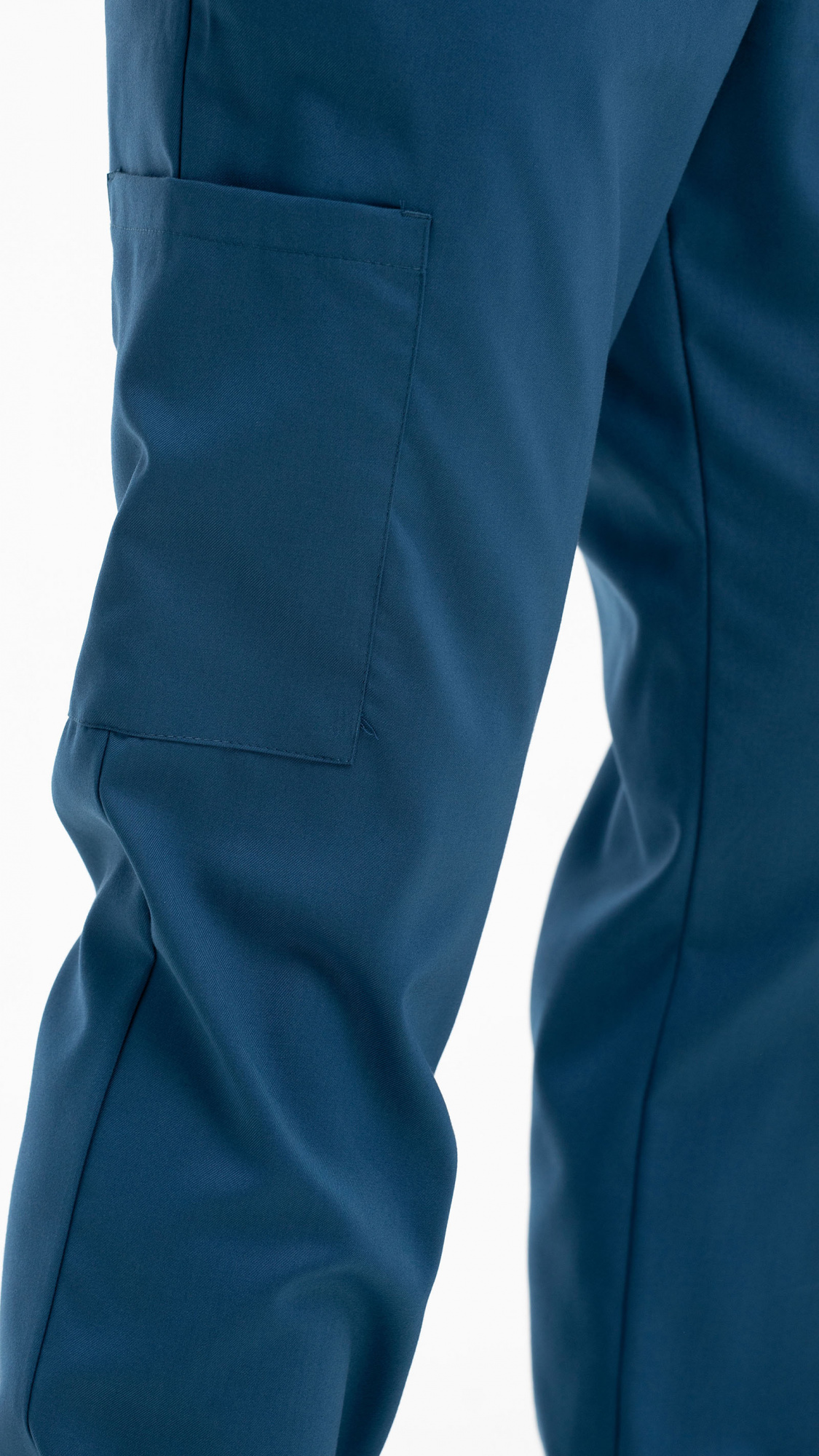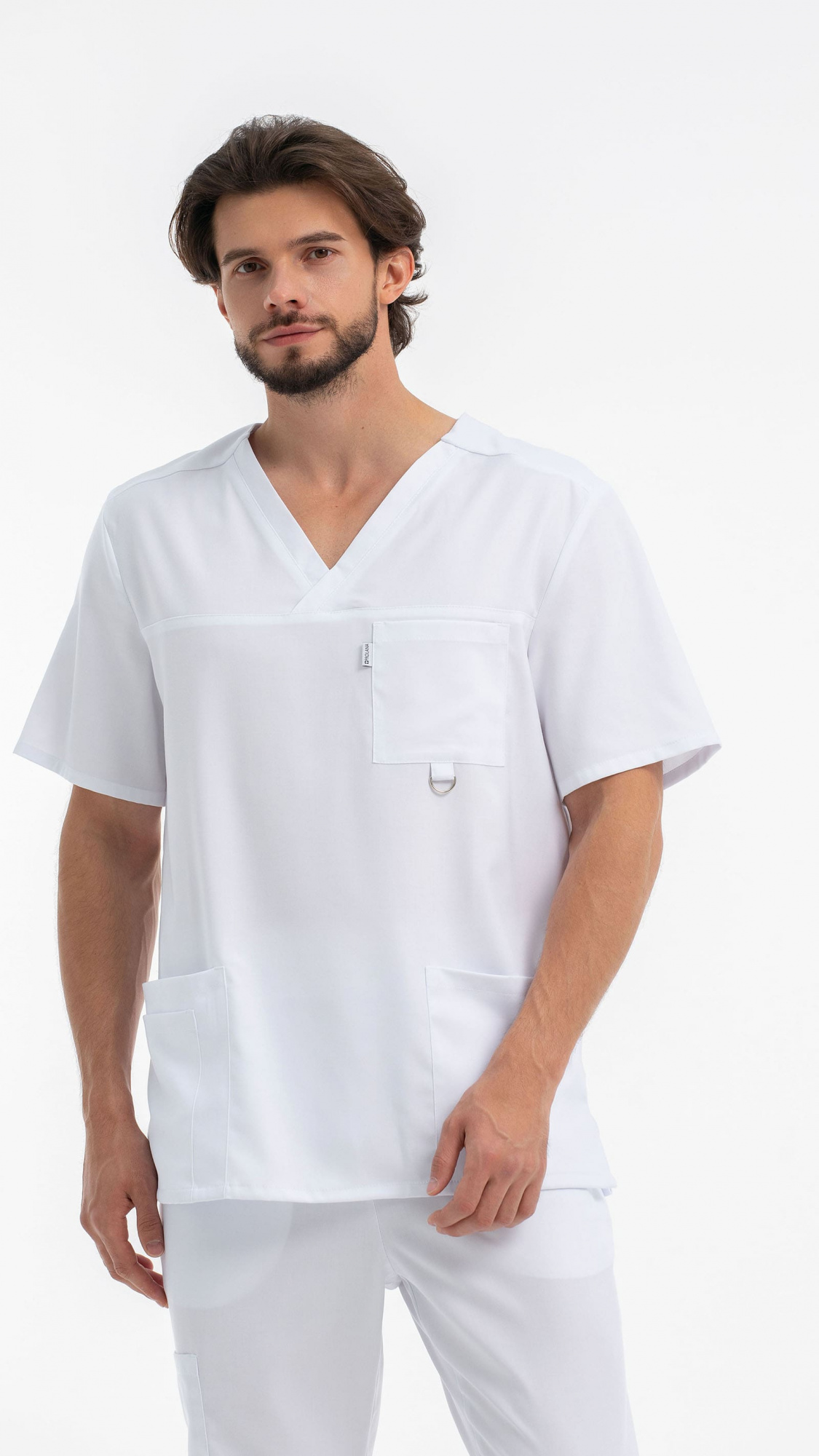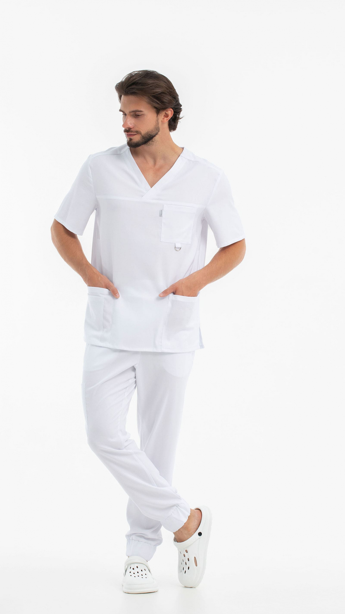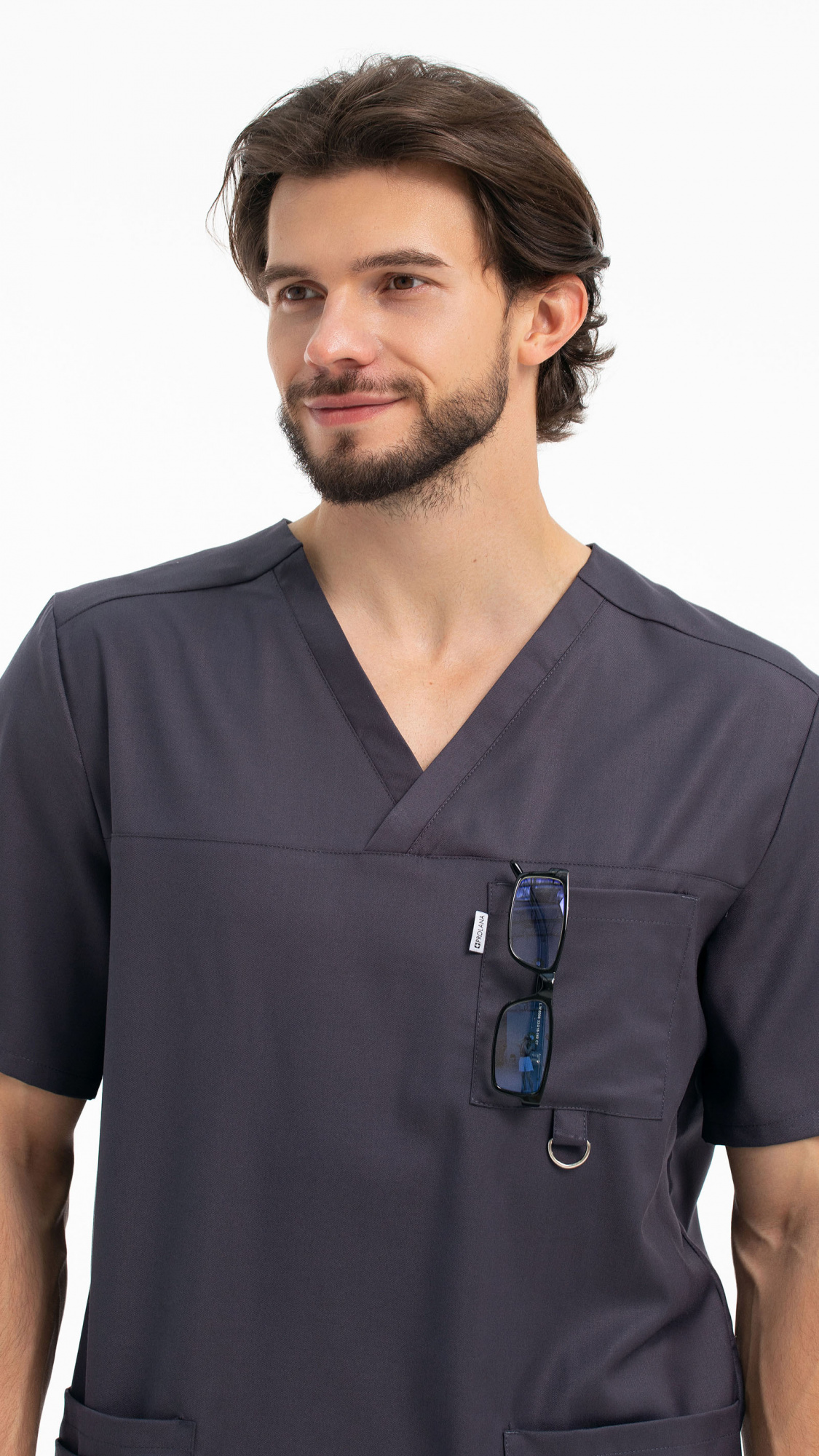 Костюм мужской хирургический состоит из куртки и брюк.Куртка прямого силуэта с V-образным вырезом горловины, с разрезами в боковых швах.