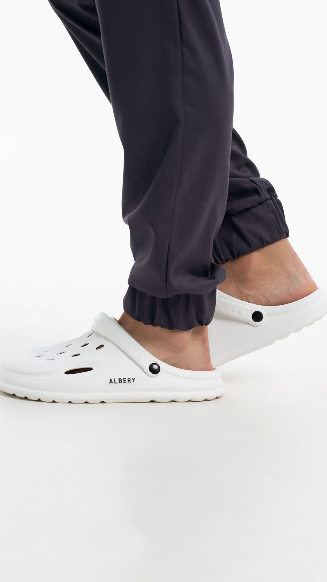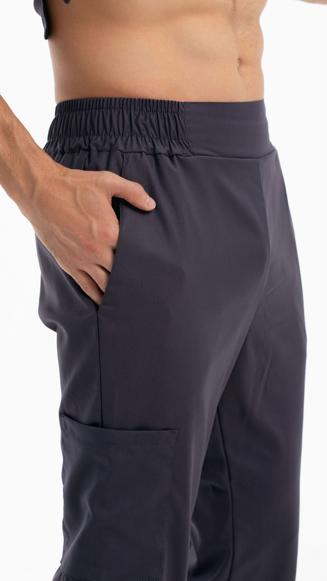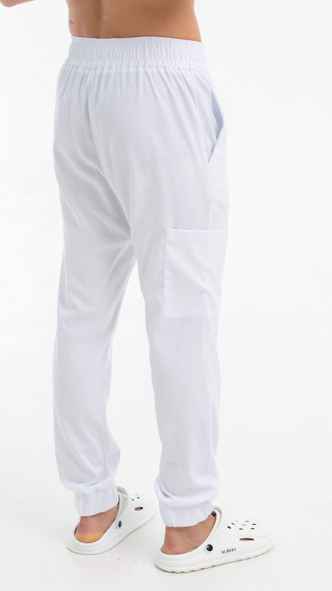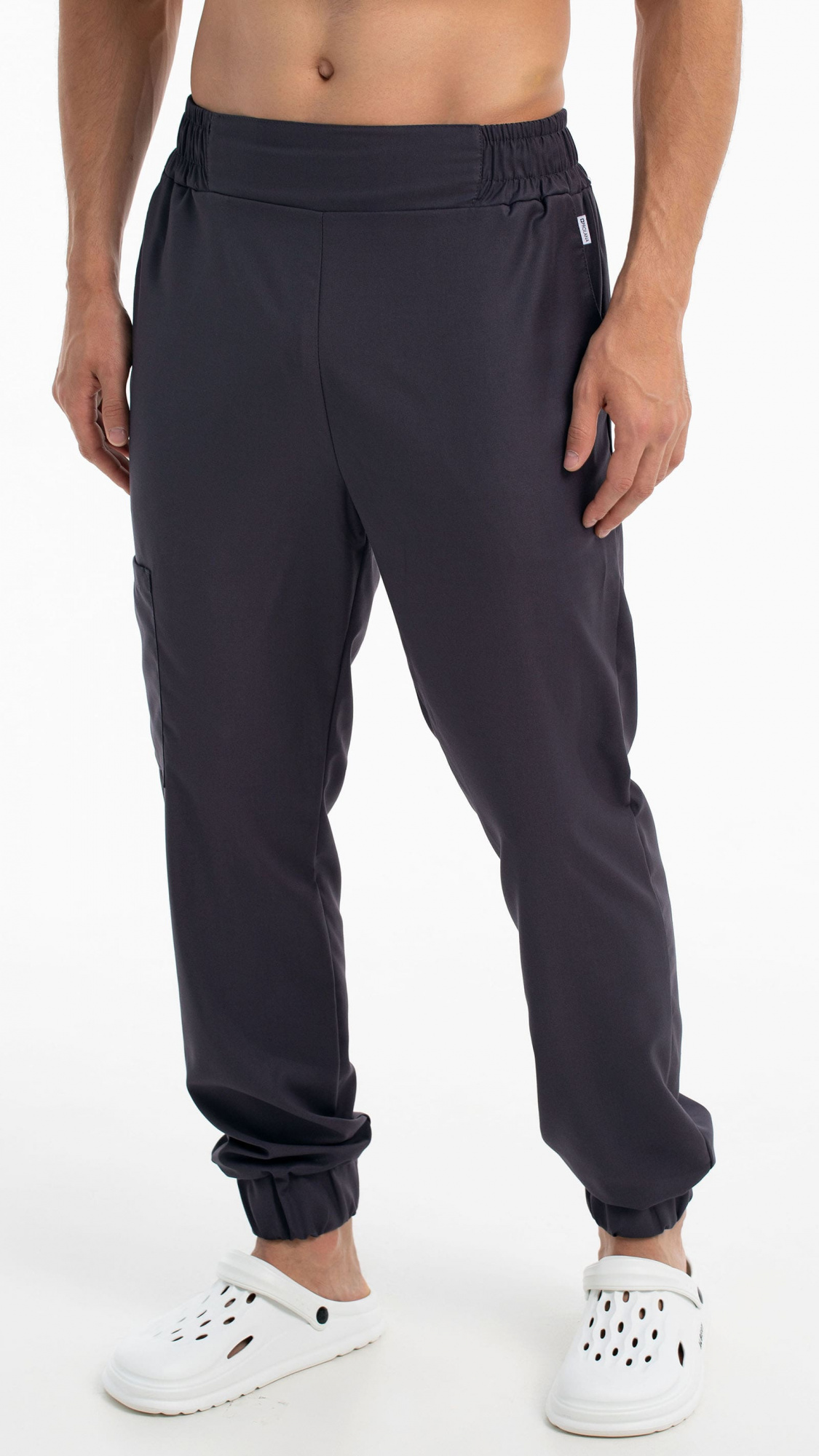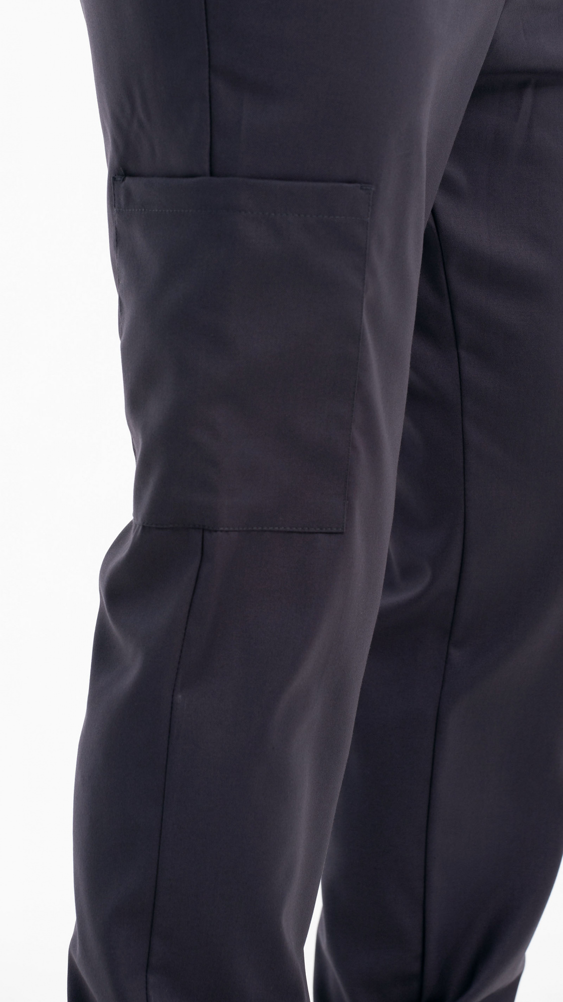 Брюки с притачным поясом, шириной 6 см для комфорта. Пояс брюк состоит из двух частей, Центральная часть пояса передних половинок брюк без эластичной тесьмы. Вторая часть стянута эластичной тесьмой. Передние половинки брюк с боковыми карманами с наклонным входом, с отрезными бочками. На правом боку на уровне бедра накладной карман. Низ брюк обработан притачными манжетами, стянутыми эластичной тесьмой.