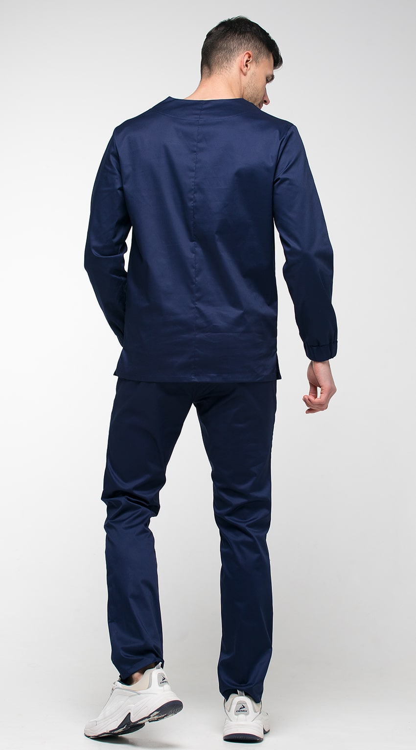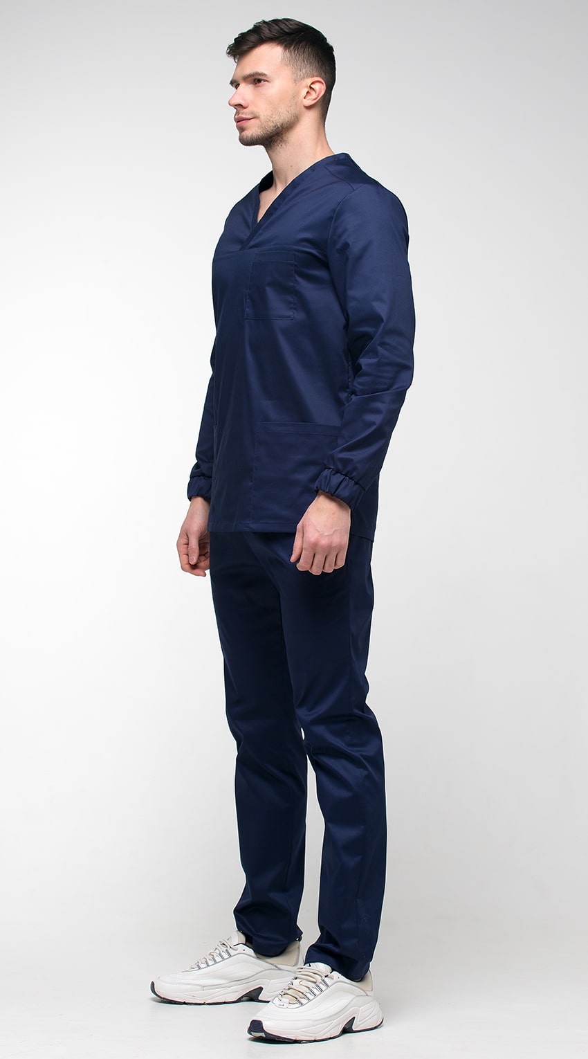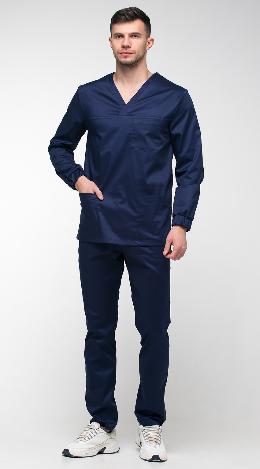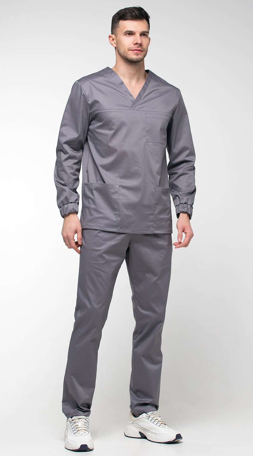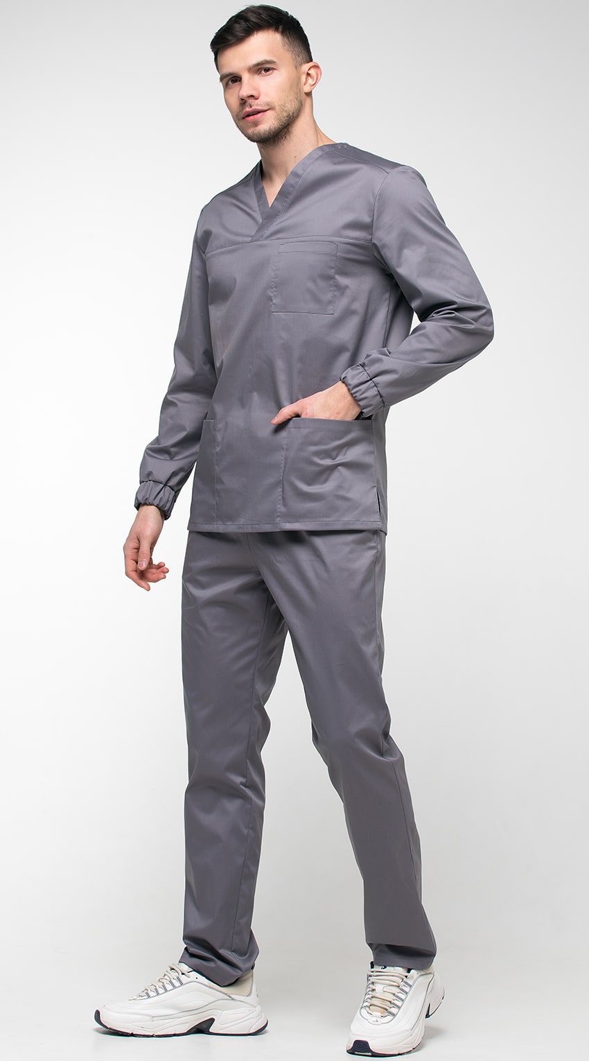 Костюм медицинский мужской состоит из куртки и брюк.Курта прямого силуэта с V-образным вырезом горловины, с разрезами в боковых швах.