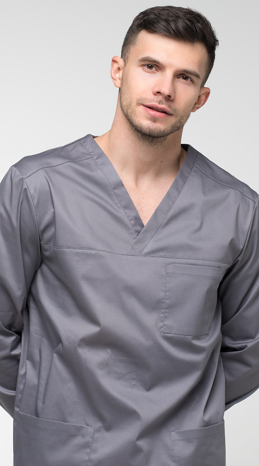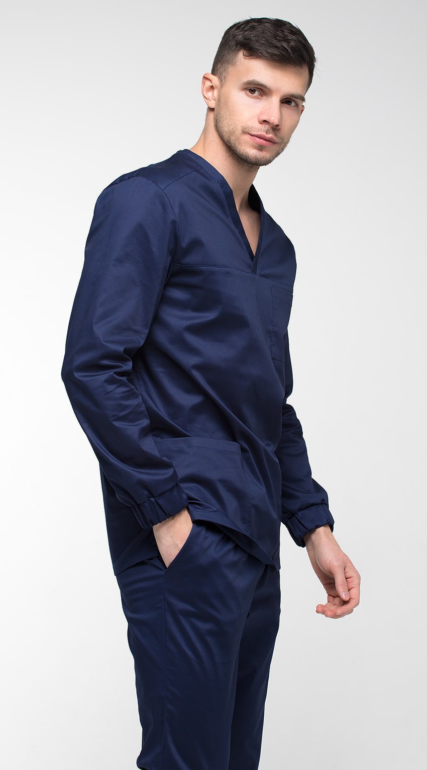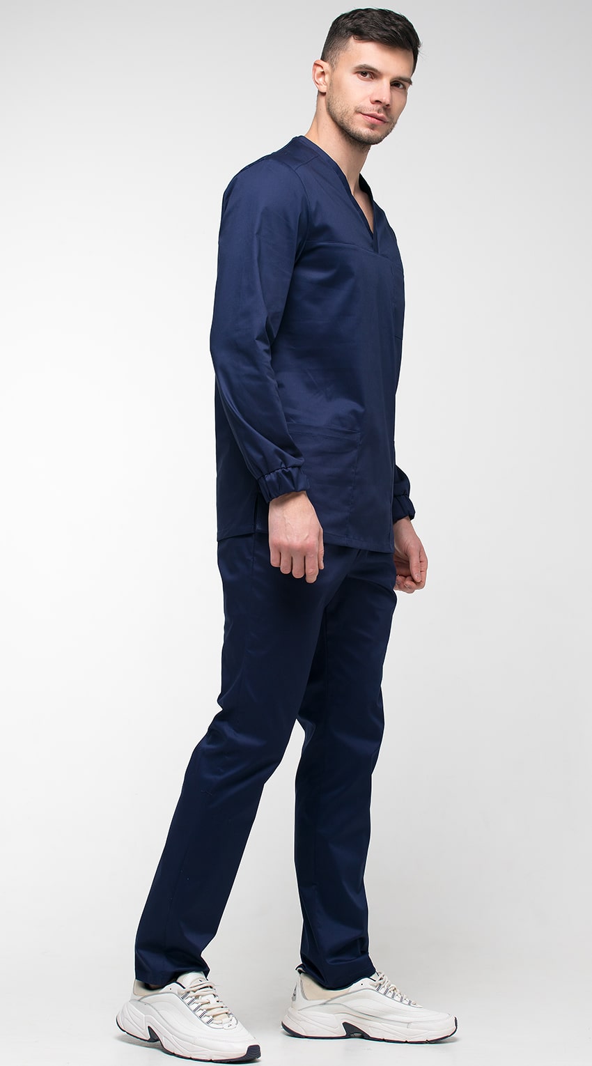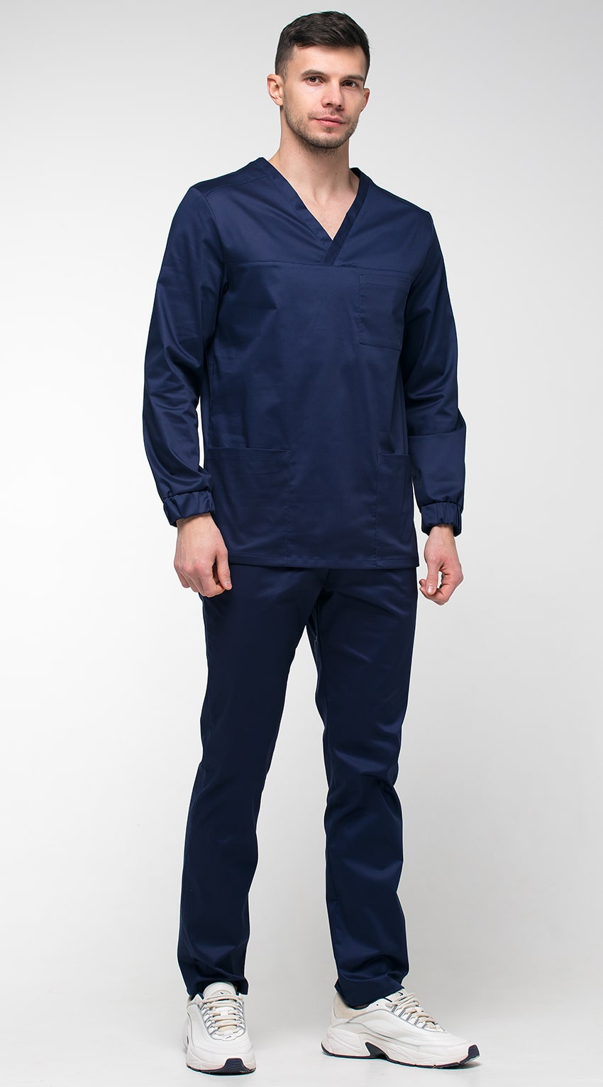 Костюм медицинский мужской состоит из куртки и брюк.Курта прямого силуэта с V-образным вырезом горловины, с разрезами в боковых швах.