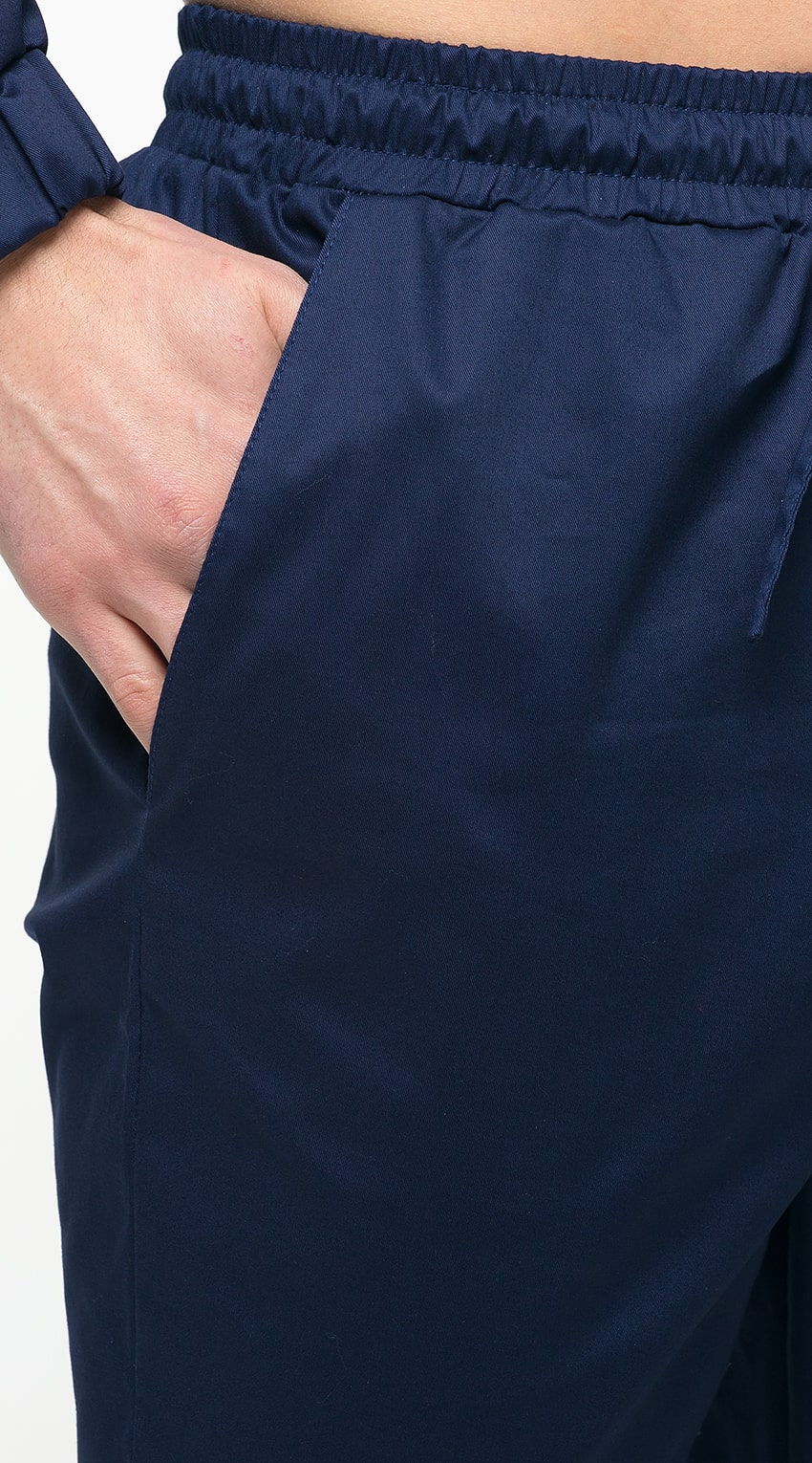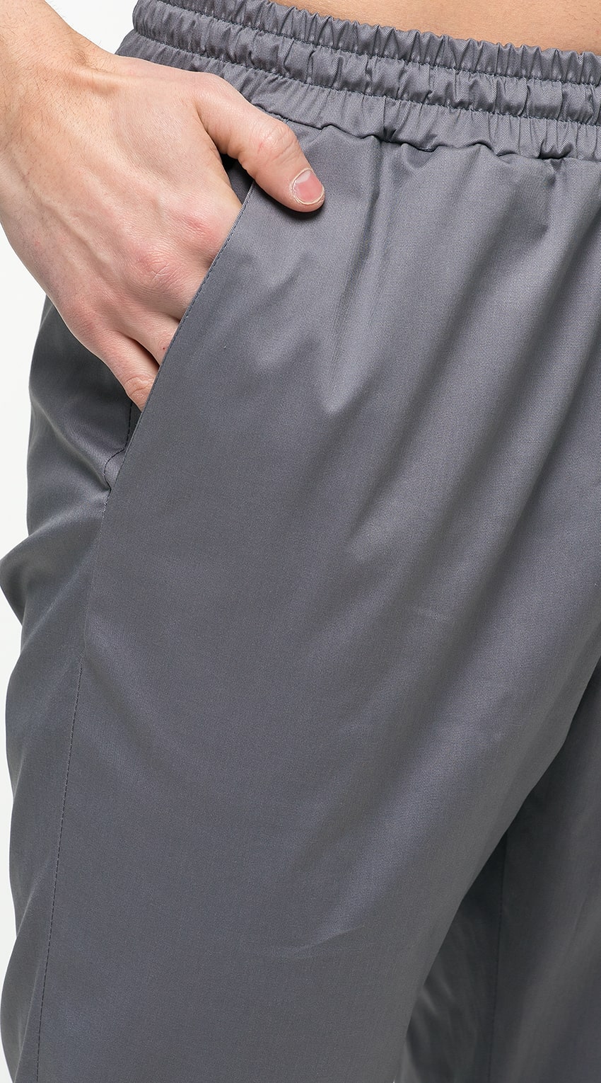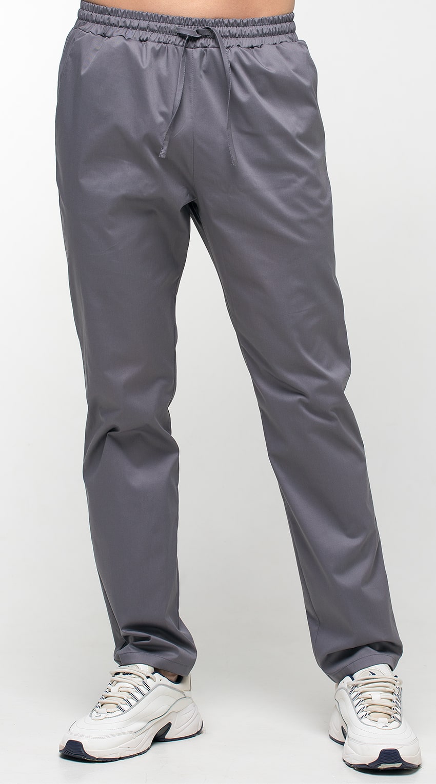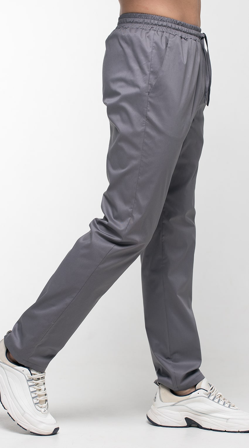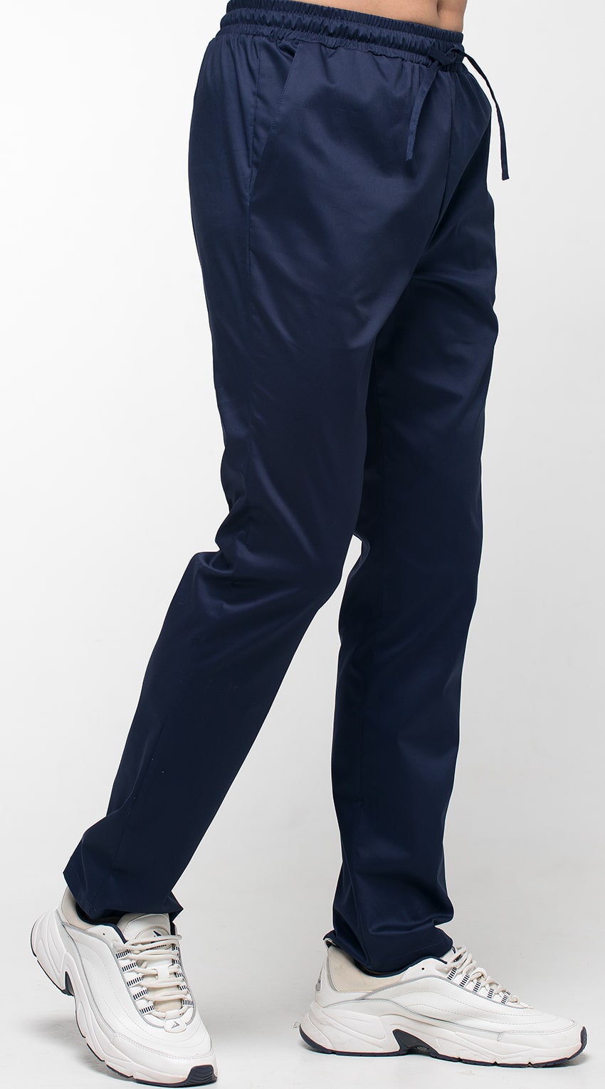 Брюки прямые, зауженные, с притачным поясом. Пояс с эластичной тесьмой внутри и шнурком из основной ткани. Передние половинки брюк с боковыми карманами с наклонным входом, с отрезными бочками. Низ брюк обработан швом вподгибку с закрытым срезом.