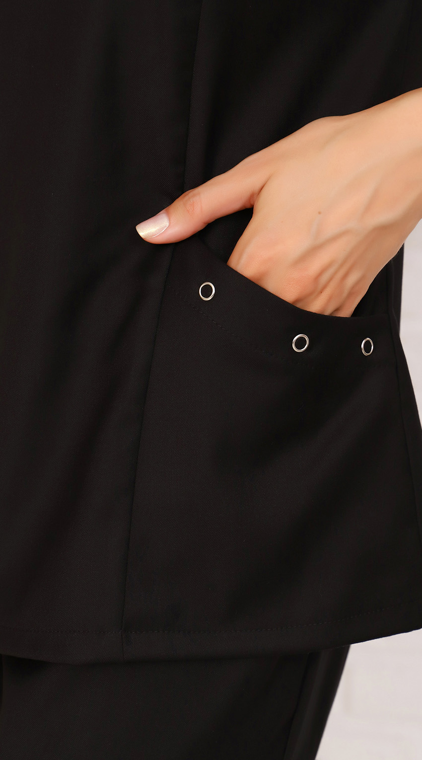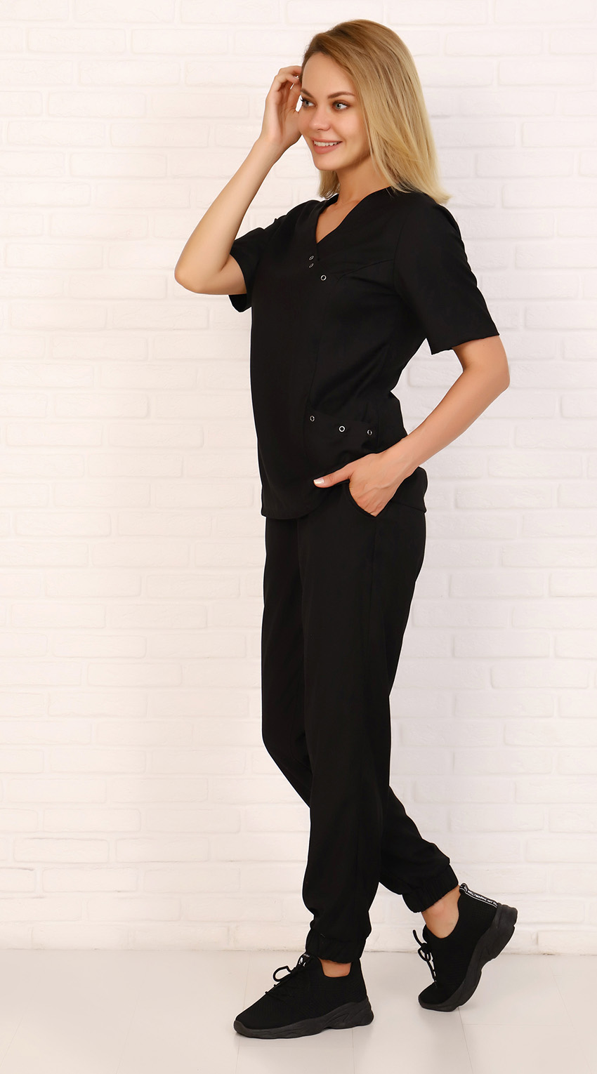 Костюм женский состоит из блузы и брюк.Блуза полуприлегающего силуэта с V-образным вырезом горловины. Полочка с рельефами, выходящими из проймы, нижними накладными карманами, входящими в боковые и рельефные швы. Центральная часть полочки асимметричная с кокеткой слева. Входы в карманы и горловина полочки обработаны обтачками и настрочены Шш - 2 см. Обтачка горловины полочки справа удлинена, создавая асимметрию и уходит в левый рельеф. На планке горловины, в месте соединения с кокеткой, и планке левого кармана установлены кнопки-кольцо, выполняющие декоративную функцию.