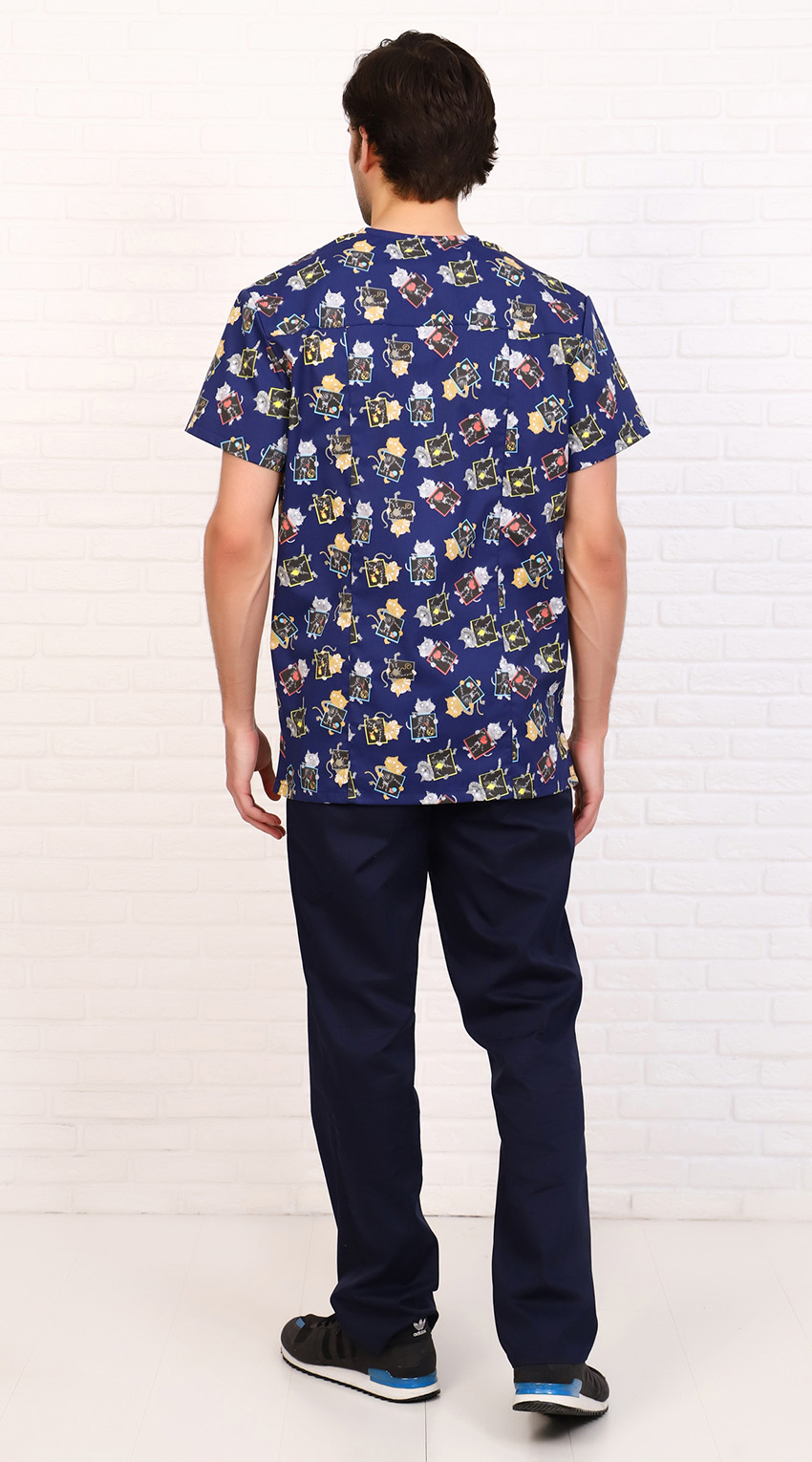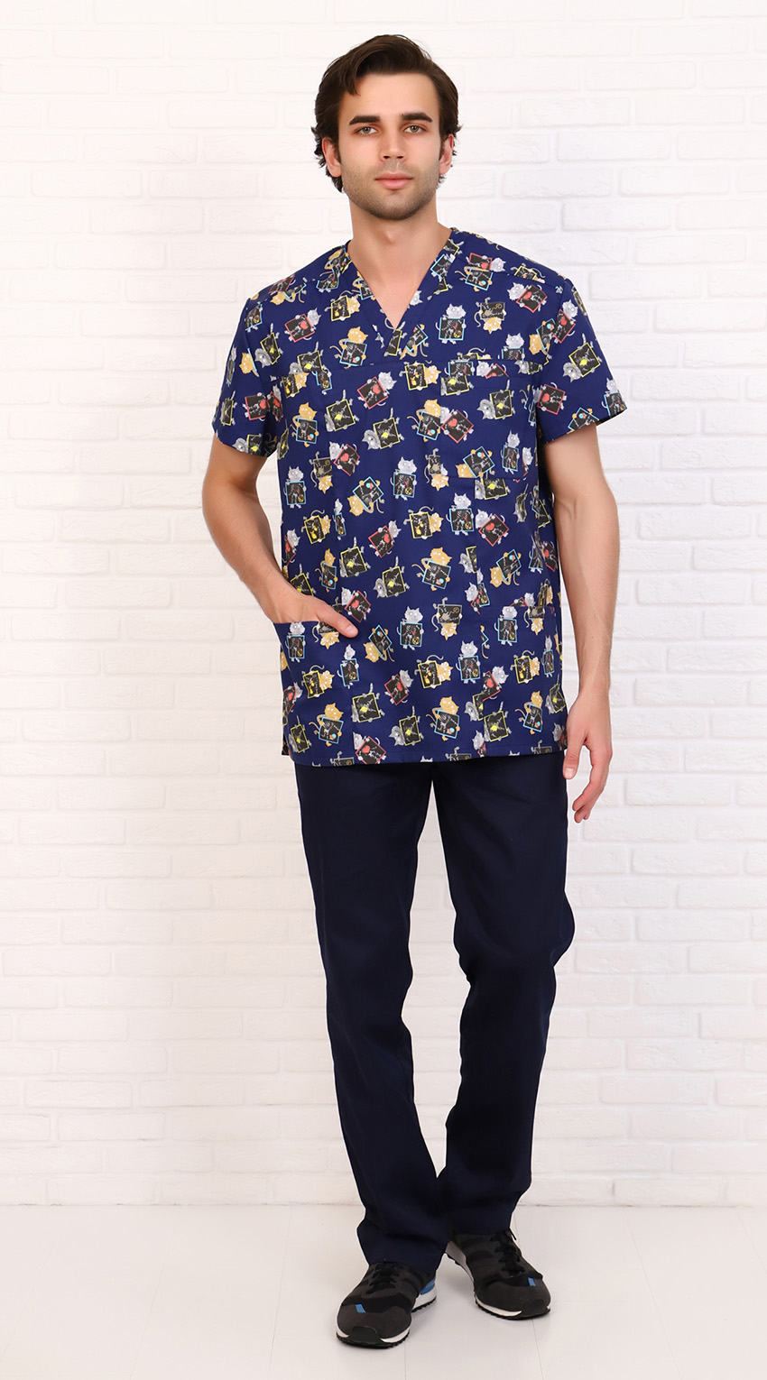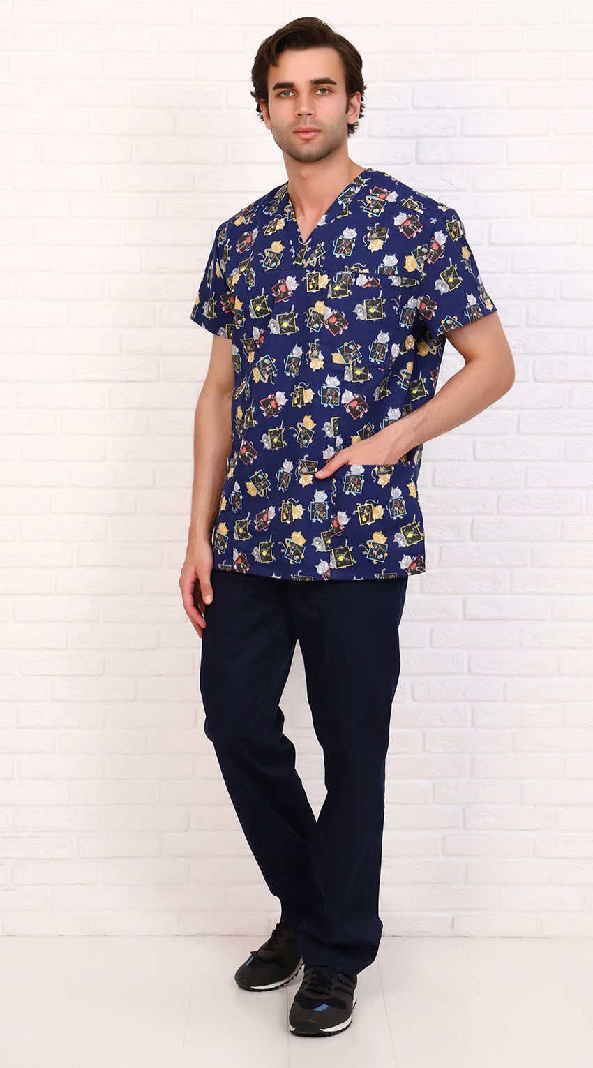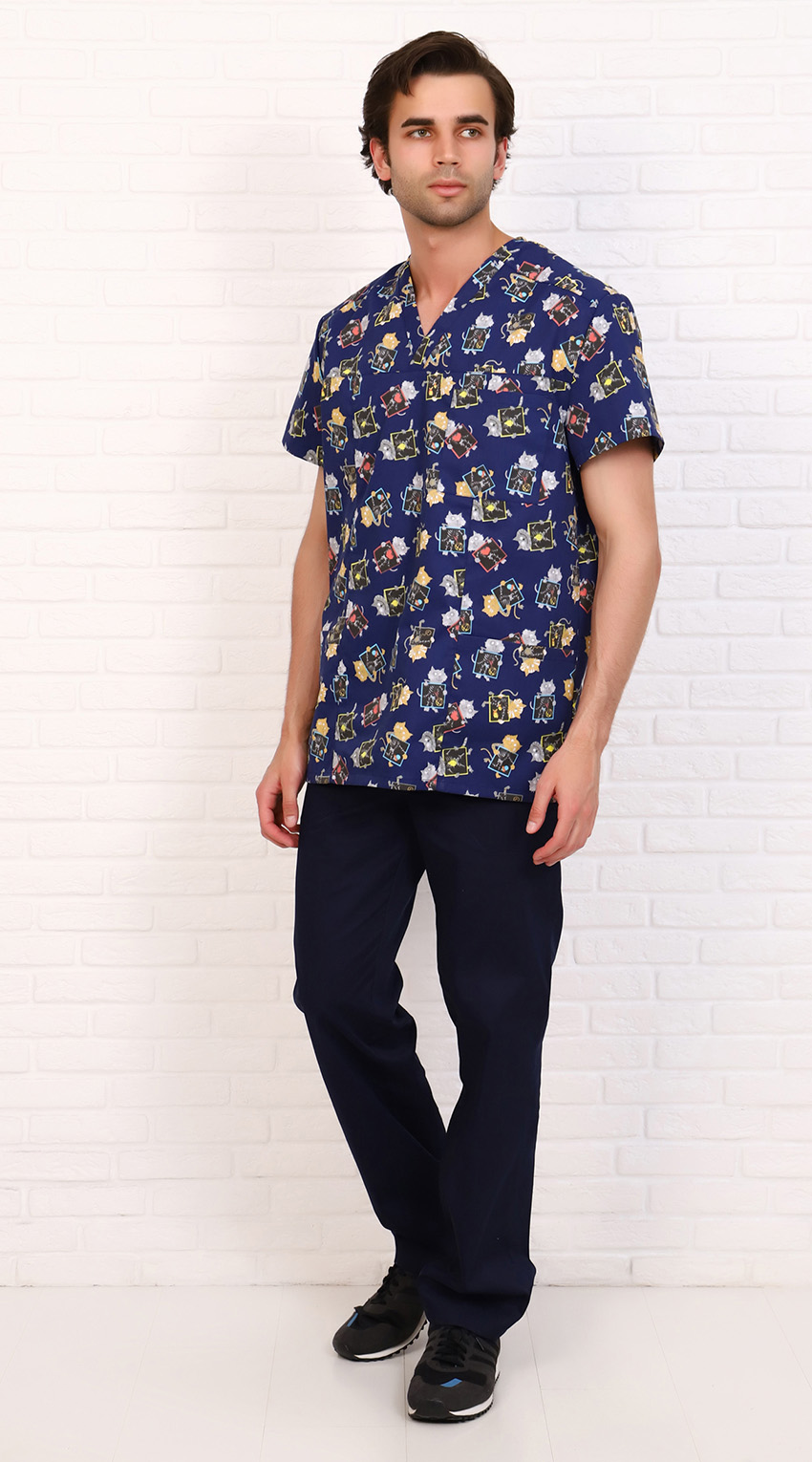 Костюм медицинский мужской состоит из куртки и брюк.Куртка прямого силуэта с V образным вырезом горловины, с разрезами в боковых швах.
