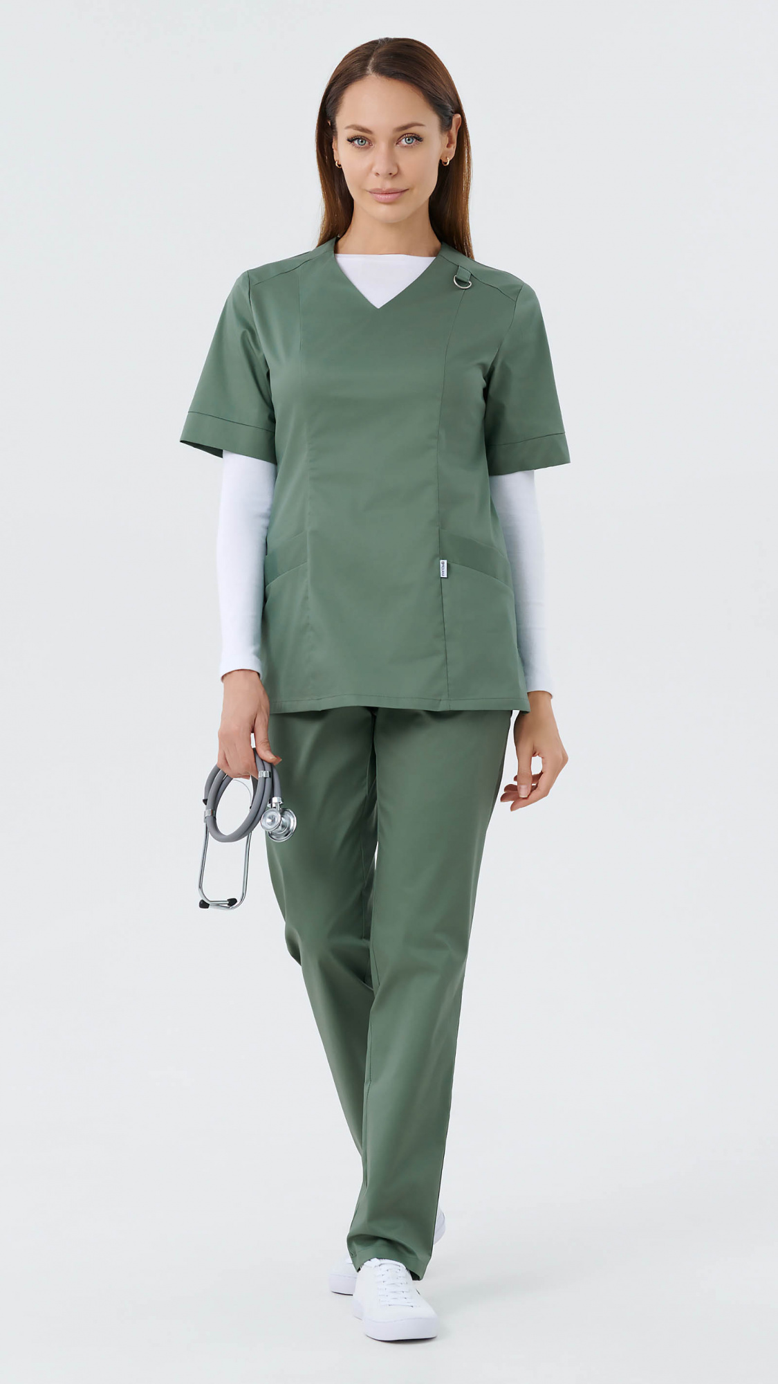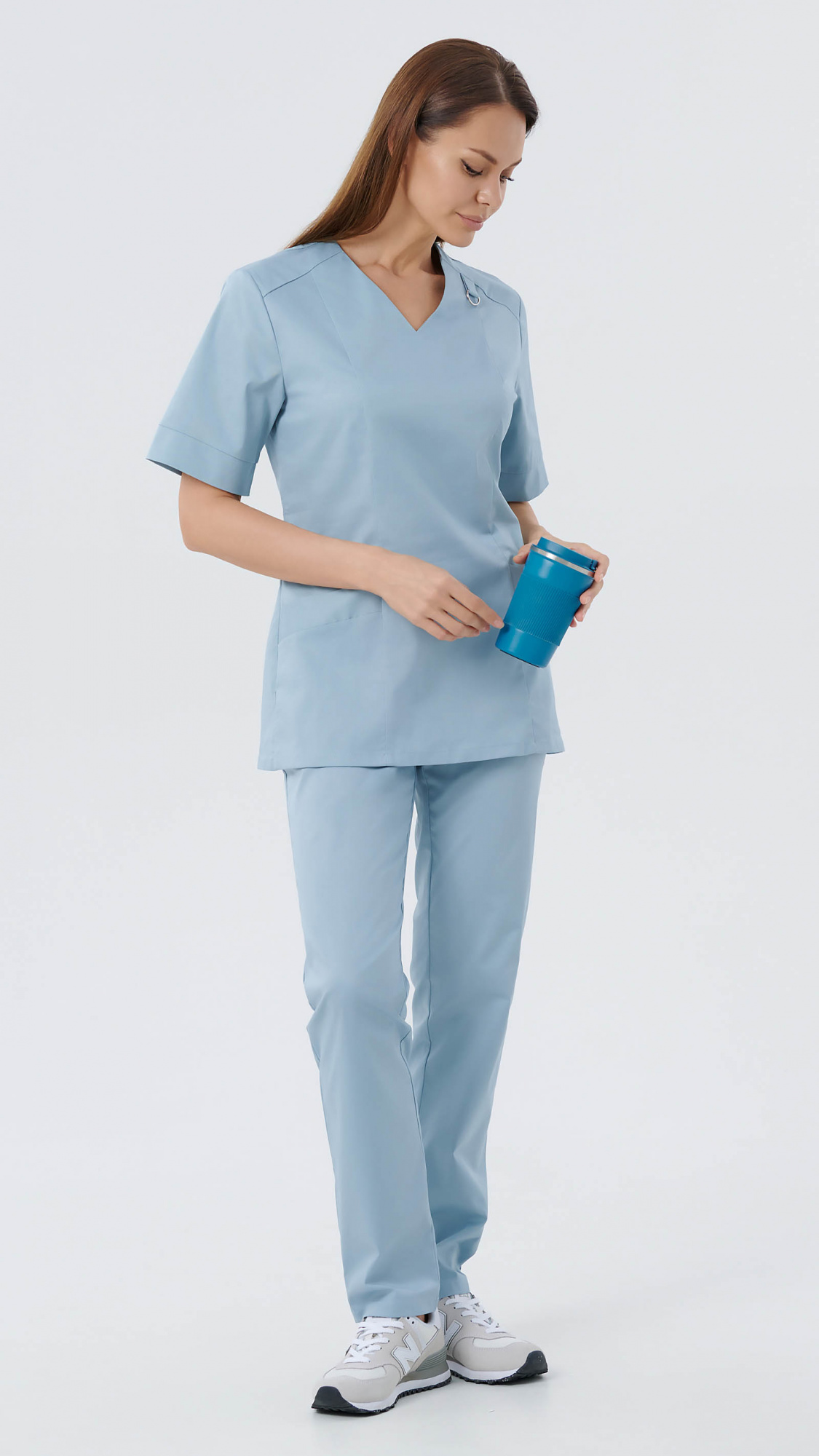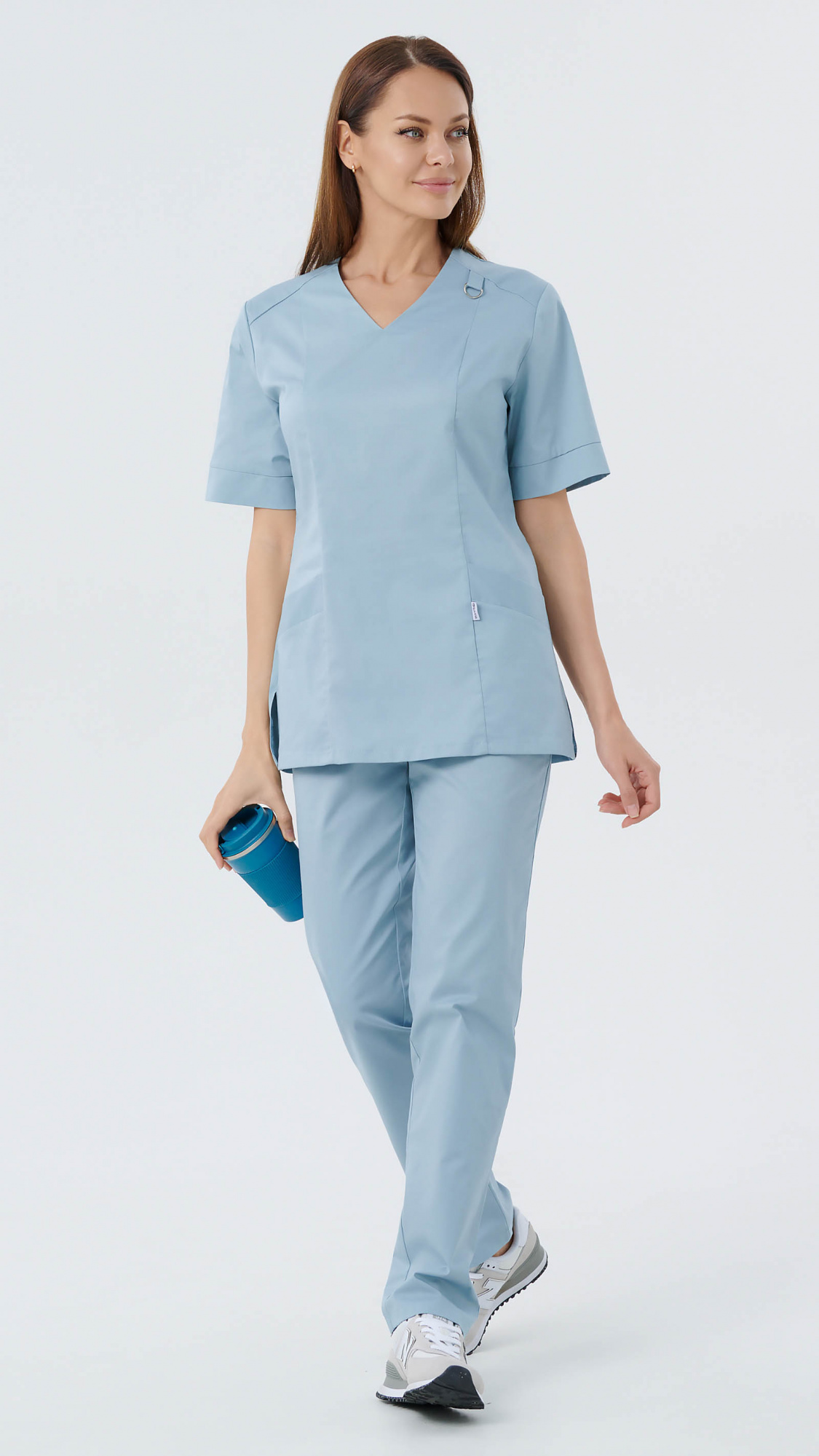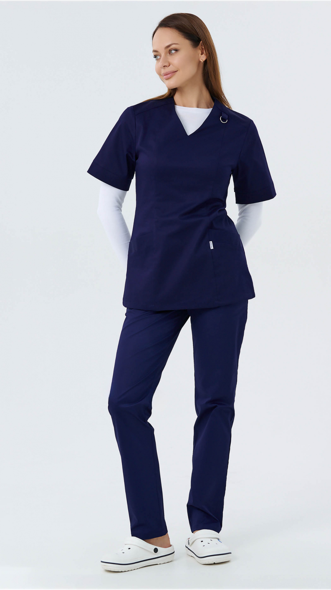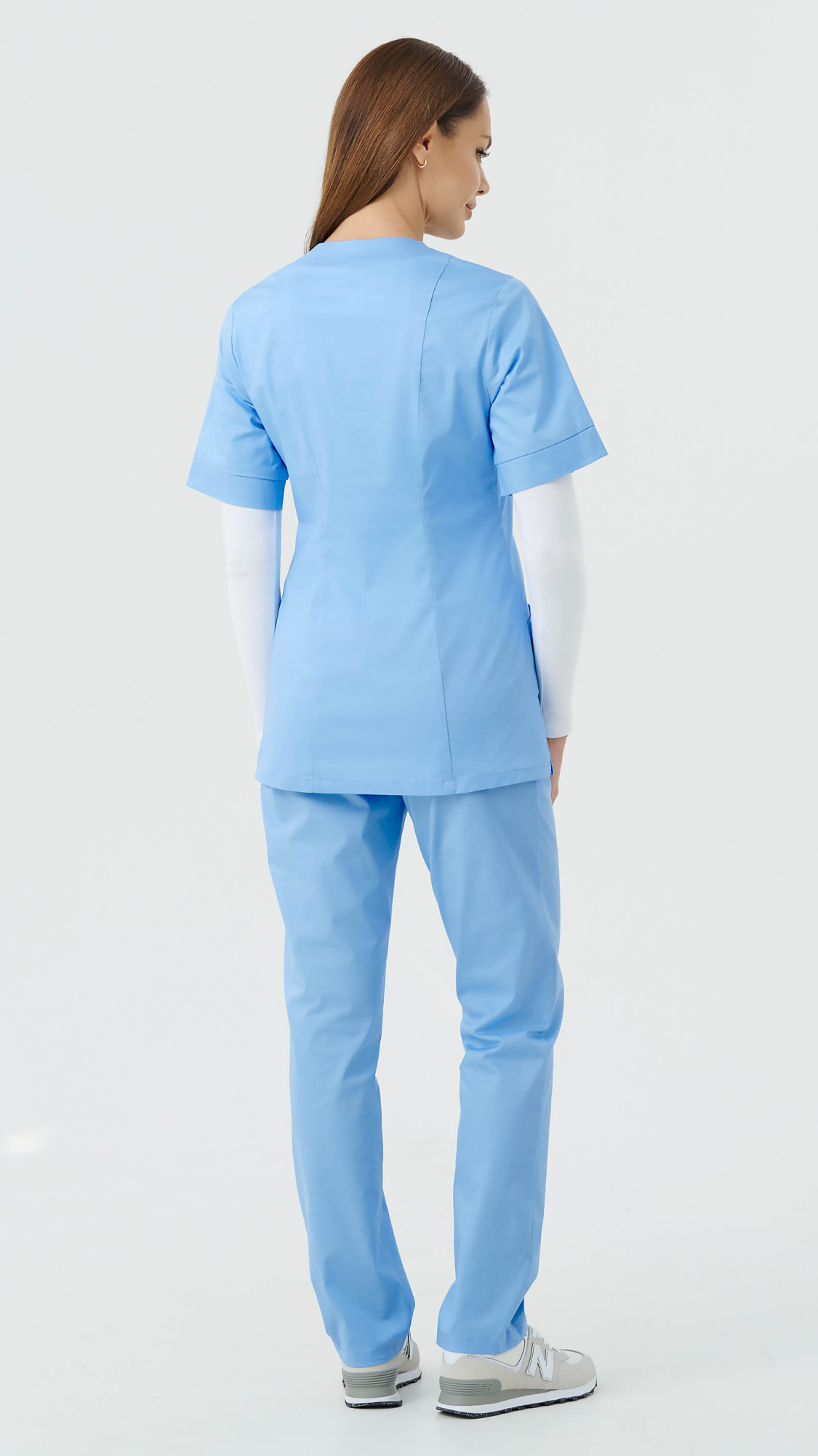 Костюм женский хирургический, состоит из блузы и брюк.Блуза полуприлегающего силуэта с V-образный вырезом горловины, с боковыми разрезами внизу.