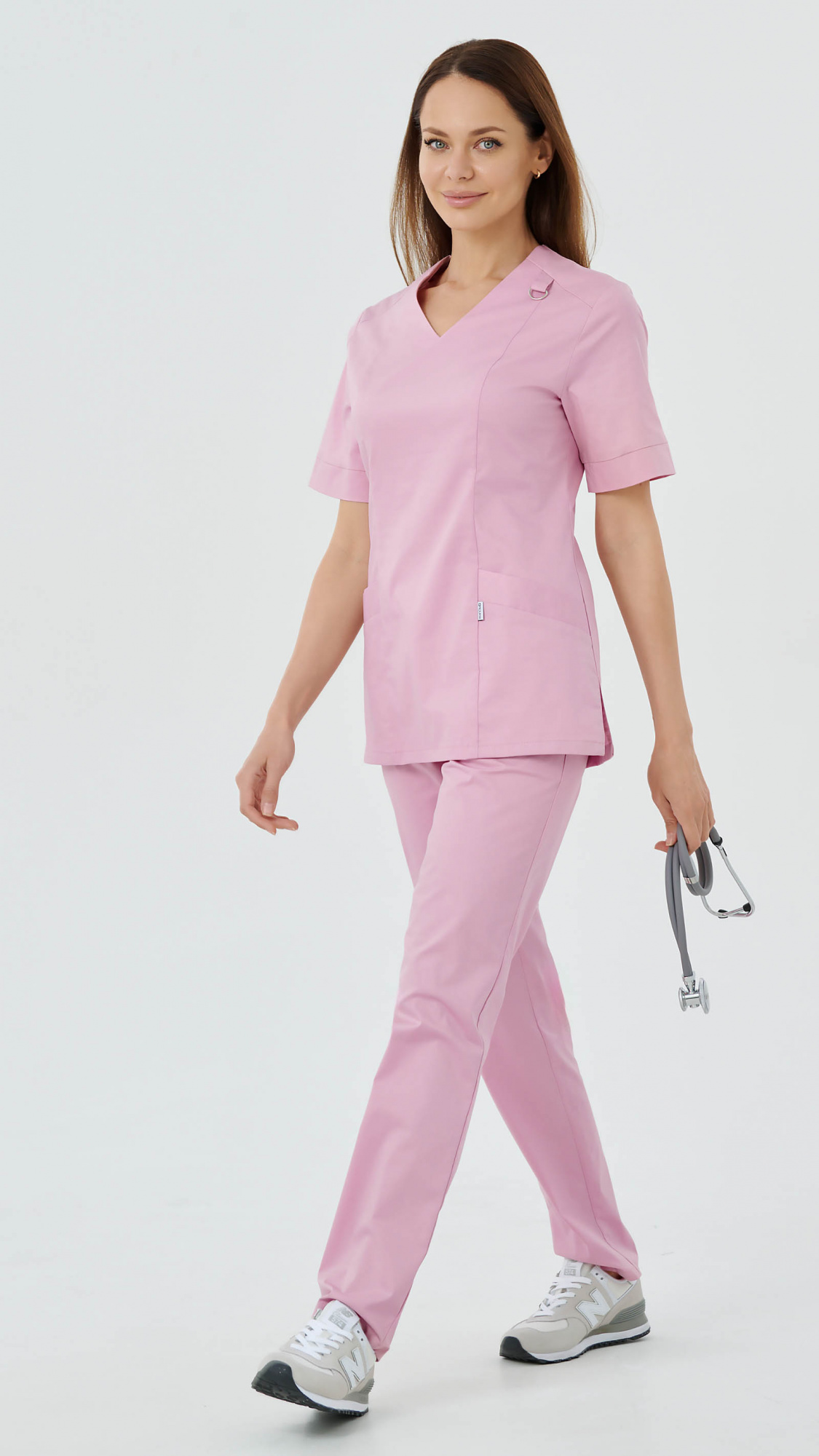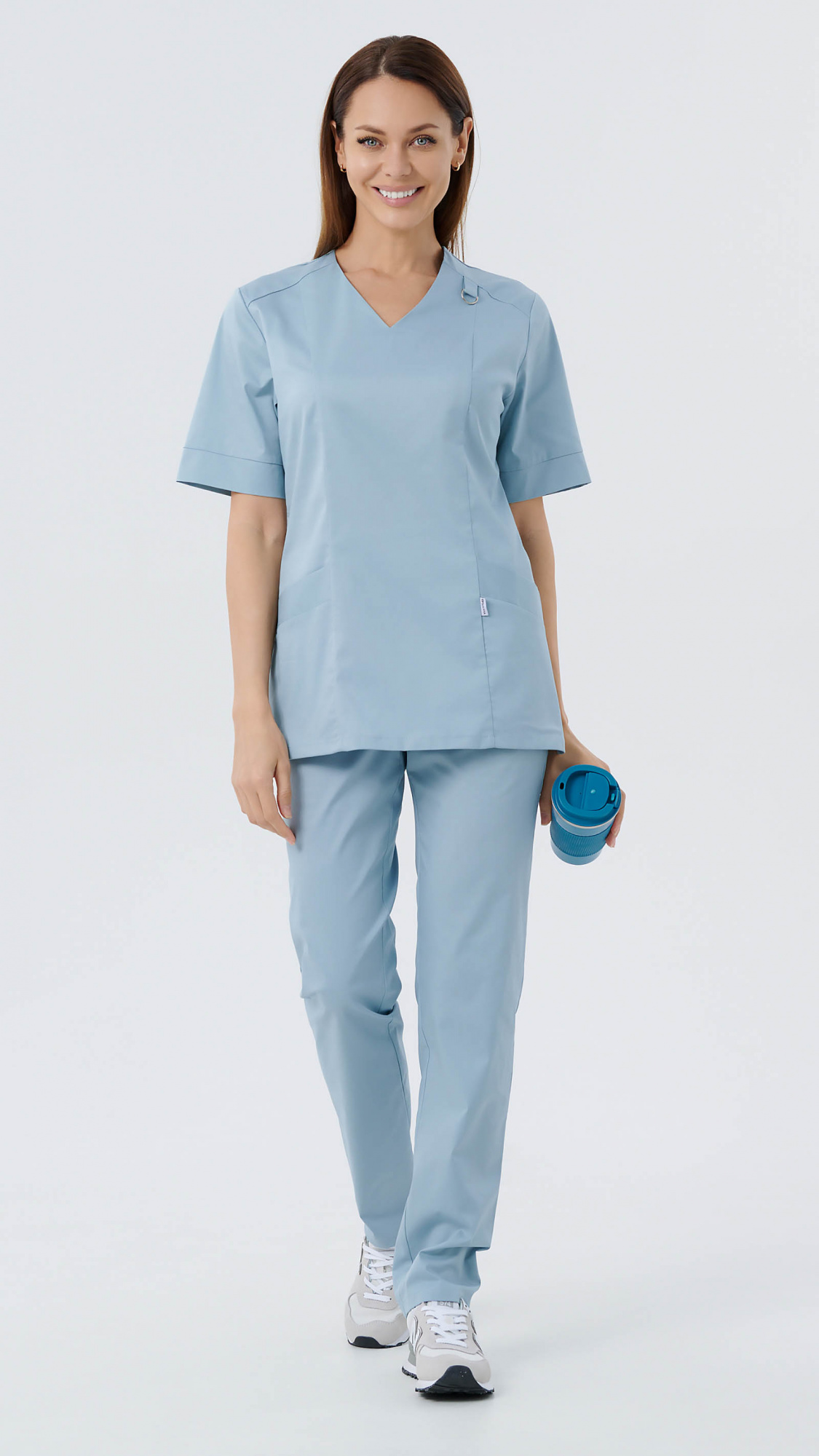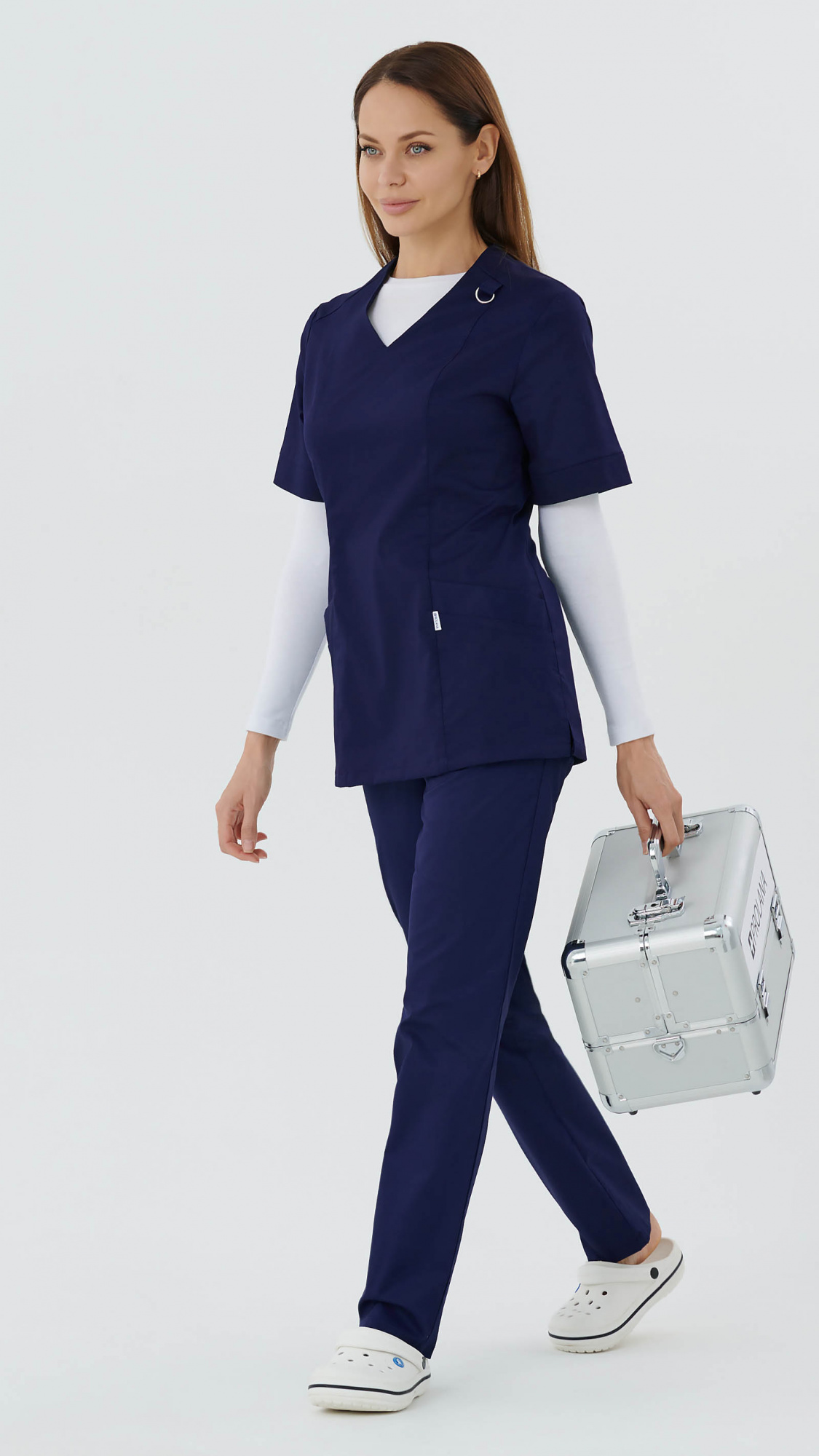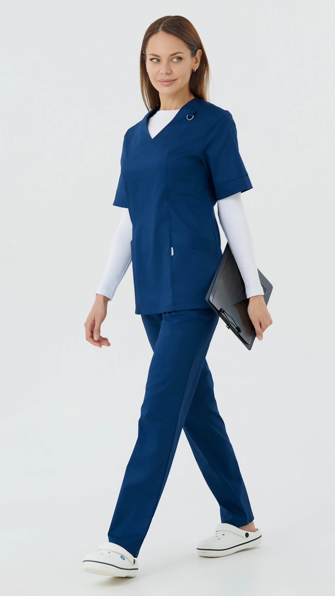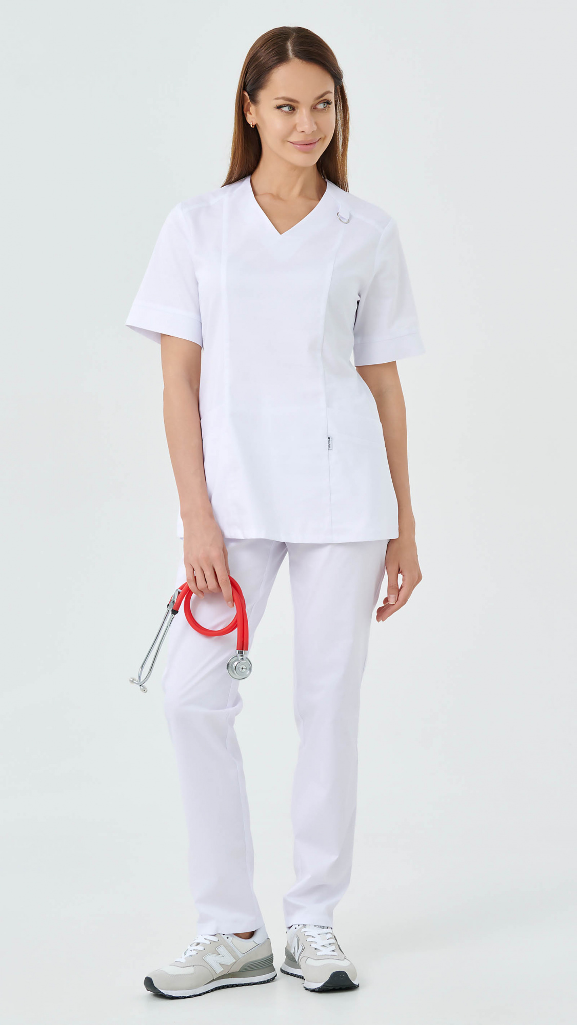 Костюм женский хирургический, состоит из блузы и брюк.Блуза полуприлегающего силуэта с V-образный вырезом горловины, с боковыми разрезами внизу.