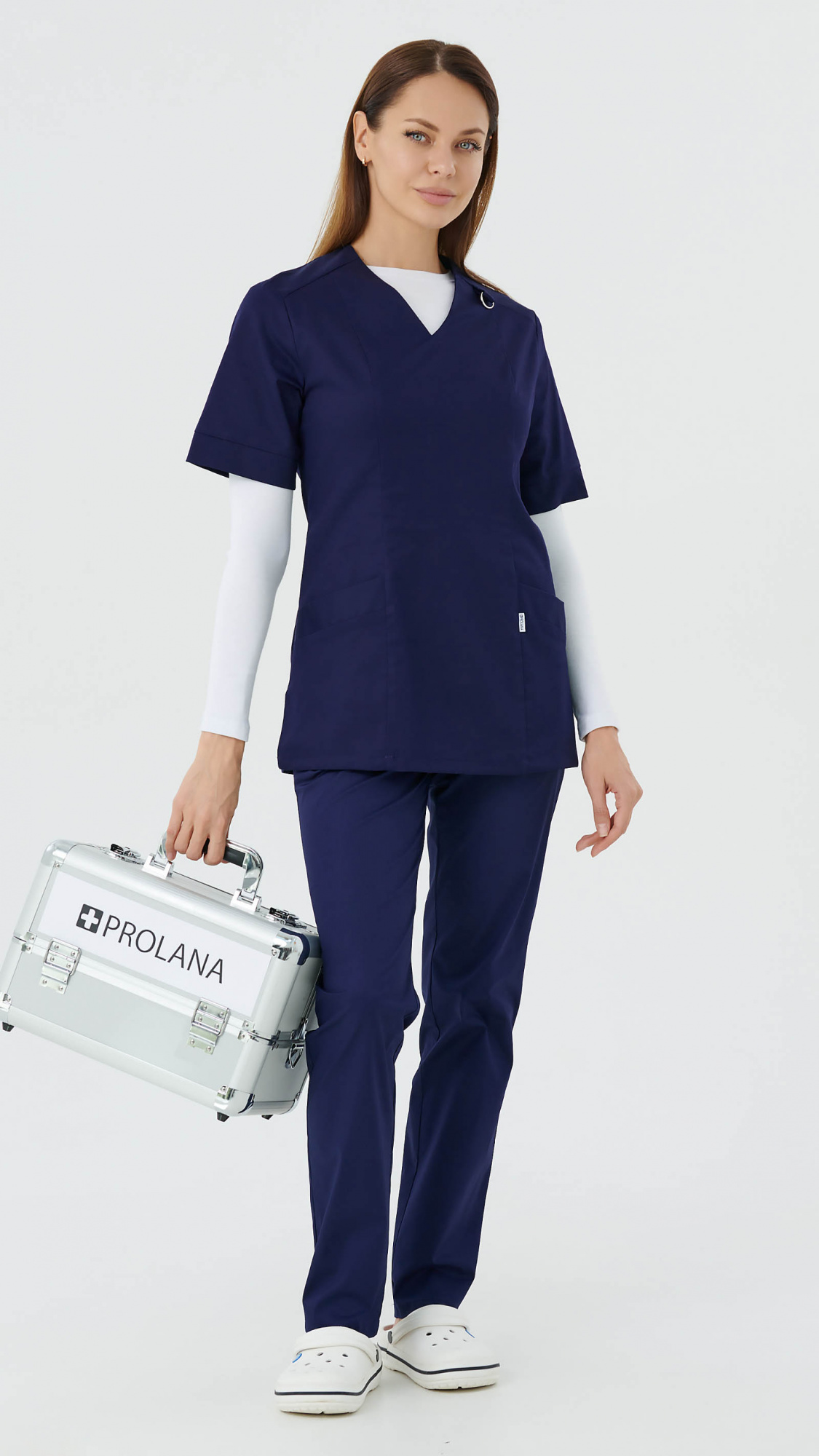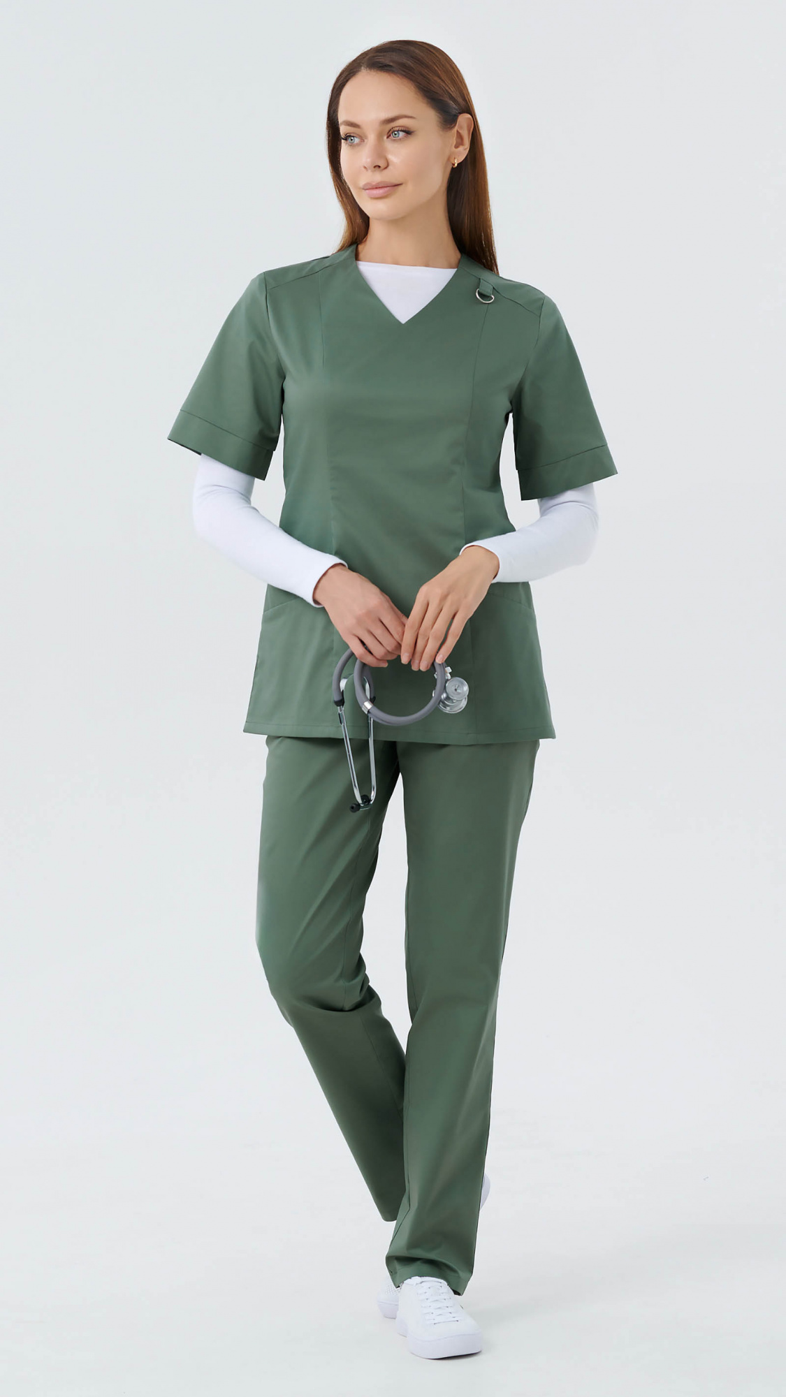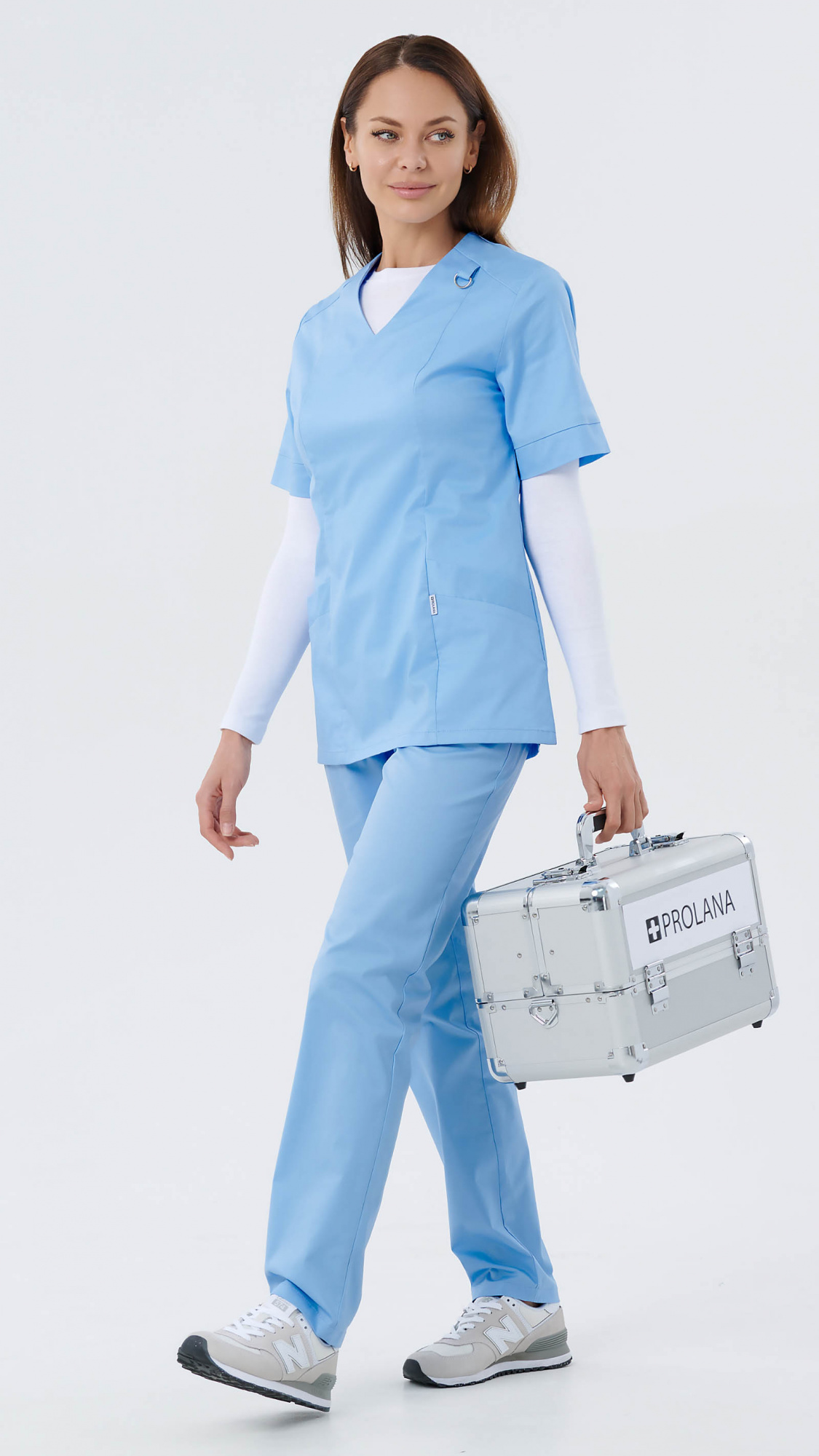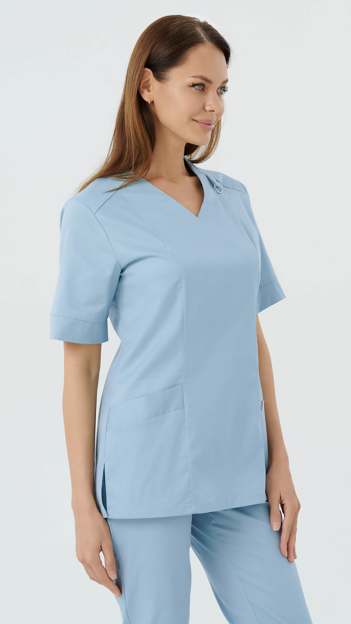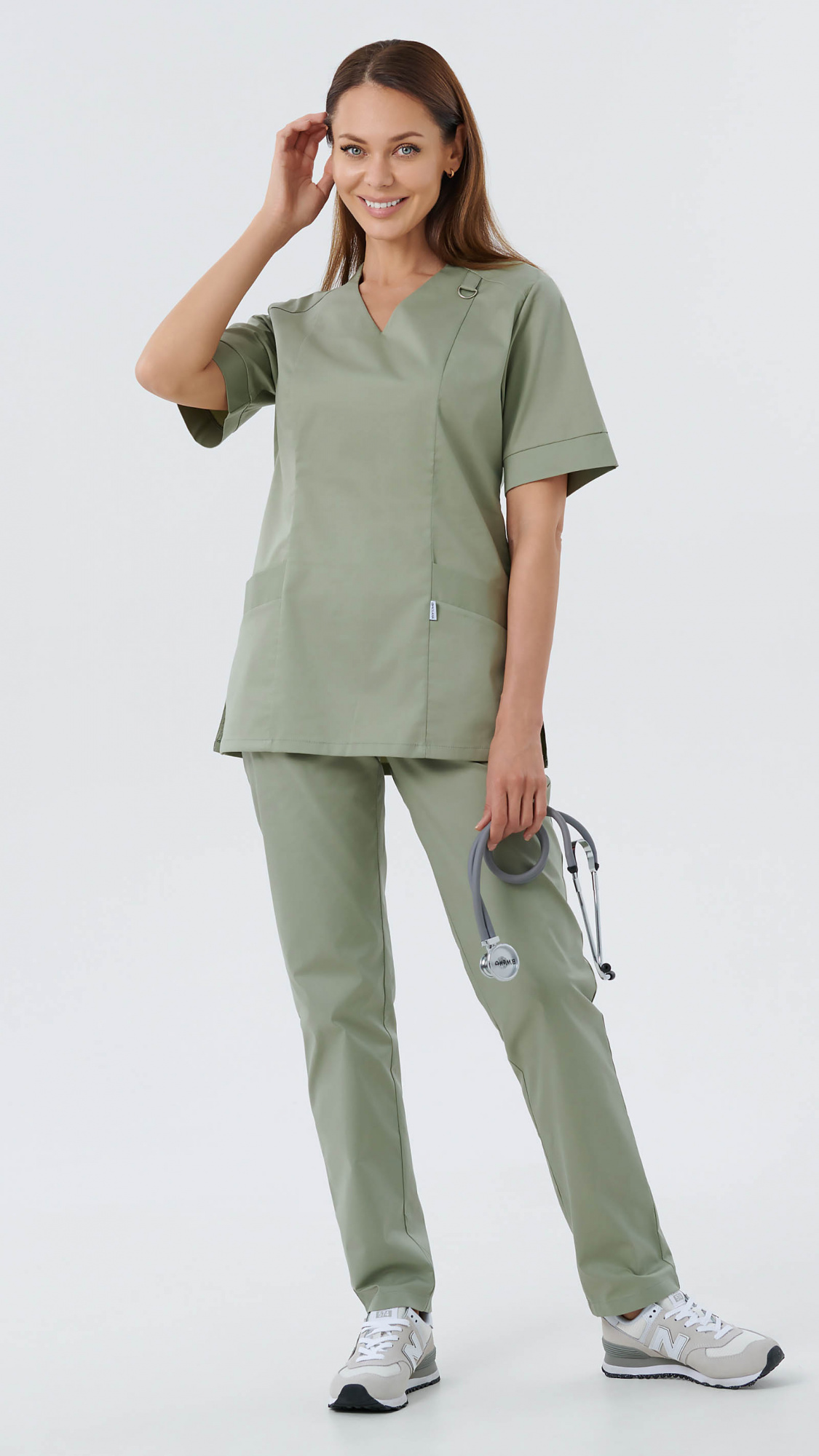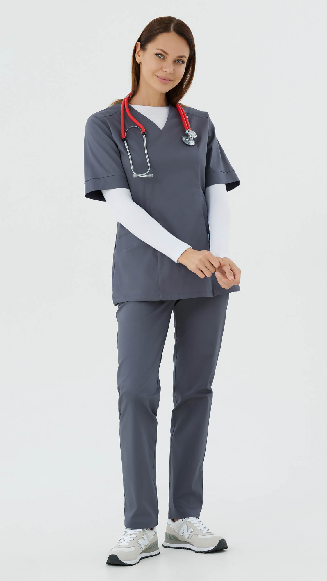 Костюм женский хирургический, состоит из блузы и брюк.Блуза полуприлегающего силуэта с V-образный вырезом горловины, с боковыми разрезами внизу.