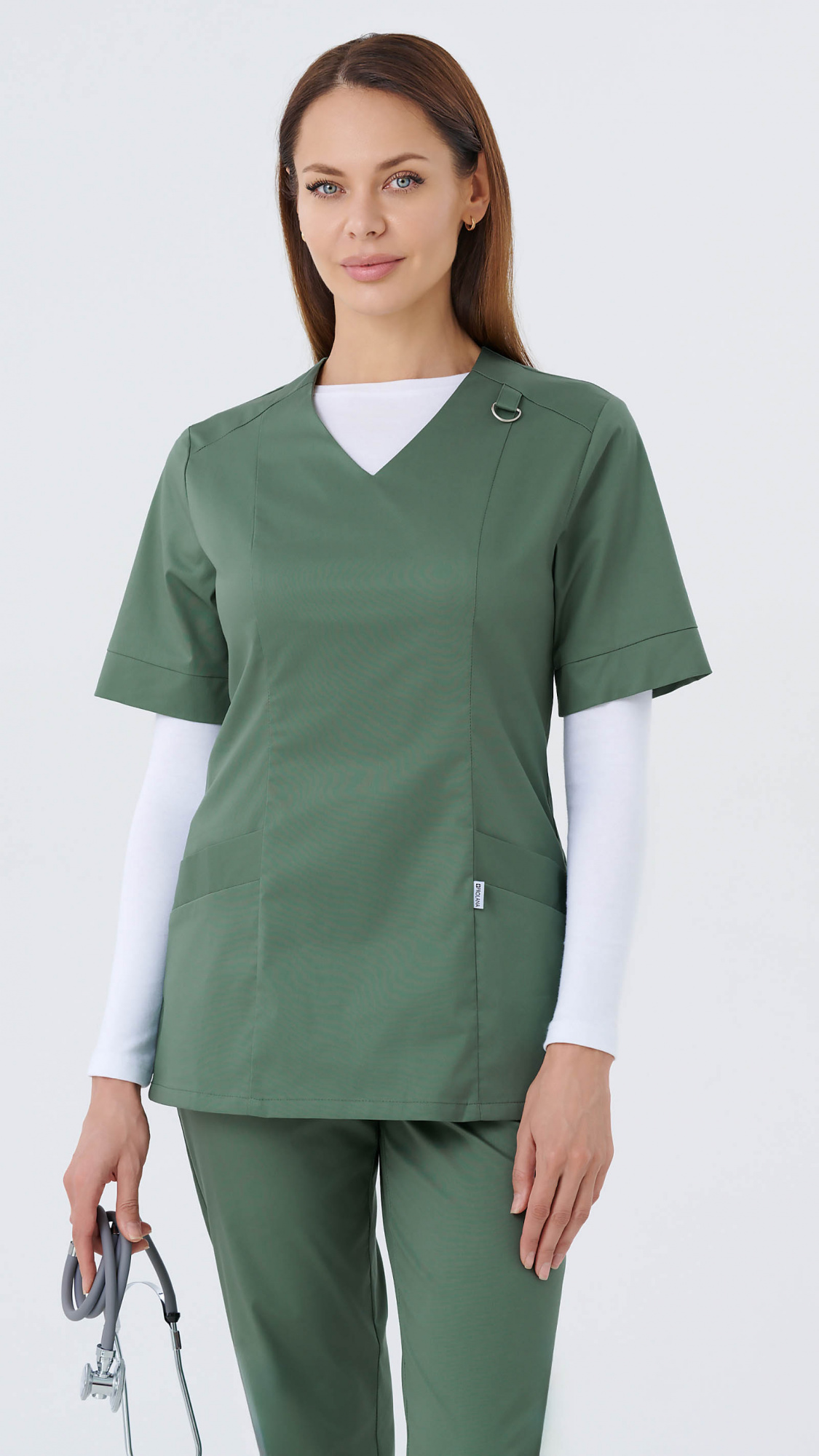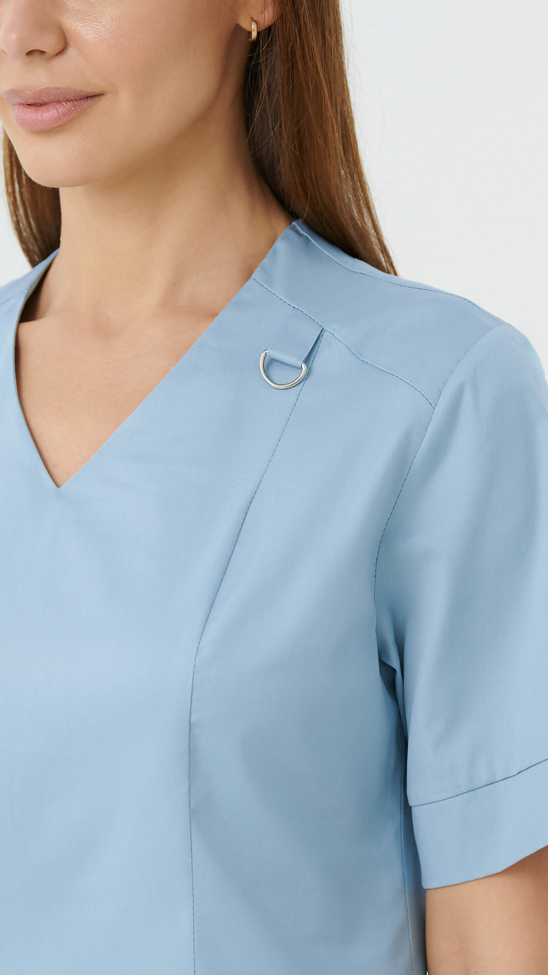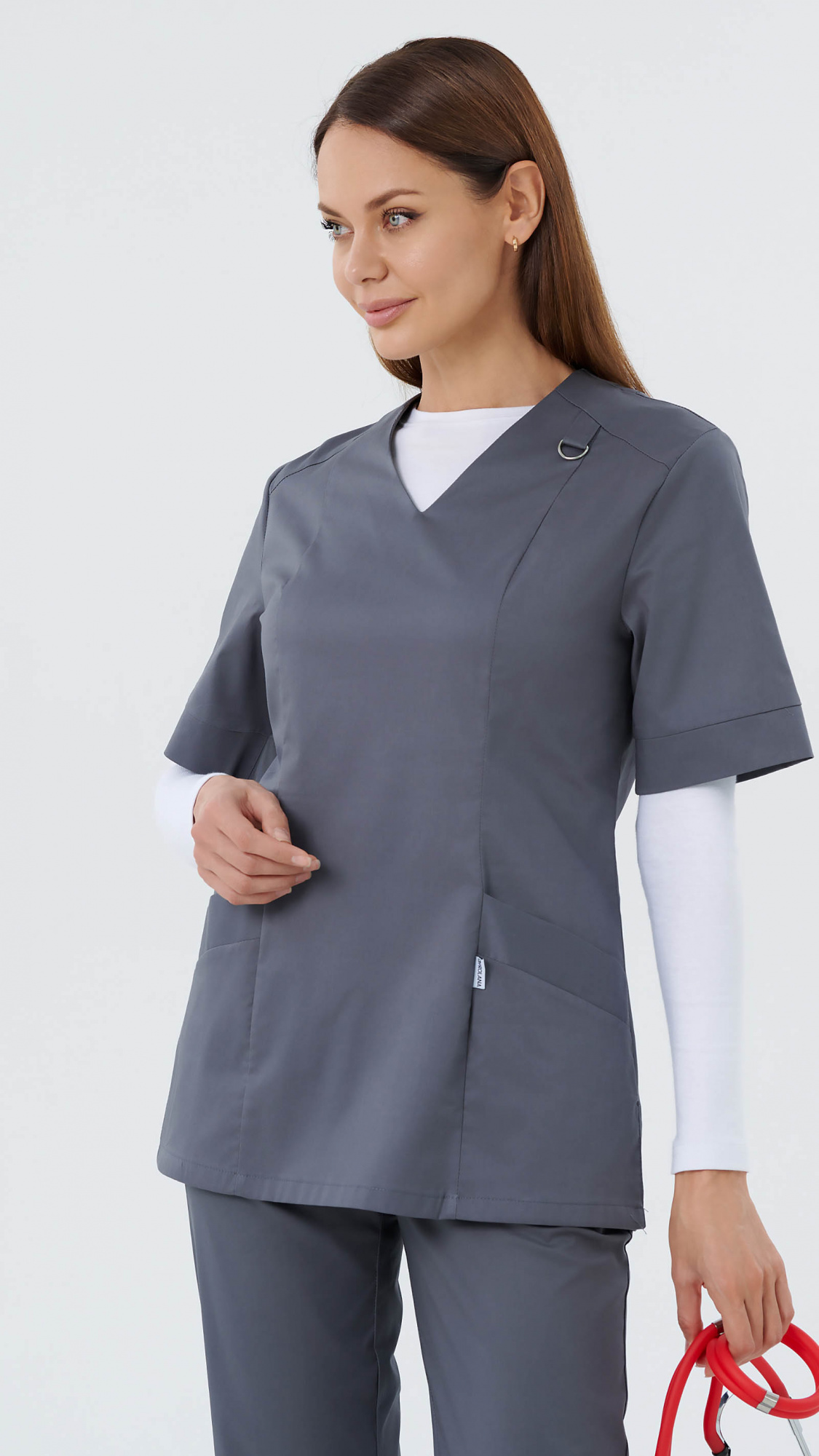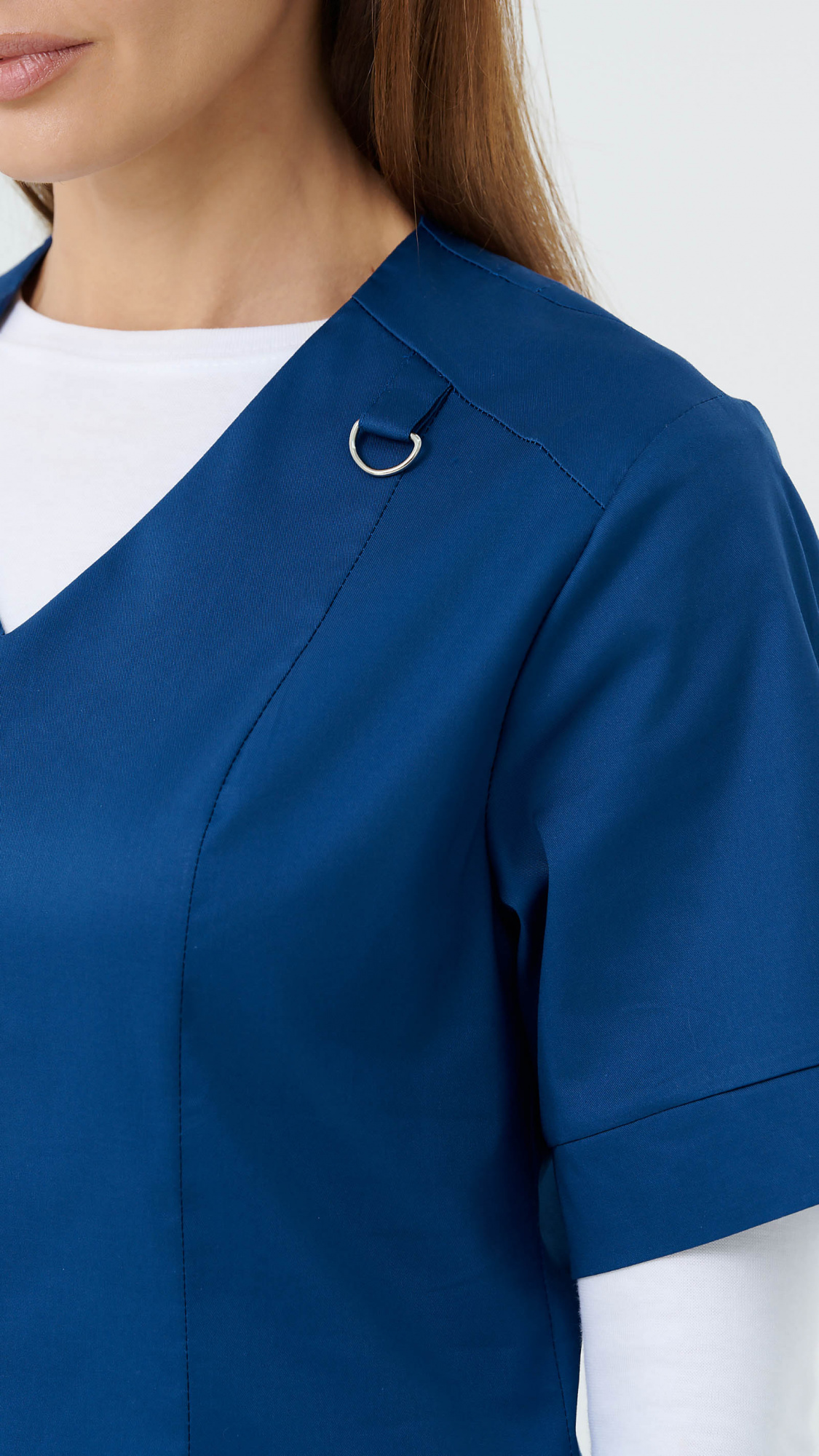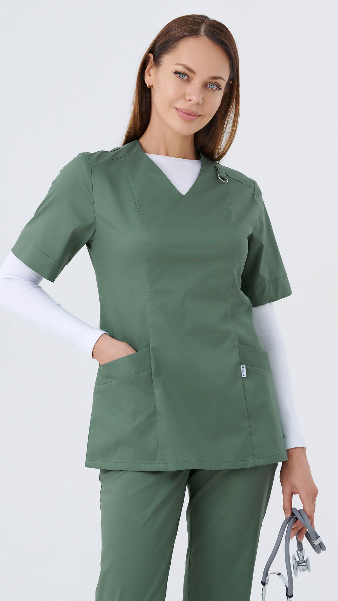Костюм женский хирургический, состоит из блузы и брюк.Блуза полуприлегающего силуэта с V-образный вырезом горловины, с боковыми разрезами внизу.