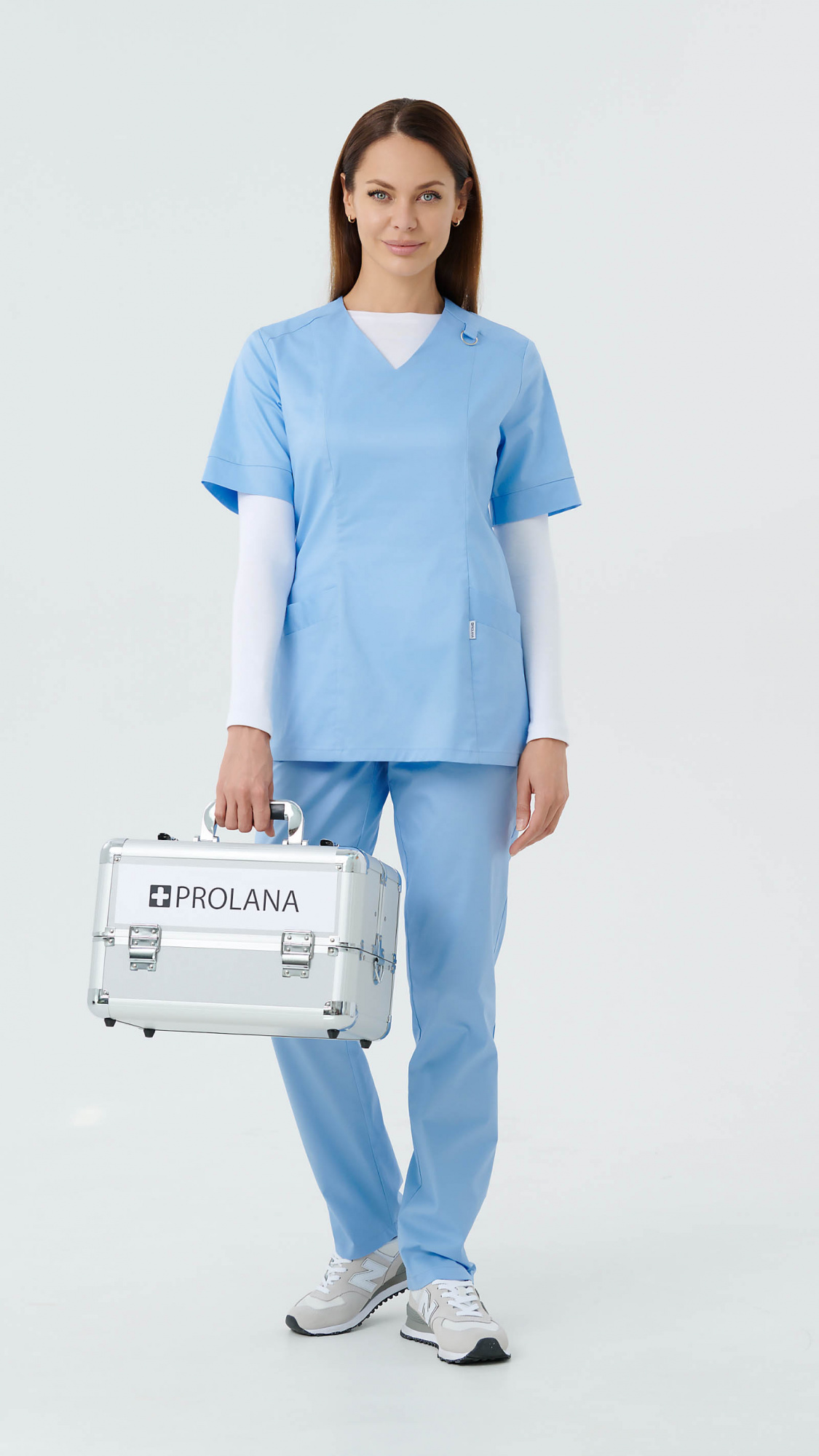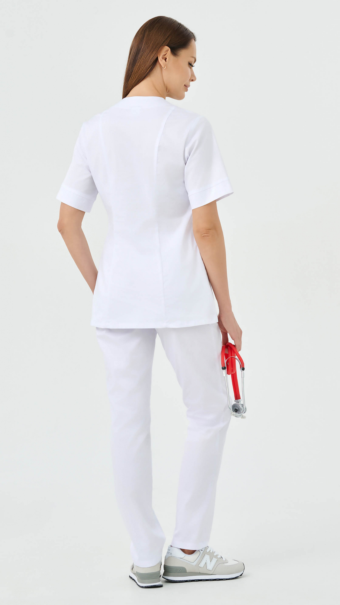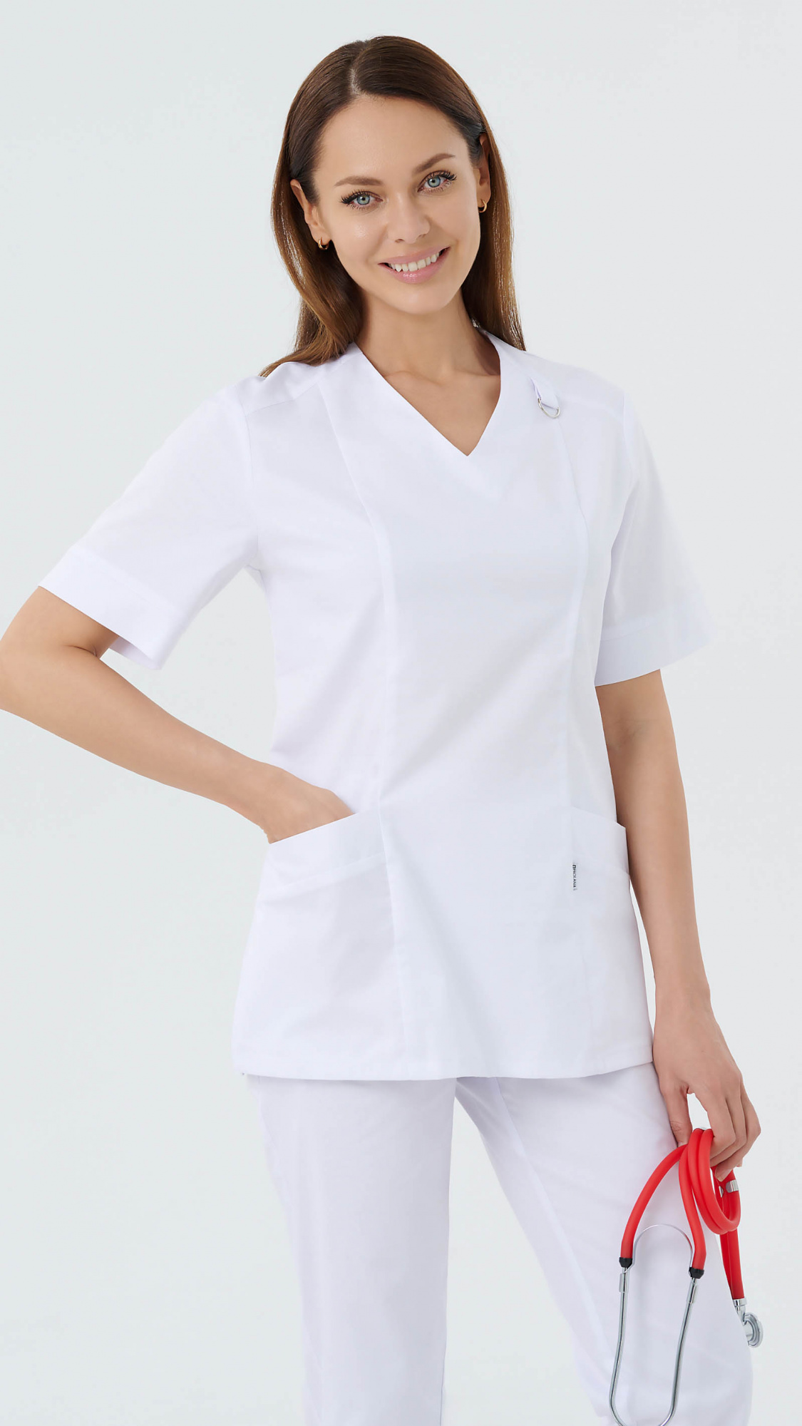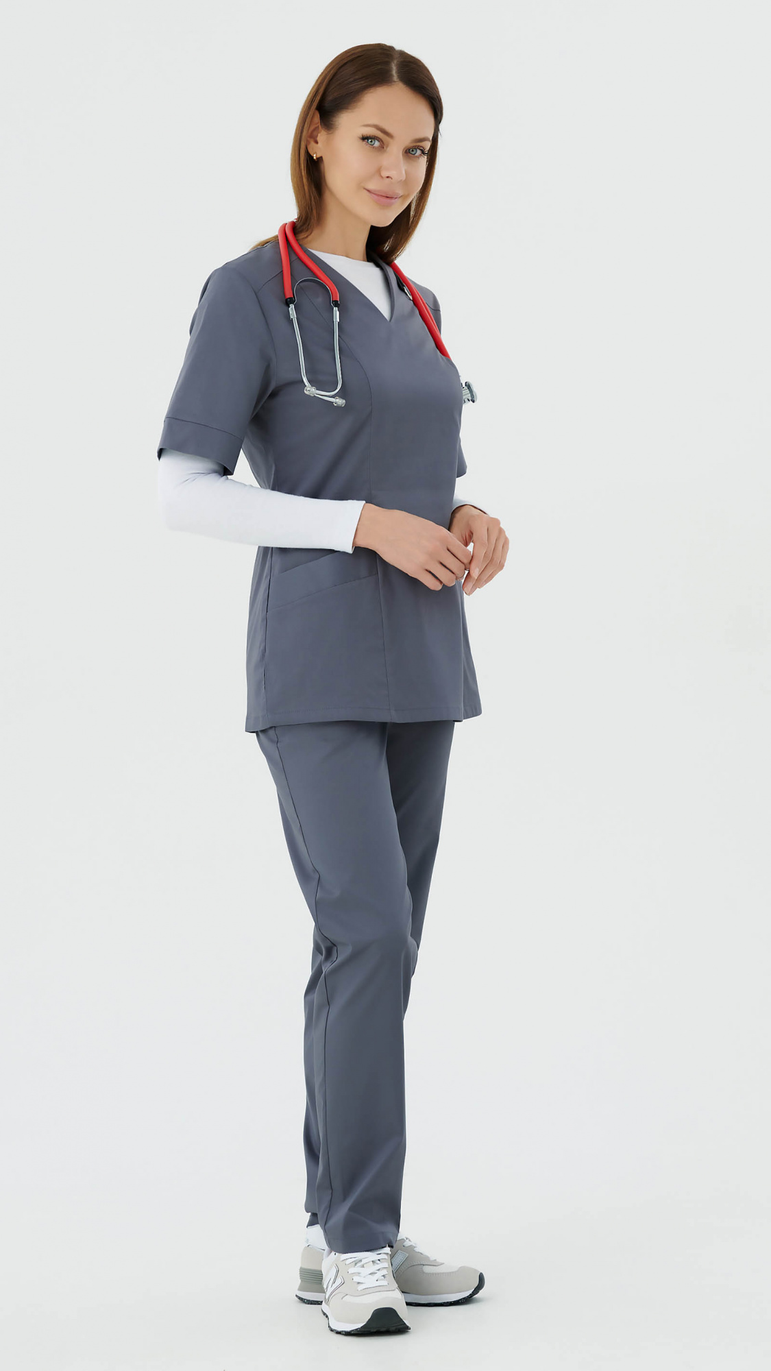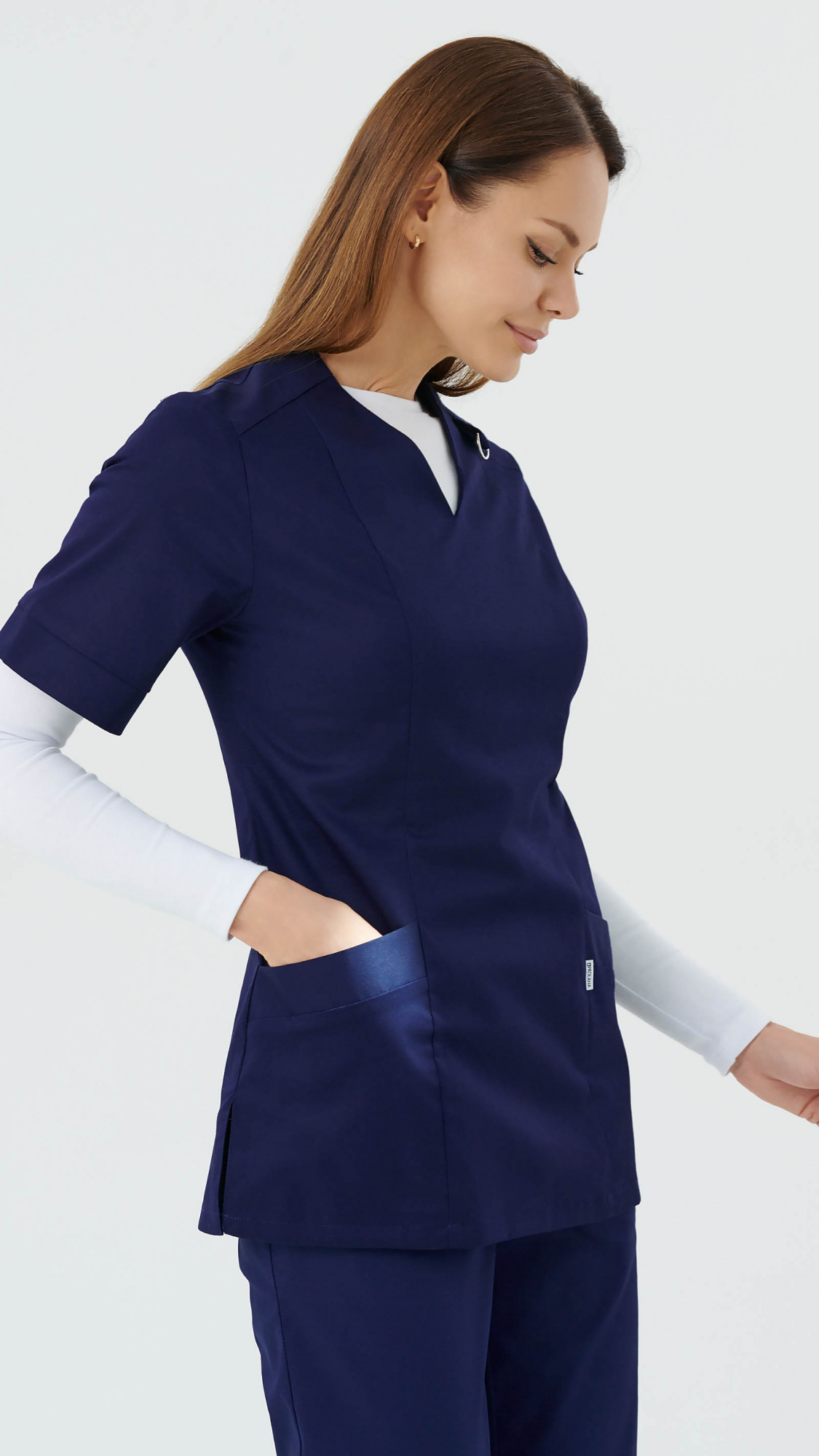 Костюм женский хирургический, состоит из блузы и брюк.Блуза полуприлегающего силуэта с V-образный вырезом горловины, с боковыми разрезами внизу.