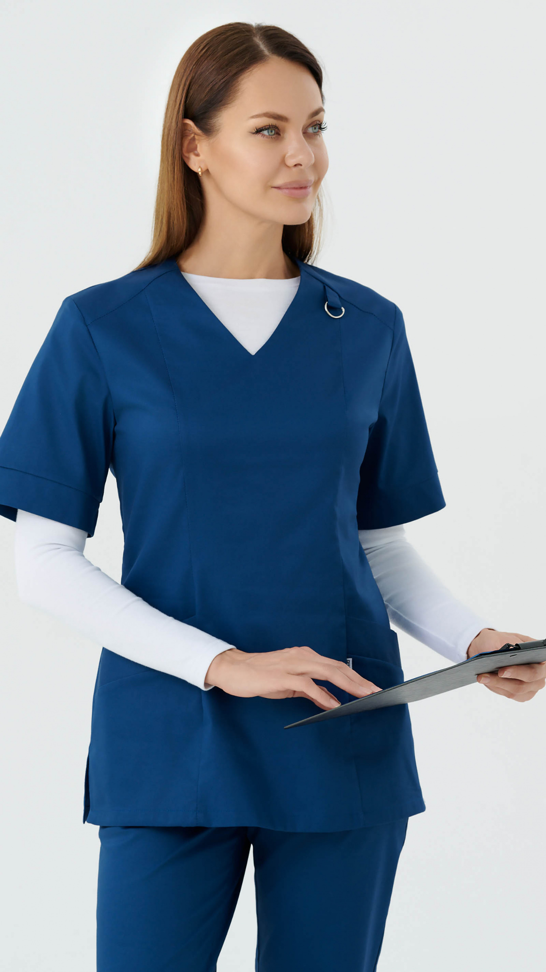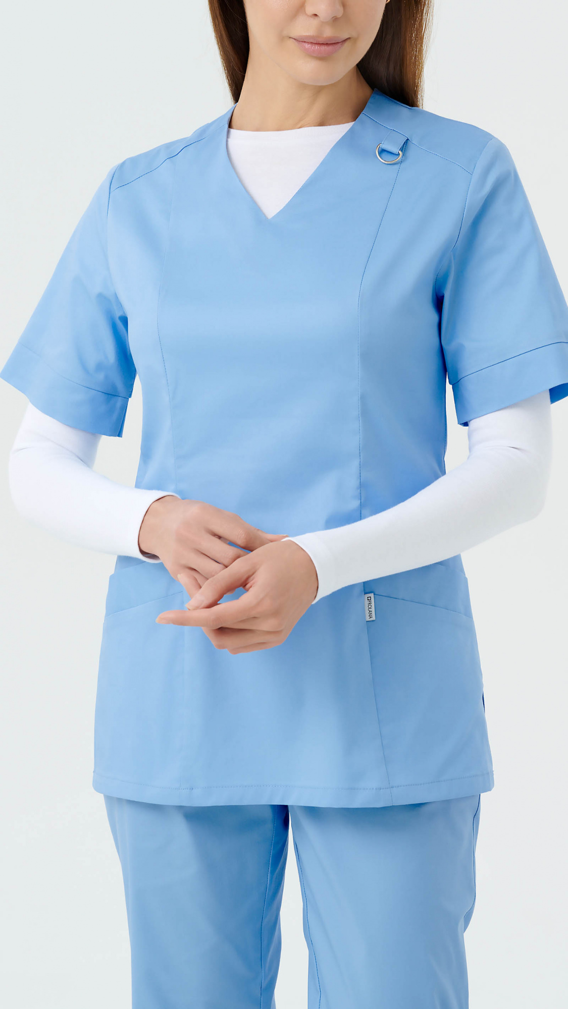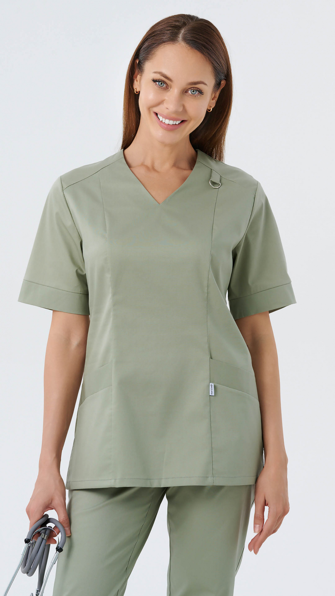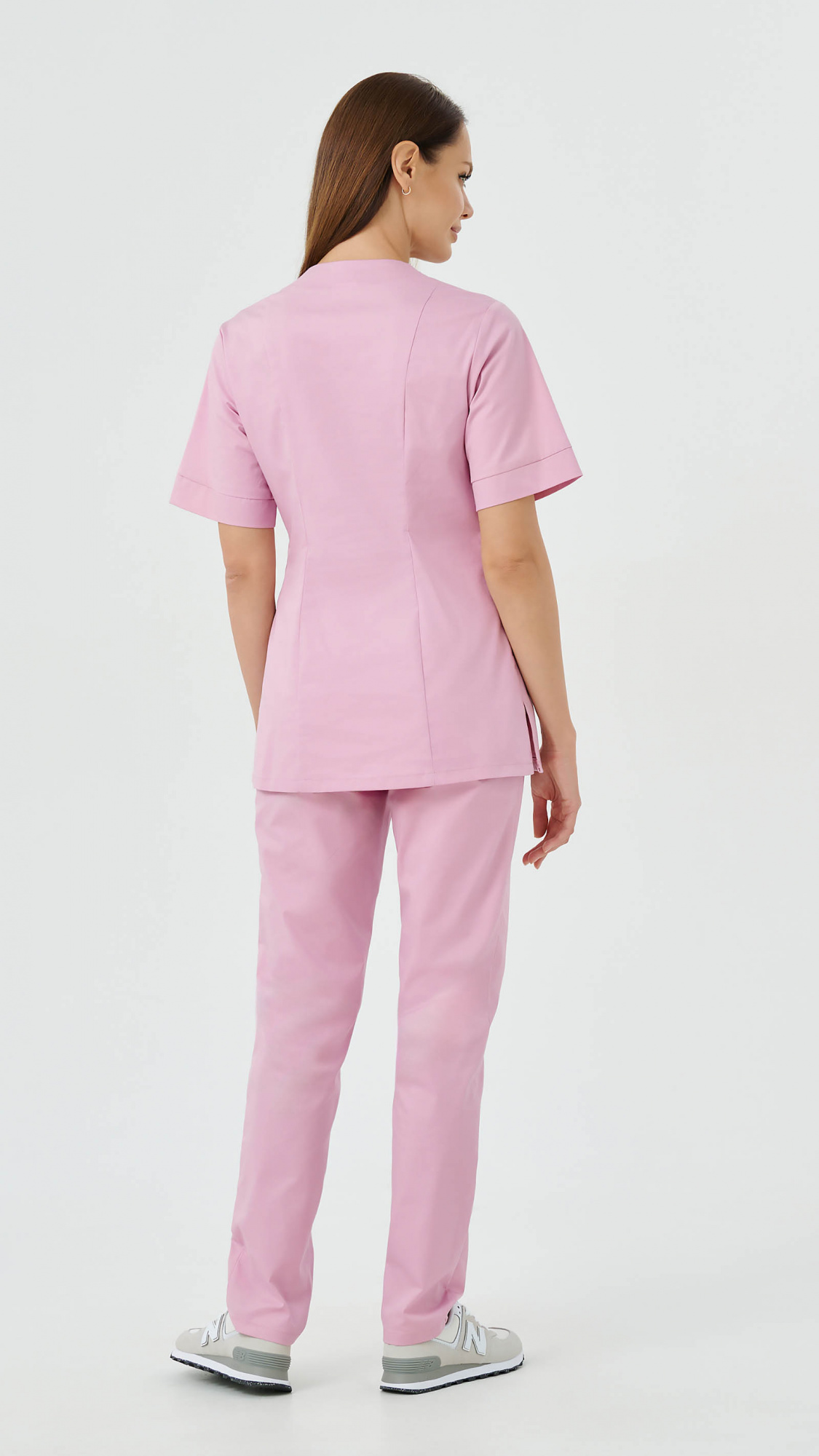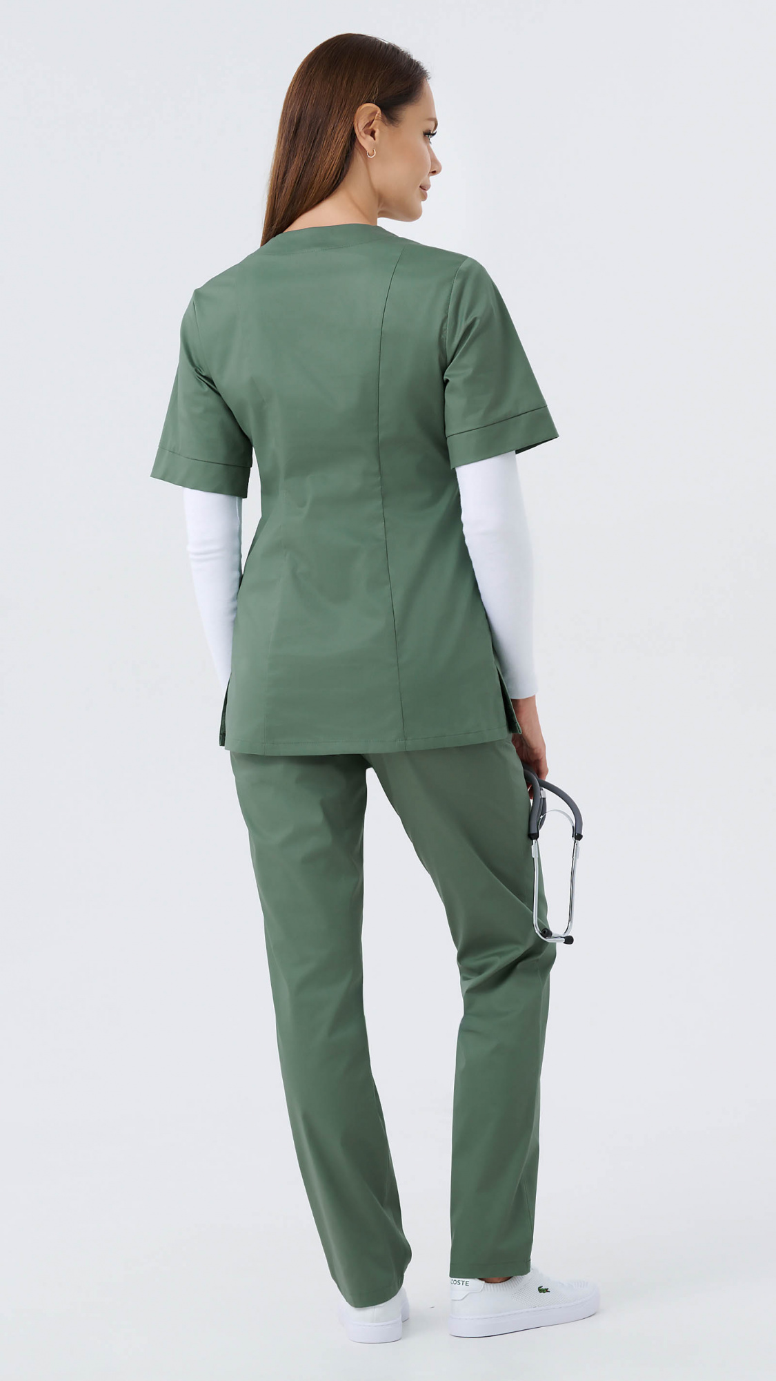 Костюм женский хирургический, состоит из блузы и брюк.Блуза полуприлегающего силуэта с V-образный вырезом горловины, с боковыми разрезами внизу.