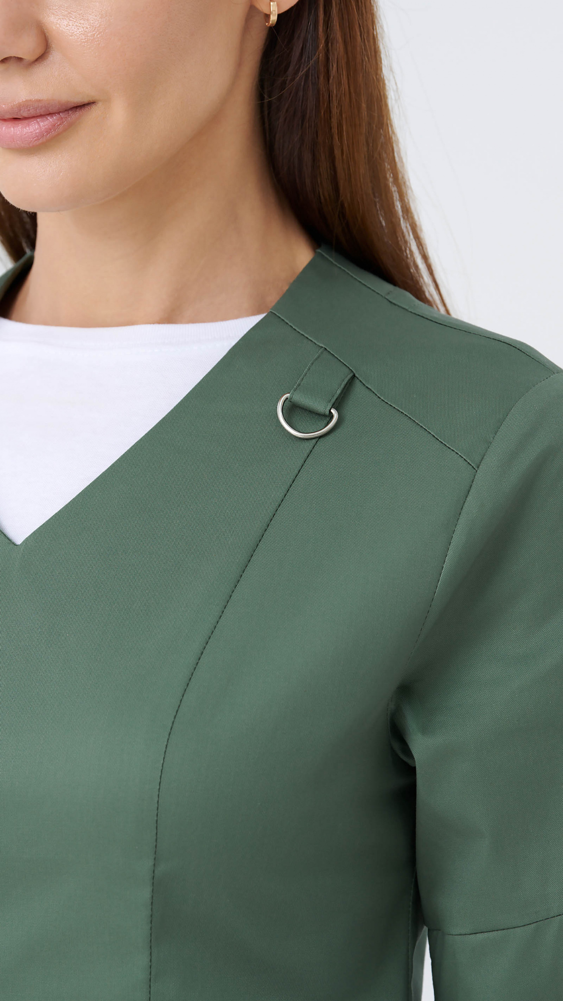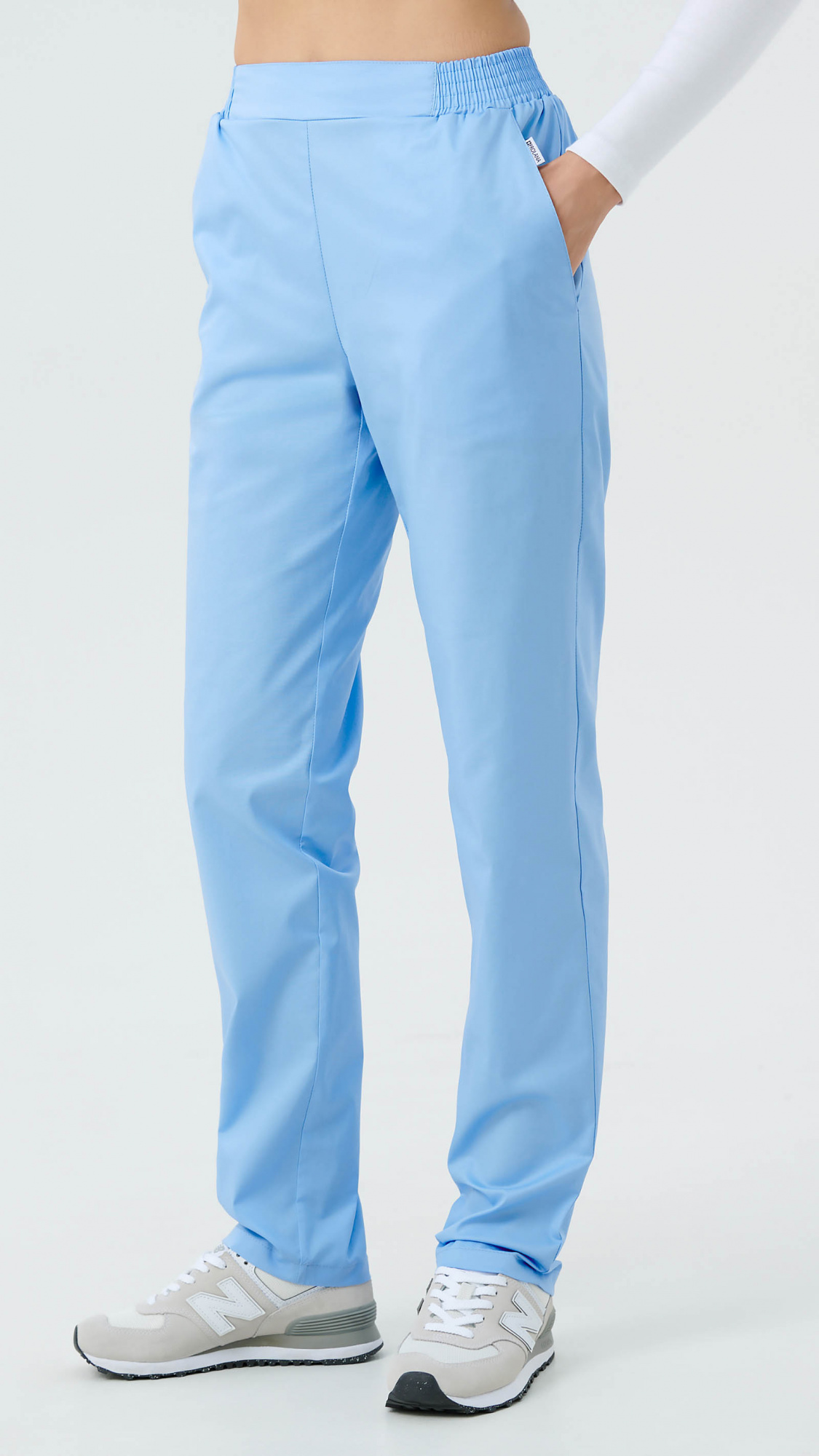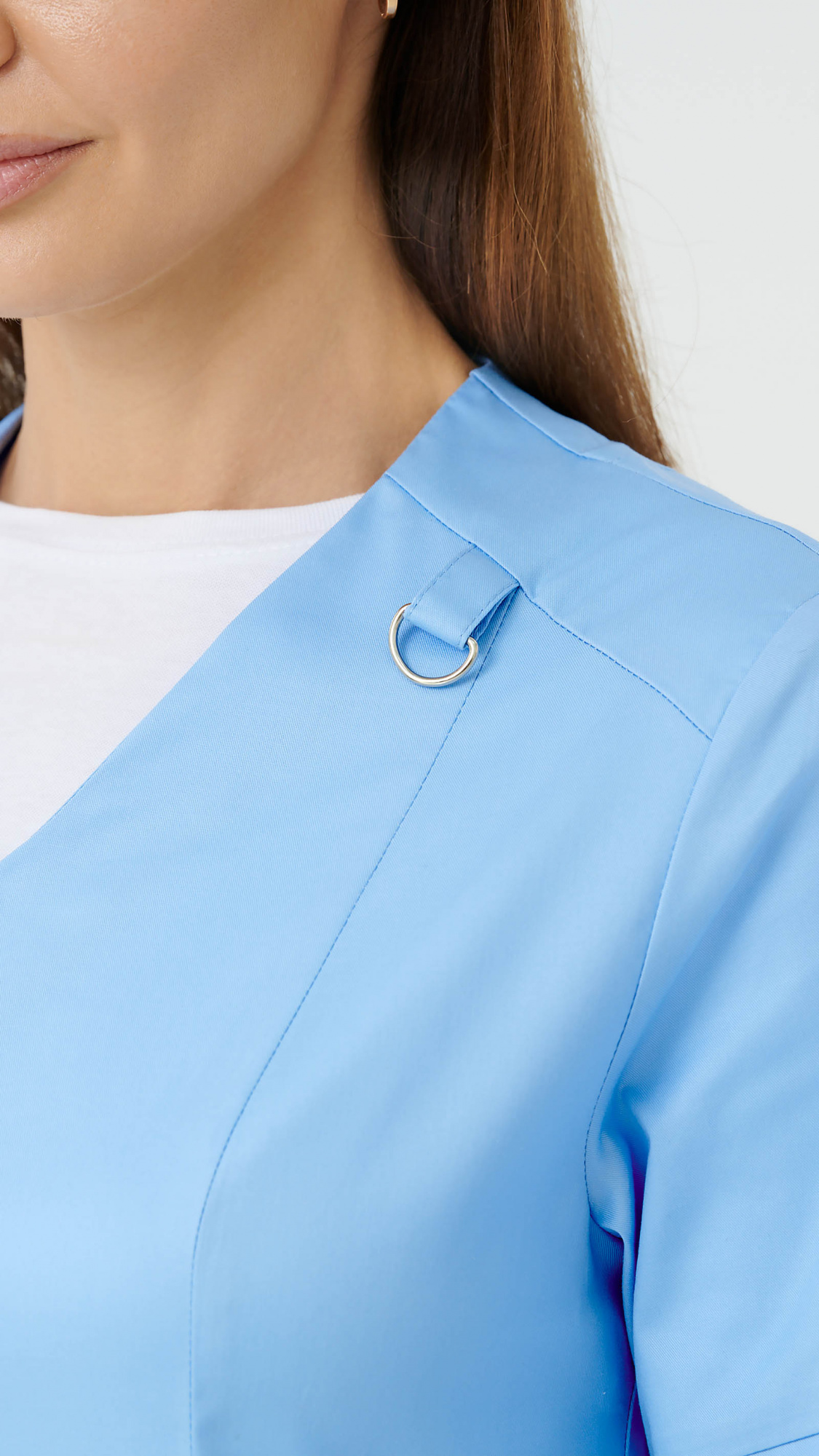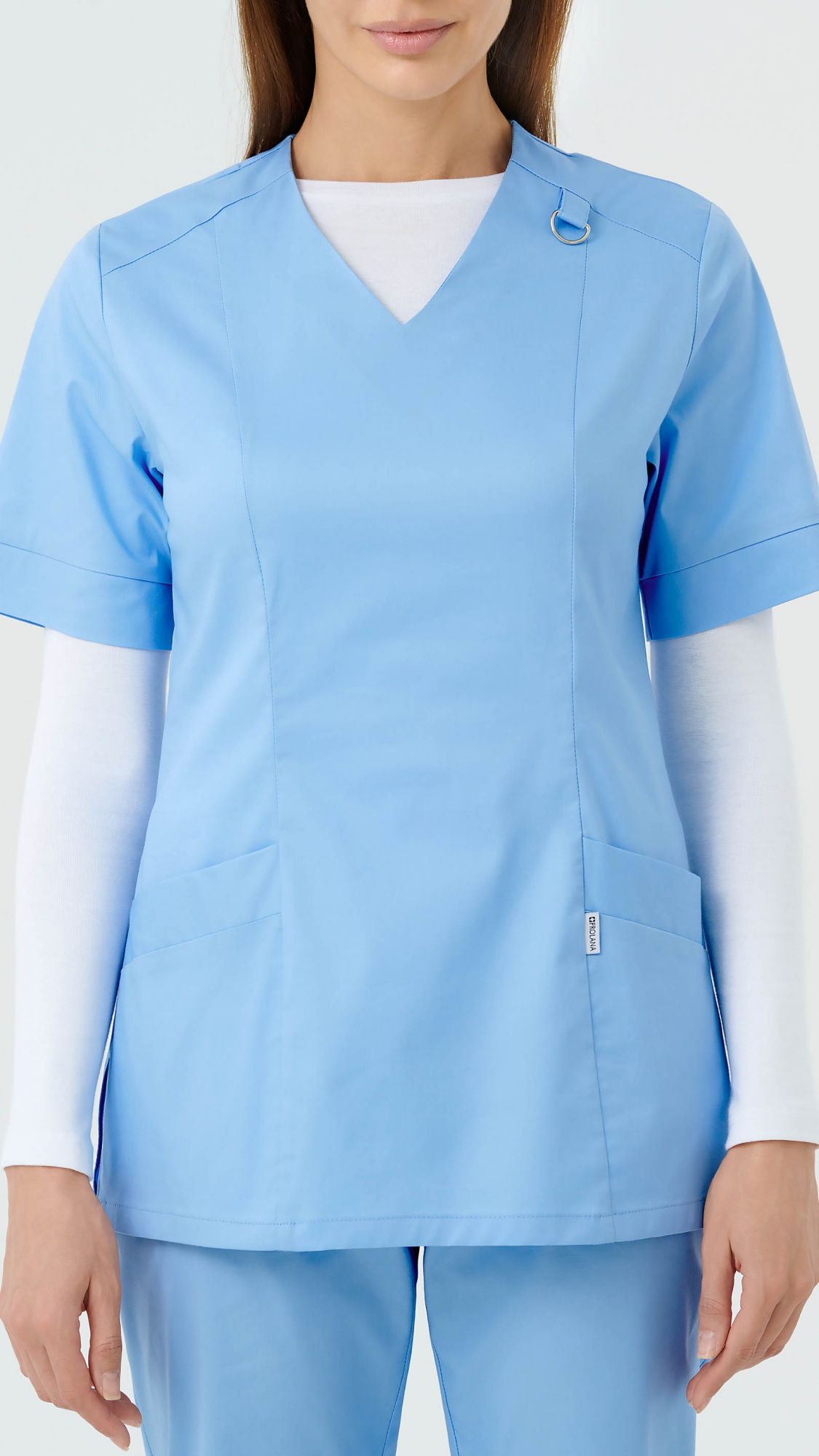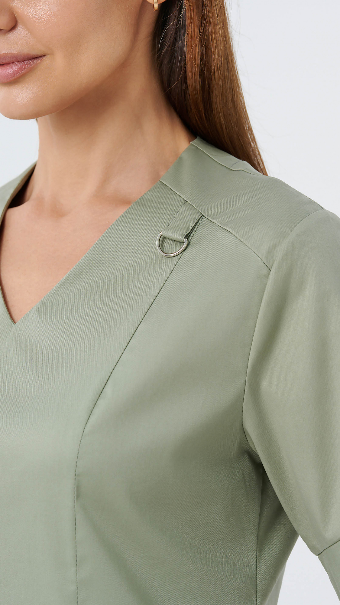 Костюм женский хирургический, состоит из блузы и брюк.Блуза полуприлегающего силуэта с V-образный вырезом горловины, с боковыми разрезами внизу.