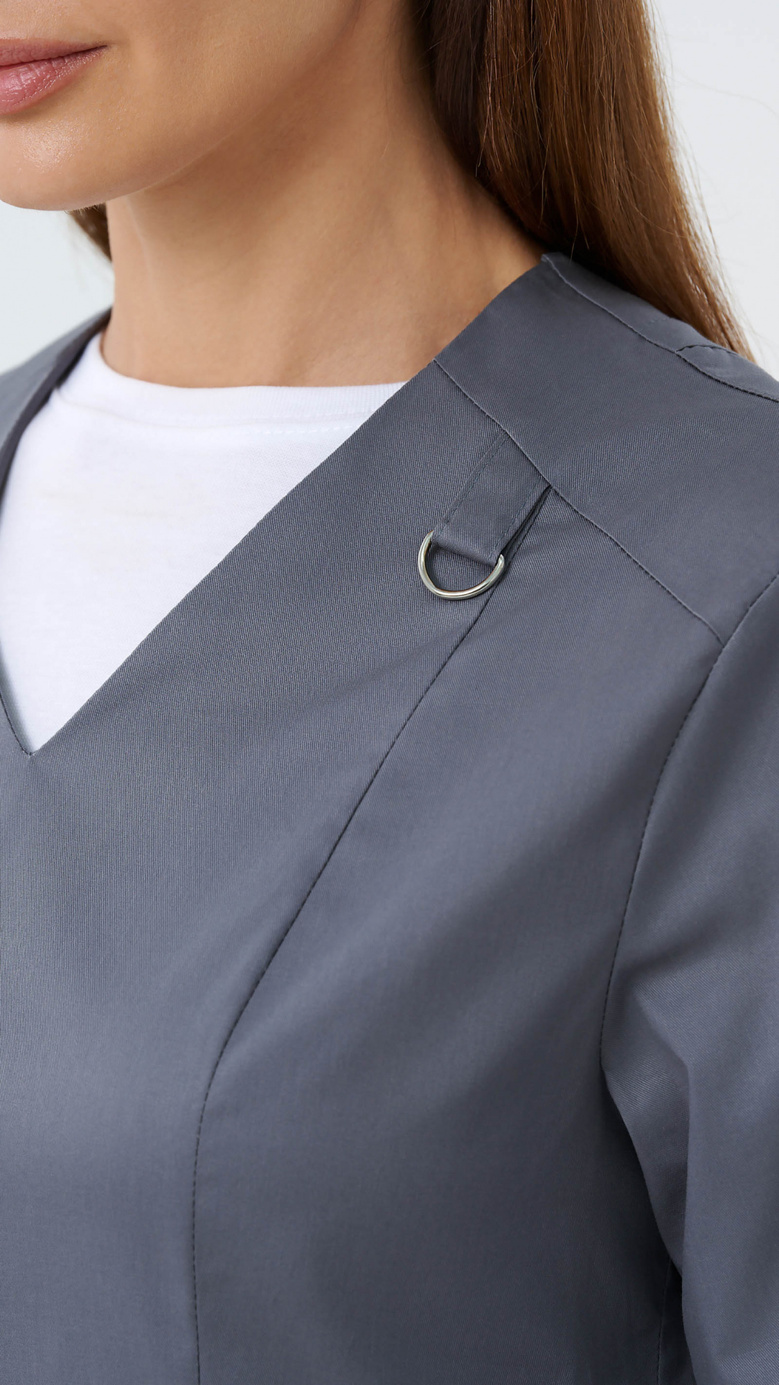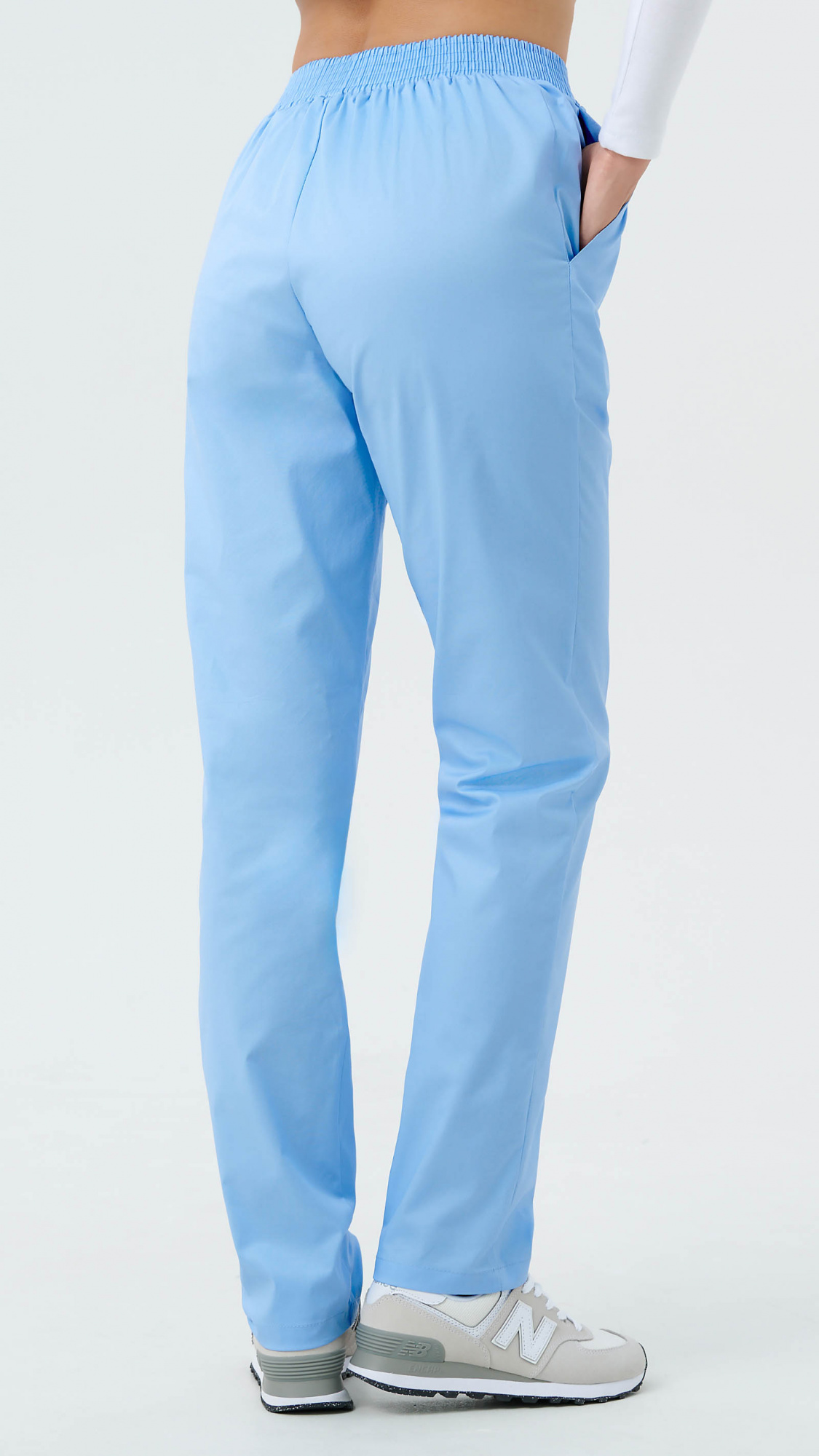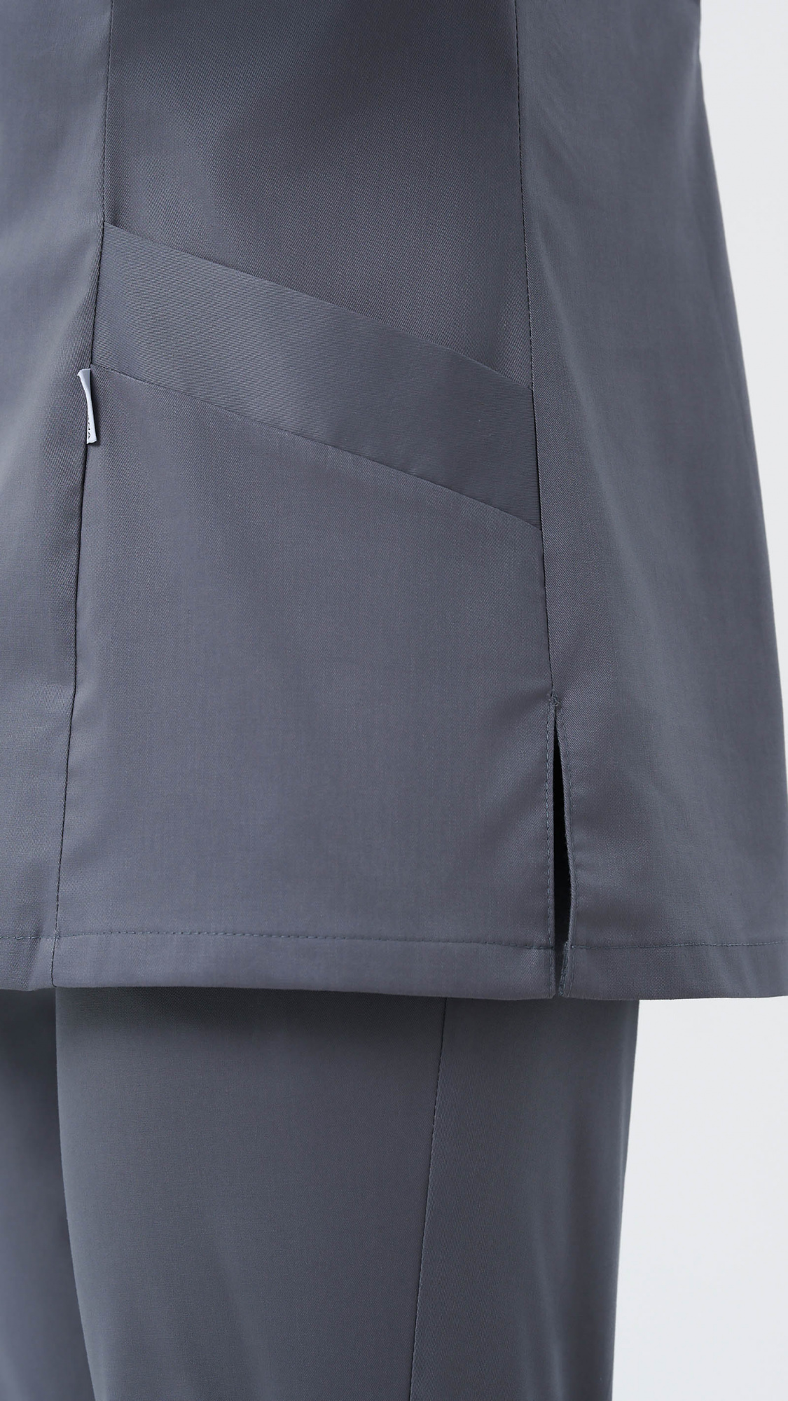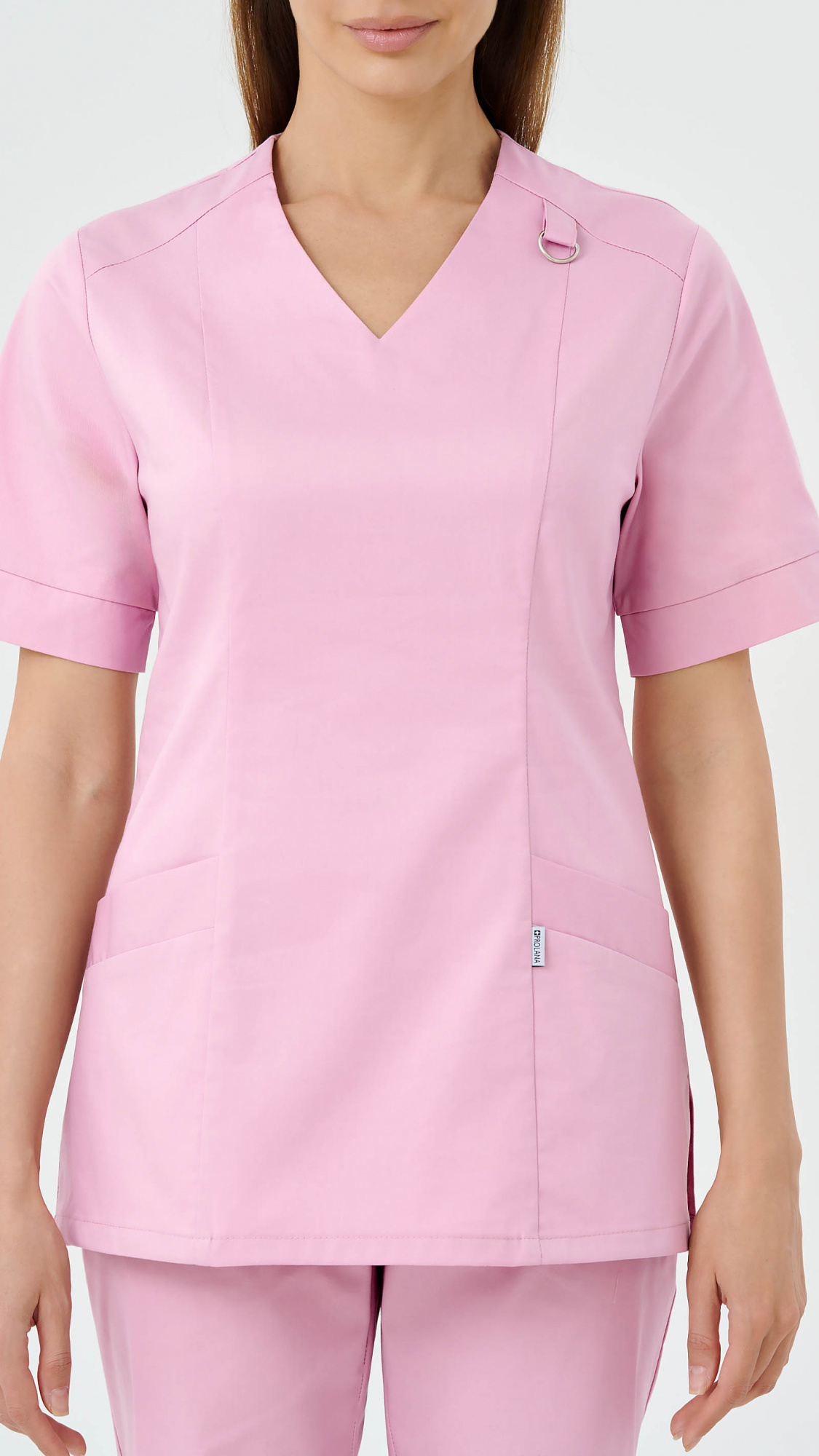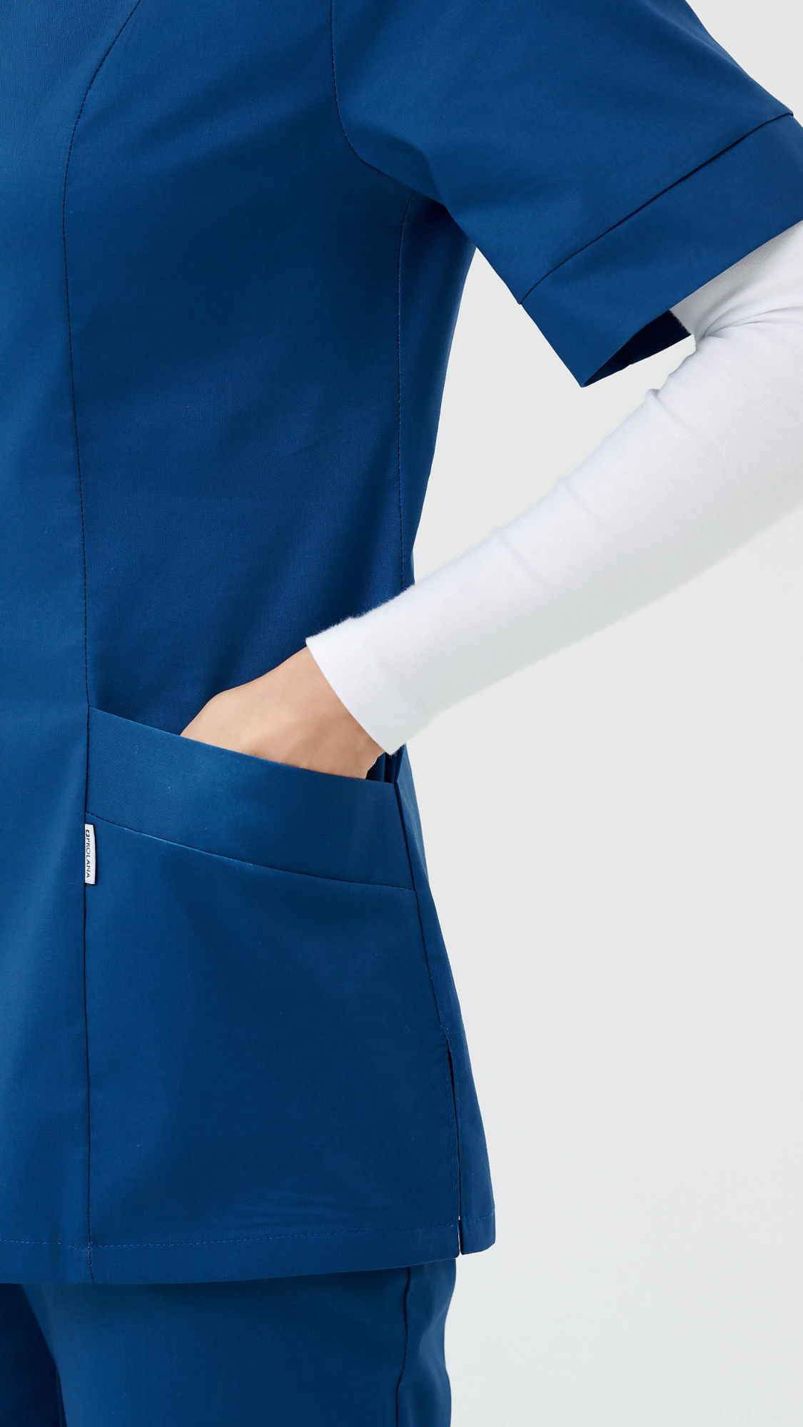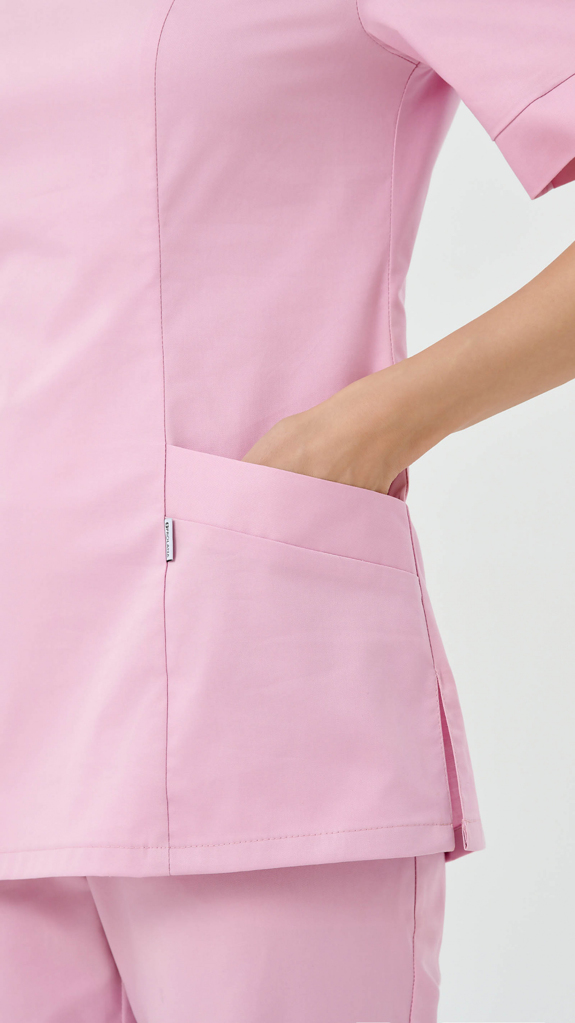 Костюм женский хирургический, состоит из блузы и брюк.Блуза полуприлегающего силуэта с V-образный вырезом горловины, с боковыми разрезами внизу.