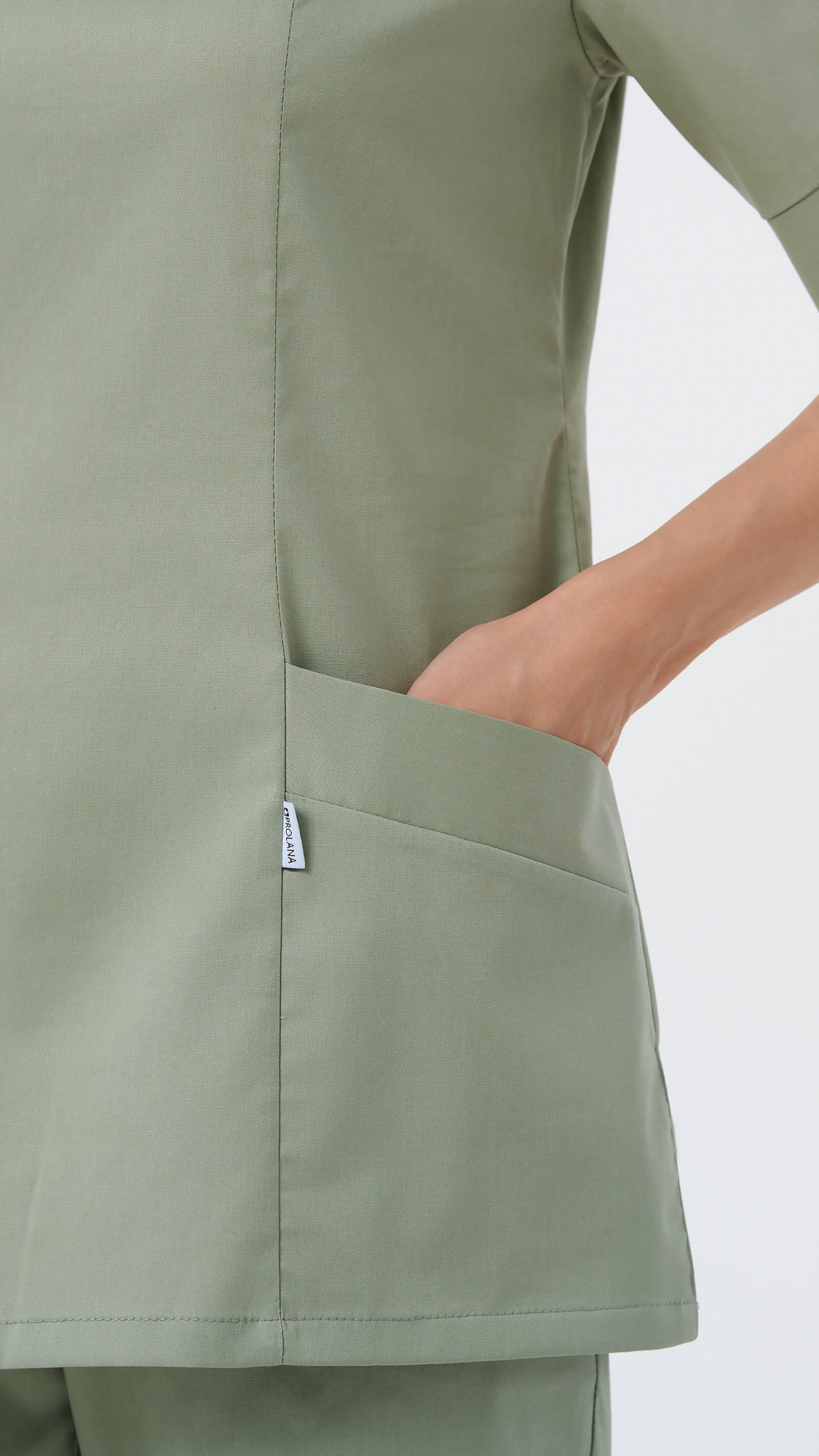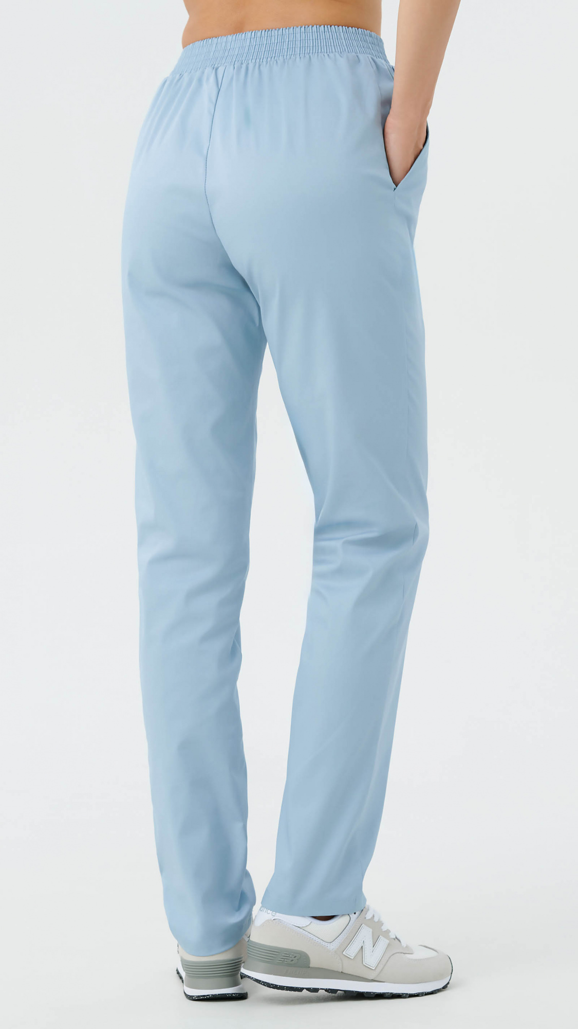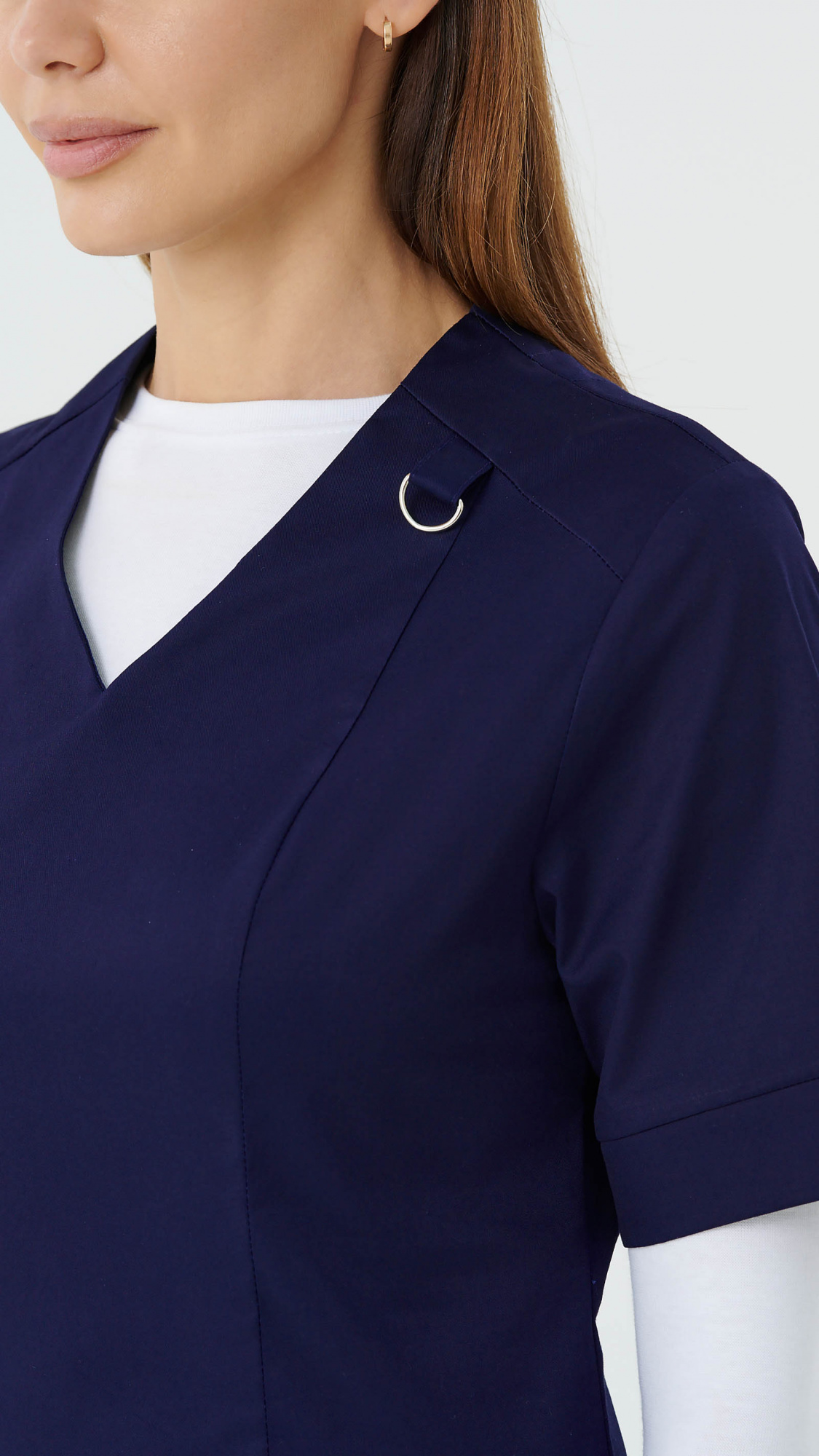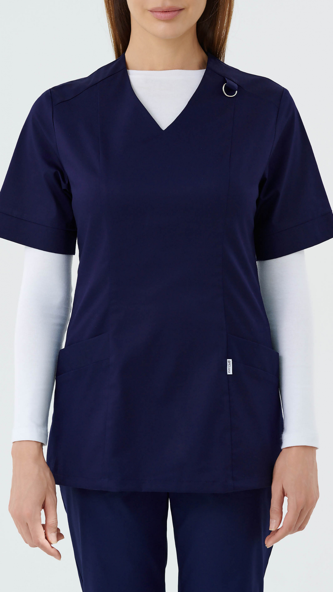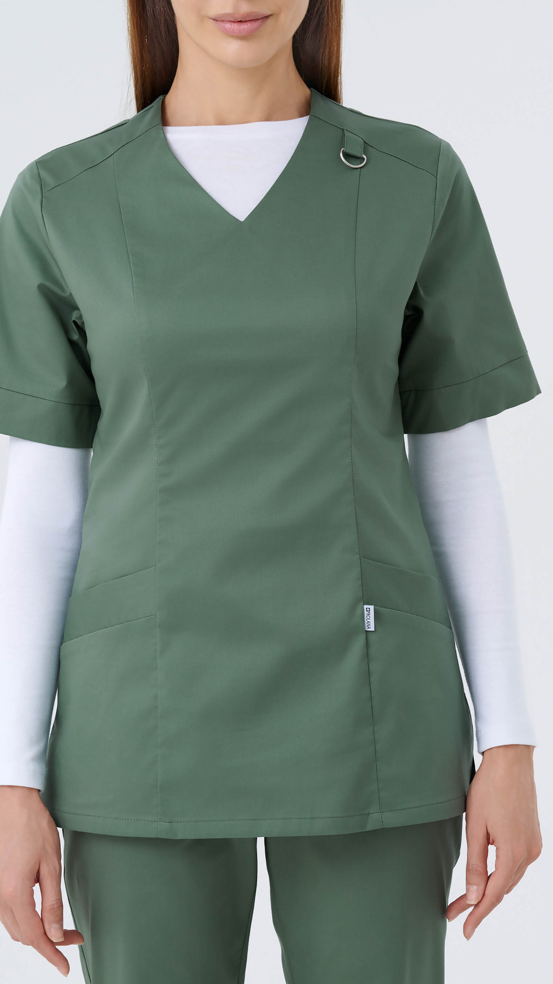 Костюм женский хирургический, состоит из блузы и брюк.Блуза полуприлегающего силуэта с V-образный вырезом горловины, с боковыми разрезами внизу.