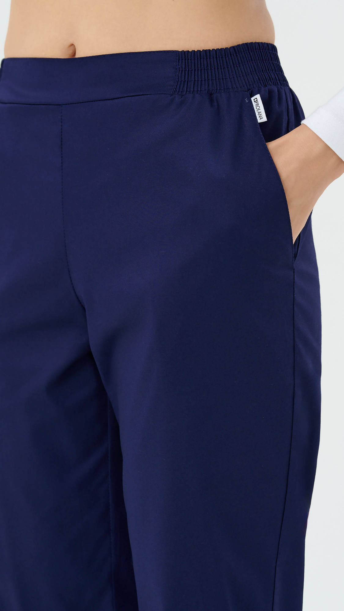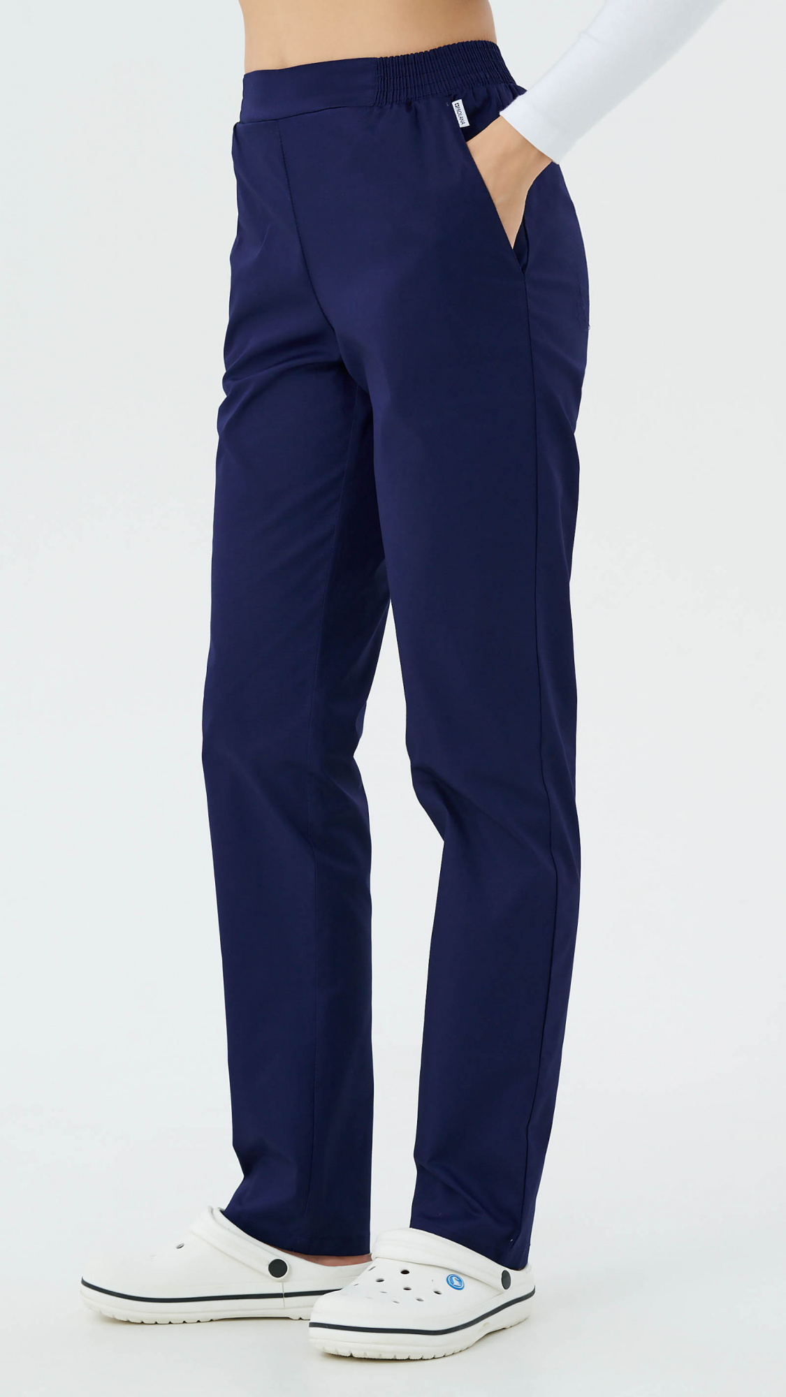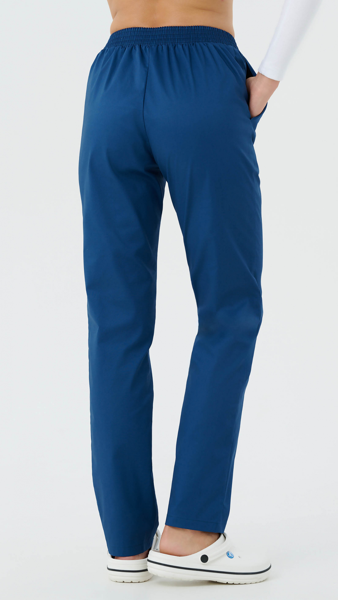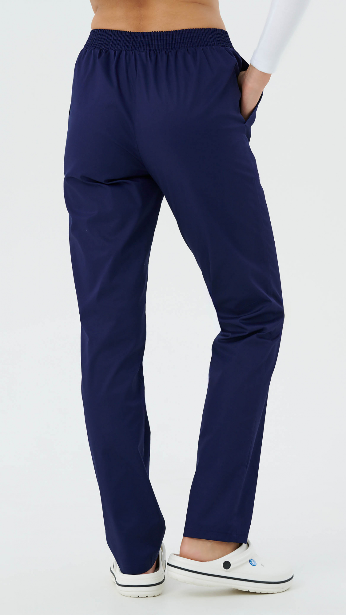 Брюки с отрезным поясом, состоящим из двух частей. Центральная часть пояса передних половинок брюк без эластичной ленты, вторая часть стянута эластичной лентой. Передние половинки брюк с боковыми карманами с наклонным входом с отрезными бочками. Низ брюк обработан швом вподгибки с закрытым срезом.