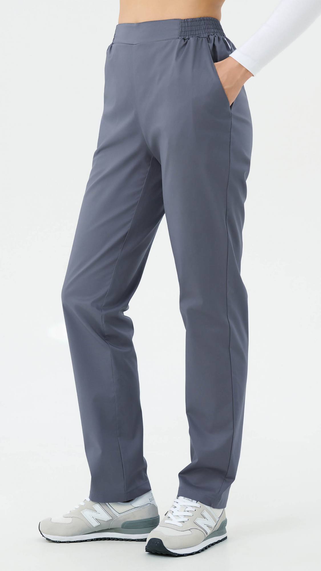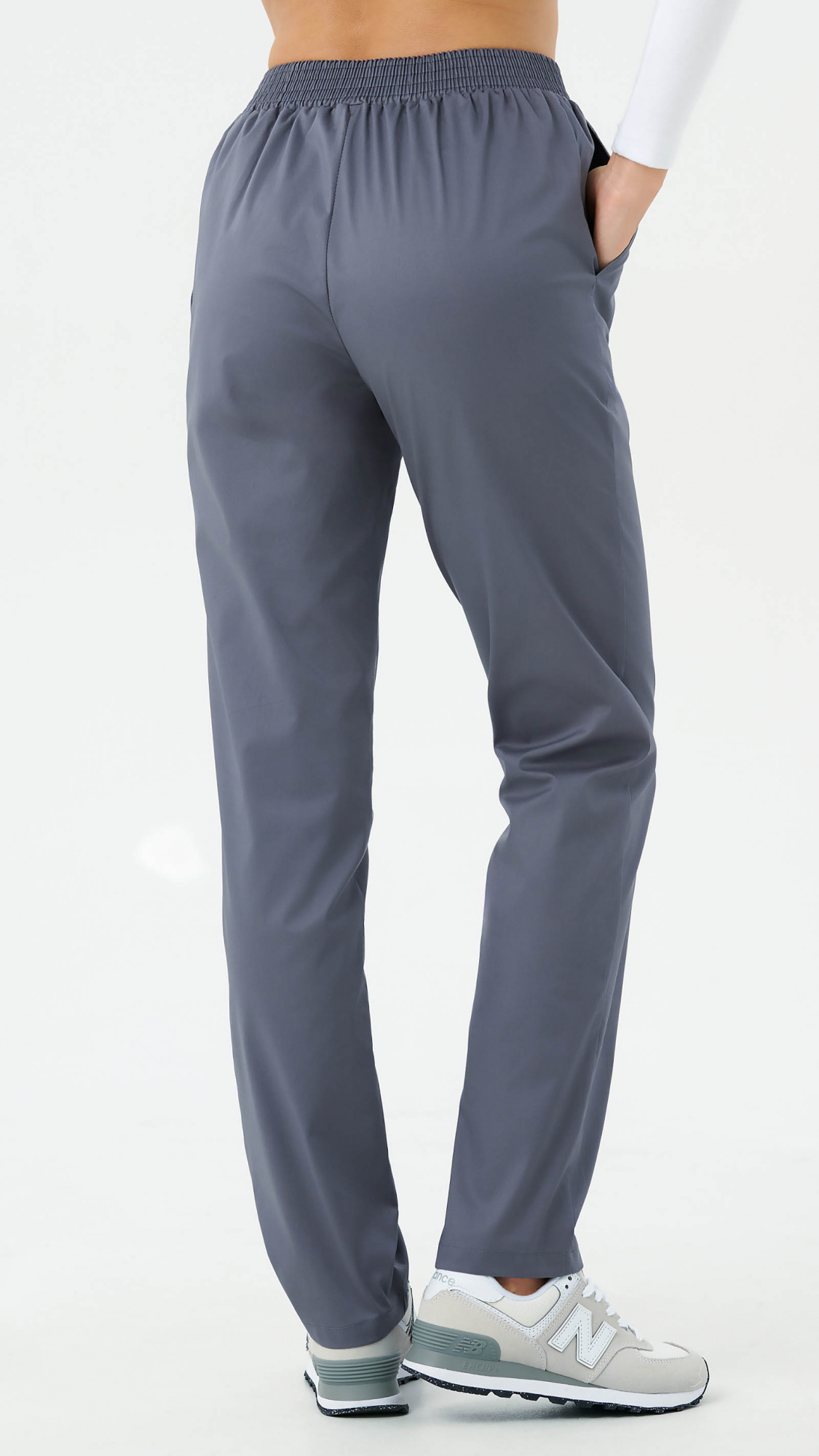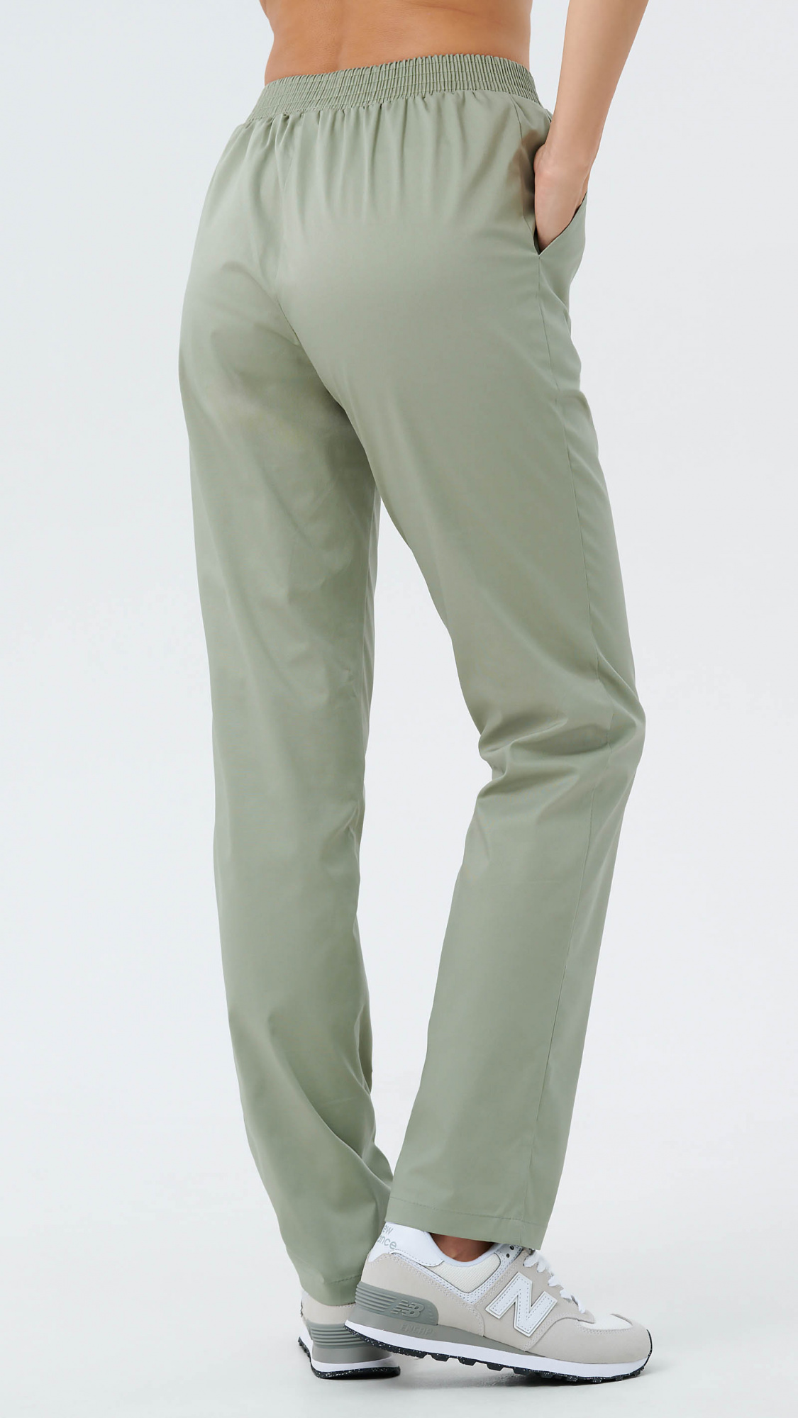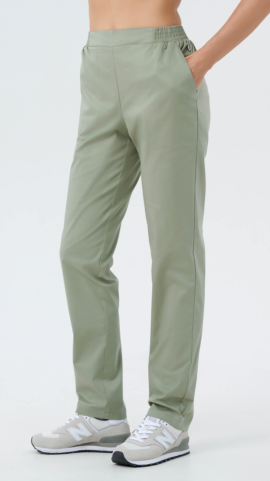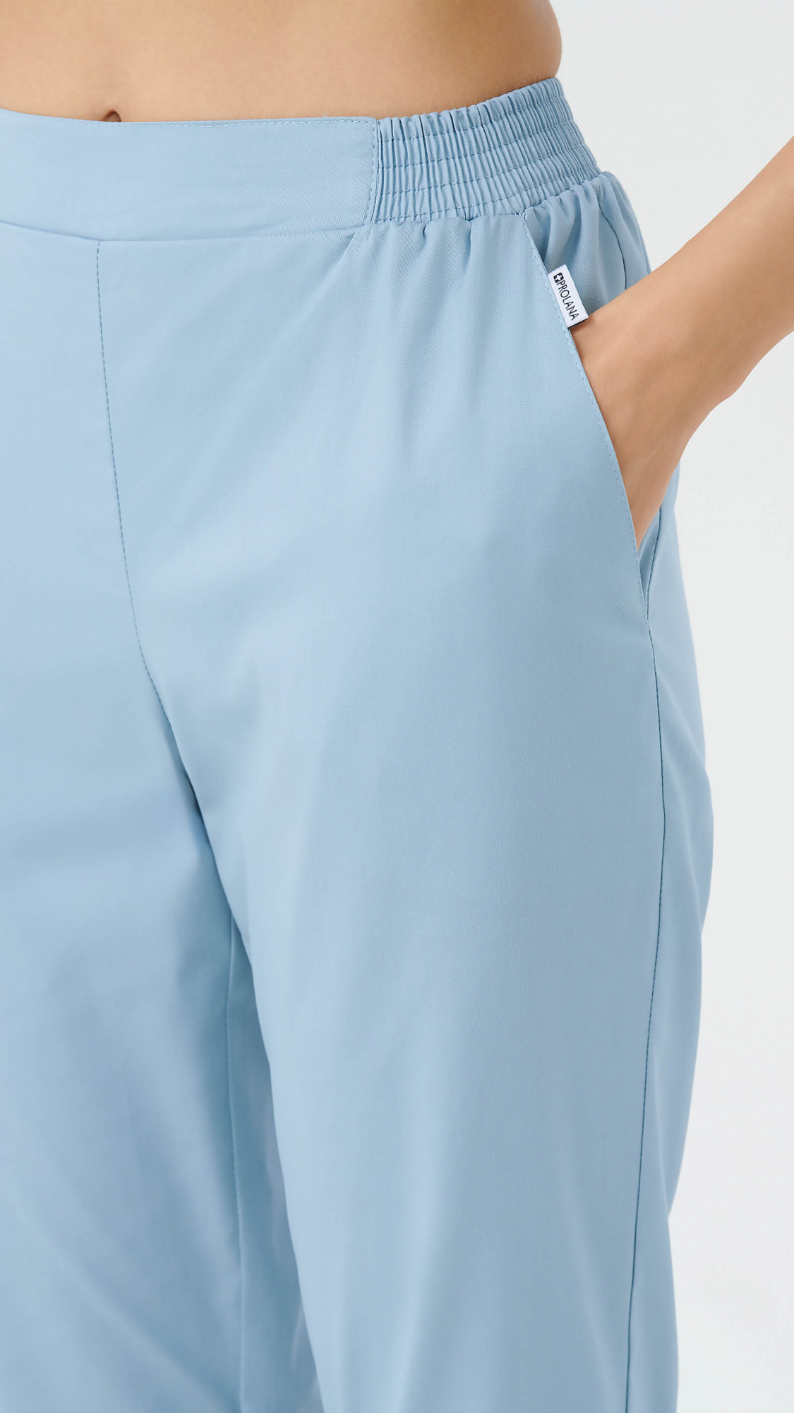 Брюки с отрезным поясом, состоящим из двух частей. Центральная часть пояса передних половинок брюк без эластичной ленты, вторая часть стянута эластичной лентой. Передние половинки брюк с боковыми карманами с наклонным входом с отрезными бочками. Низ брюк обработан швом вподгибки с закрытым срезом.