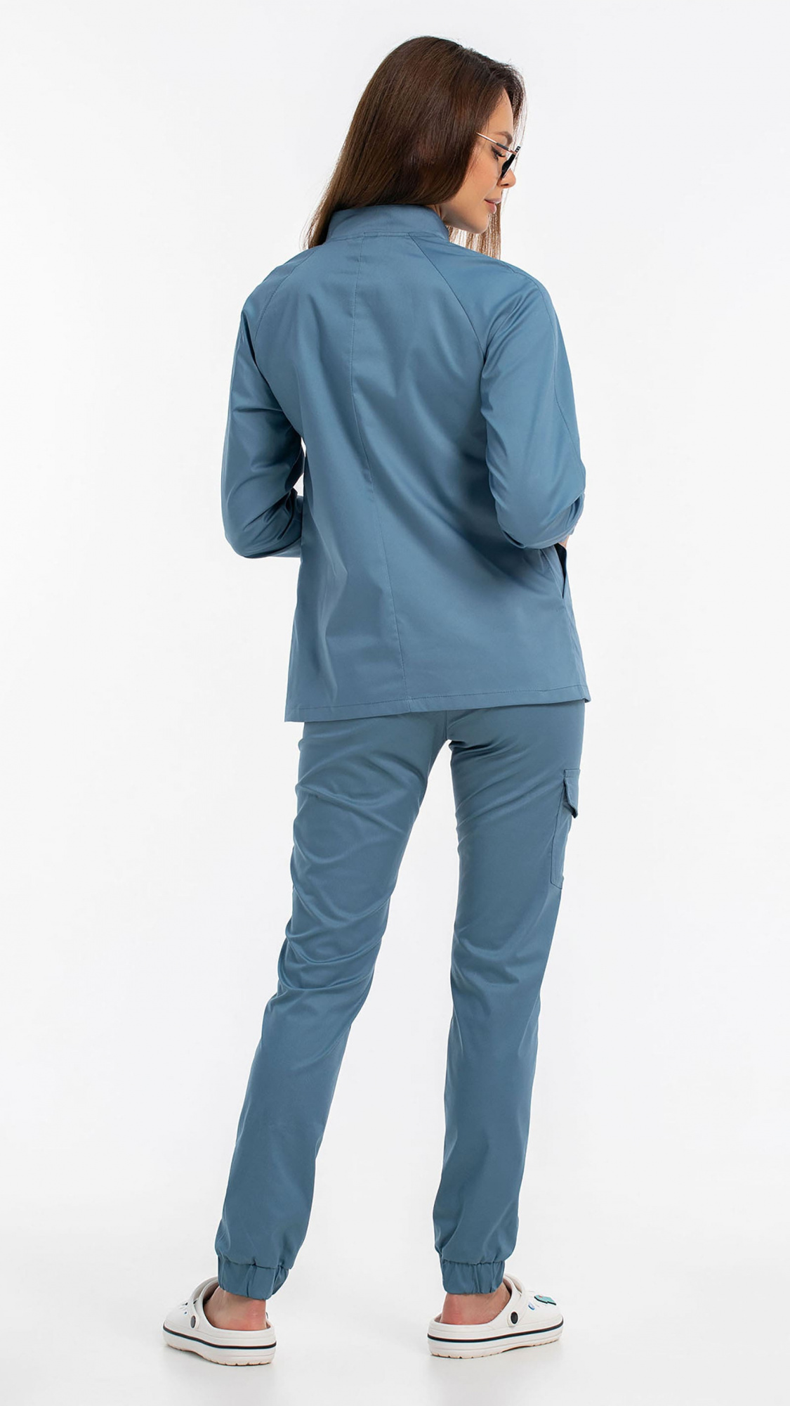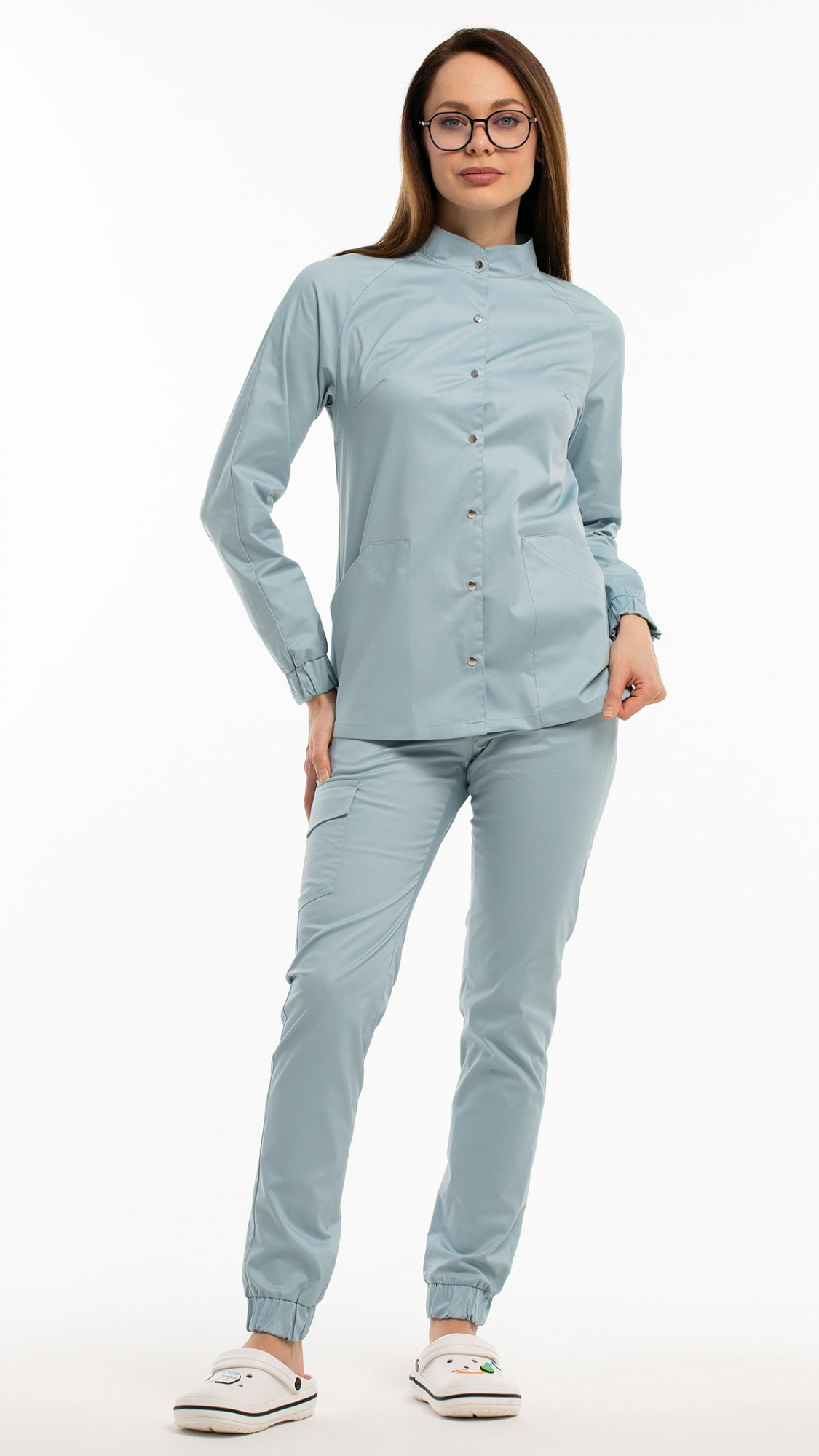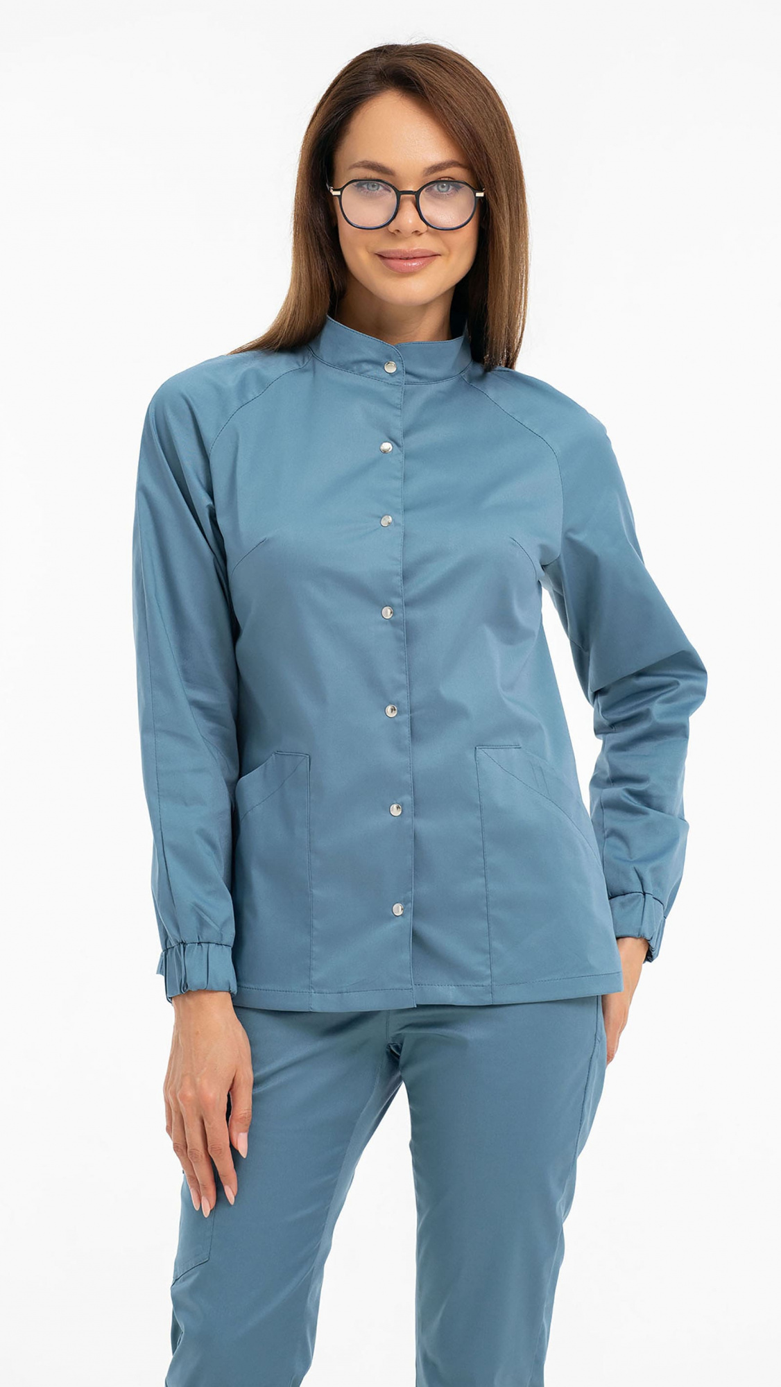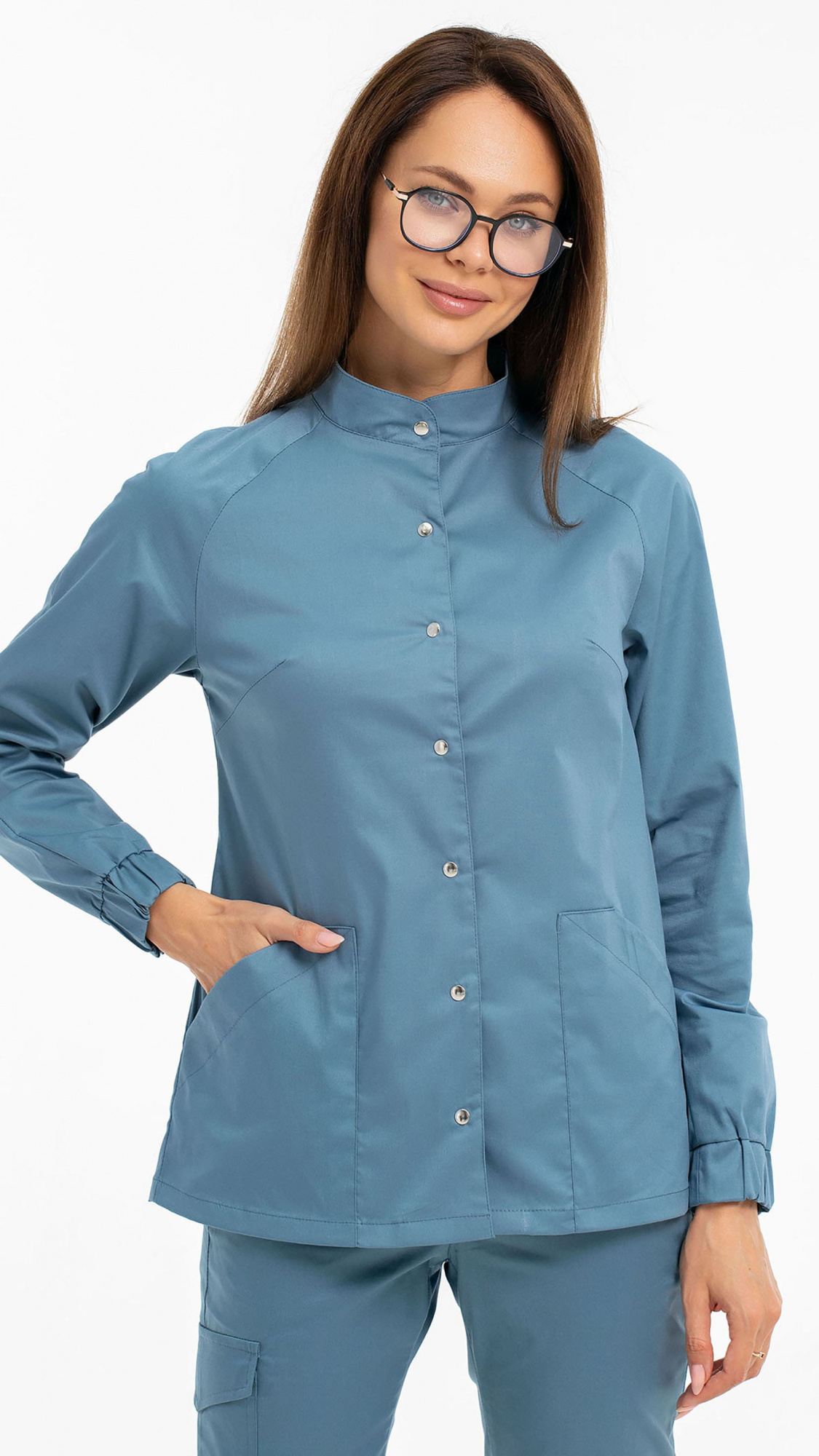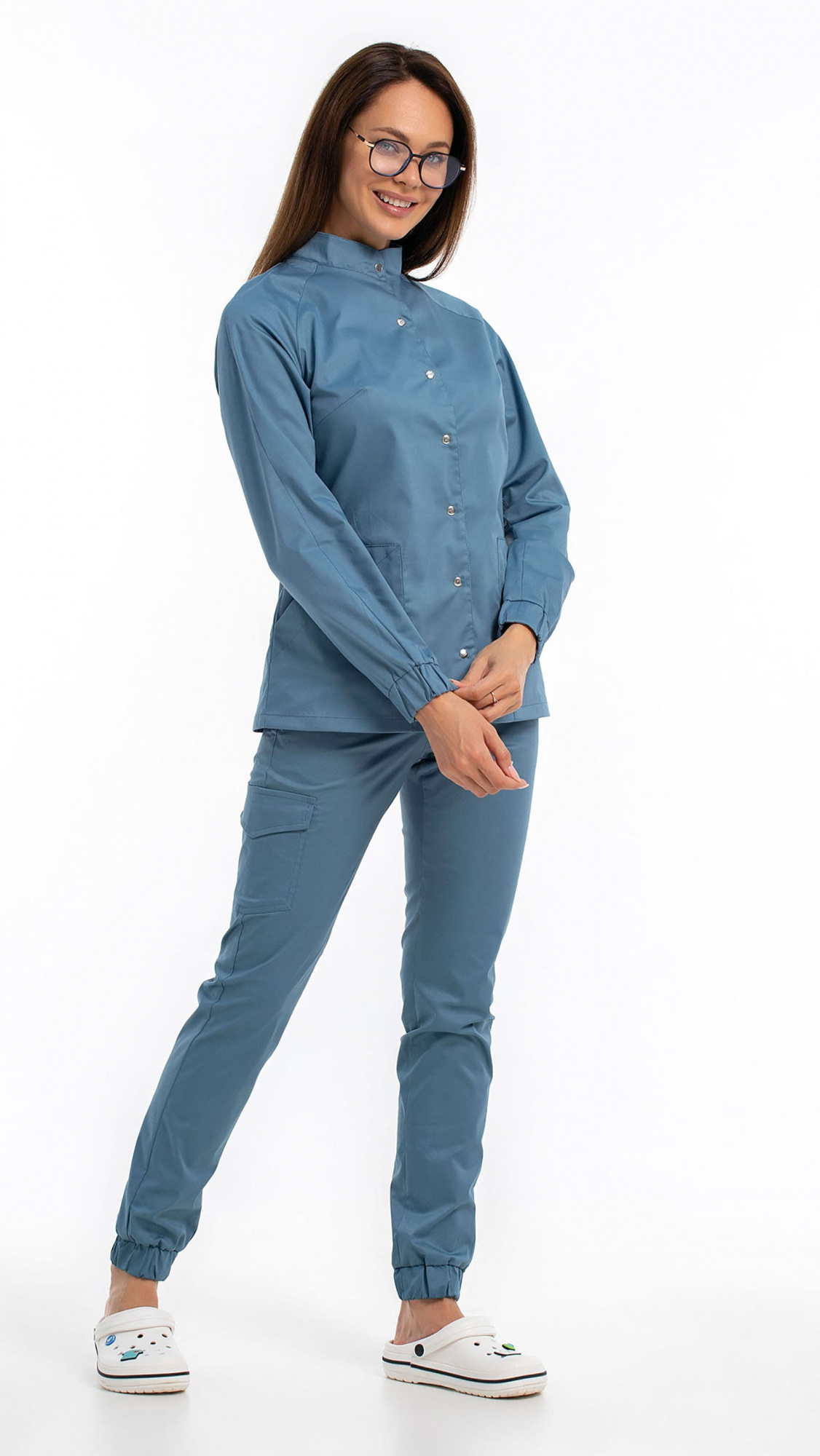 Костюм медицинский женский состоит из блузы и брюк.Блуза женская полуприлегающего силуэта с центральной бортовой застежкой на 6 кнопок.