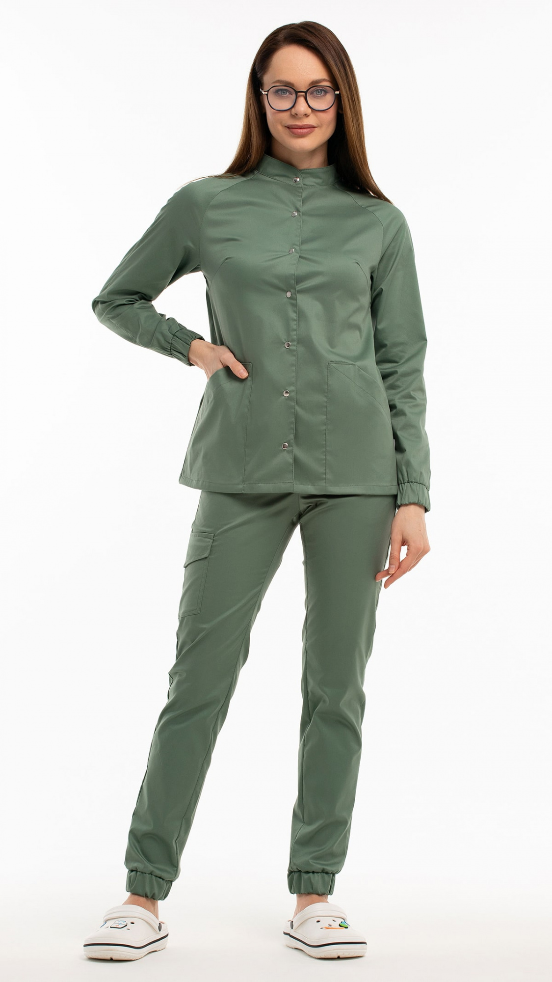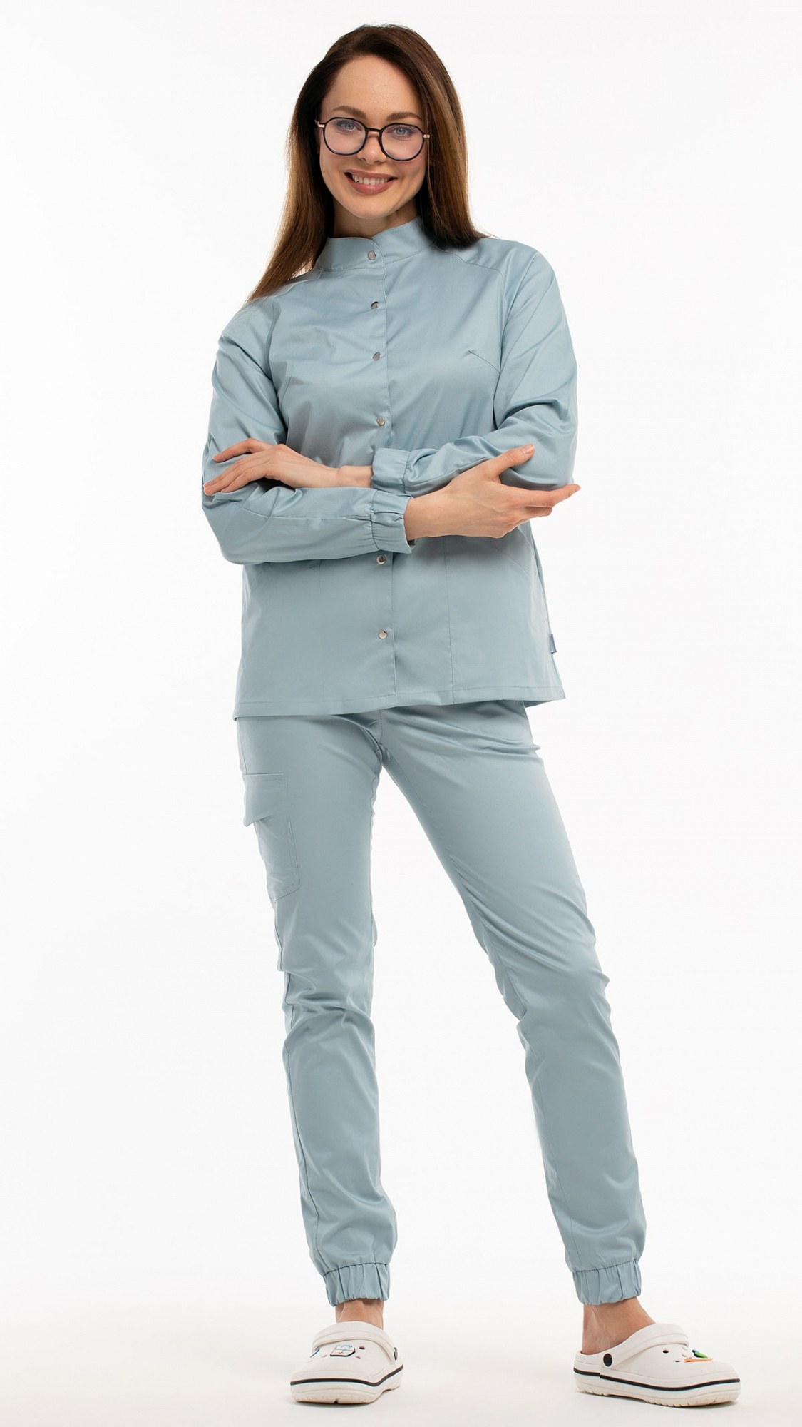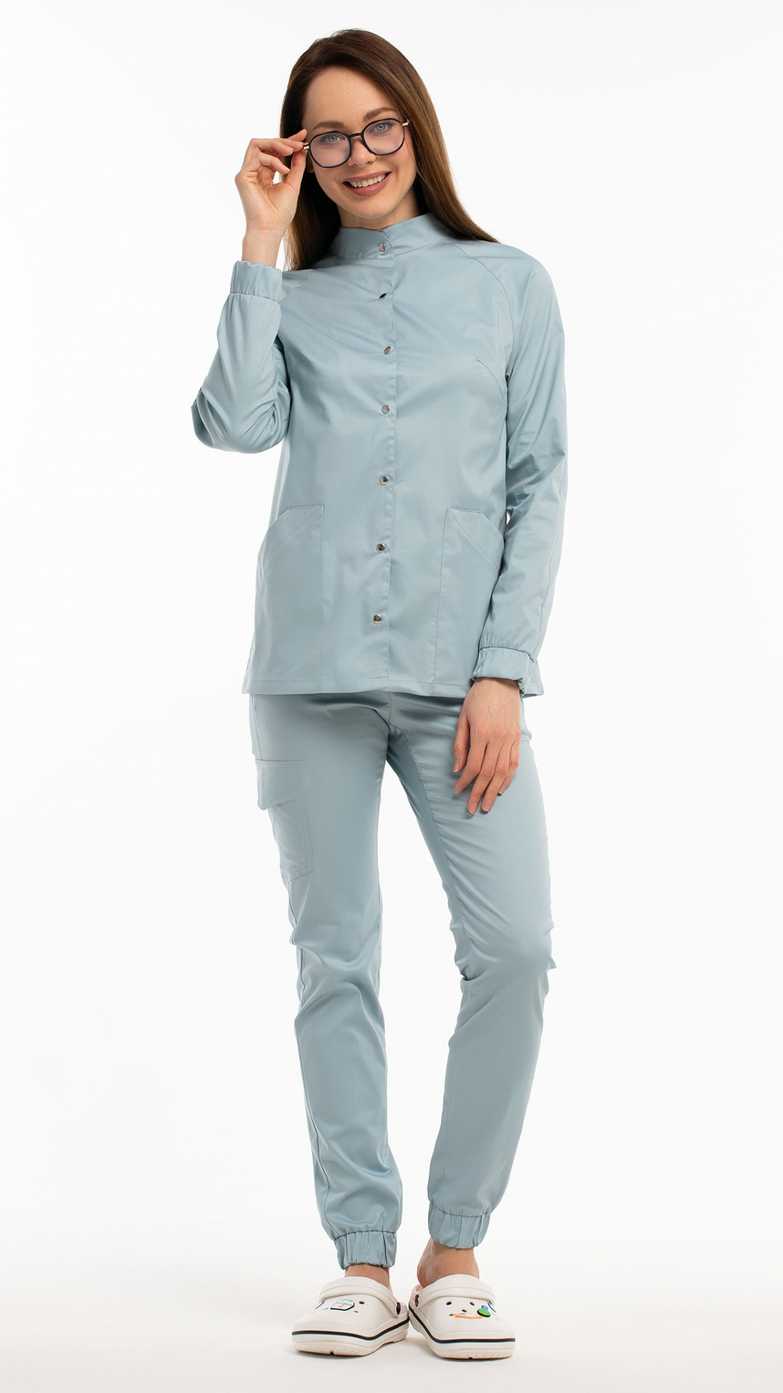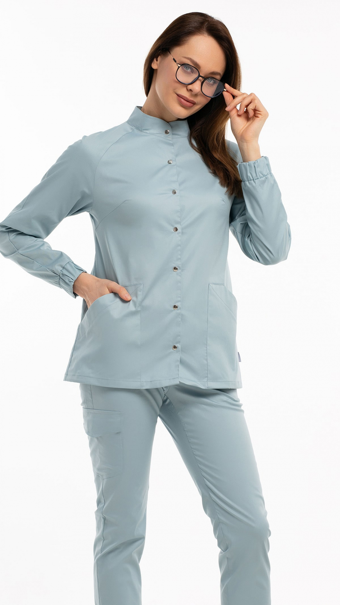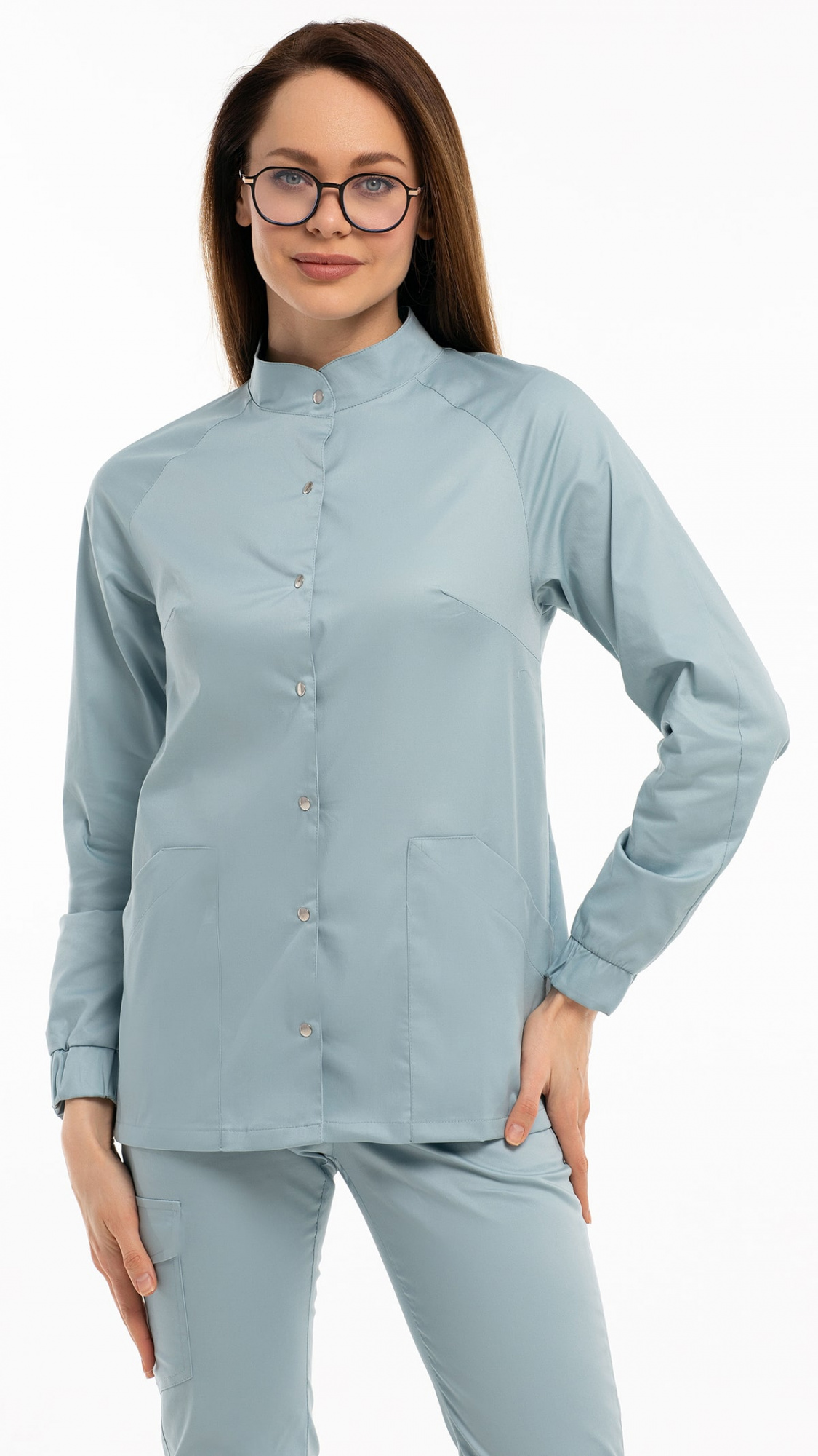 Костюм медицинский женский состоит из блузы и брюк.Блуза женская полуприлегающего силуэта с центральной бортовой застежкой на 6 кнопок.