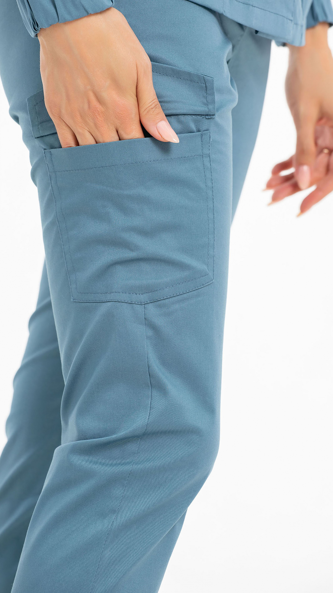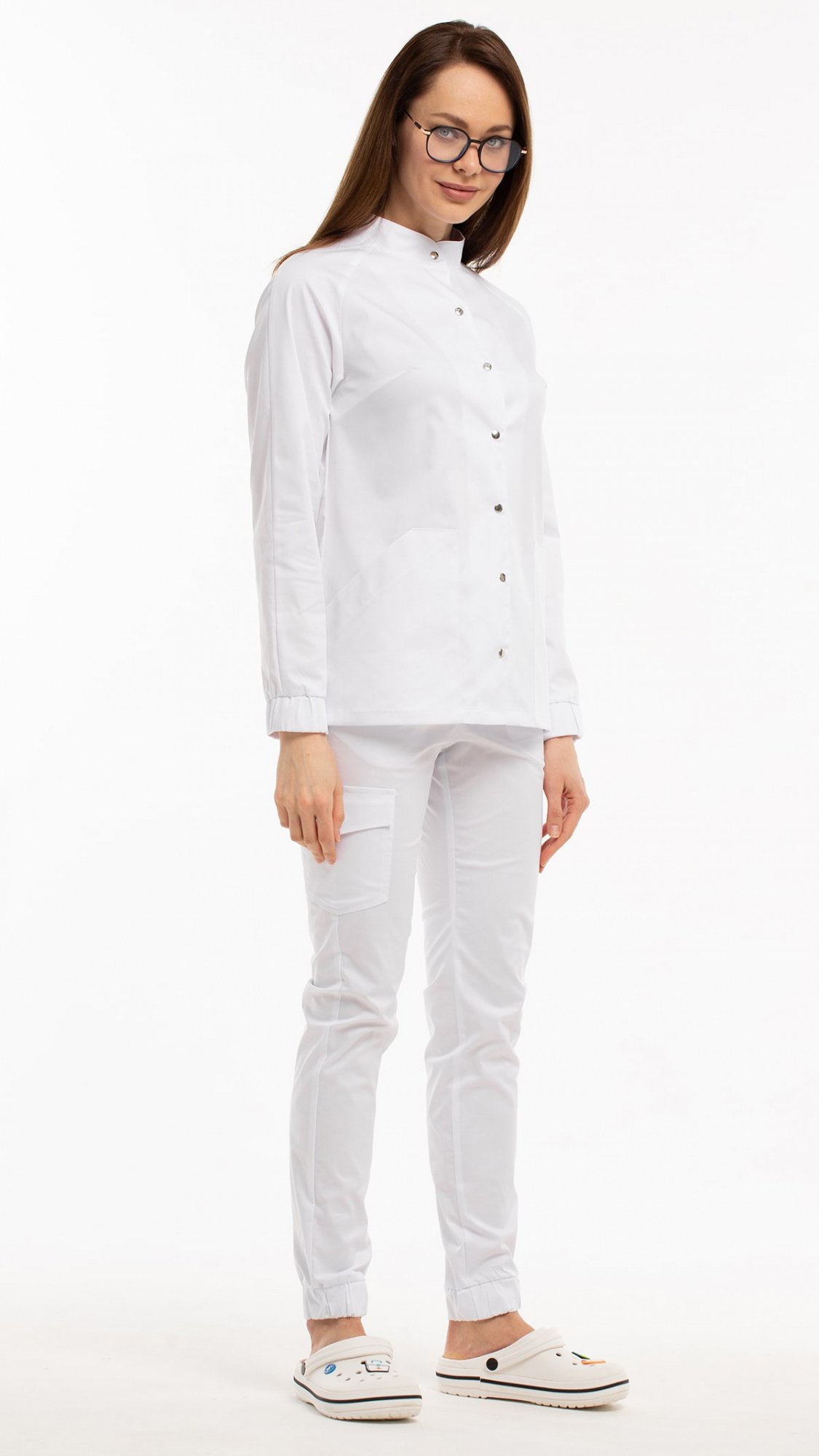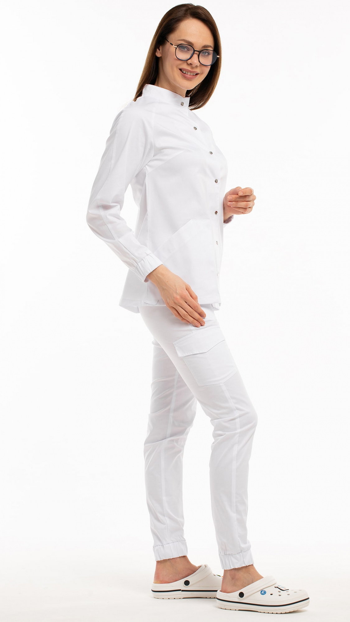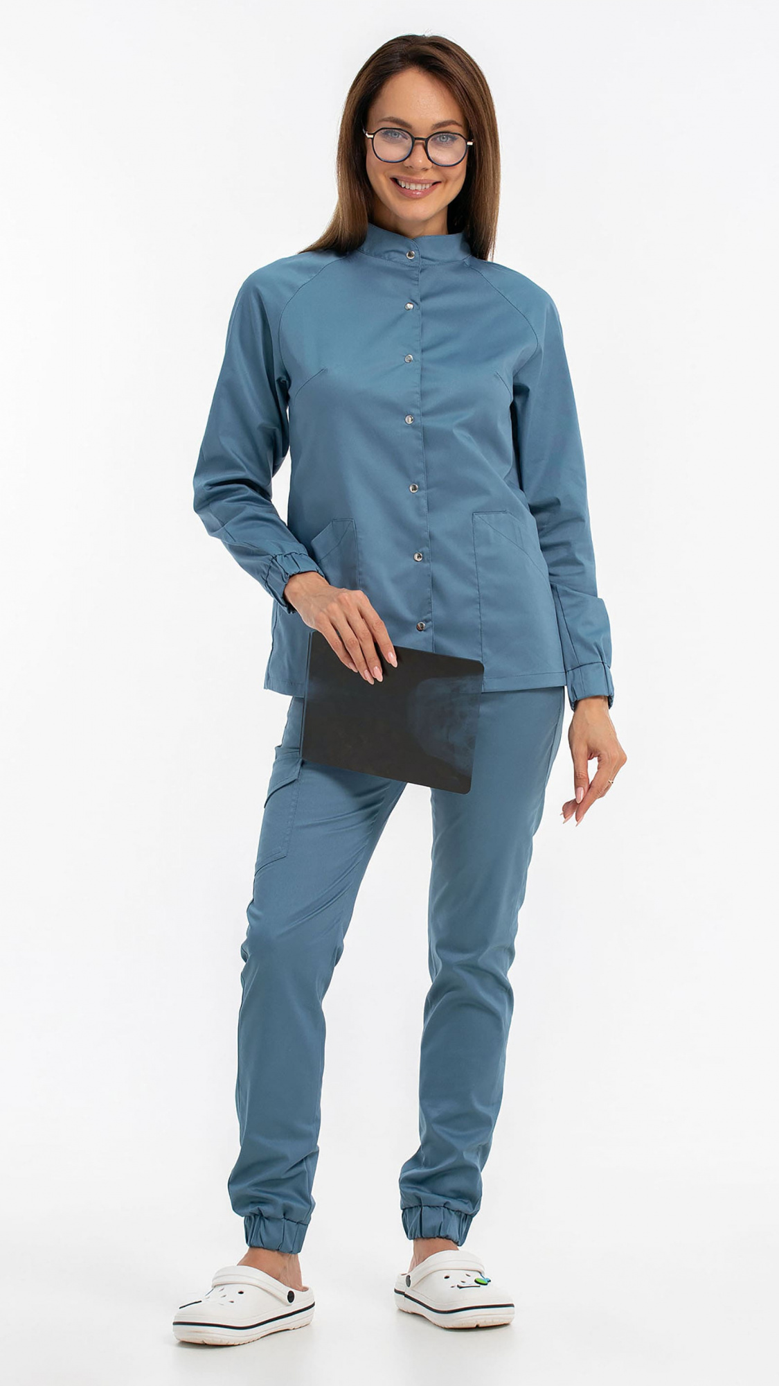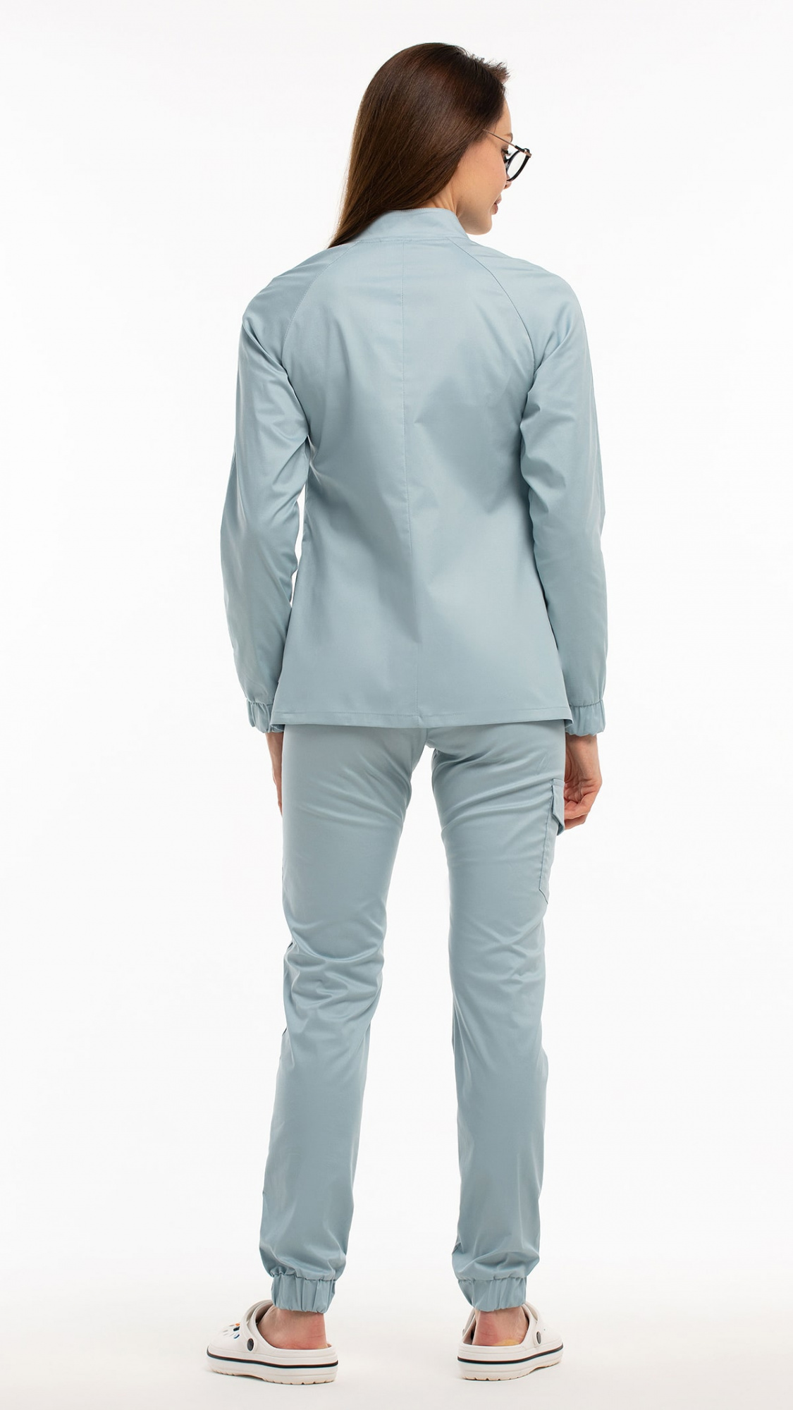 Костюм медицинский женский состоит из блузы и брюк.Блуза женская полуприлегающего силуэта с центральной бортовой застежкой на 6 кнопок.