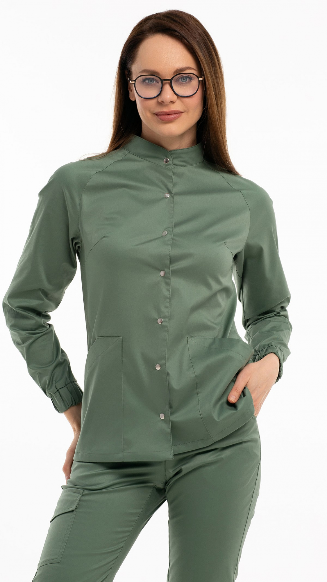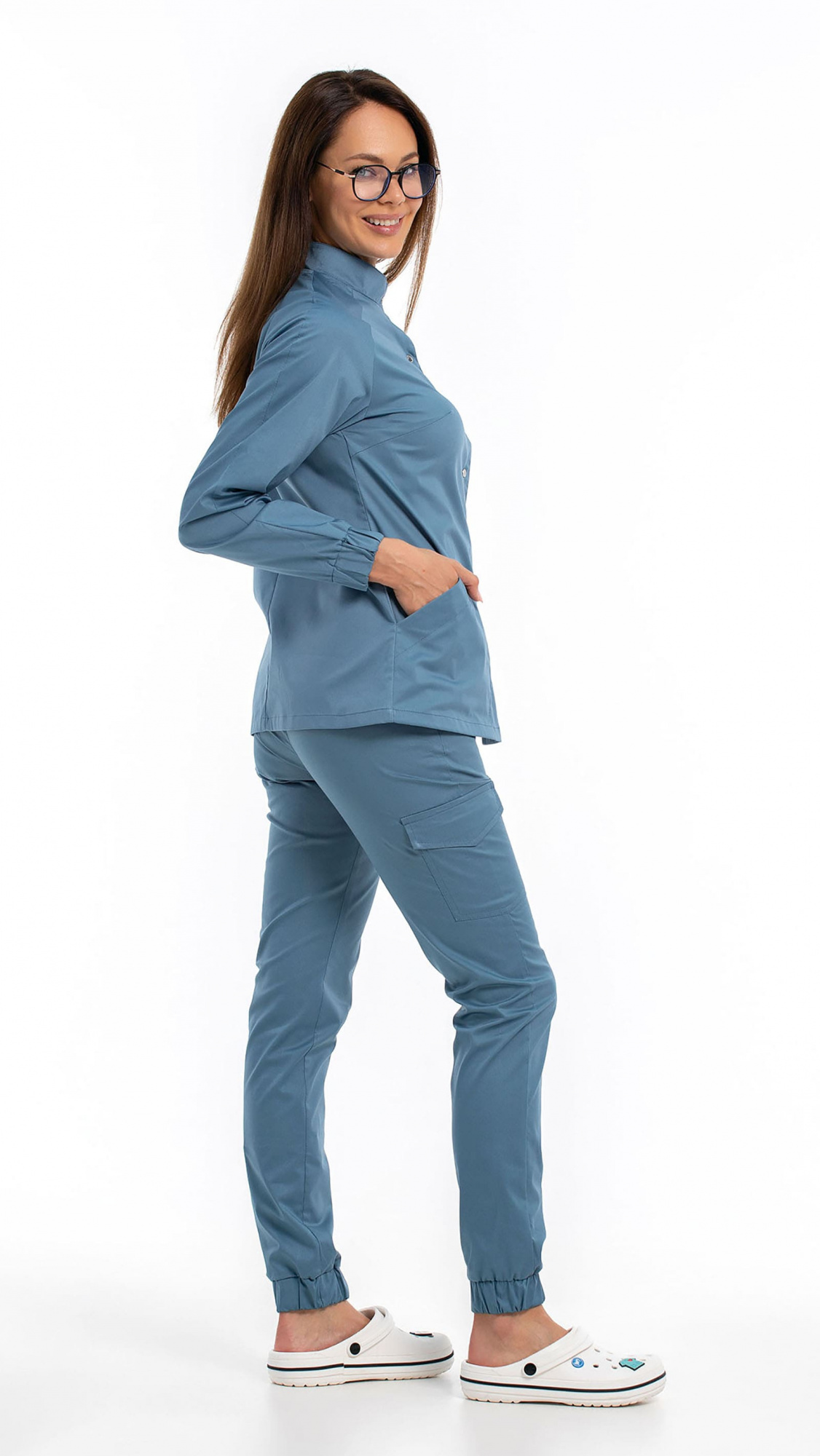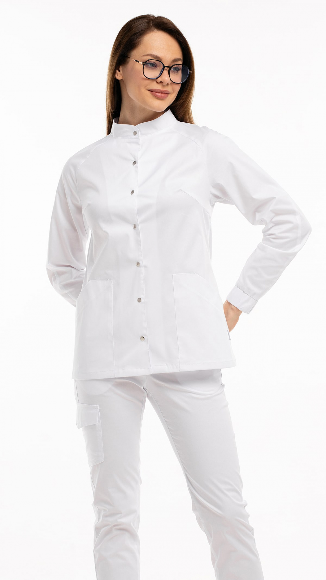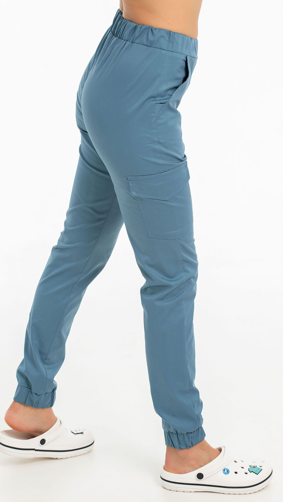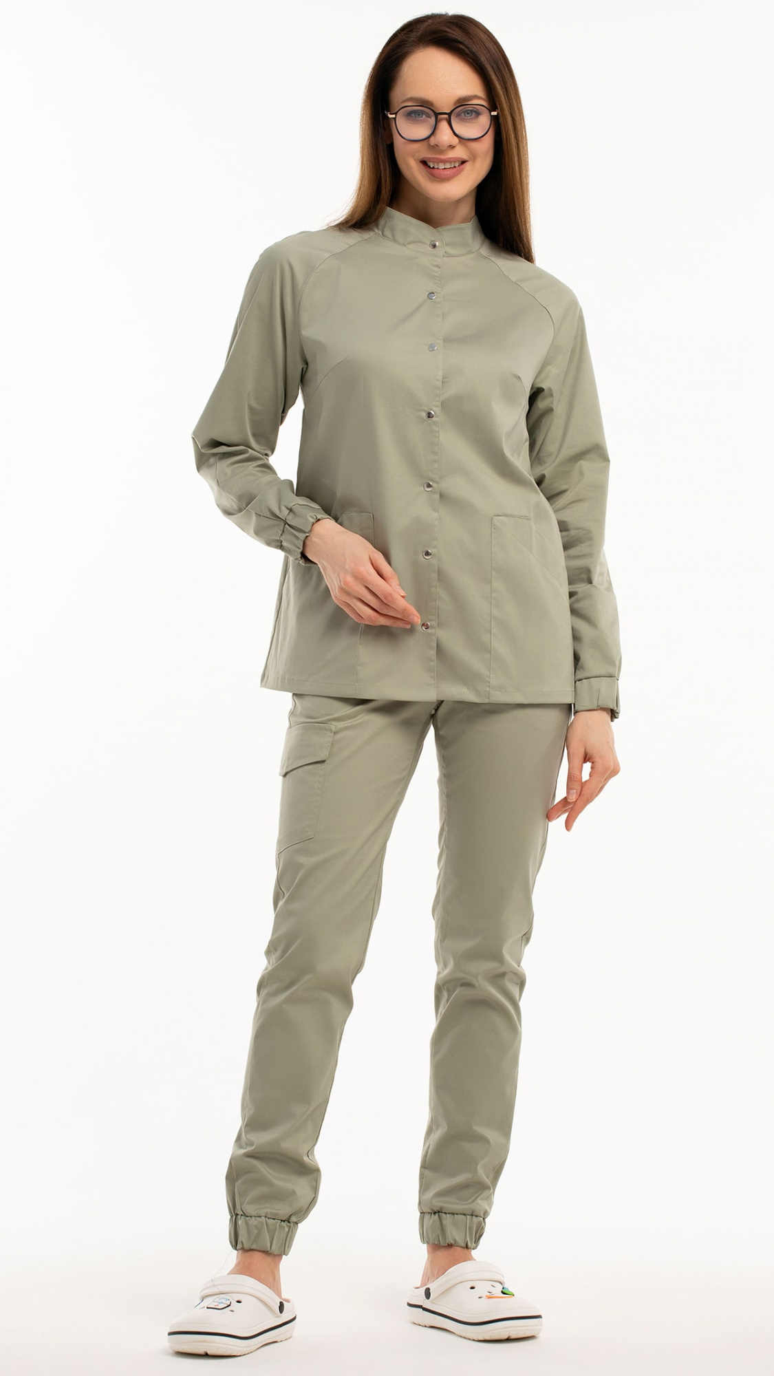 Костюм медицинский женский состоит из блузы и брюк.Блуза женская полуприлегающего силуэта с центральной бортовой застежкой на 6 кнопок.