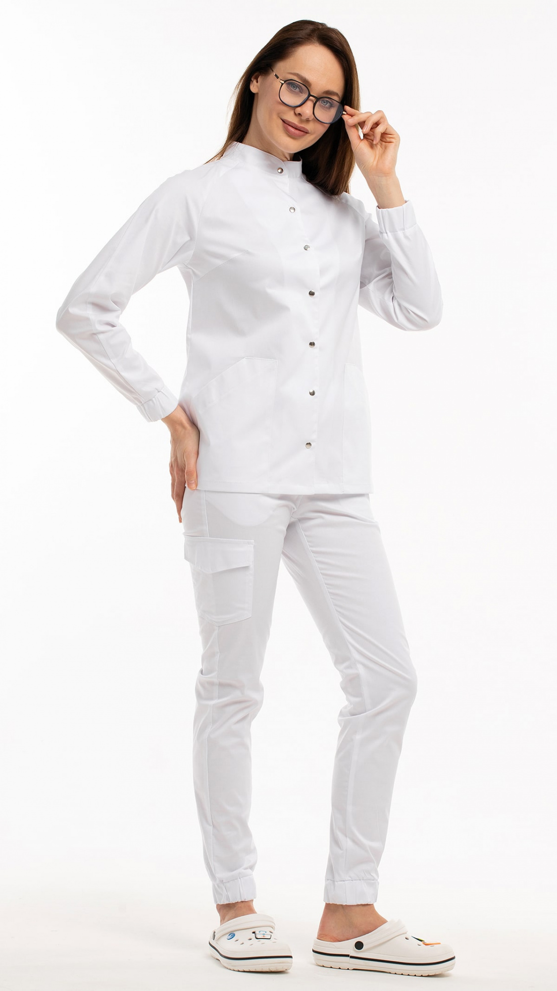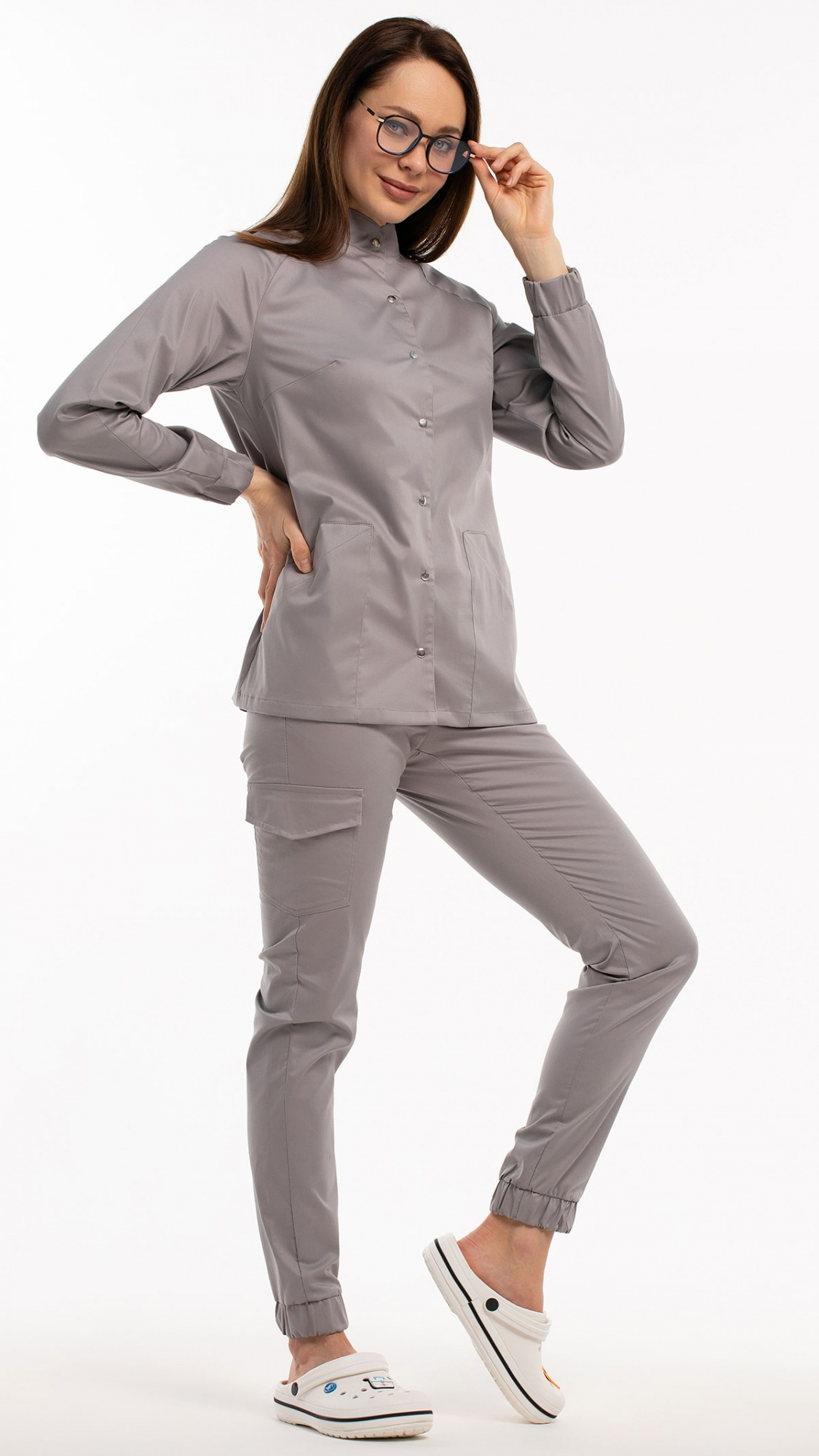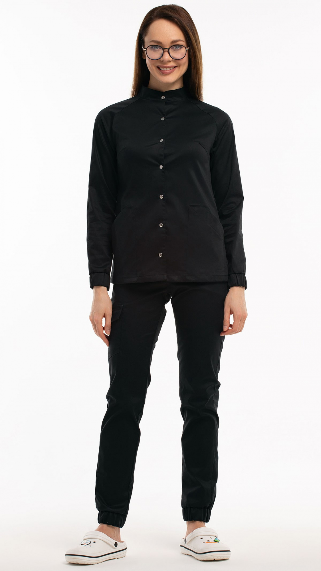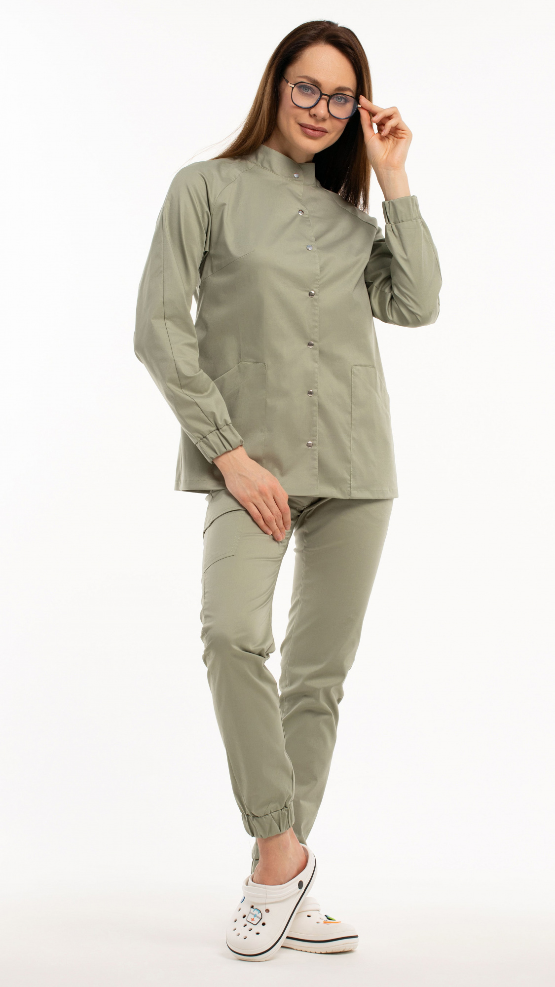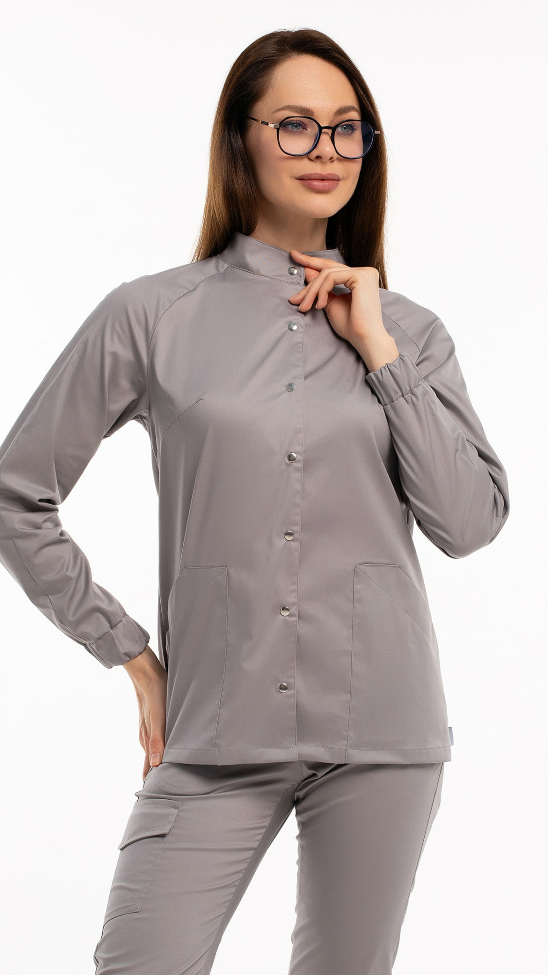 Костюм медицинский женский состоит из блузы и брюк.Блуза женская полуприлегающего силуэта с центральной бортовой застежкой на 6 кнопок.