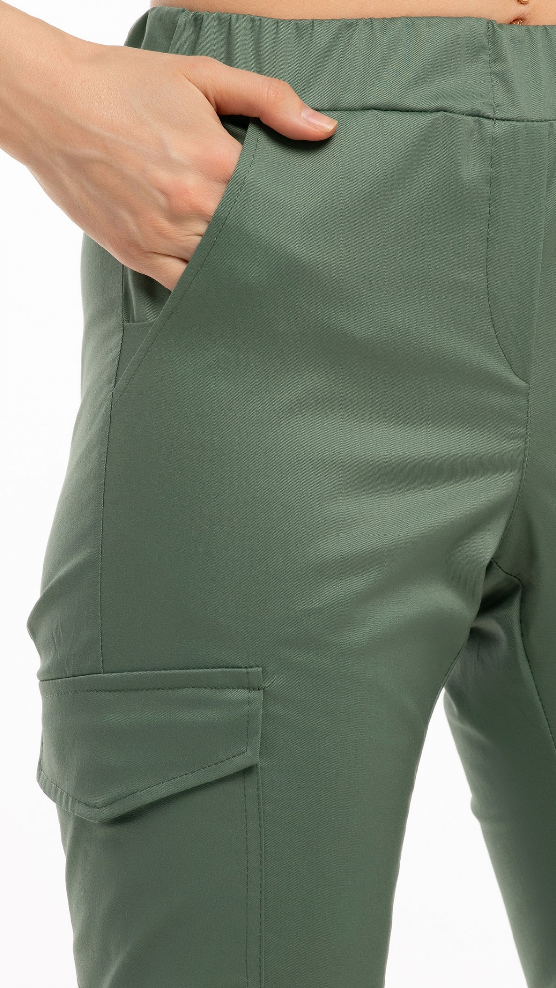 Передние половинки брюк с имитацией застежки "гульф" в среднем шве. Боковые карманы с отрезными бочками с наклонным входом. В нижних углах входа в карманы вставки. На правом боку на уровне бедра накладной карман с клапаном.