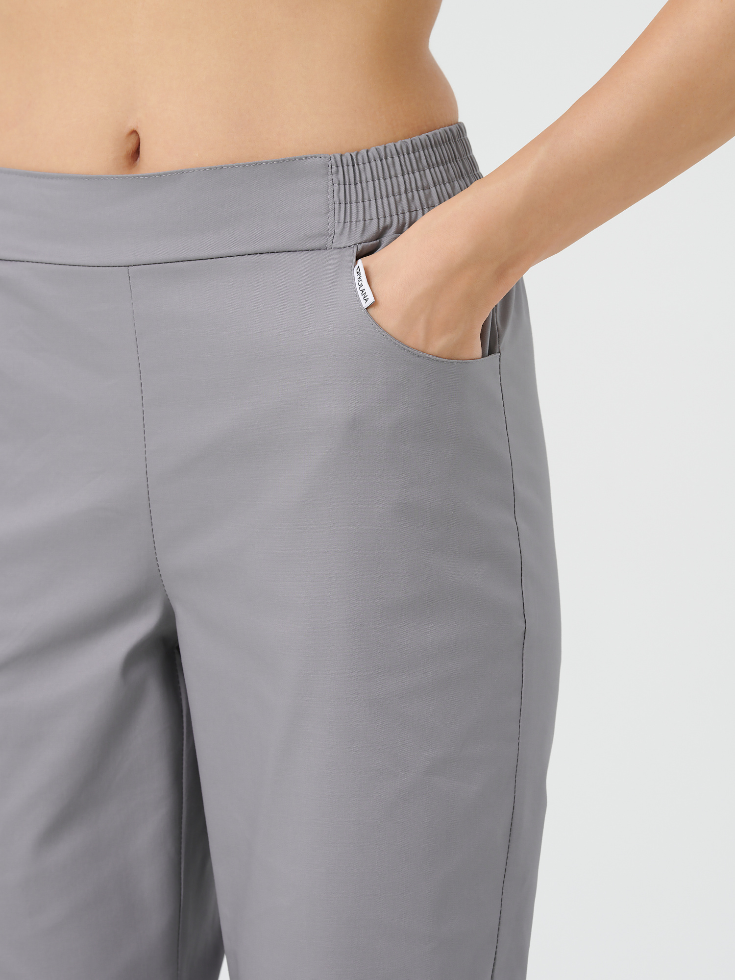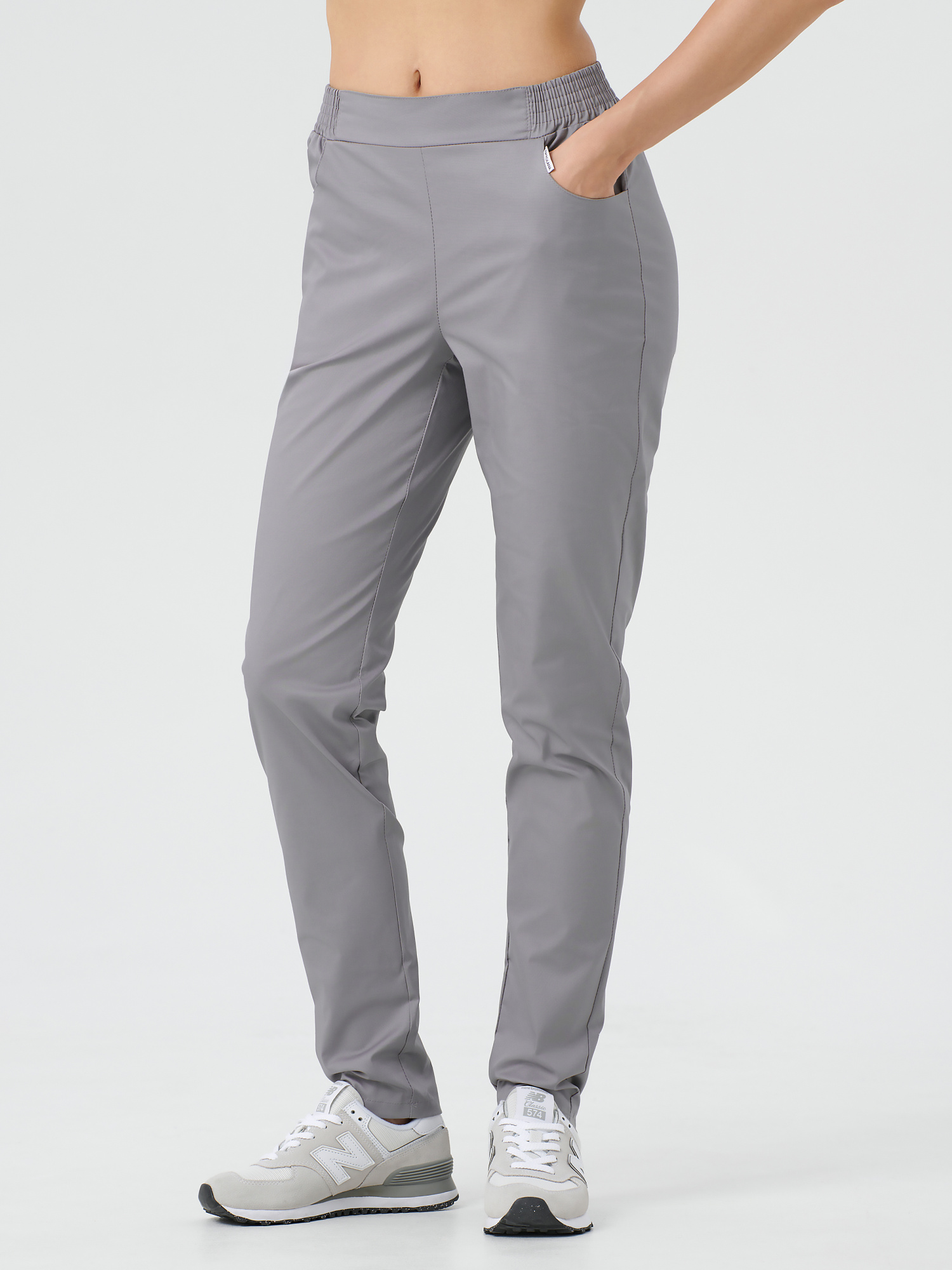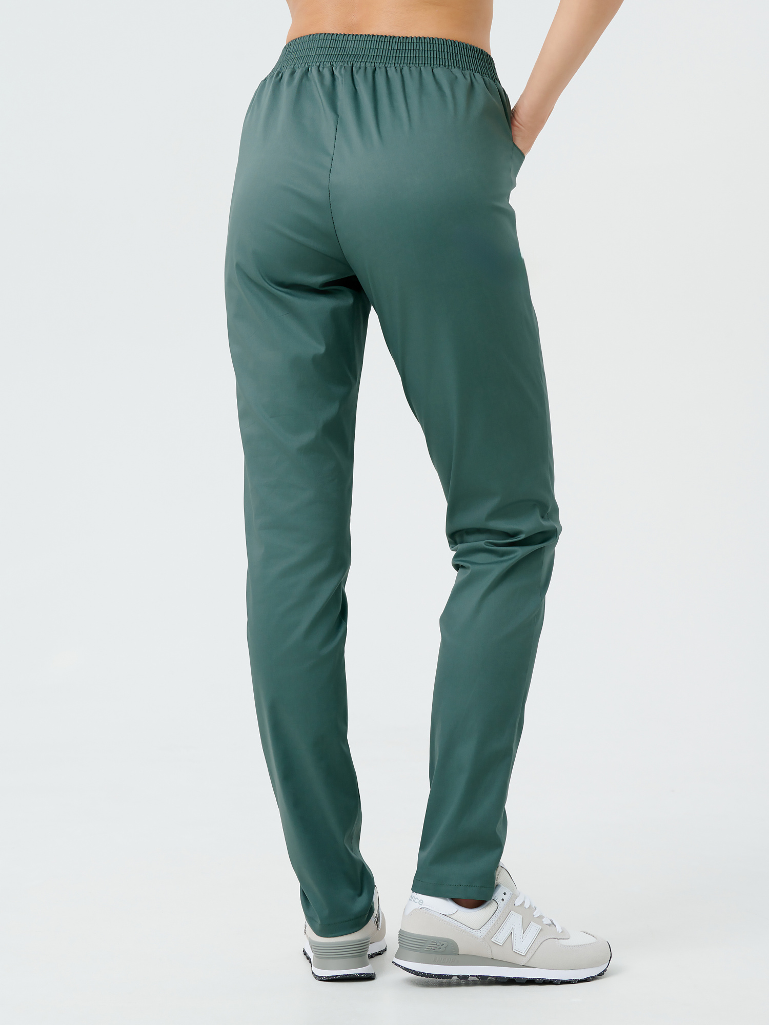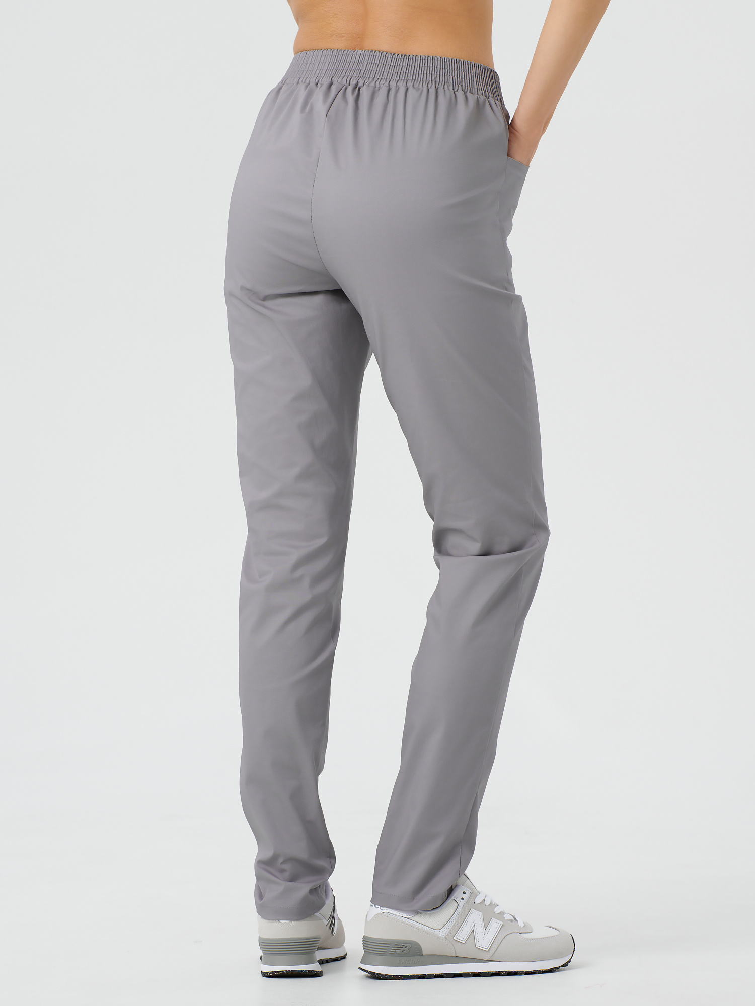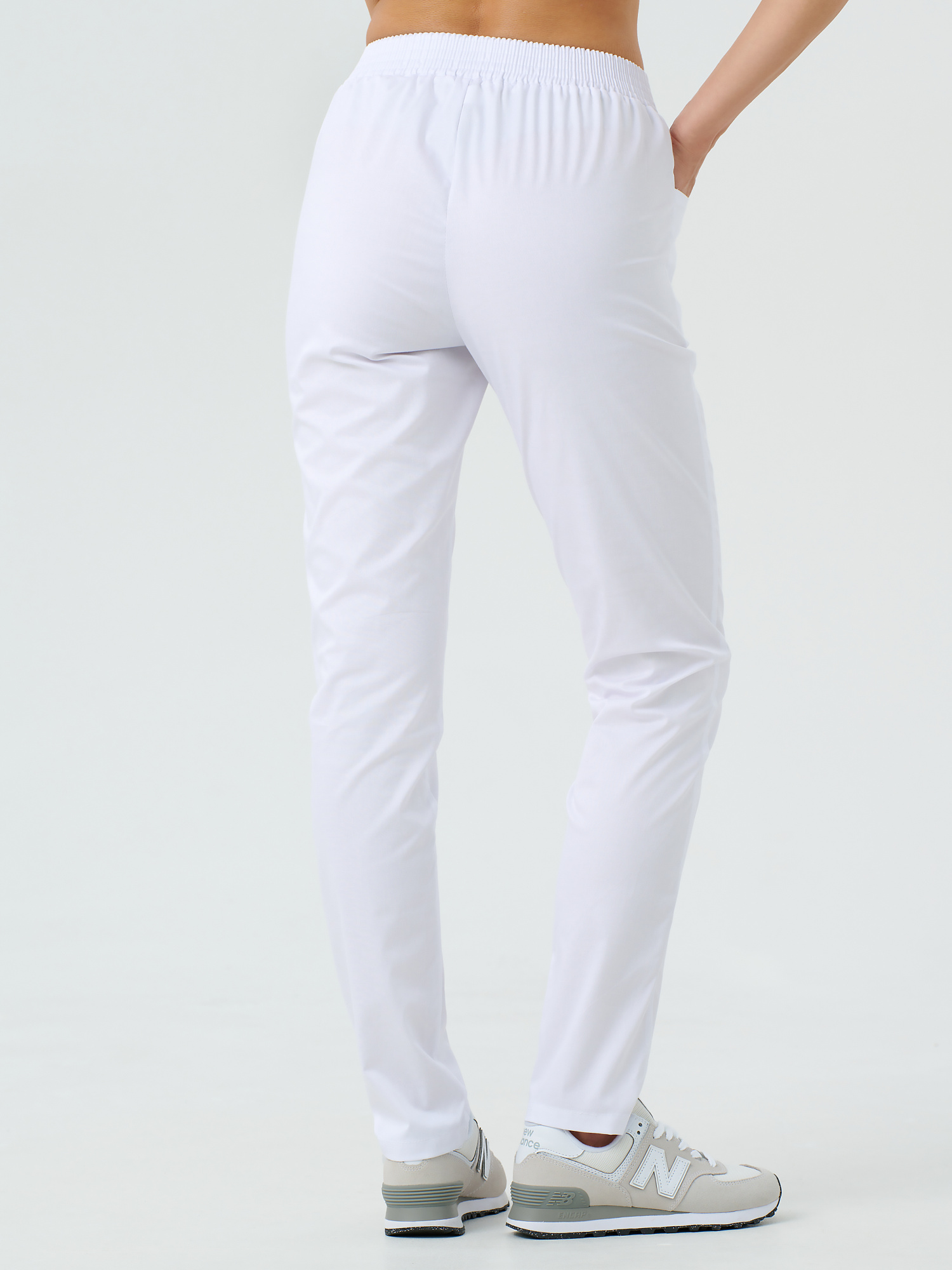 Брюки с притачным поясом, состоящим из двух частей. Центральная часть пояса передних половинок брюк без эластичной тесьмы, вторая часть стянута эластичной тесьмой. Передние половинки брюк с боковыми карманами в отрезных бочках со скруглёнными входами. Низ брюк обработан швом вподгибку с закрытым срезом.