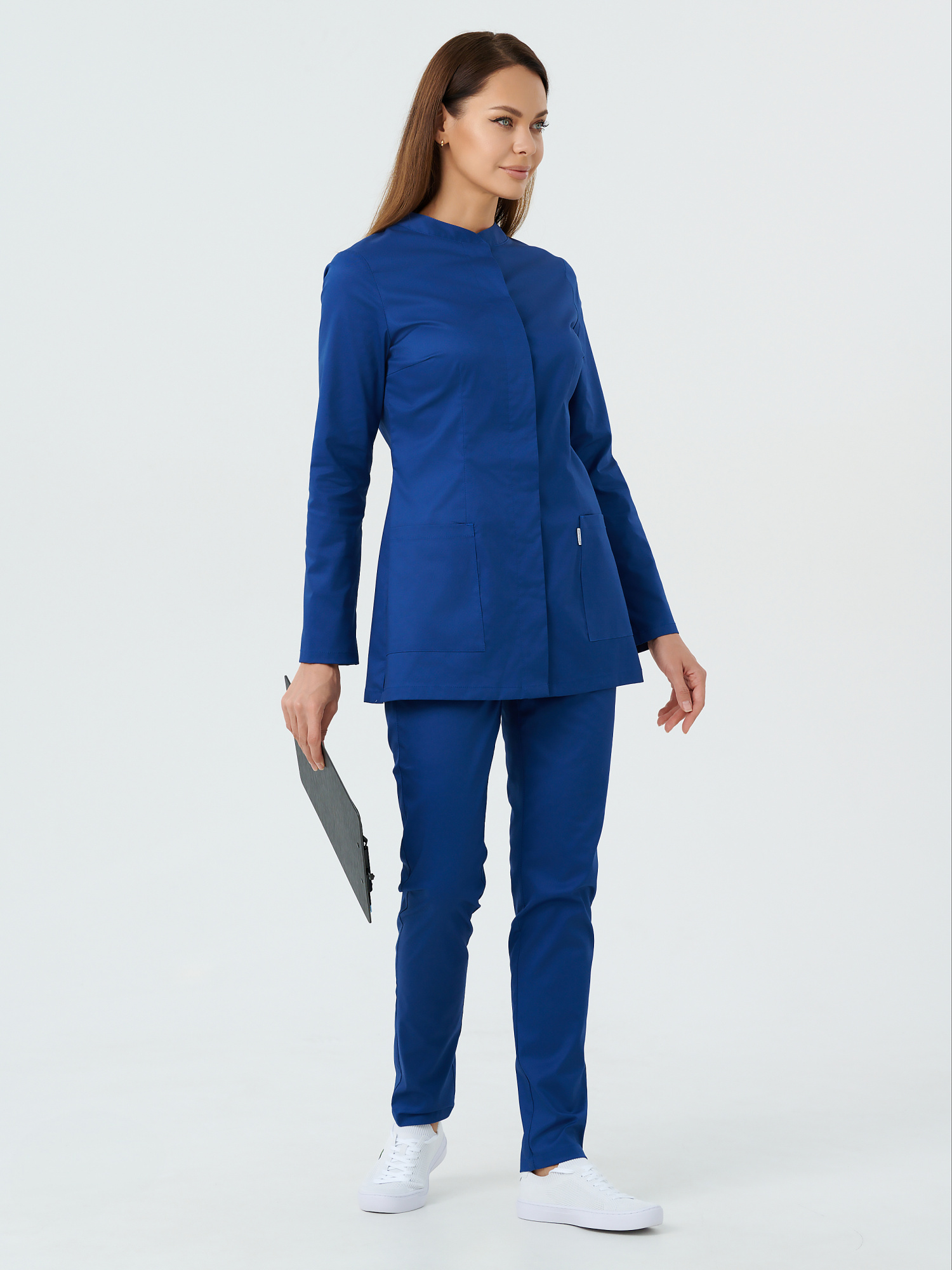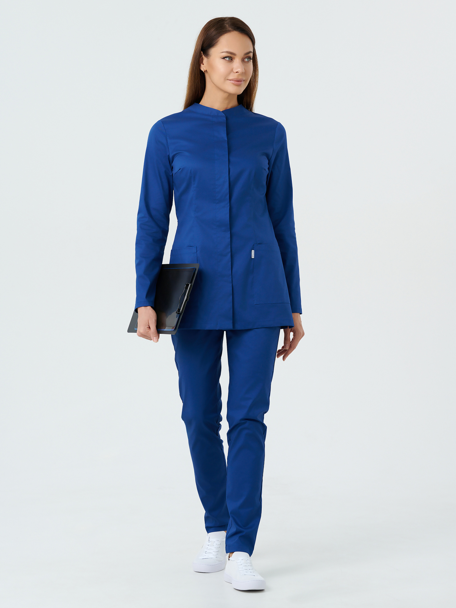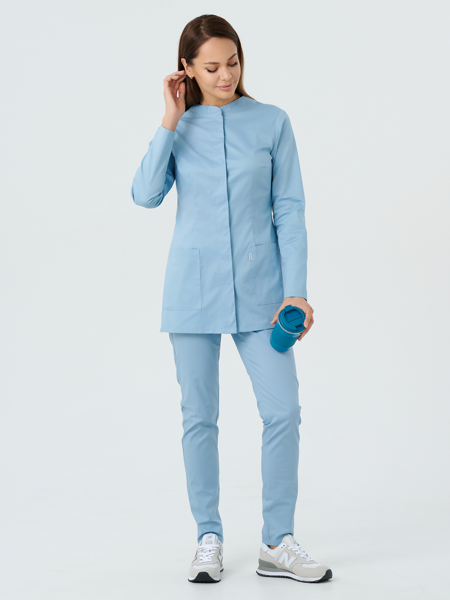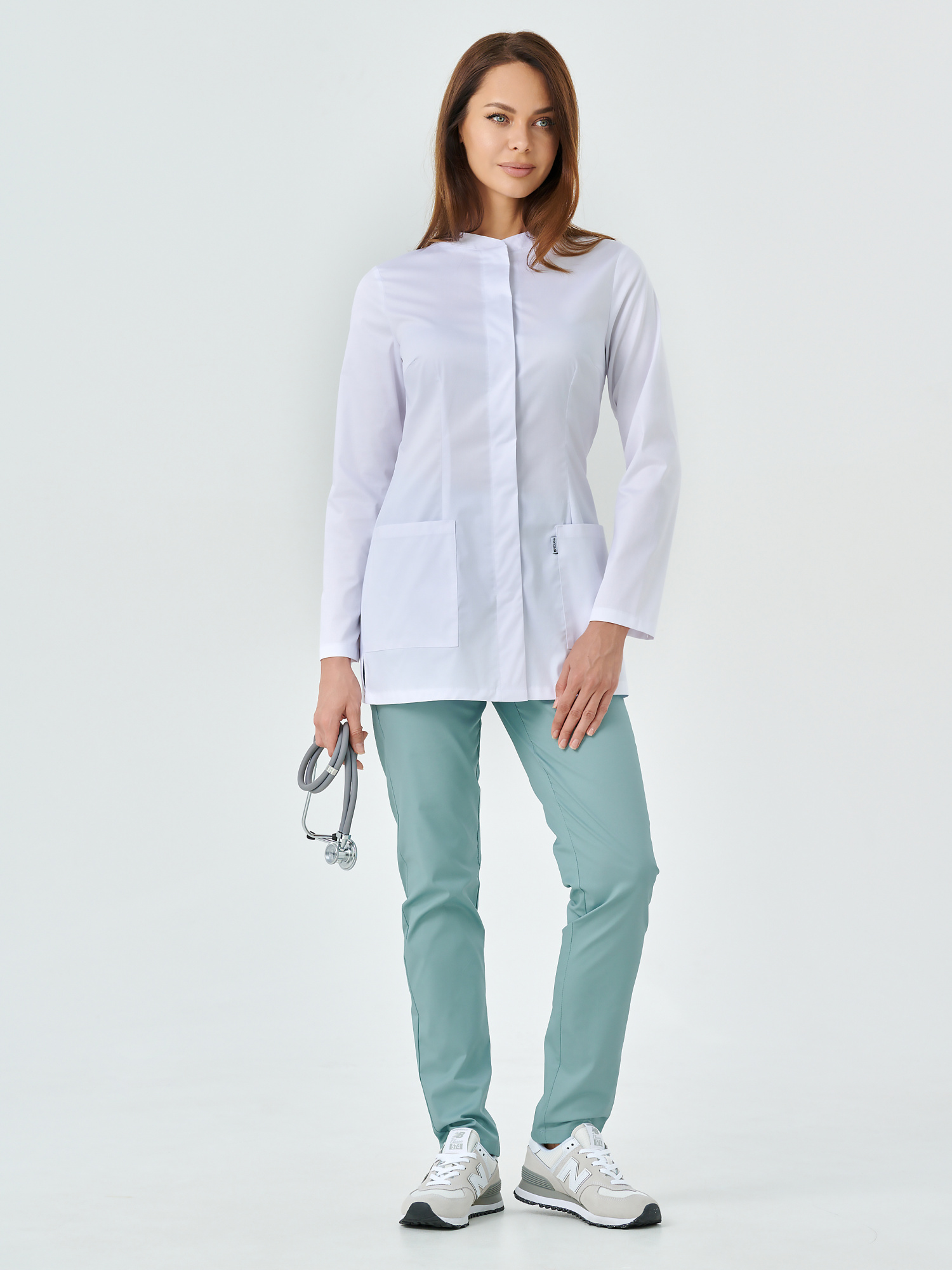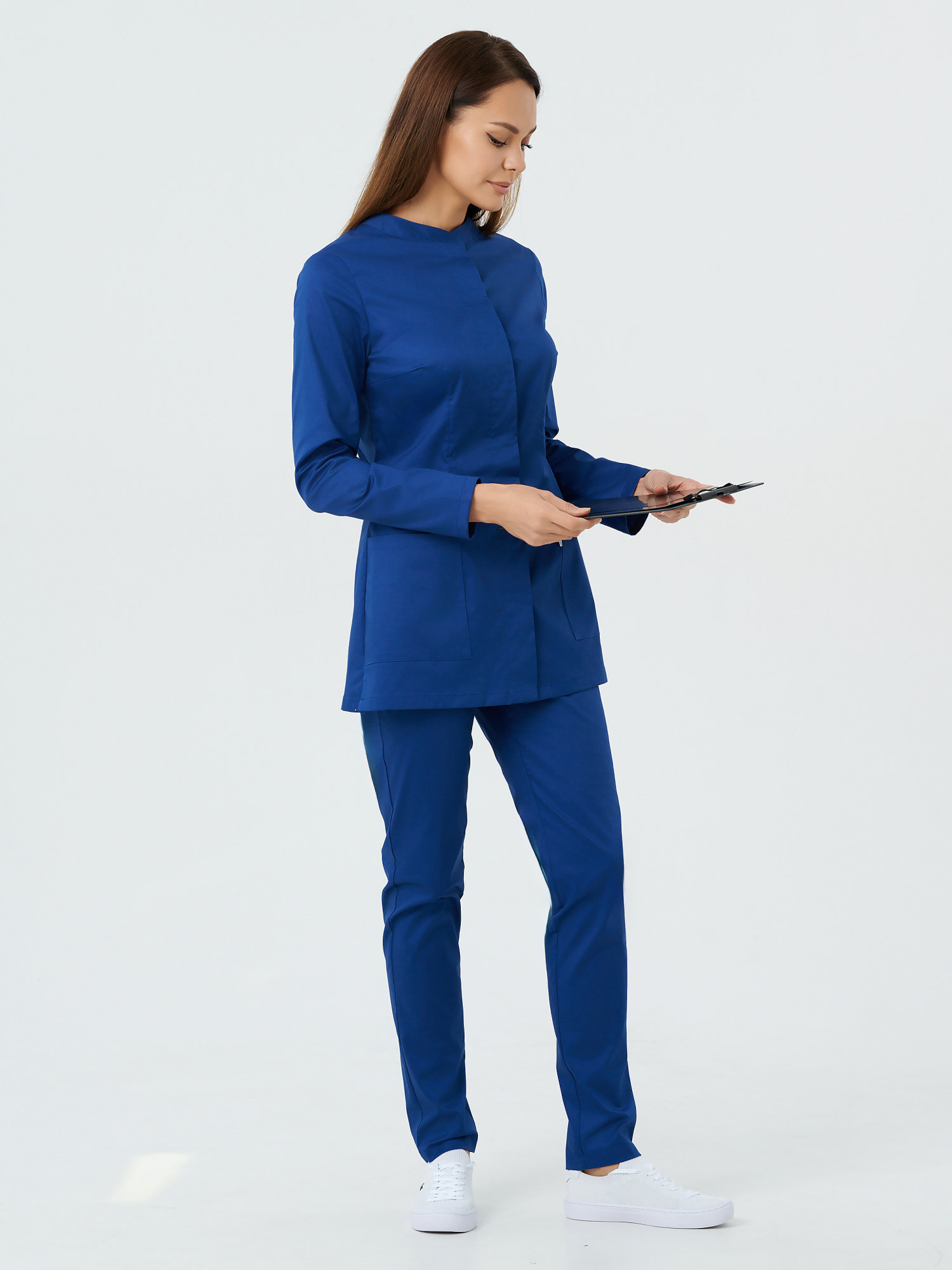 Костюм медицинский женский состоит из блузы и брюк.Блузы полуприлегающего силуэта с супатной застежкой на 8 кнопок, с боковыми разрезами.