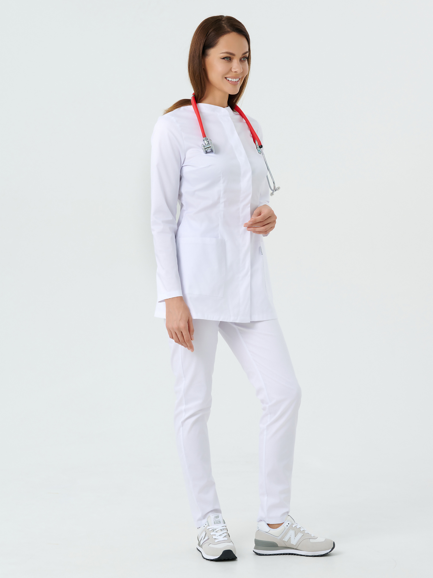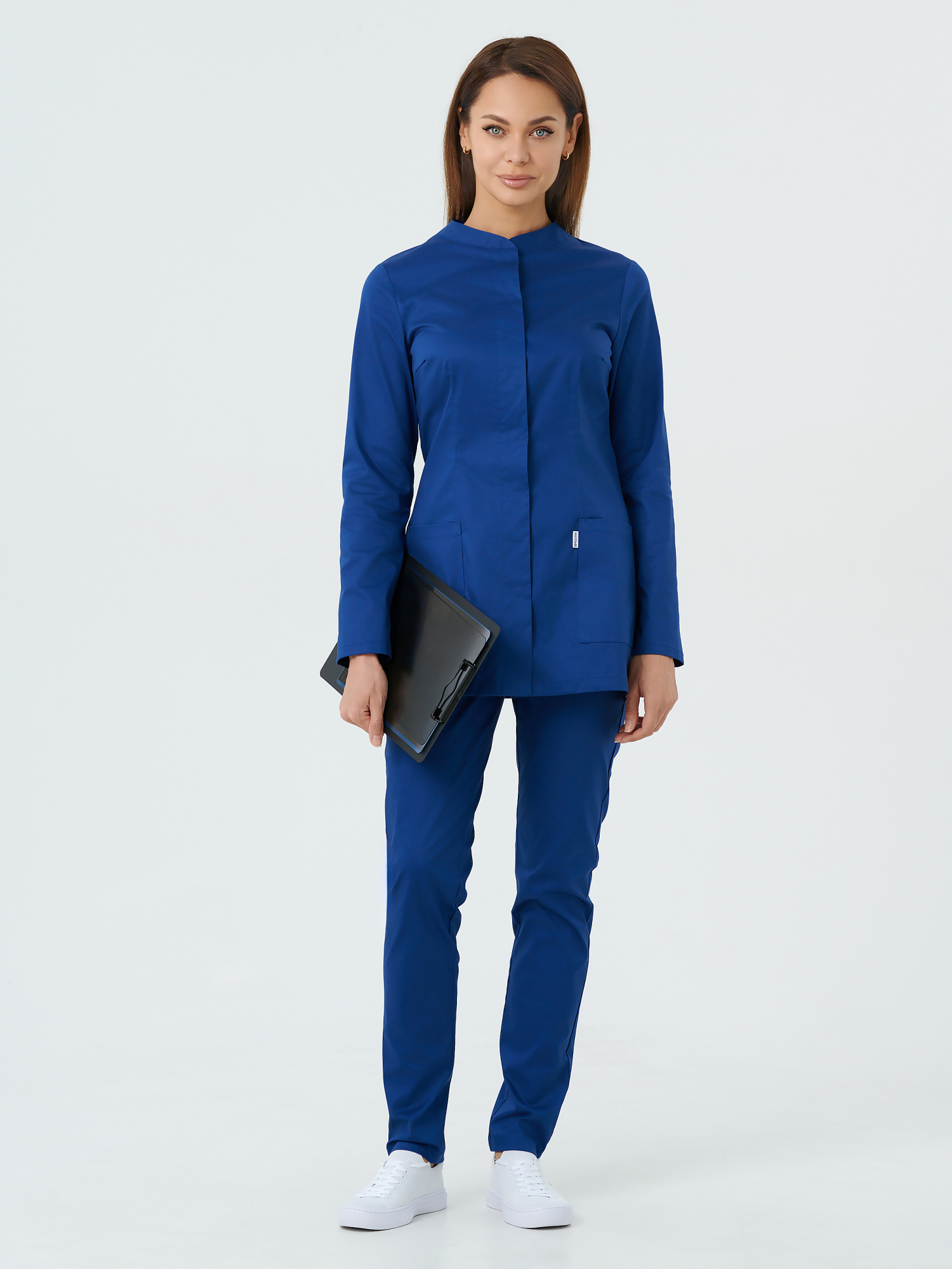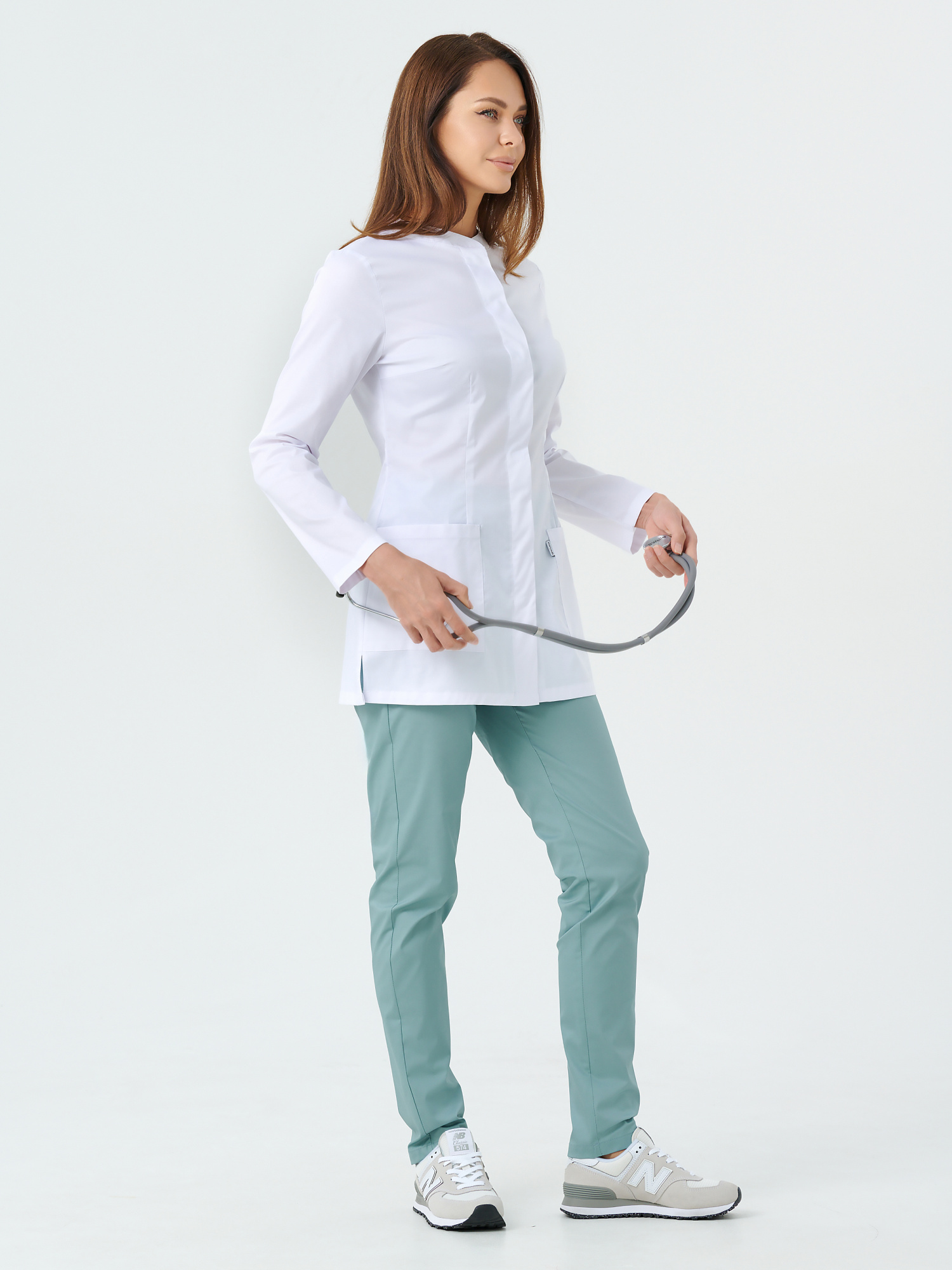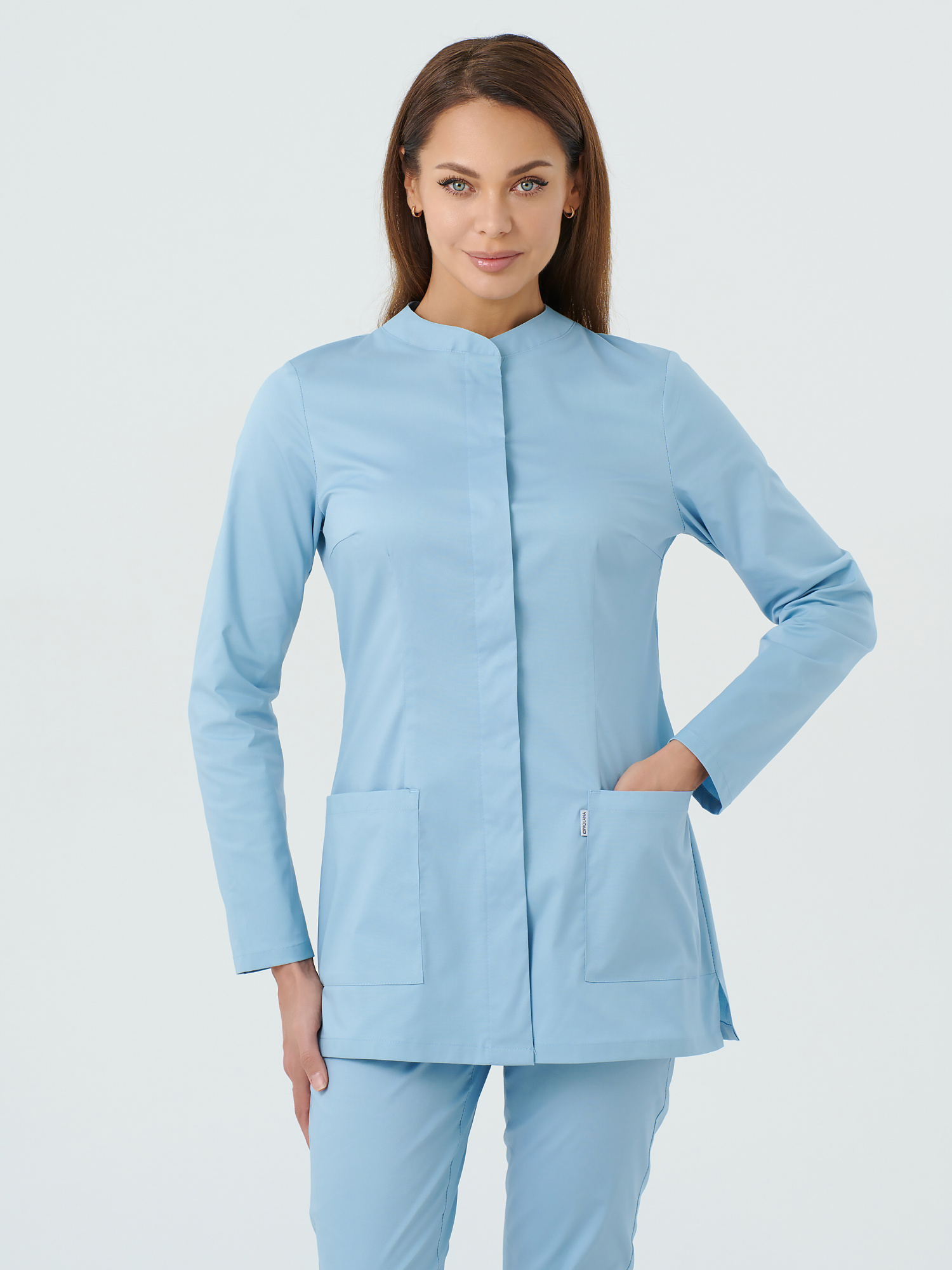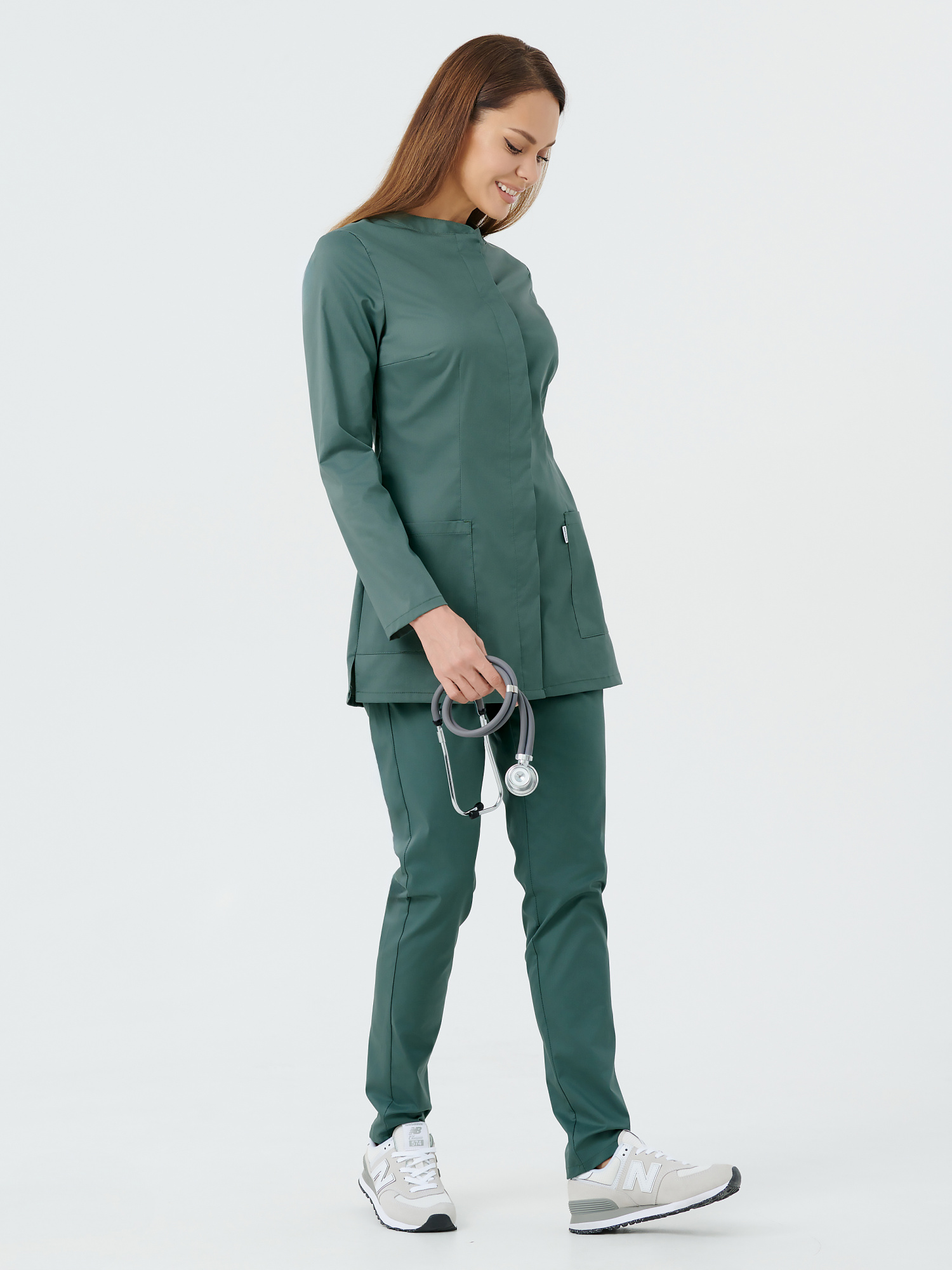 Костюм медицинский женский состоит из блузы и брюк.Блузы полуприлегающего силуэта с супатной застежкой на 8 кнопок, с боковыми разрезами.