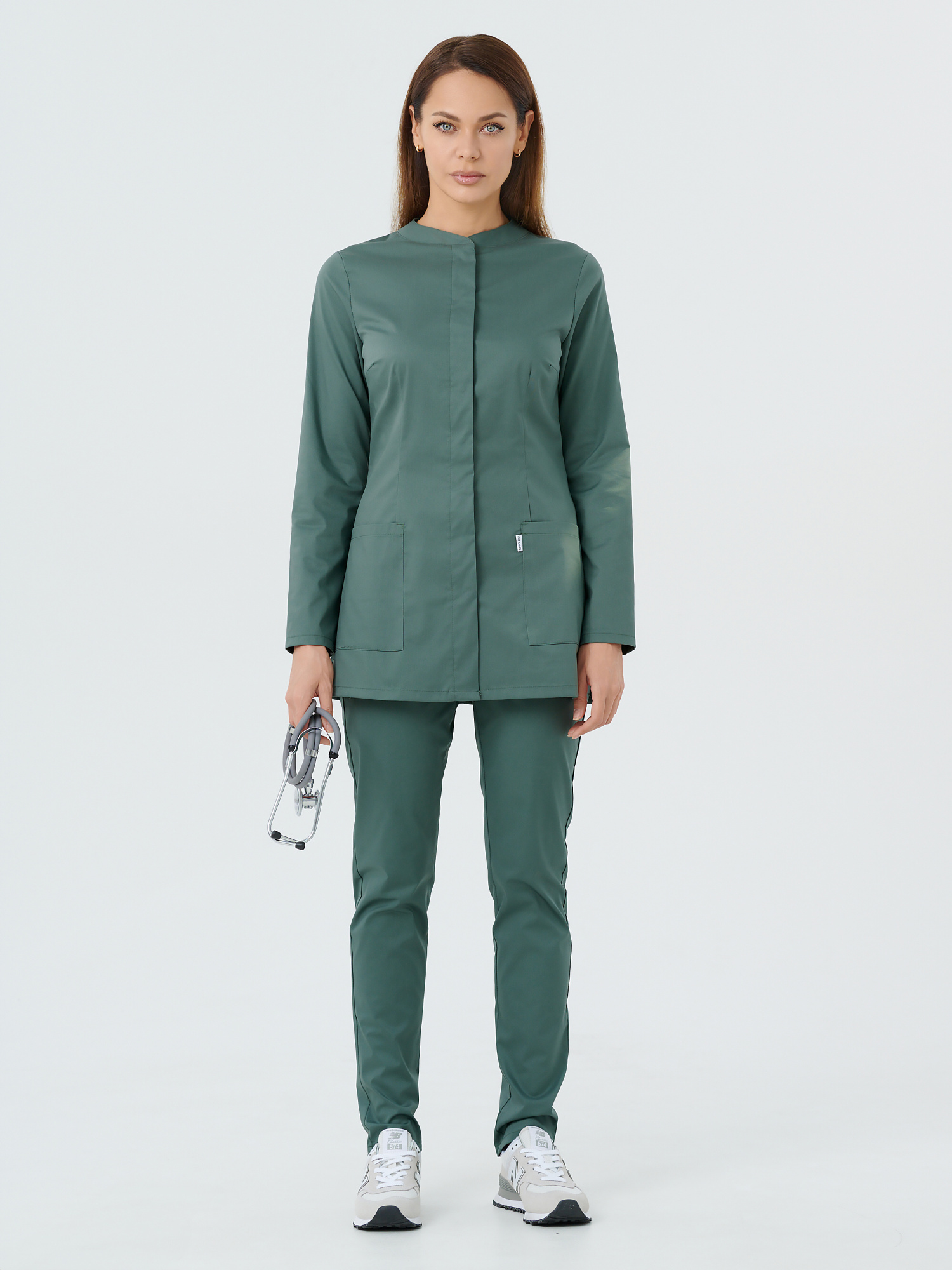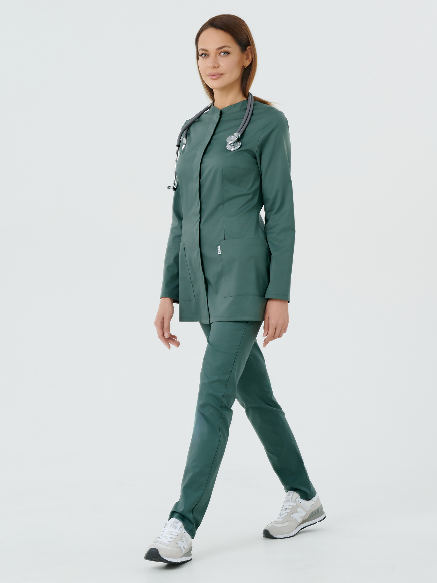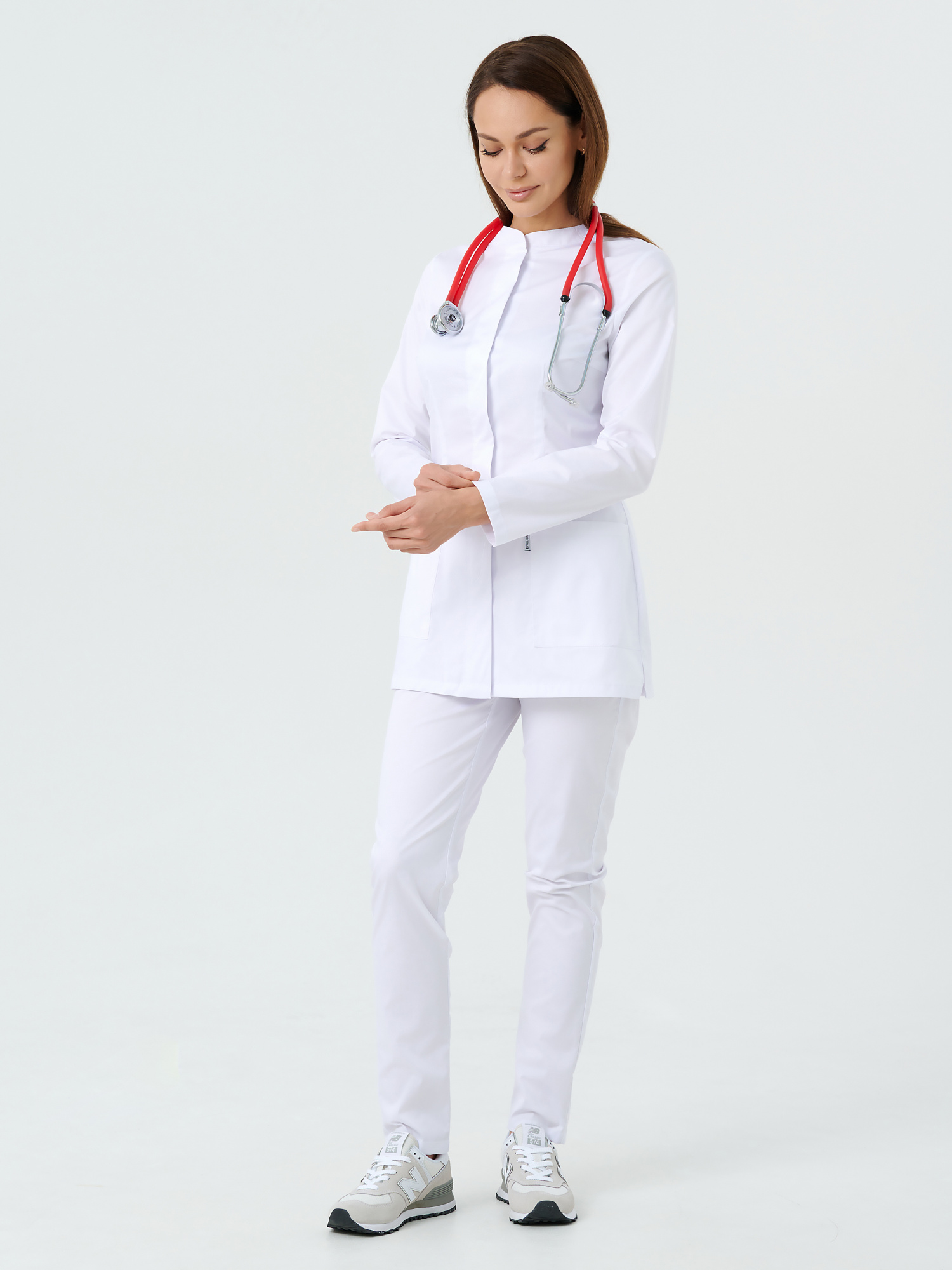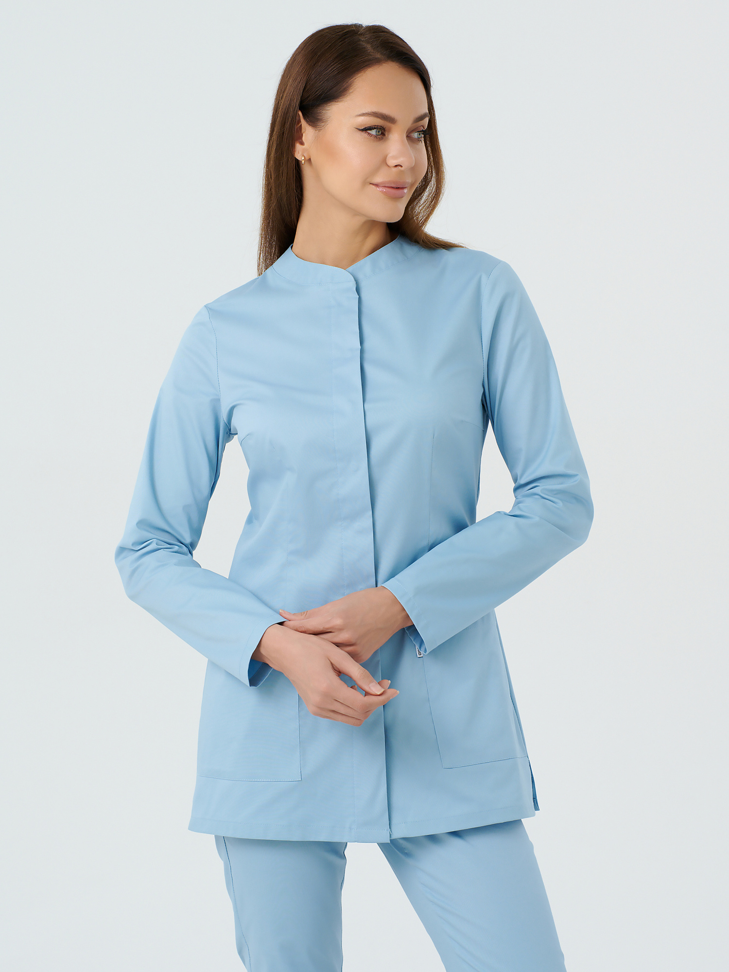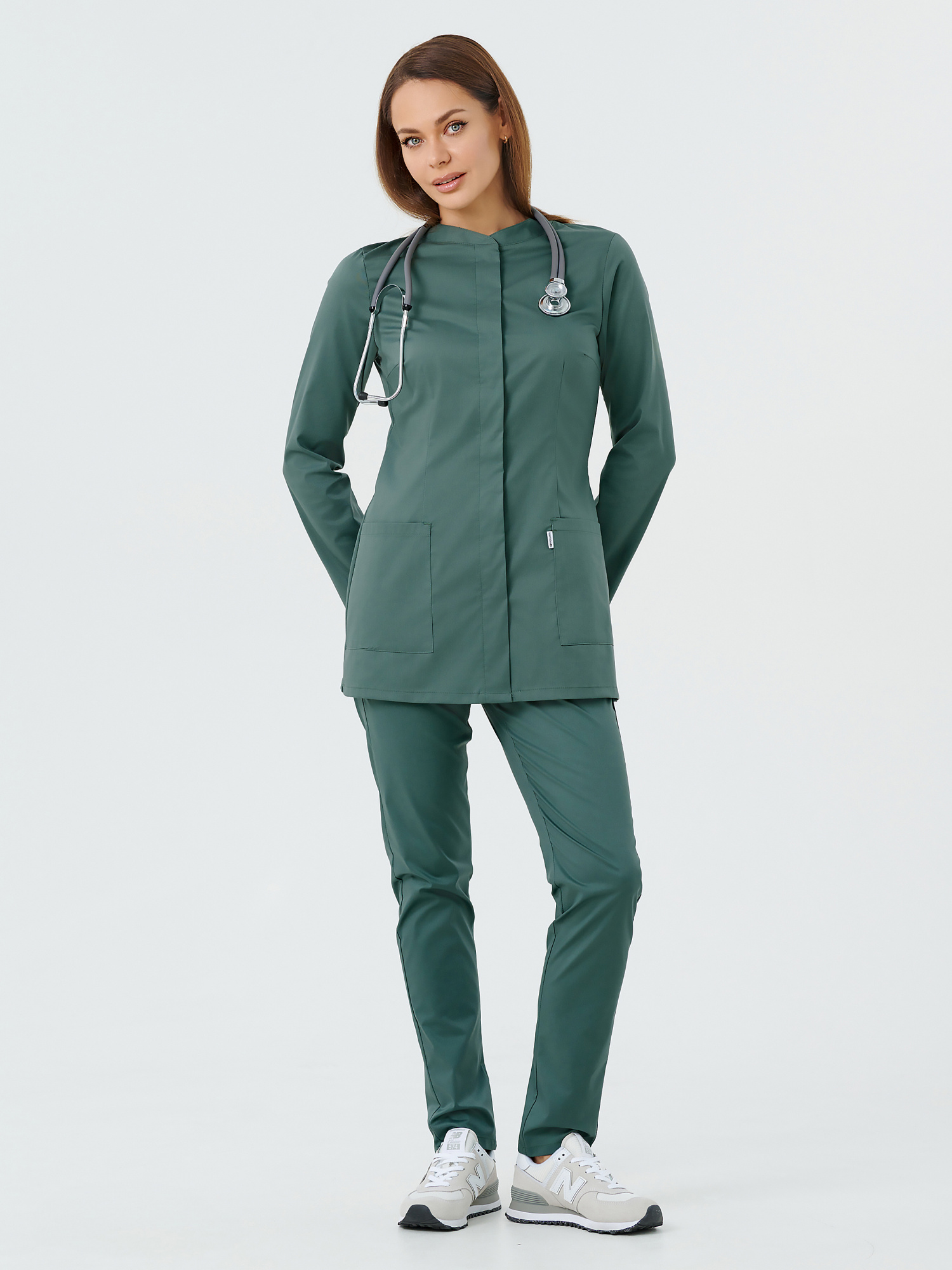 Костюм медицинский женский состоит из блузы и брюк.Блузы полуприлегающего силуэта с супатной застежкой на 8 кнопок, с боковыми разрезами.