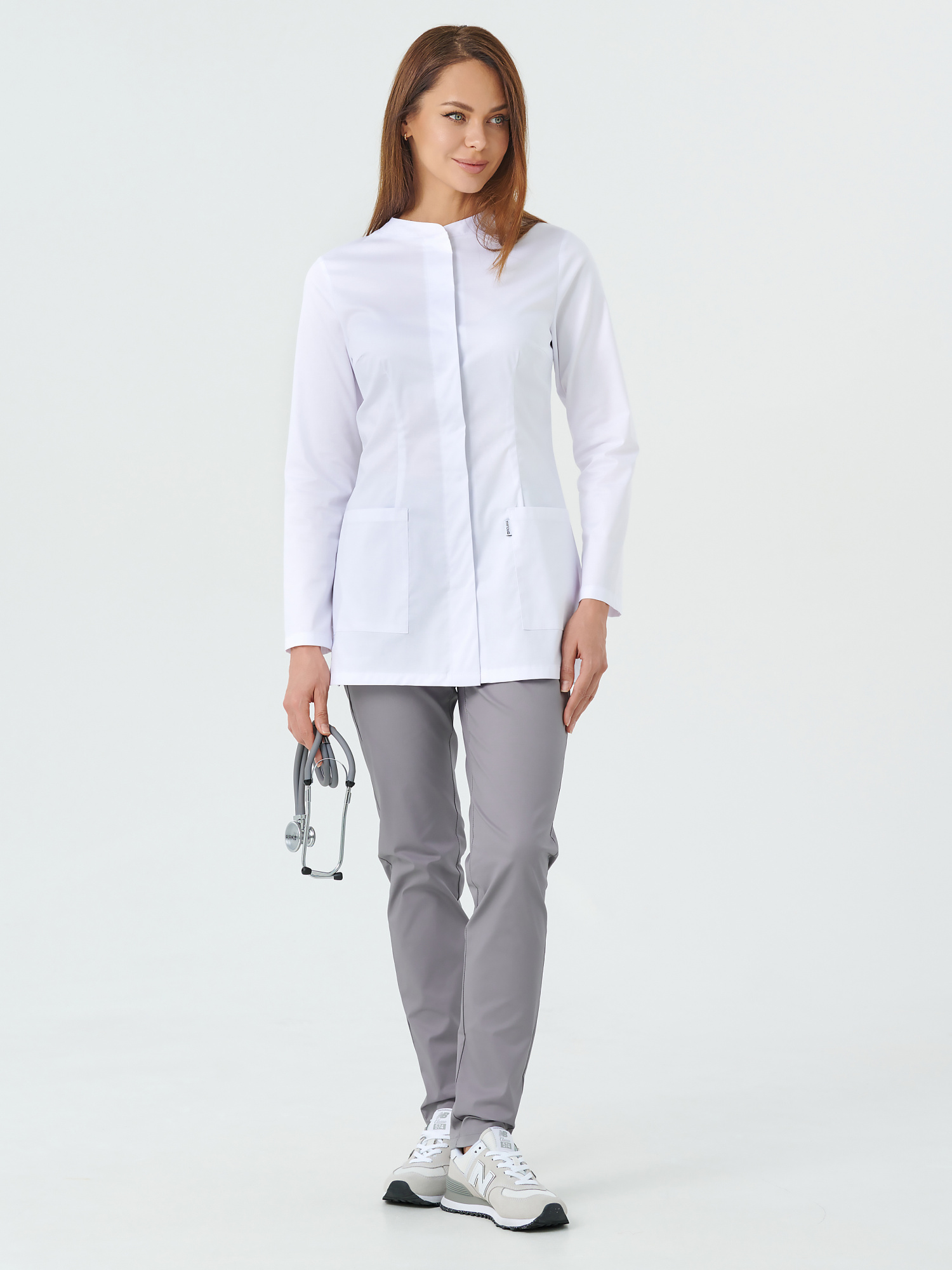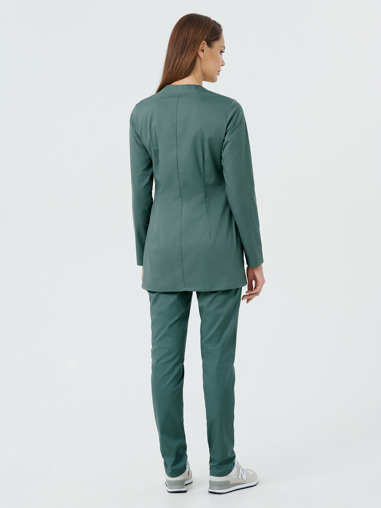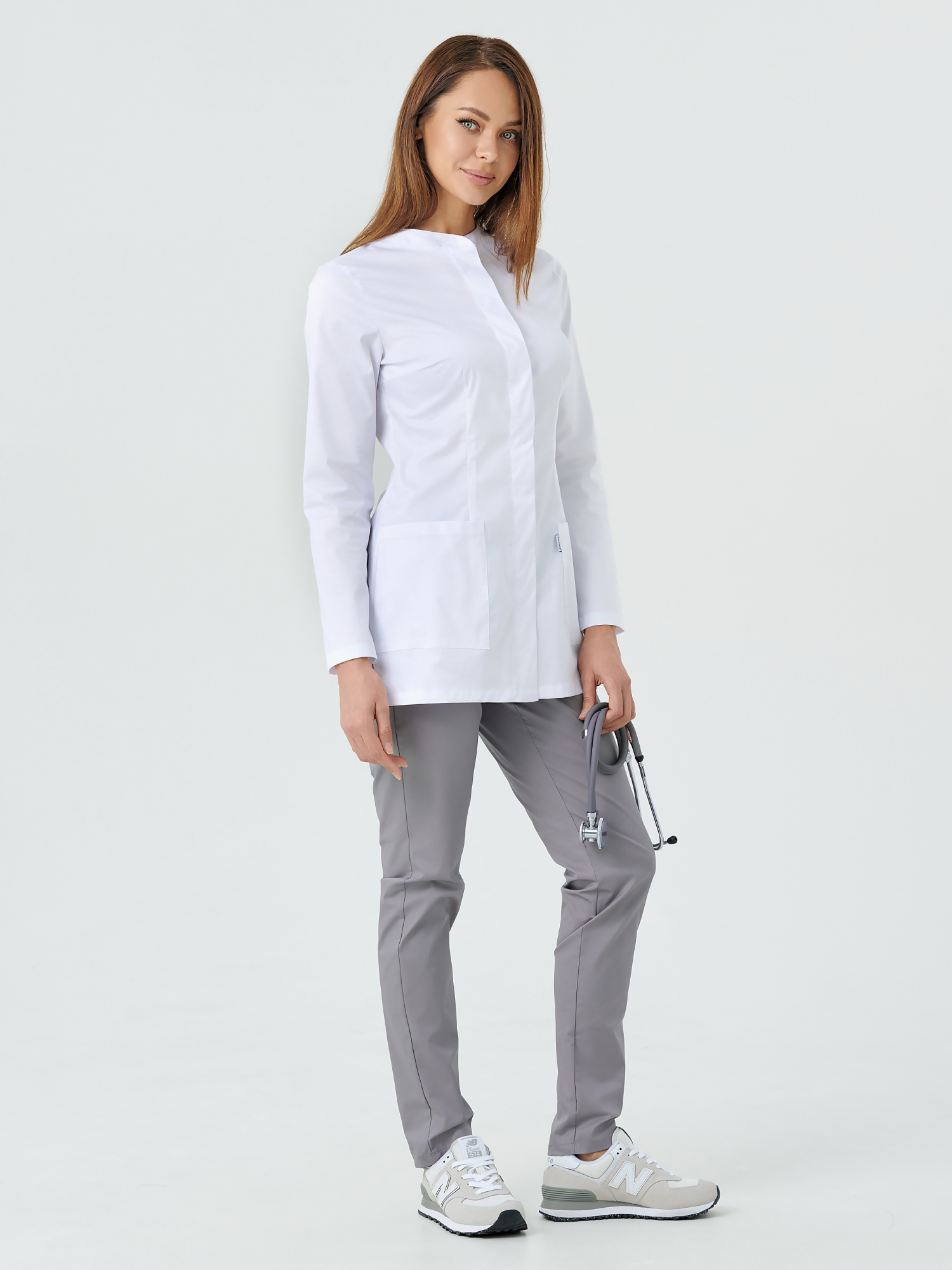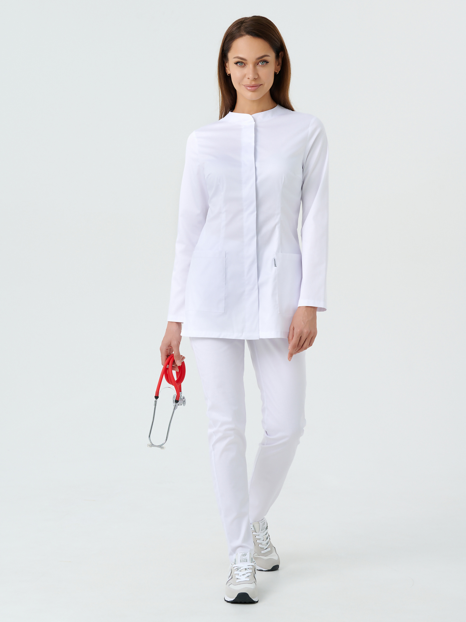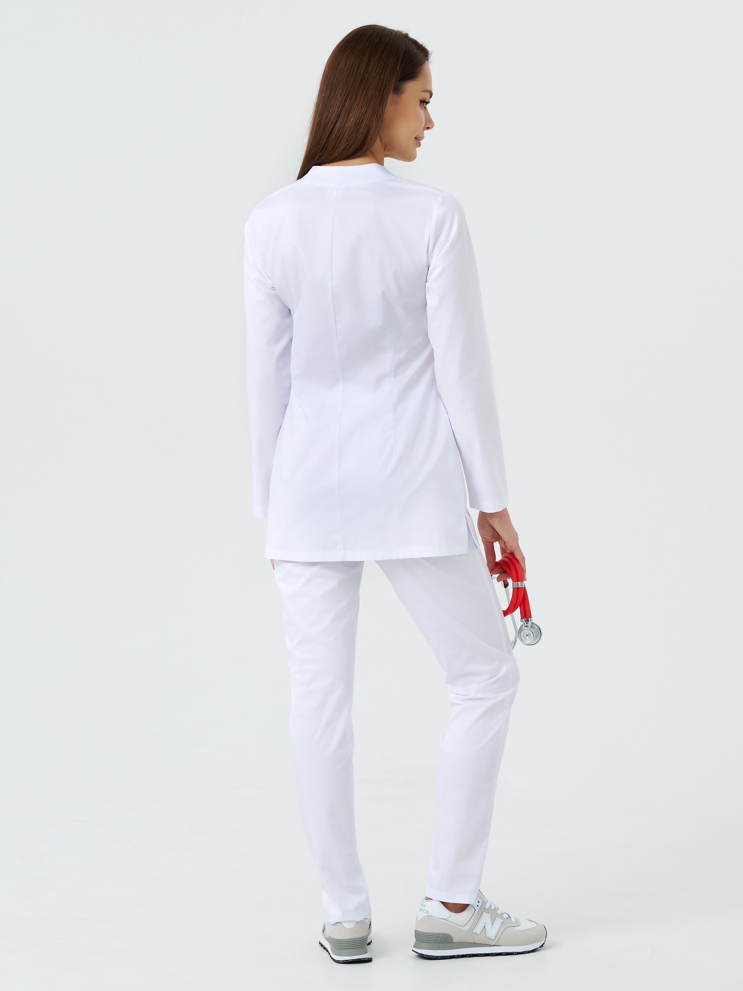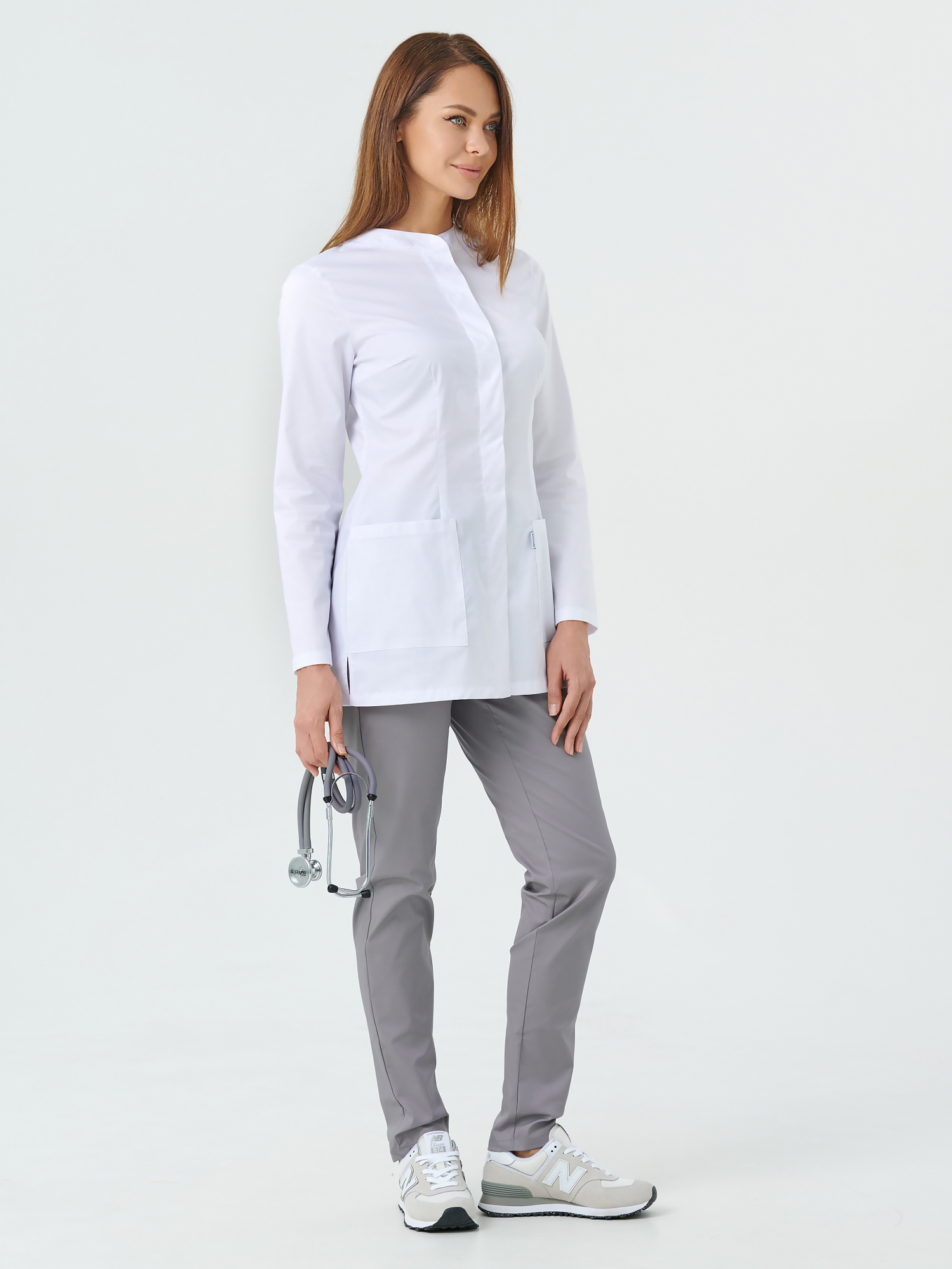 Костюм медицинский женский состоит из блузы и брюк.Блузы полуприлегающего силуэта с супатной застежкой на 8 кнопок, с боковыми разрезами.